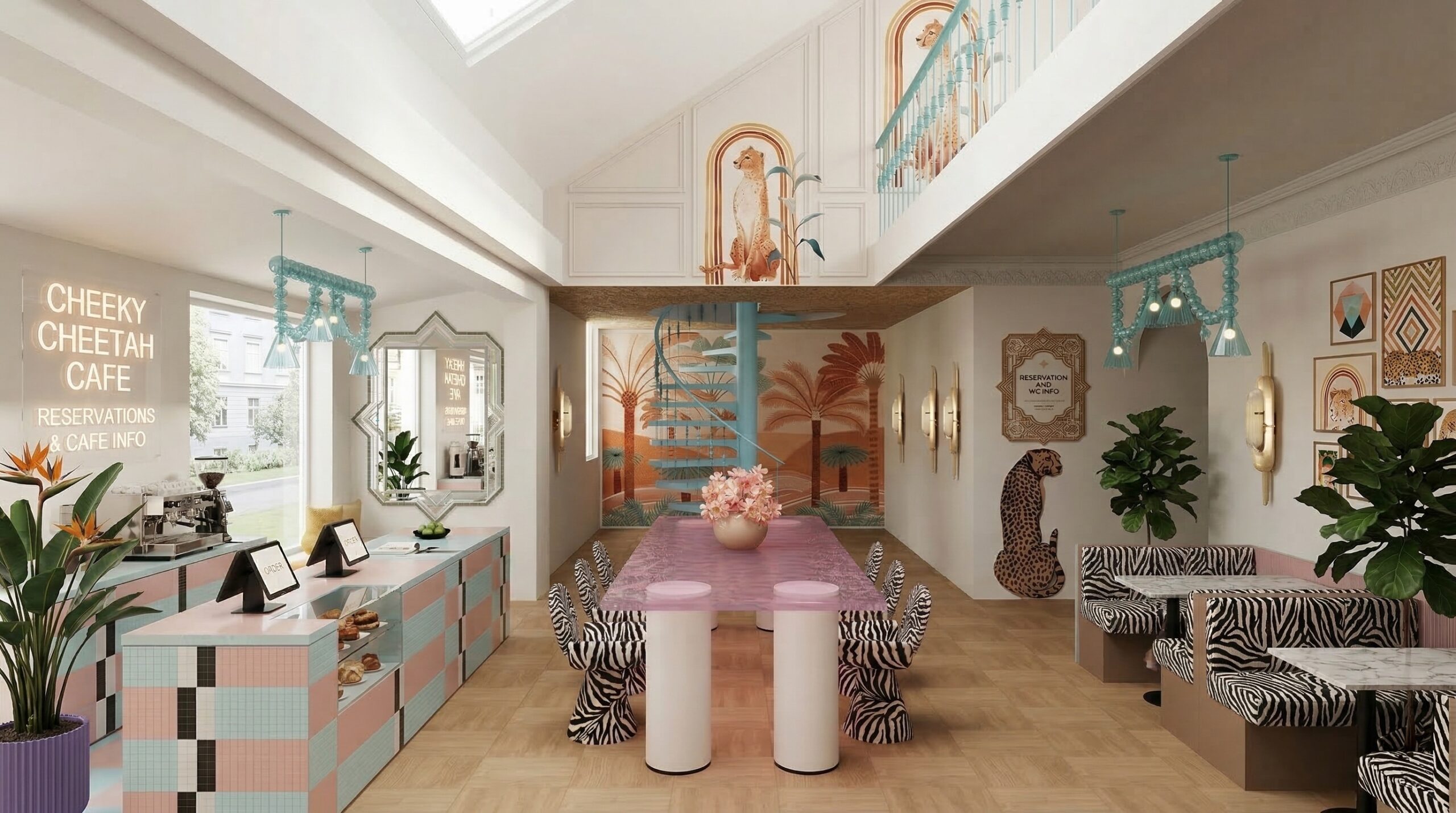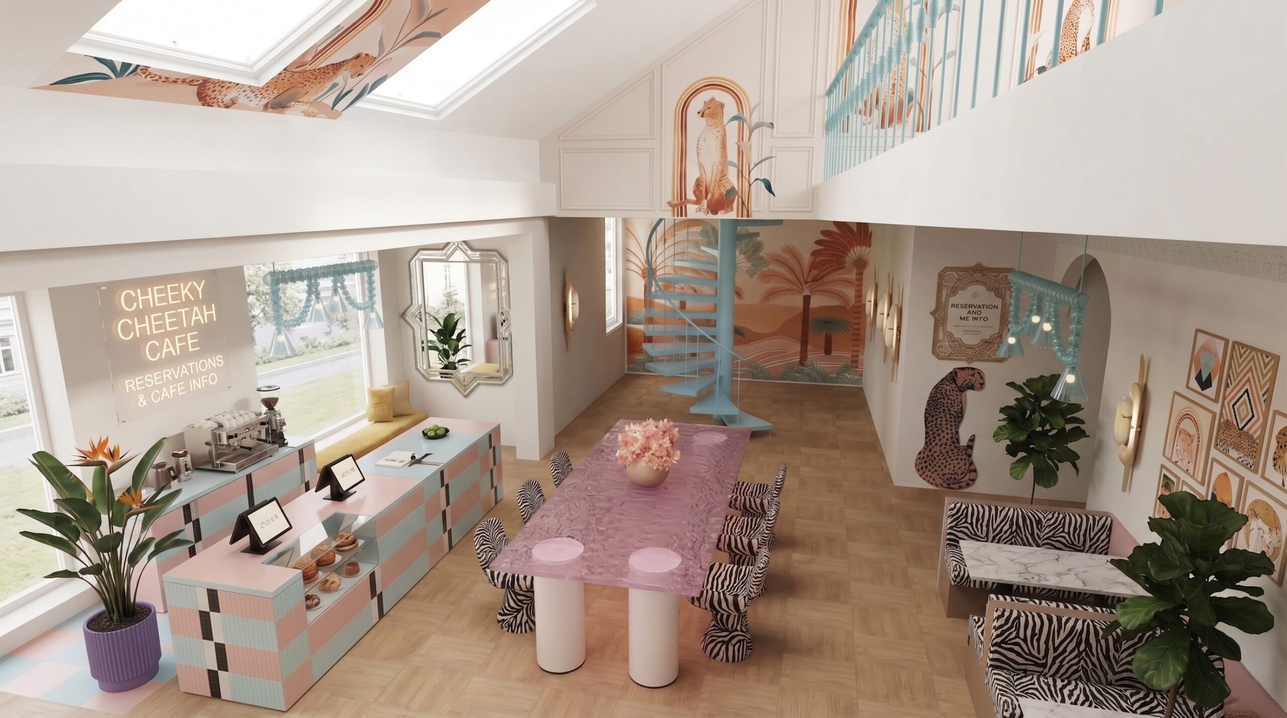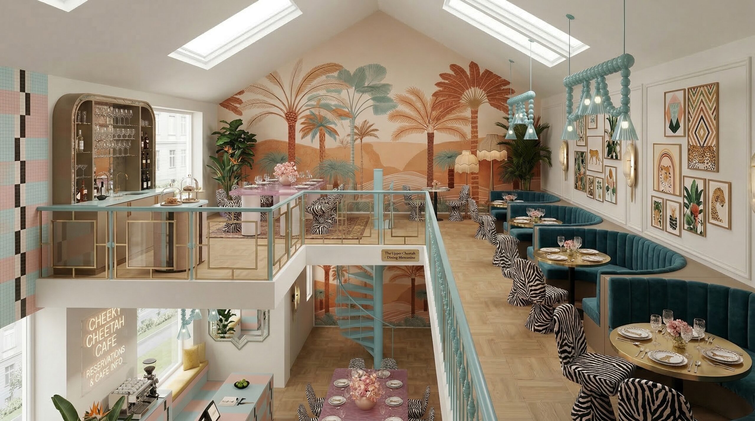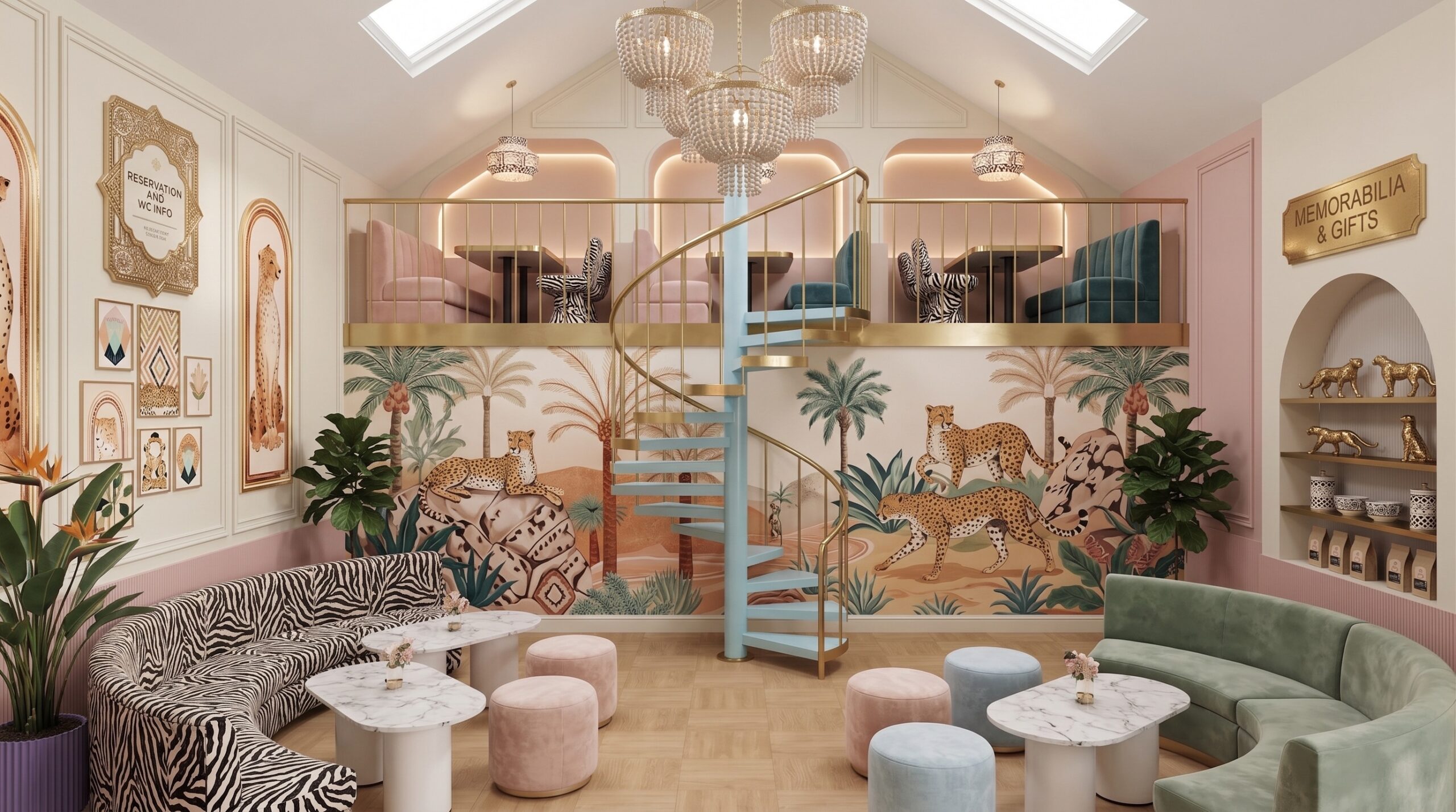 Tropikal temanın pastel tonlarla yorumlandığı bu mekân, çift katlı hacim kurgusu ve galeri boşluğu ile ferah ve katmanlı bir deneyim sunar. Duvar yüzeylerinde kullanılan palmiye illüstrasyonları, desenli döşemeler ve hayvan figürleri mekâna eğlenceli ve karakteristik bir kimlik kazandırırken; yeşil kadife oturma elemanları ve pirinç detaylar mekânın rafine yönünü güçlendirir.