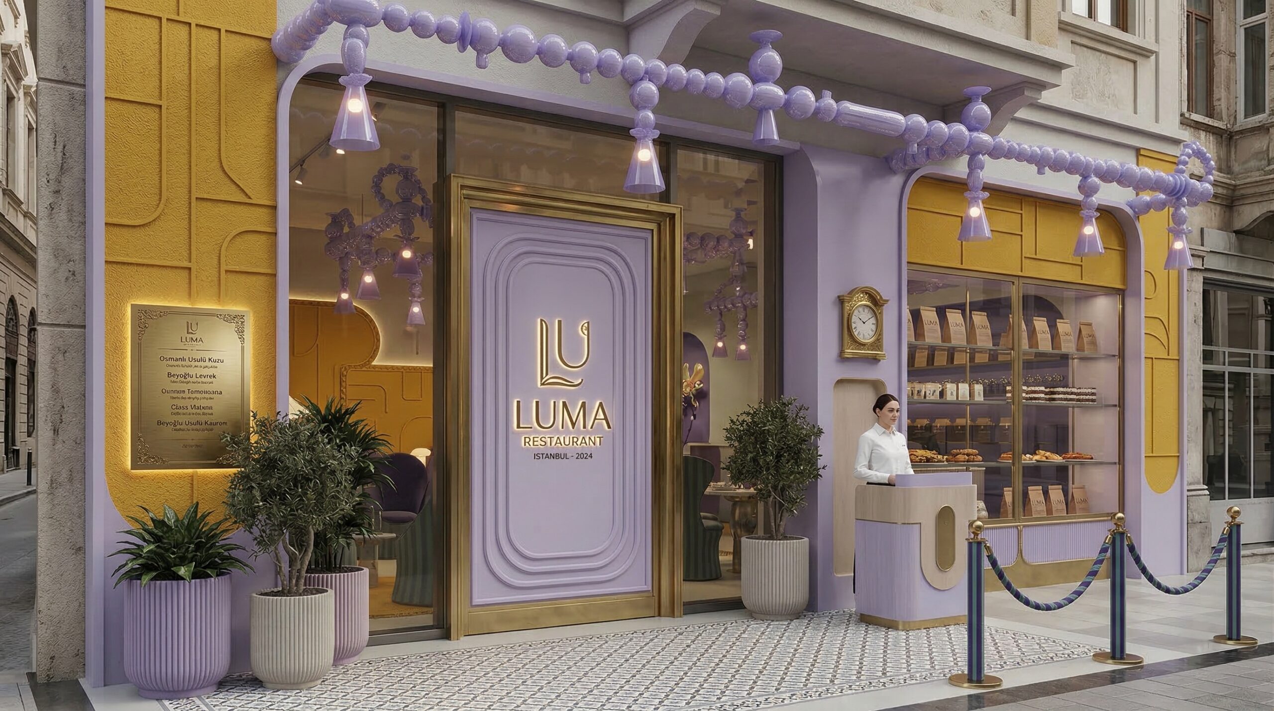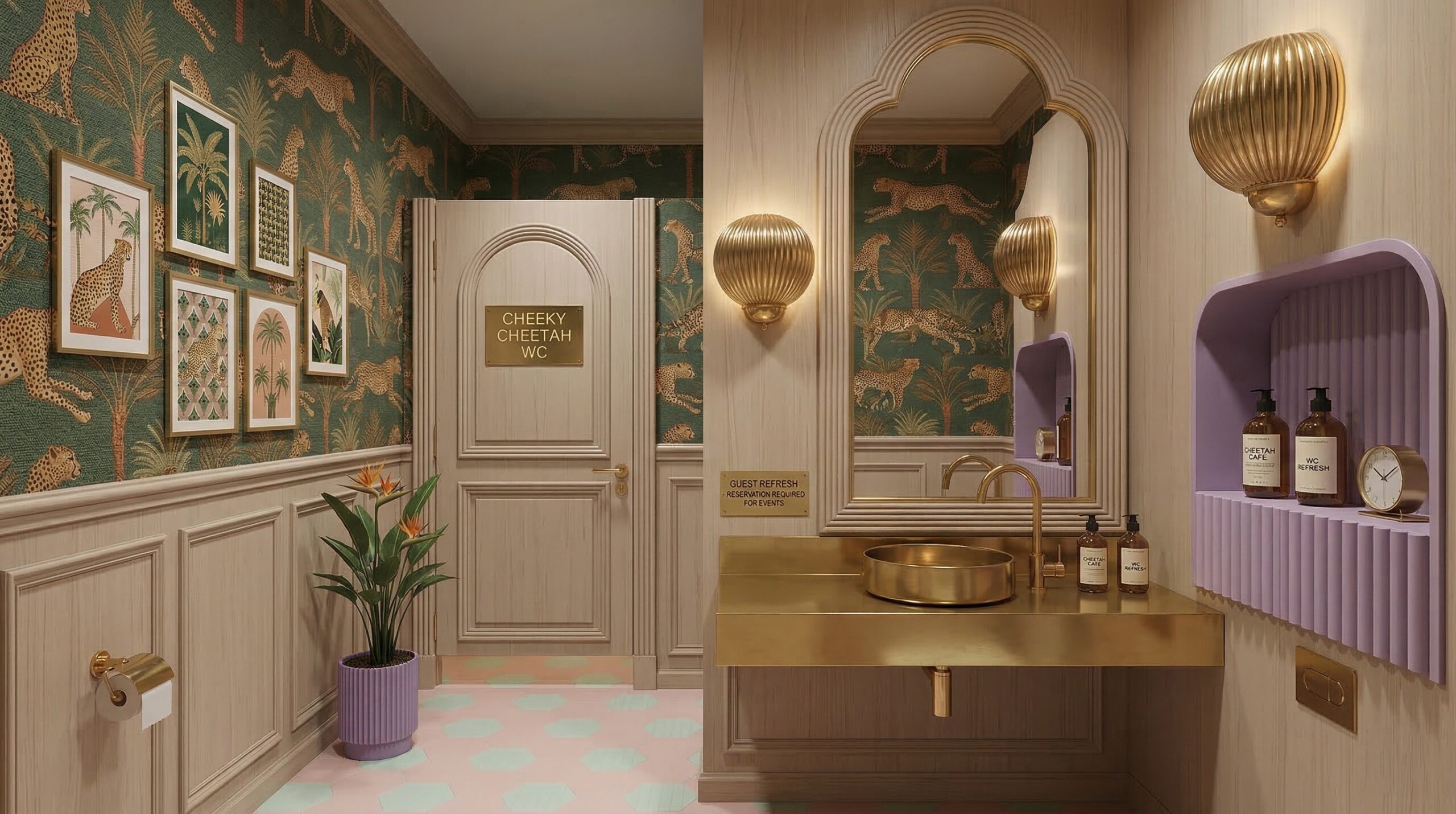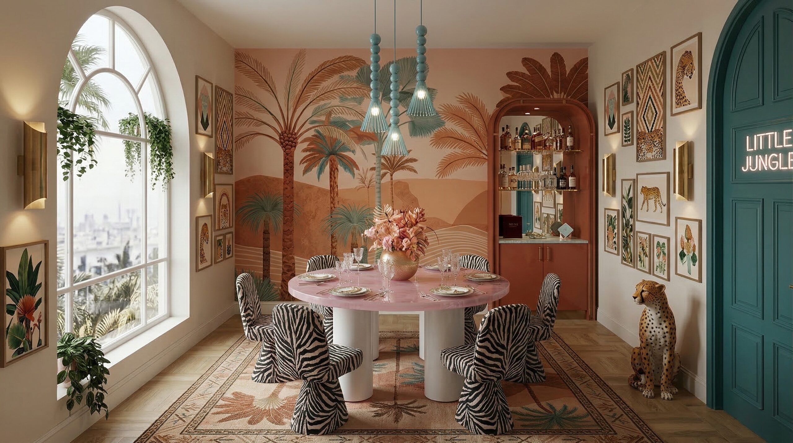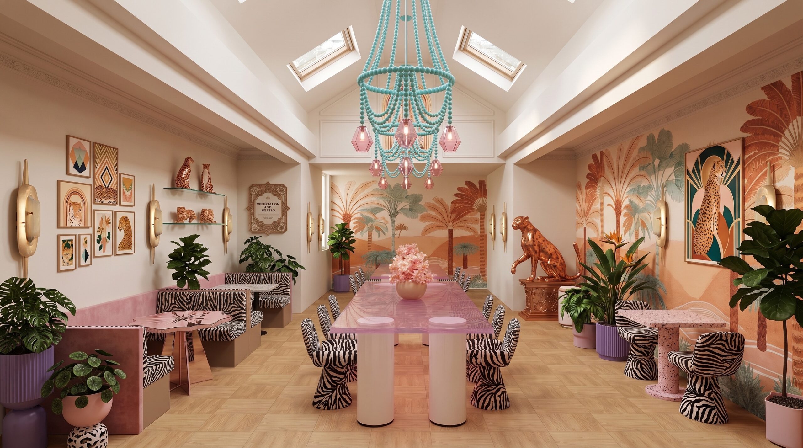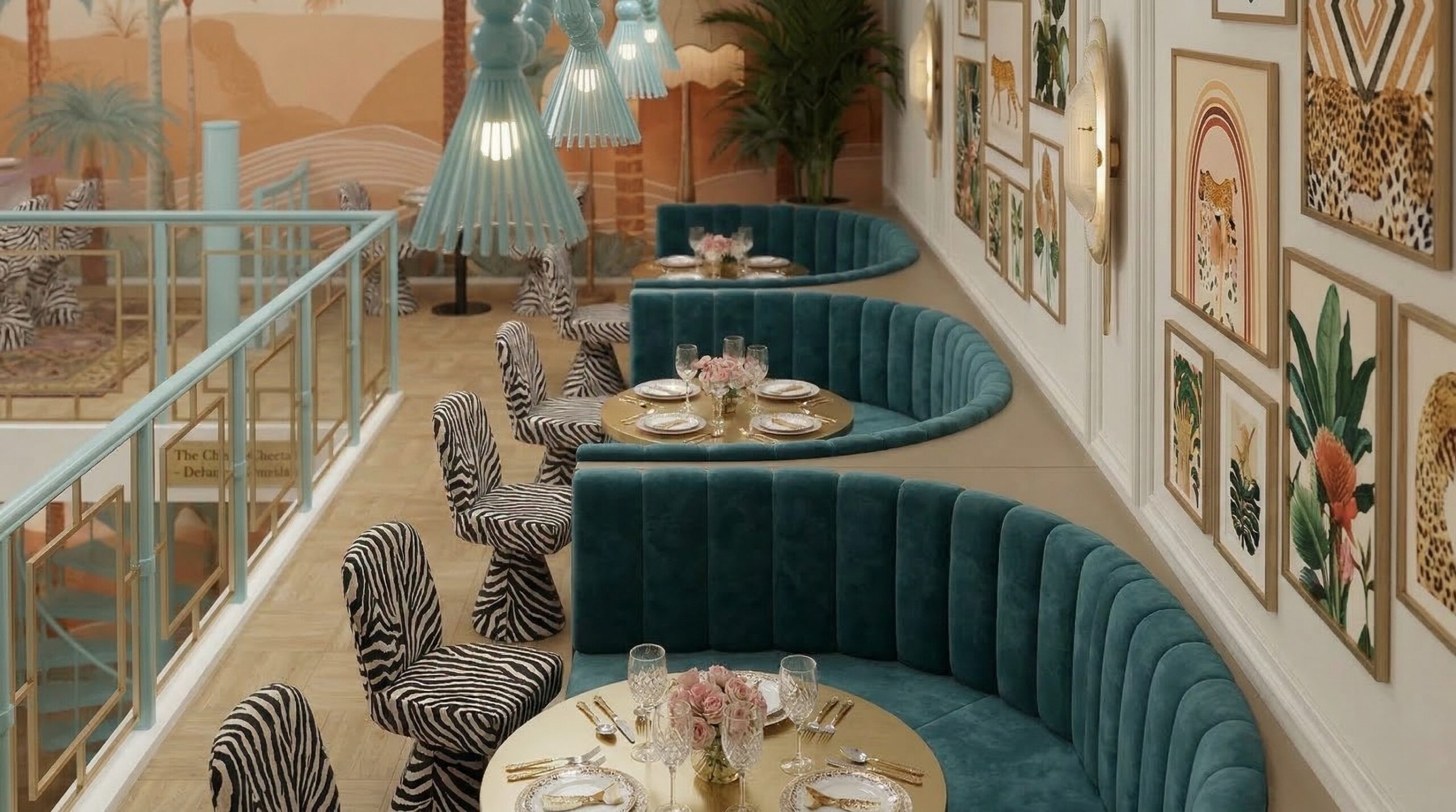 Tropikal temanın pastel tonlarla yorumlandığı bu mekân, çift katlı hacim kurgusu ve galeri boşluğu ile ferah ve katmanlı bir deneyim sunar. Duvar yüzeylerinde kullanılan palmiye illüstrasyonları, desenli döşemeler ve hayvan figürleri mekâna eğlenceli ve karakteristik bir kimlik kazandırırken; yeşil kadife oturma elemanları ve pirinç detaylar mekânın rafine yönünü güçlendirir.