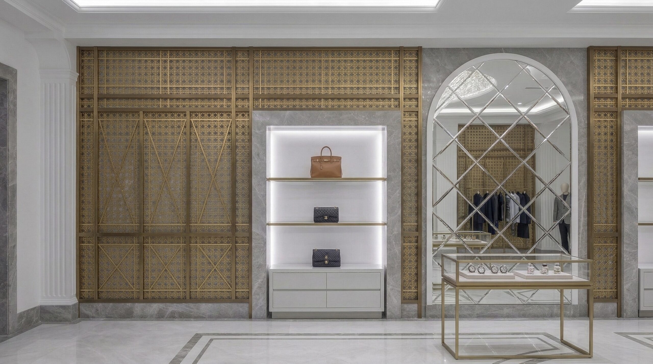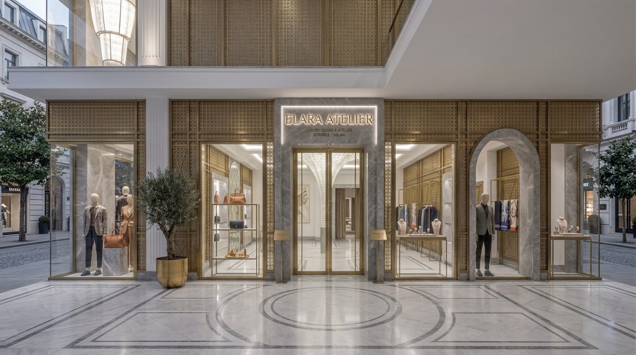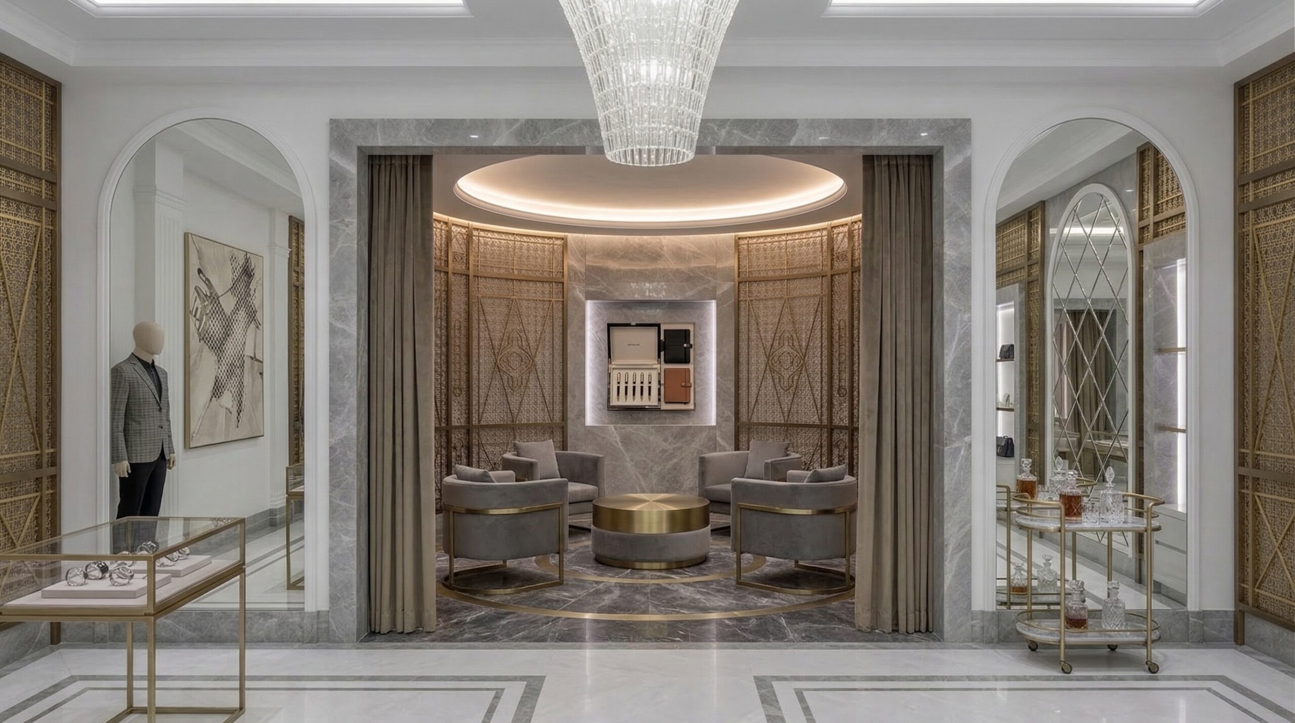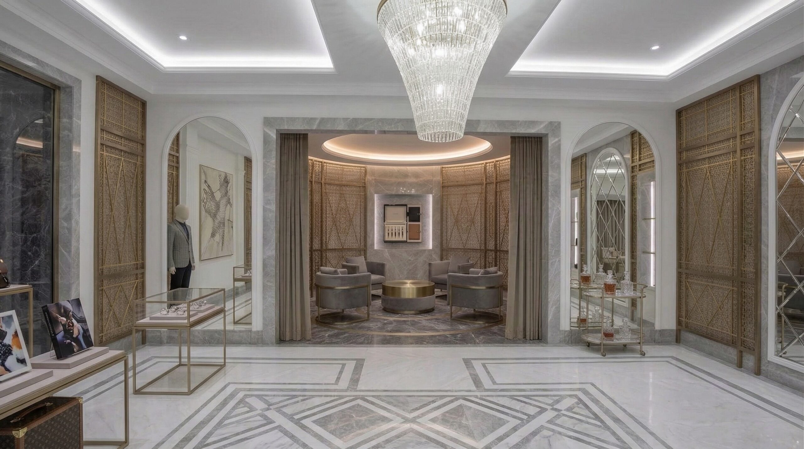 Beyaz mermer yüzeyler ve altın tonlu metal detaylar, mekâna sofistike ve zamansız bir karakter kazandırırken; kemerli nişler ve vitrin sistemleri ürünleri galeri estetiğinde sergiler. Simetrik yerleşim düzeni, mekânda dengeli bir dolaşım akışı sağlarken; arka bölümde konumlanan oturma alanları daha özel ve rafine bir deneyim sunar.