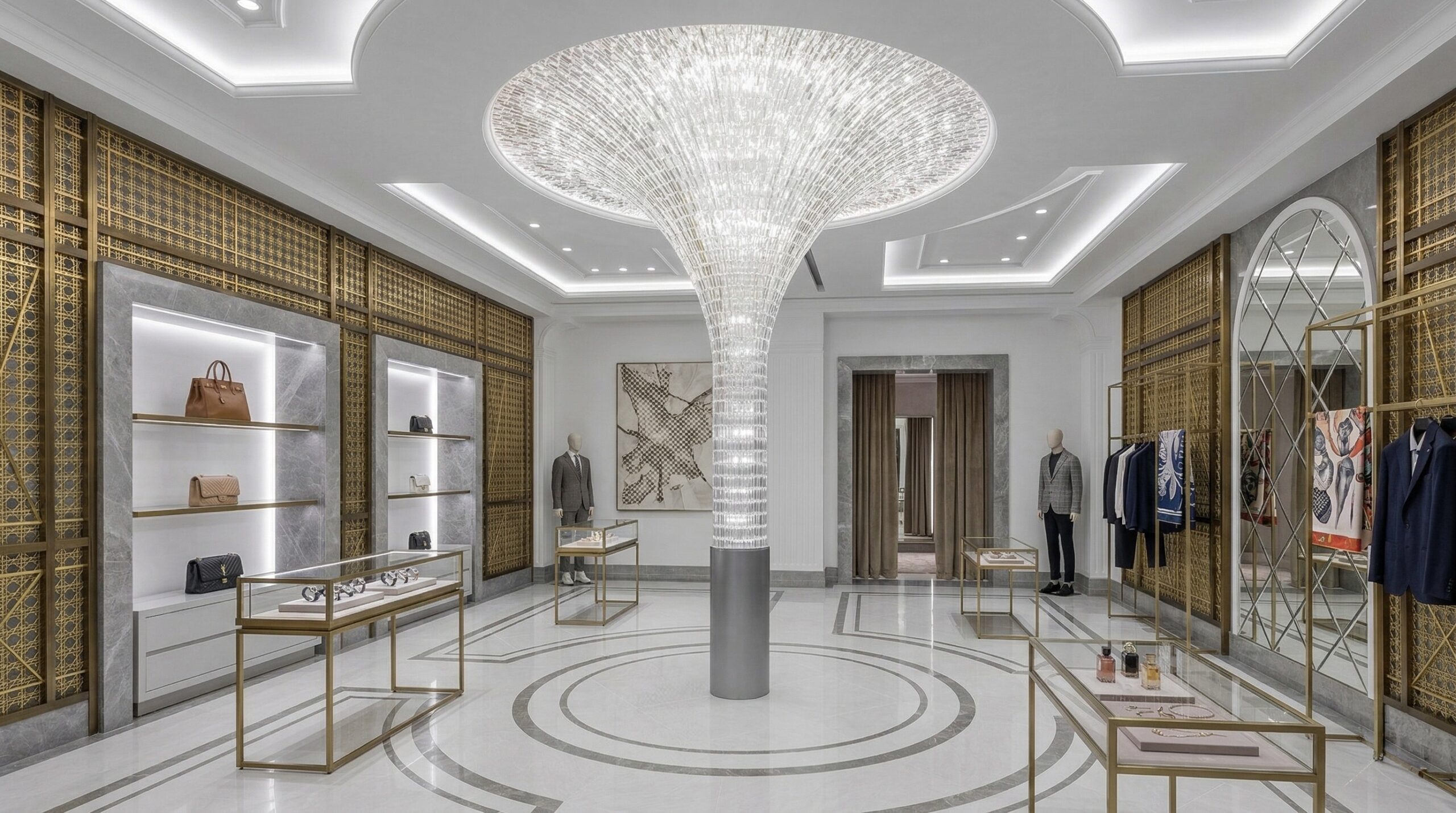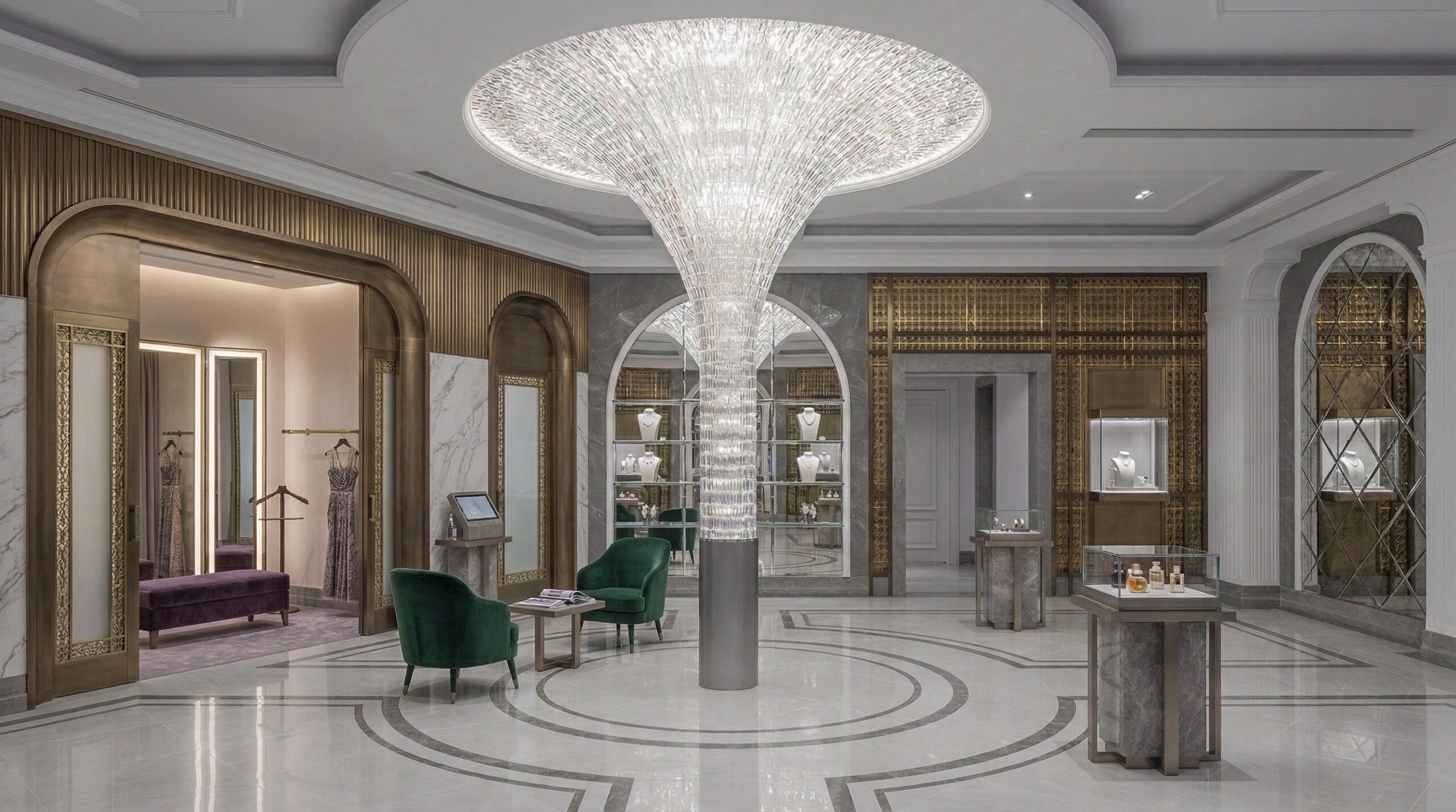 Zarif malzeme kullanımı ve güçlü merkez kurgusu ile şekillenen bu mağaza tasarımı, lüks perakende deneyimini mimari bir sahneye dönüştürür. Mekânın merkezinde konumlanan heykelsi avize ve dairesel plan şeması, tüm alanı organize eden bir odak noktası oluşturur.