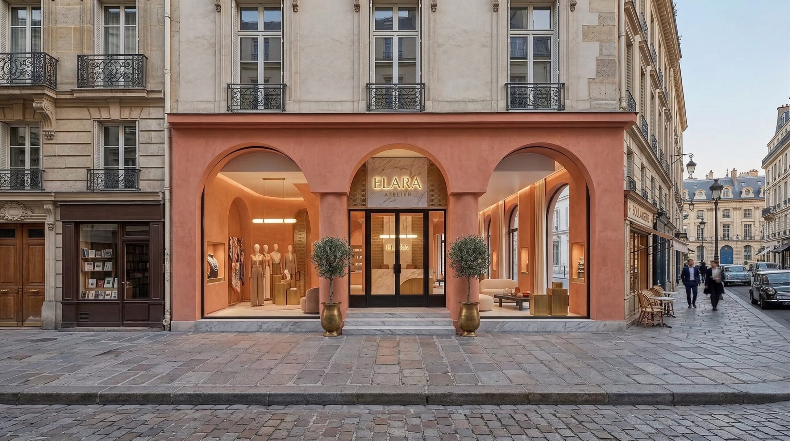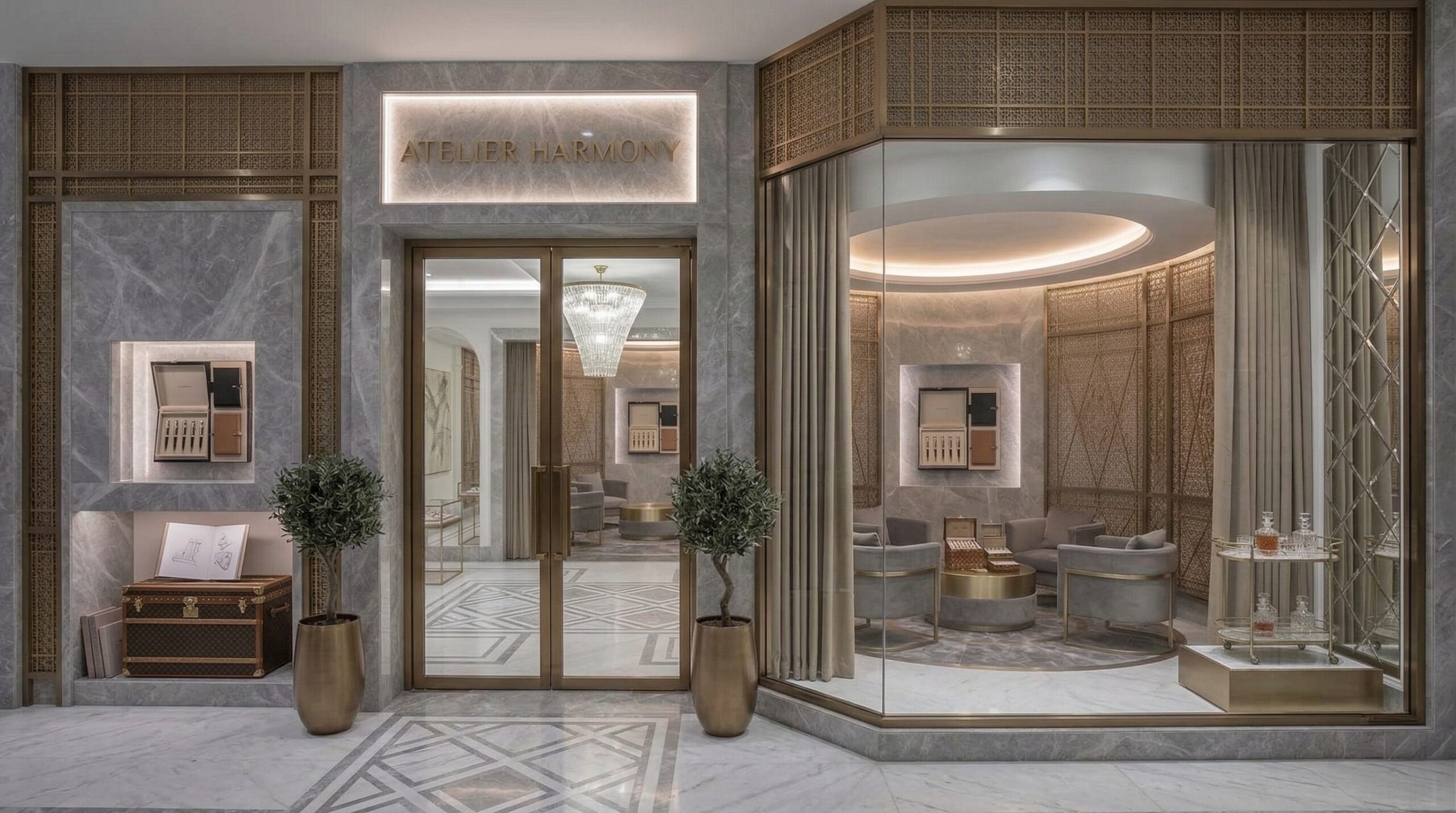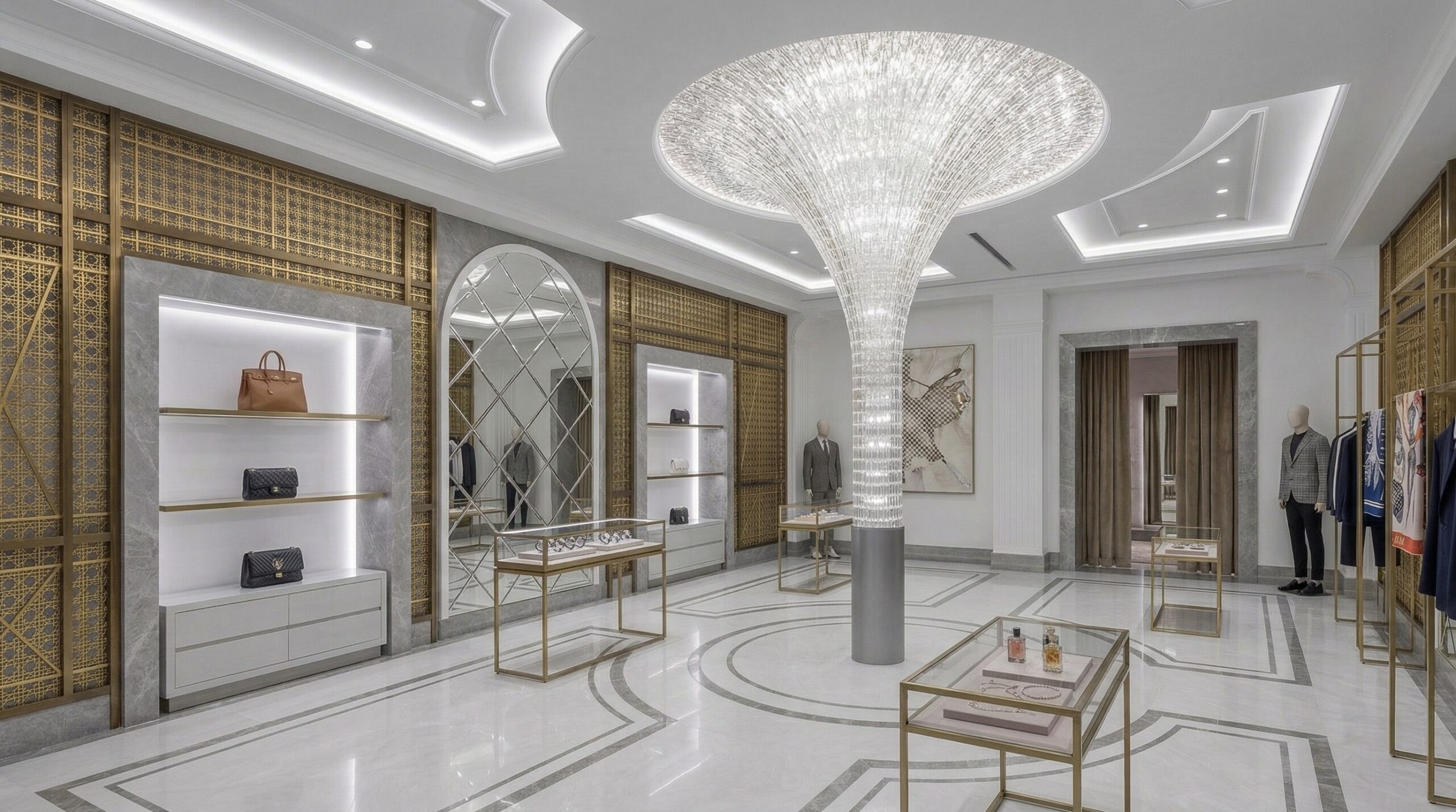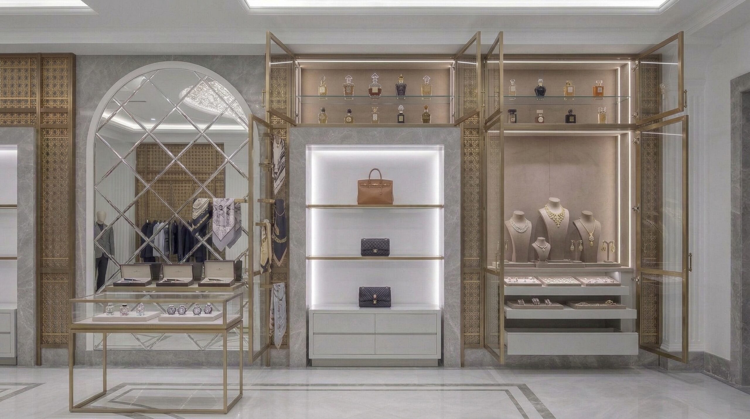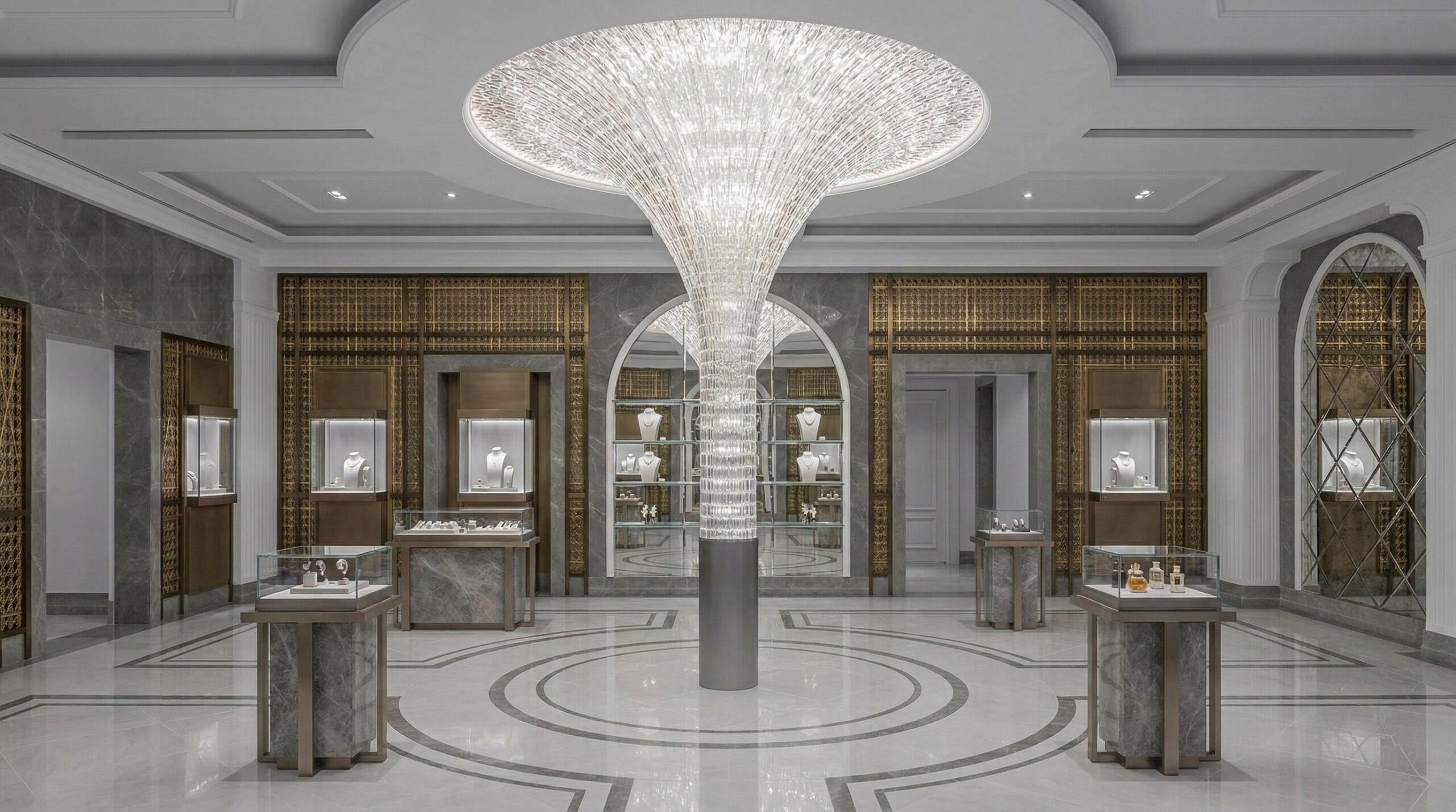 Cam vitrinler, ince metal çerçeveler ve yumuşak aydınlatma geçişleri, tasarımın bütüncül ve lüks algısını güçlendirir. Tasarım dili, klasik ihtişam ile çağdaş sadeliği bir araya getirerek üst segment bir marka kimliği oluşturur.