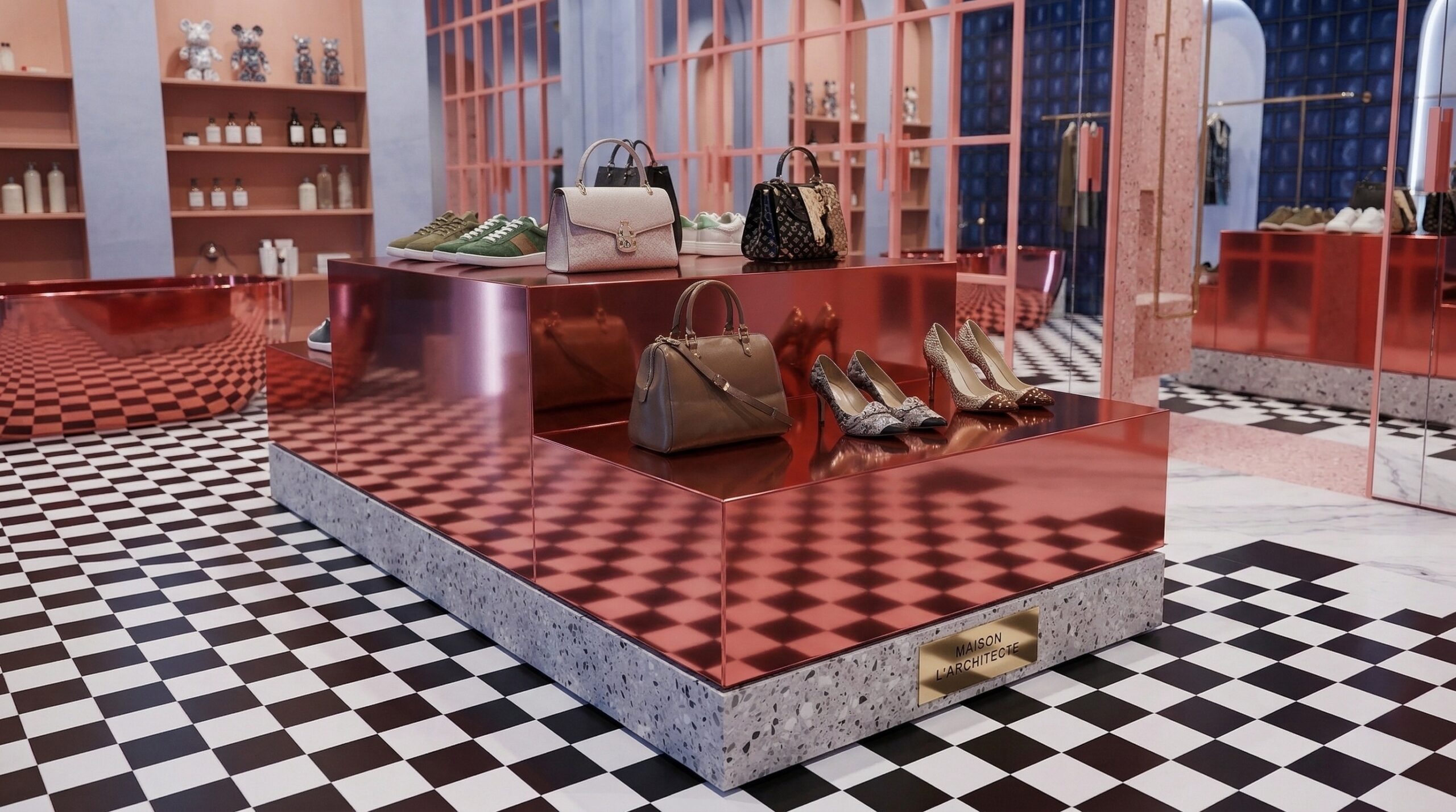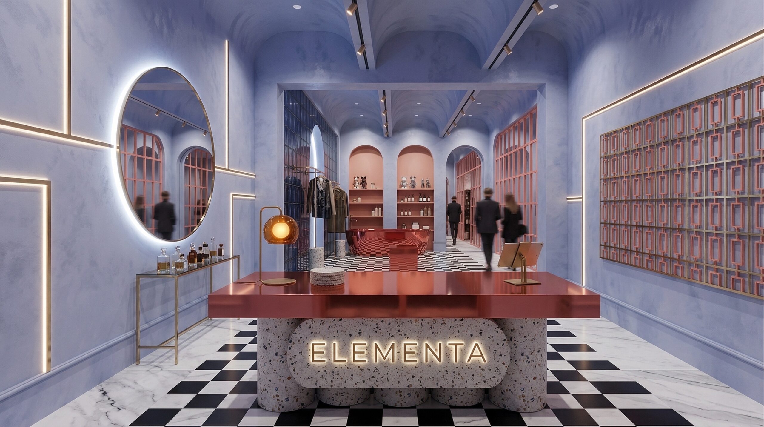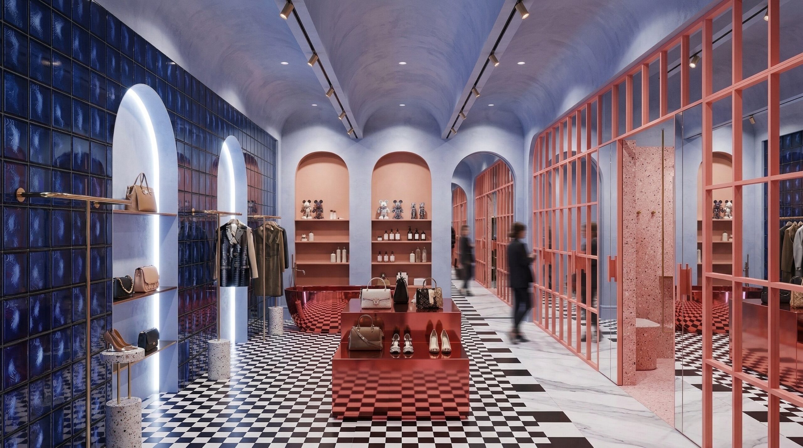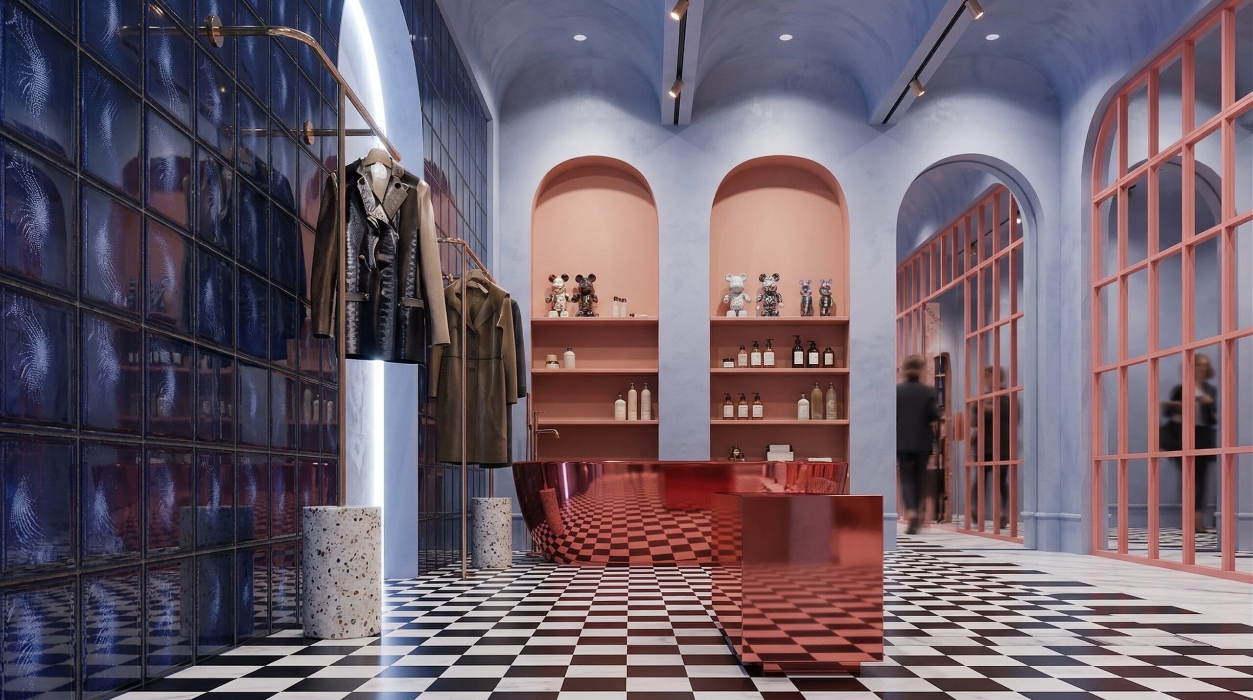 Cam, metal ve parlak yüzeylerin birlikte kullanımı, mekâna çağdaş ve dinamik bir karakter kazandırır. Tasarım dili, klasik butik anlayışını cesur renk kullanımı ve grafik zemin dili ile yeniden yorumlayan güçlü bir mekânsal ifade ortaya koyar.