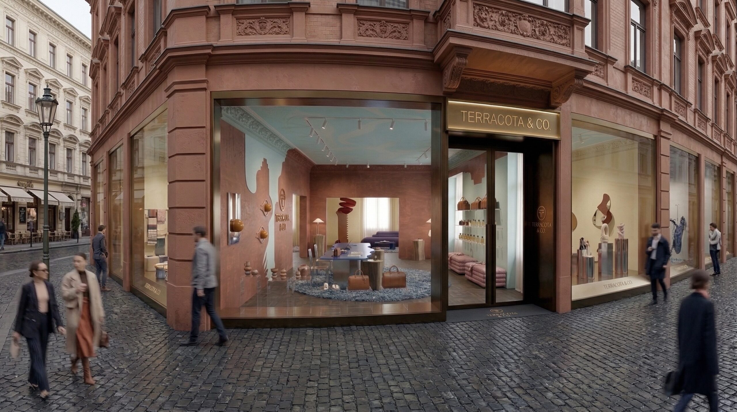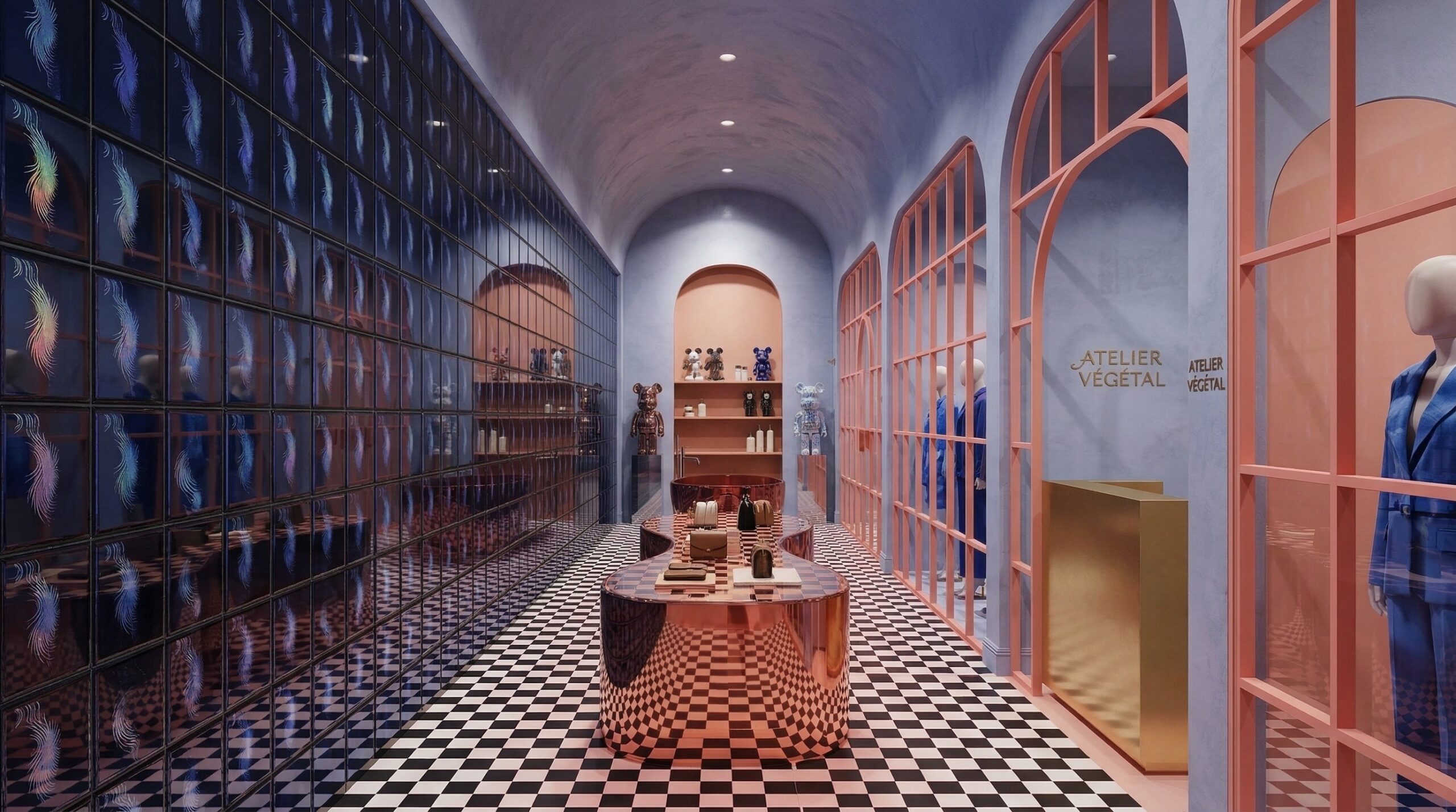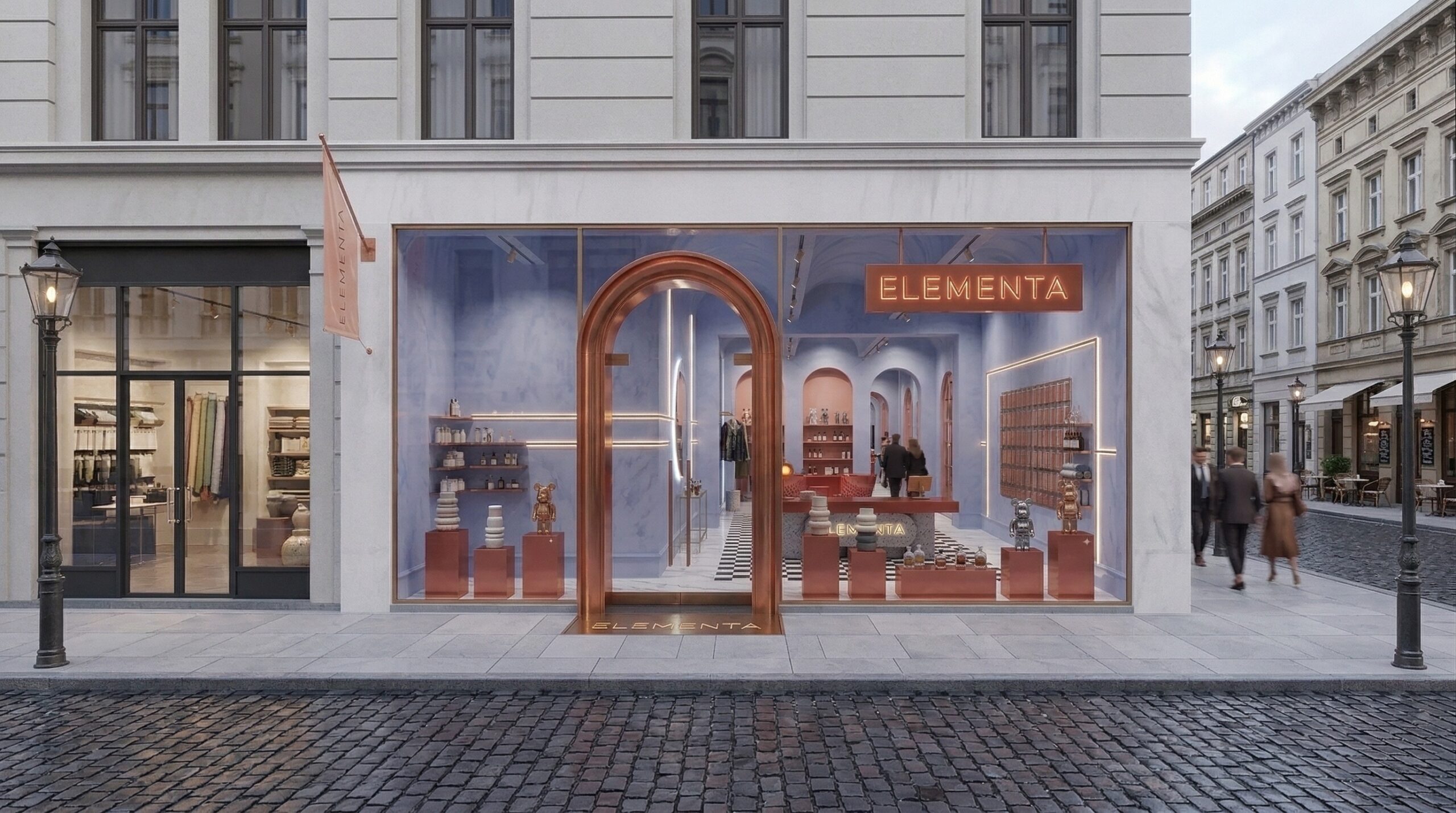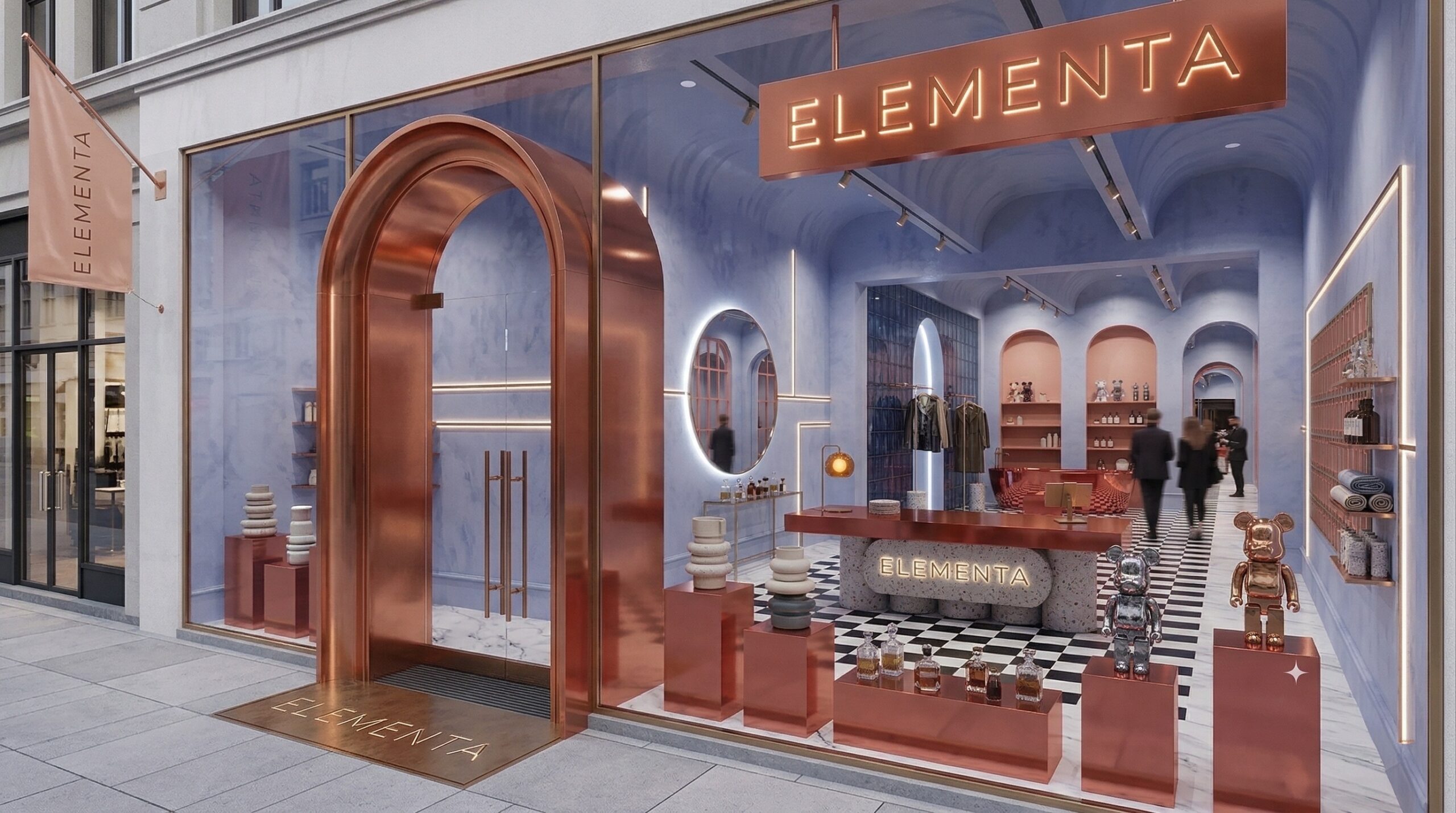 Cam, metal ve parlak yüzeylerin birlikte kullanımı, mekâna çağdaş ve dinamik bir karakter kazandırır. Tasarım dili, klasik butik anlayışını cesur renk kullanımı ve grafik zemin dili ile yeniden yorumlayan güçlü bir mekânsal ifade ortaya koyar.