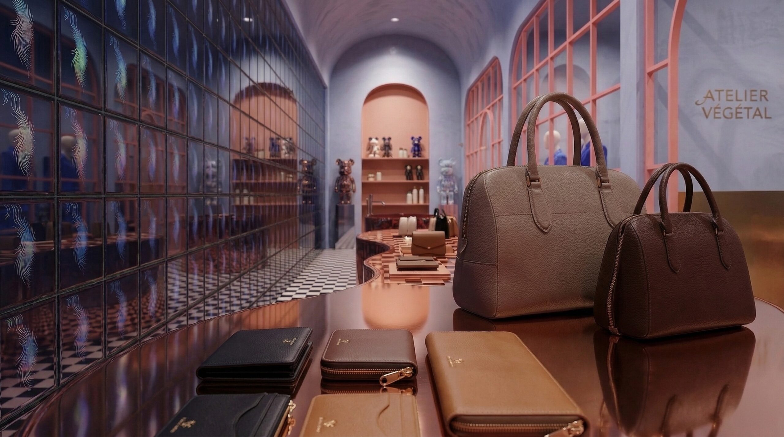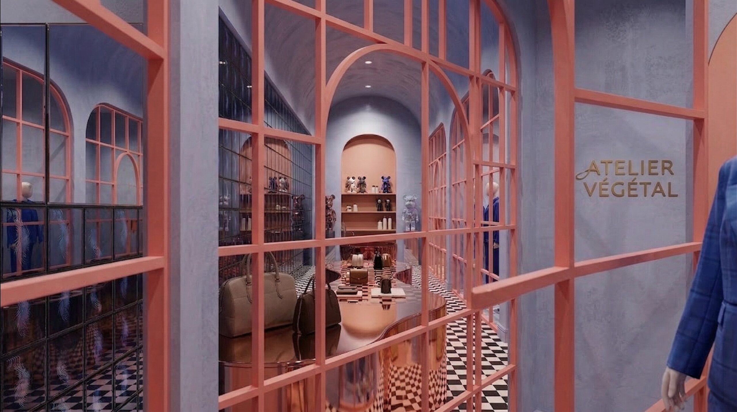 Siyah-beyaz damalı zemin, mekân boyunca yönlendirici bir altyapı sunarak sergileme alanlarını belirginleştirir. Uzun aks boyunca yer alan raf sistemleri ve vitrinler, ürünleri lineer bir galeri düzeninde sunarken; merkezde konumlanan platformlar odak noktaları oluşturur.