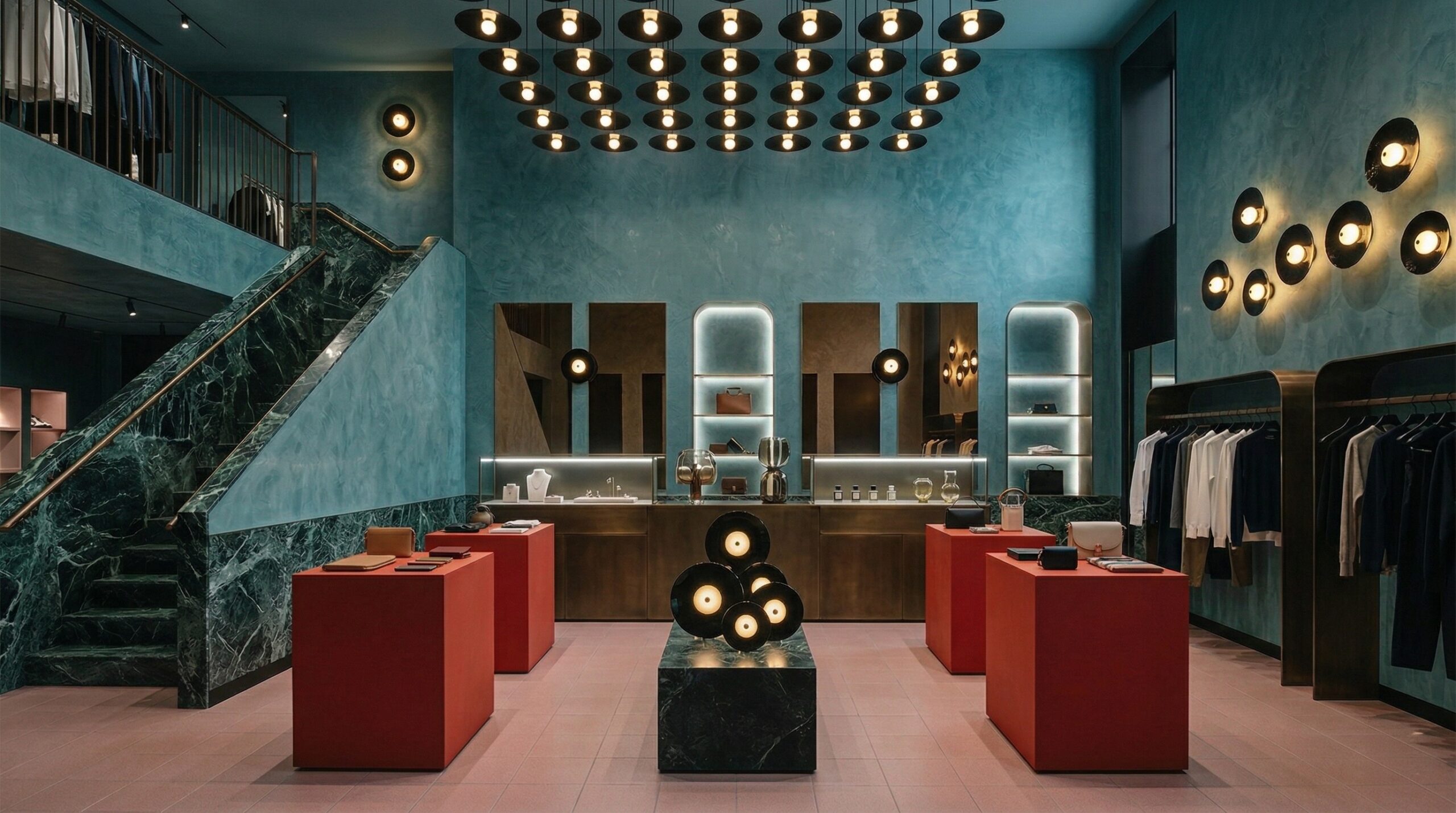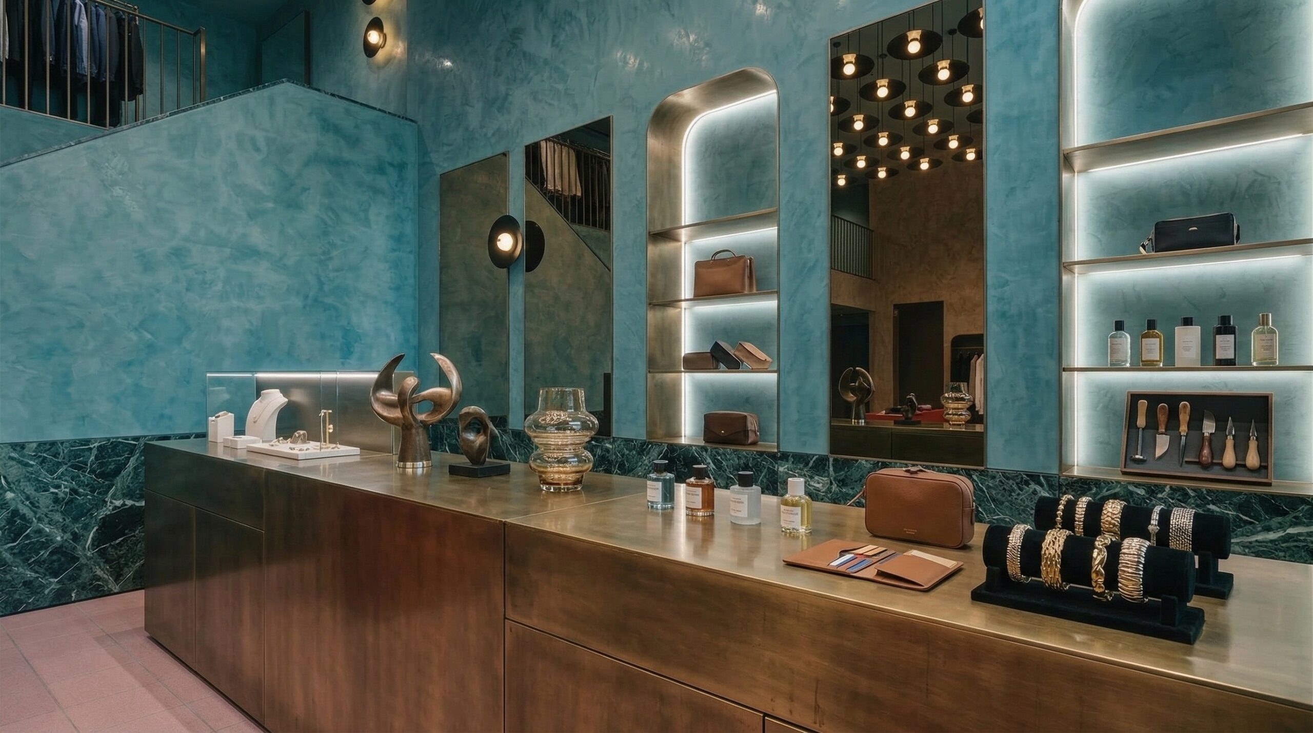 Duvar boyunca devam eden vitrinler ve özel sergileme nişleri, koleksiyonların galerisel bir düzende sunulmasına olanak tanır. Tasarım yaklaşımı, klasik lüks anlayışını çağdaş bir yorumla ele alarak zamansız ve rafine bir atmosfer üretir.