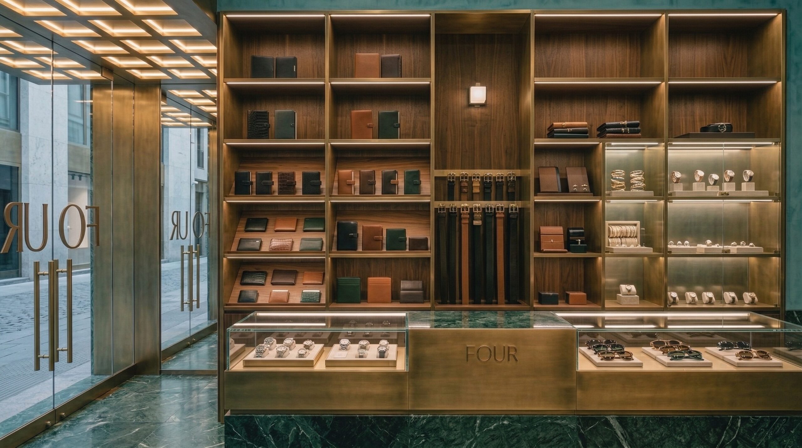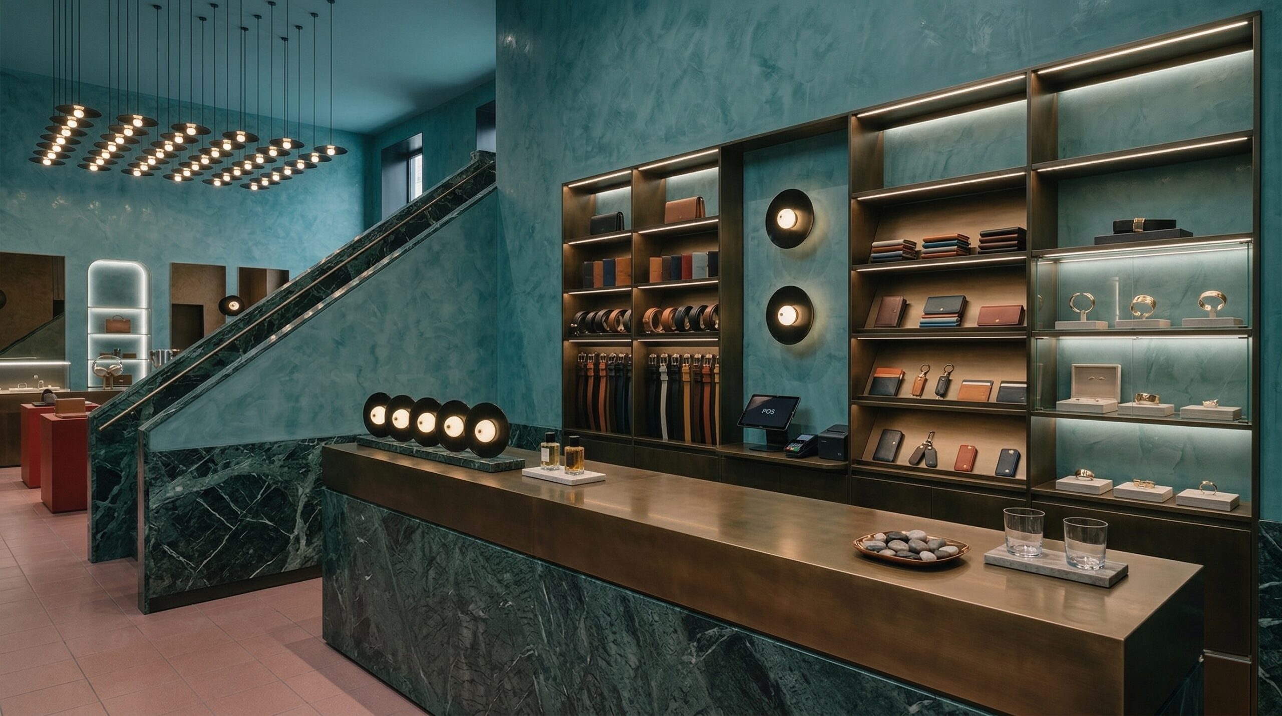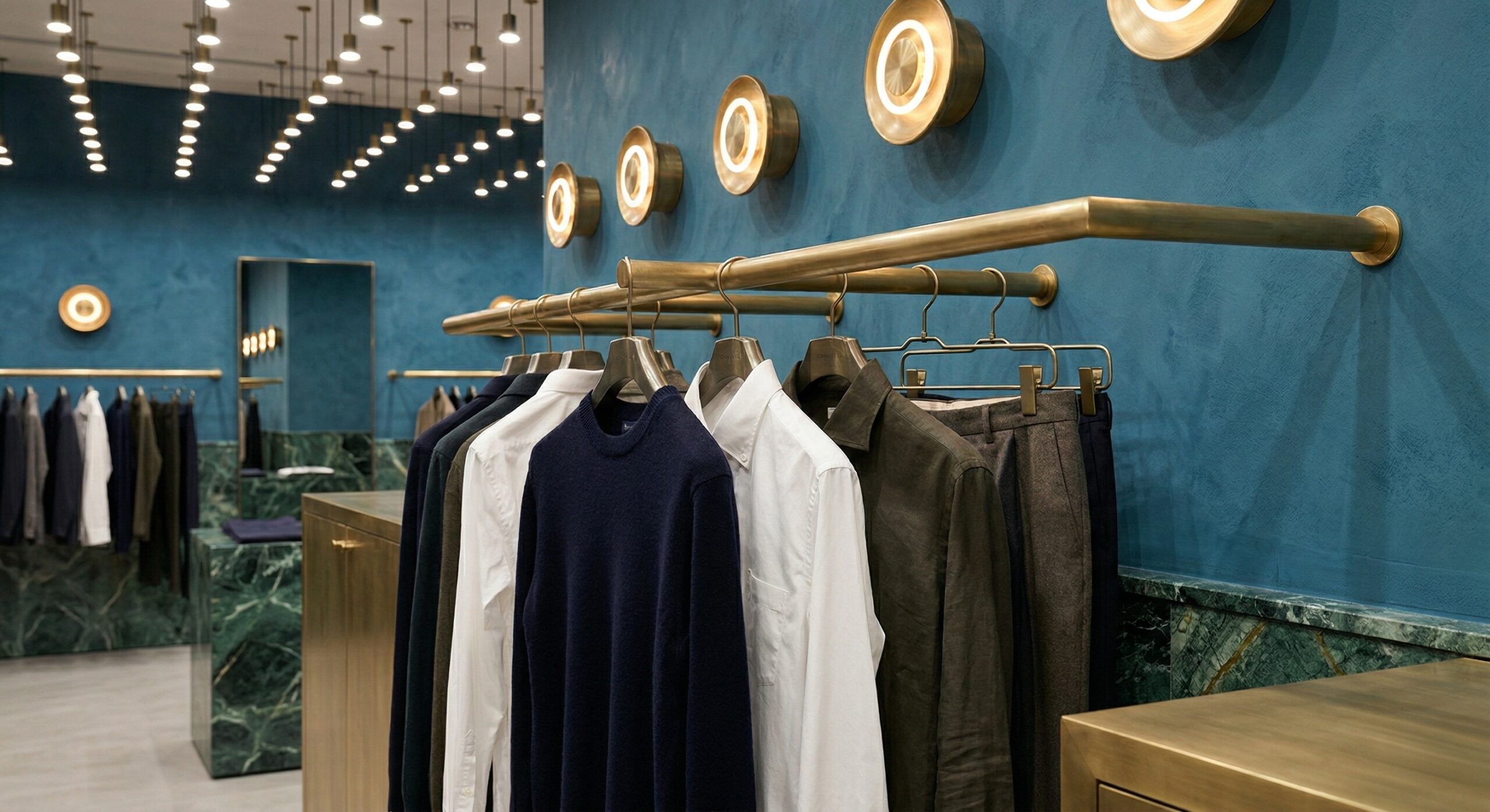Zengin malzeme paleti ve dengeli renk kullanımı ile kurgulanan bu mağaza tasarımı, modern klasik bir perakende deneyimi sunar. Derin yeşil tonlu duvar yüzeyleri, pirinç detaylar ve doğal ahşap elemanlar ile birleşerek mekâna sofistike bir karakter kazandırır.