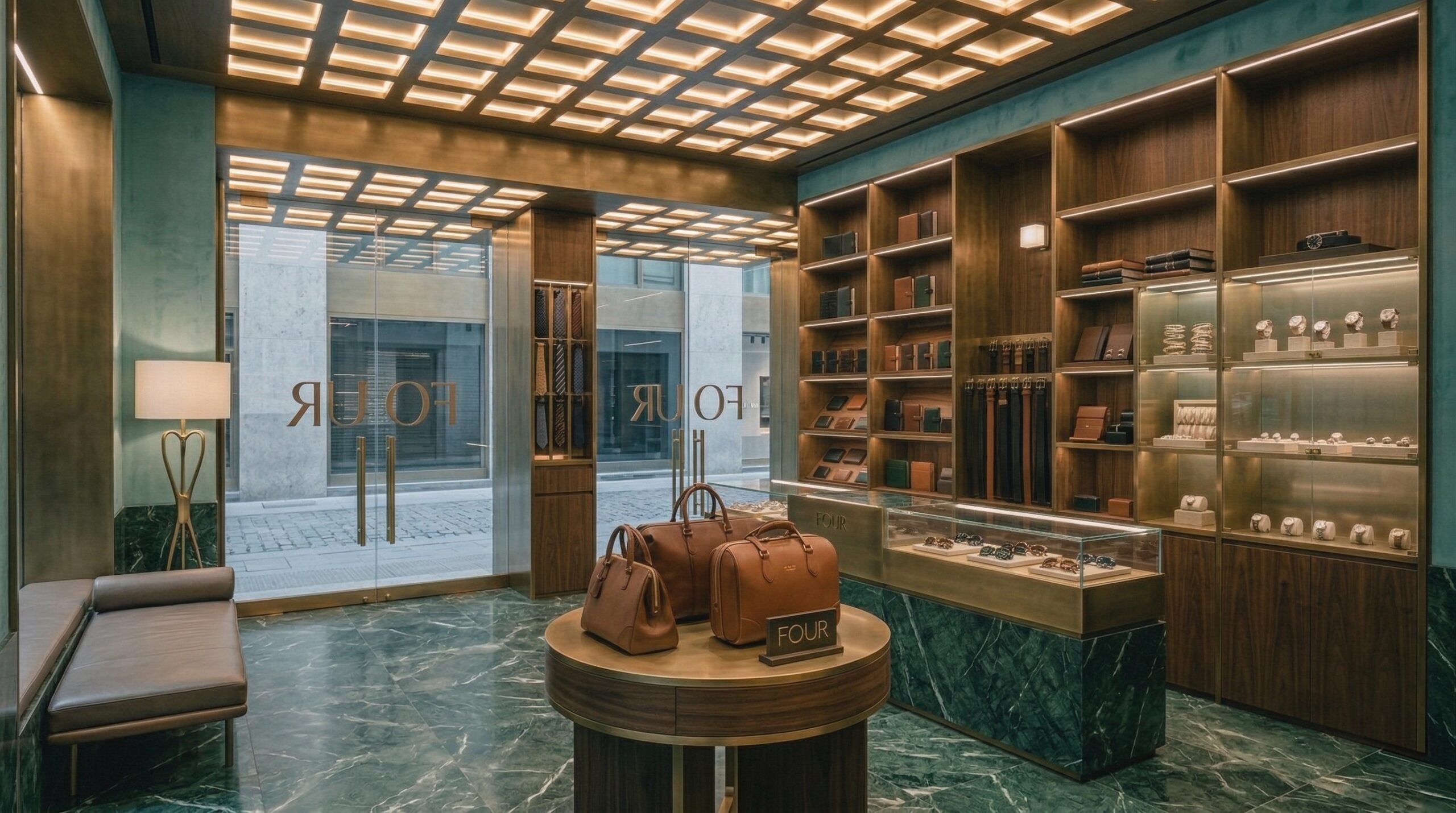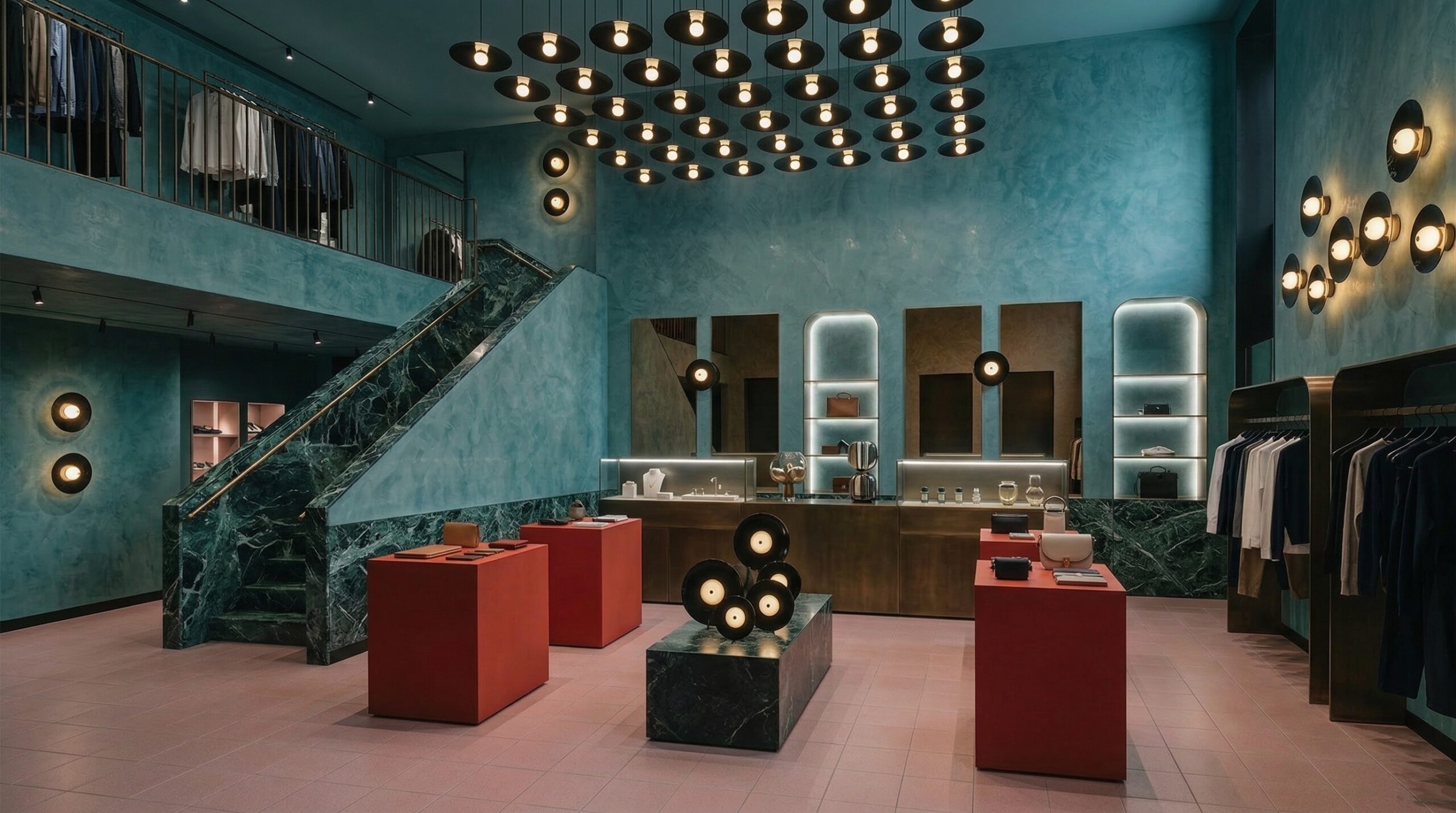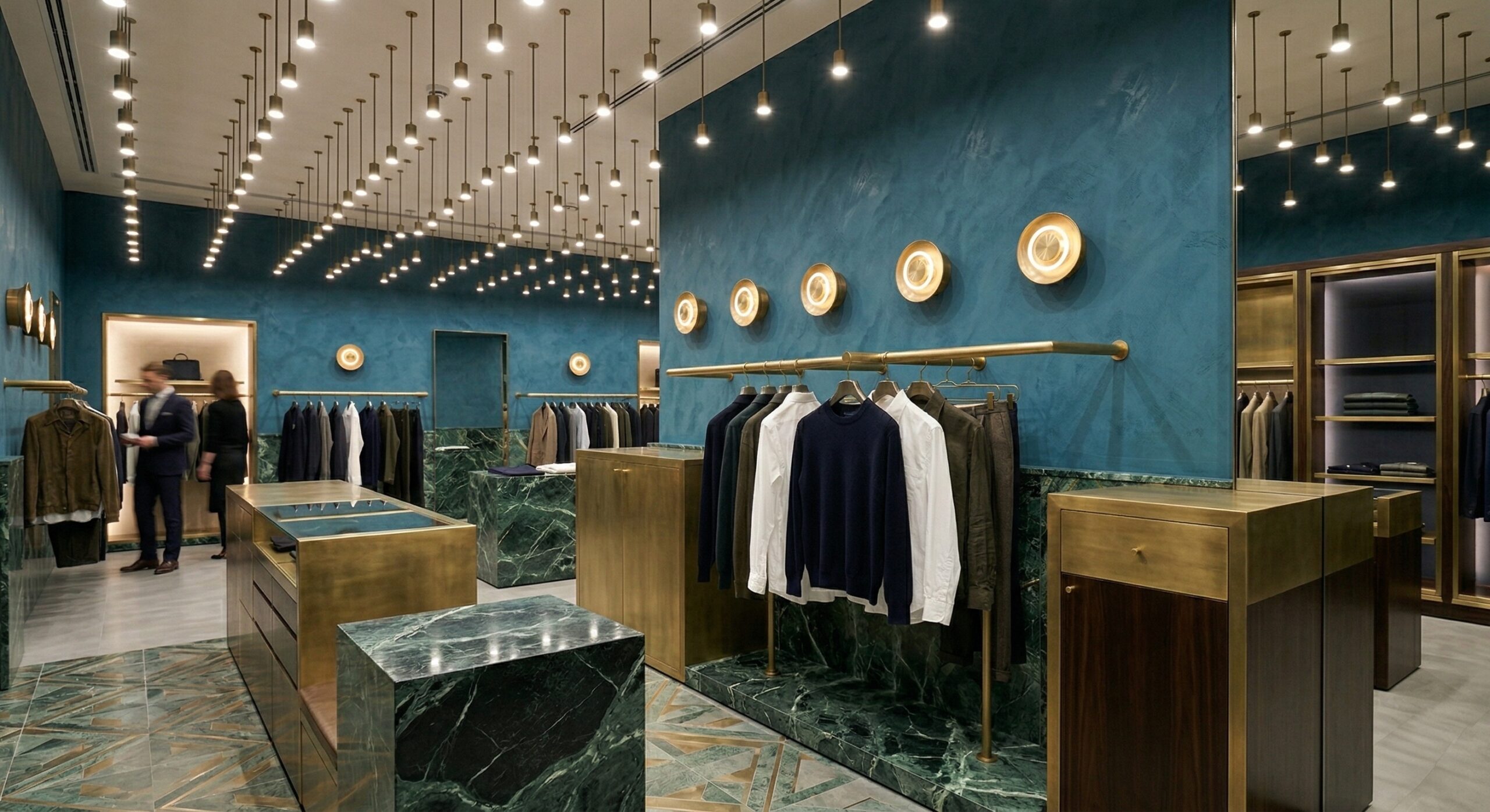 Zengin malzeme paleti ve dengeli renk kullanımı ile kurgulanan bu mağaza tasarımı, modern klasik bir perakende deneyimi sunar. Derin yeşil tonlu duvar yüzeyleri, pirinç detaylar ve doğal ahşap elemanlar ile birleşerek mekâna sofistike bir karakter kazandırır.