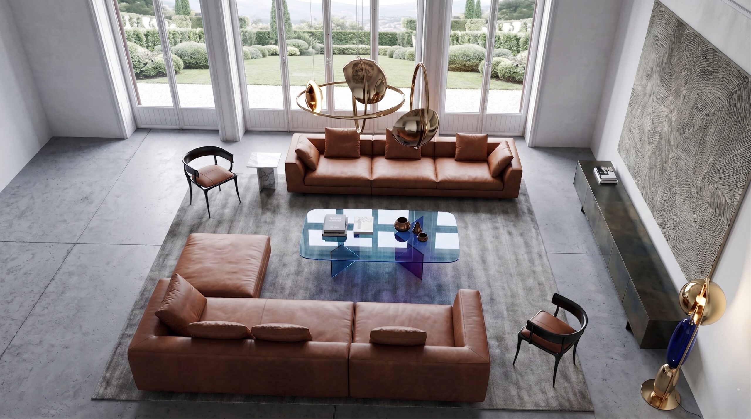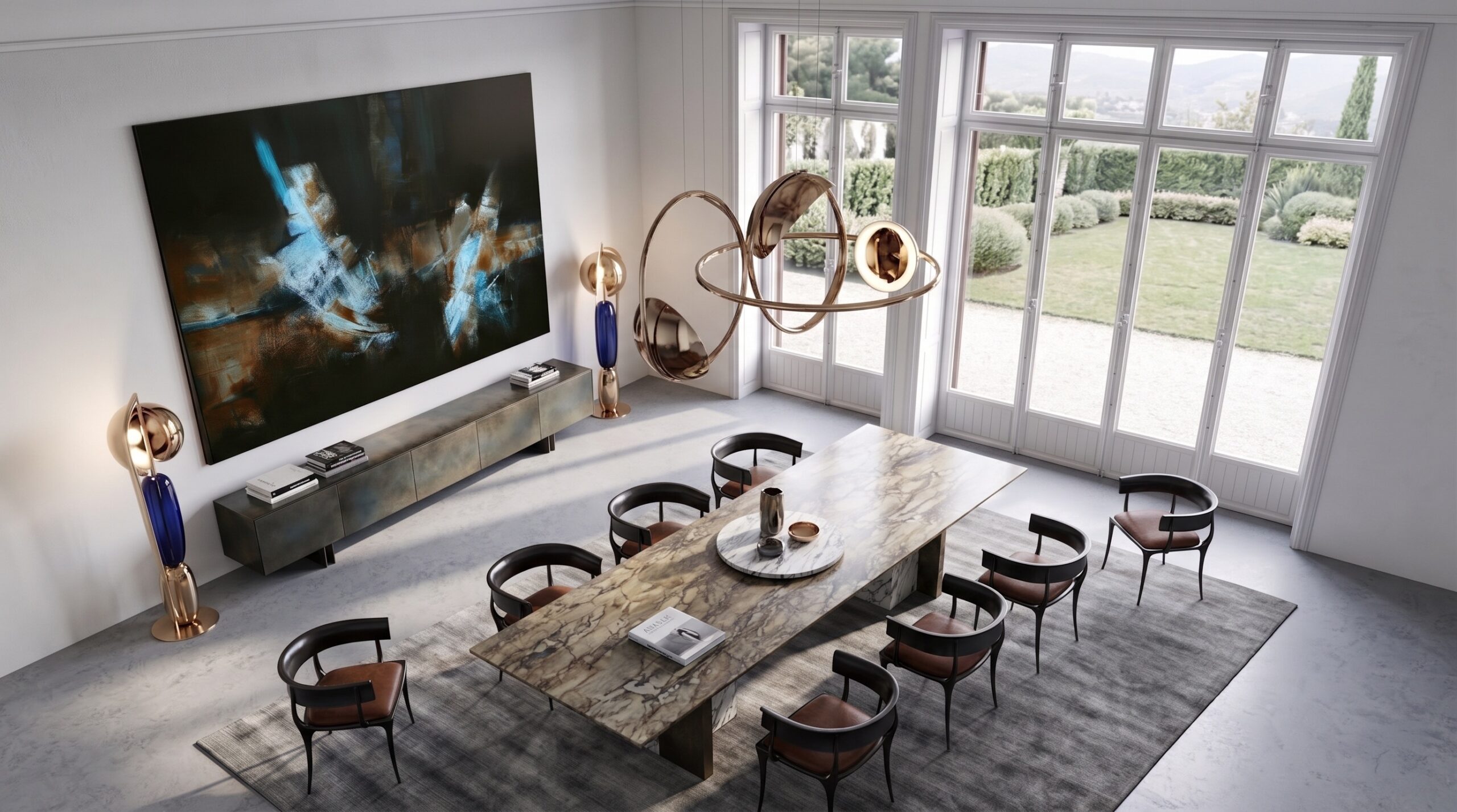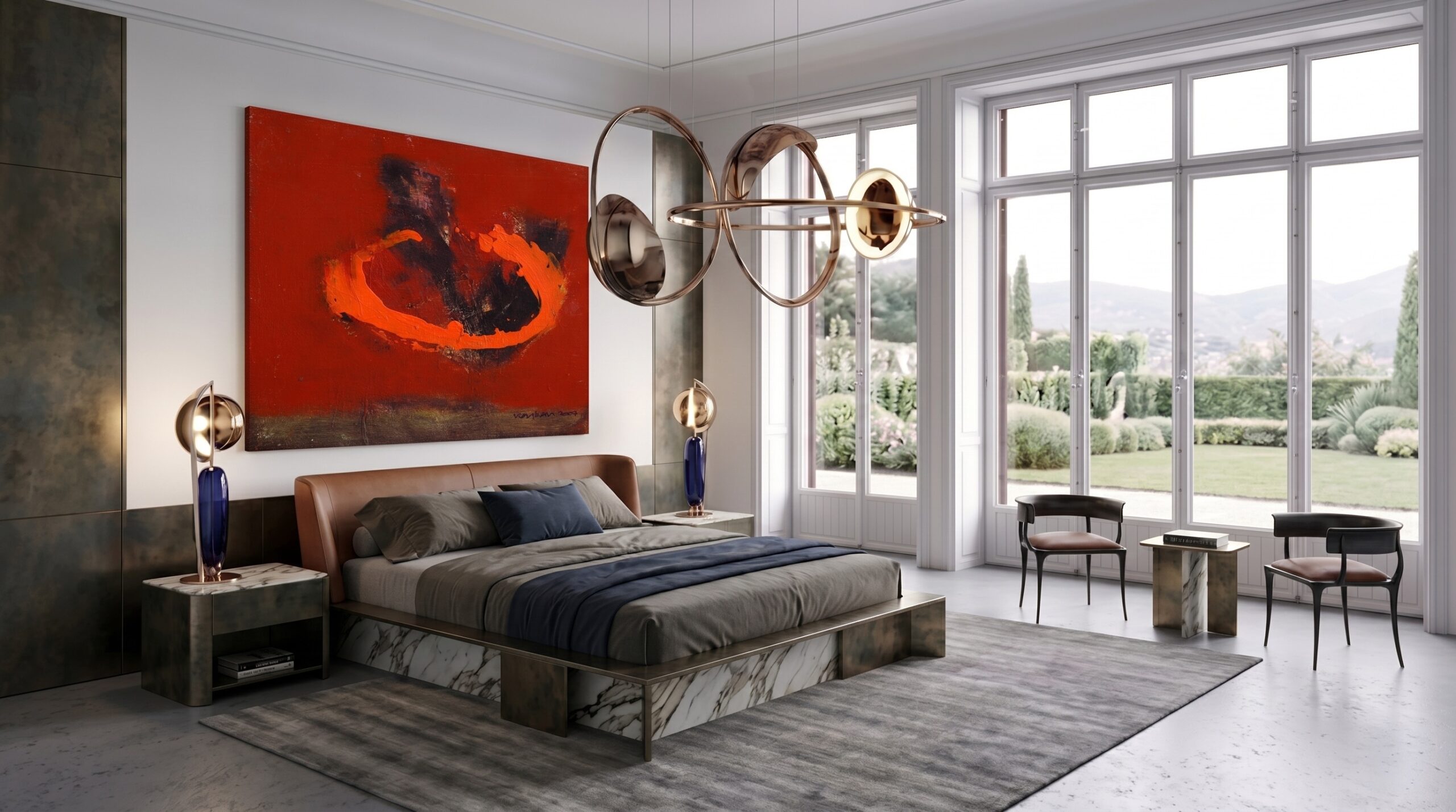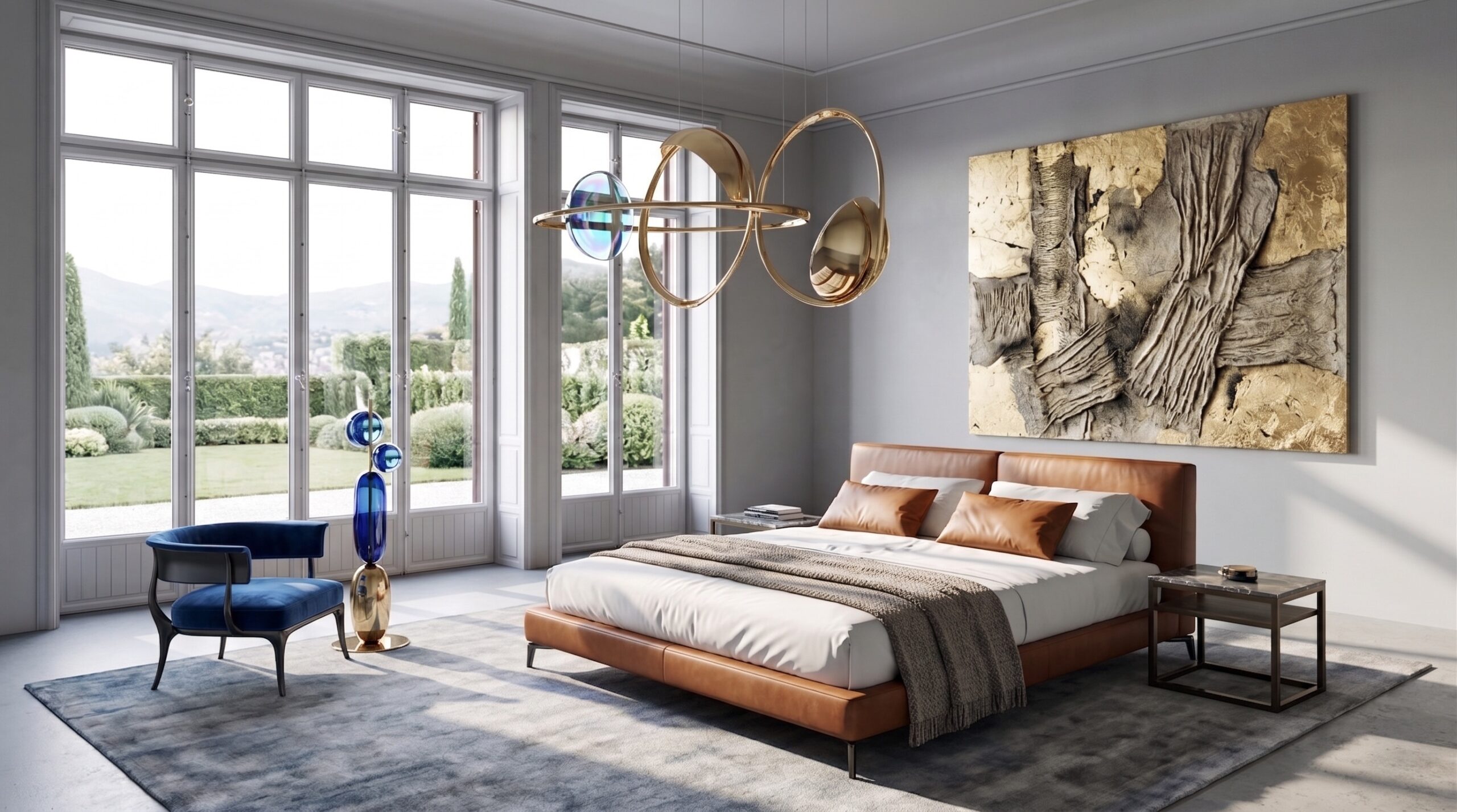Modüler deri oturma grupları, masif yemek masası, sade yatak üniteleri ve lineer mutfak kurgusu mekânın ana karakterini belirler. Büyük ölçekli sanat eserleri, metal detaylı aydınlatmalar ve doğal taş yüzeyler, mekânda güçlü bir odak ve dengeli bir malzeme kompozisyonu oluşturur.