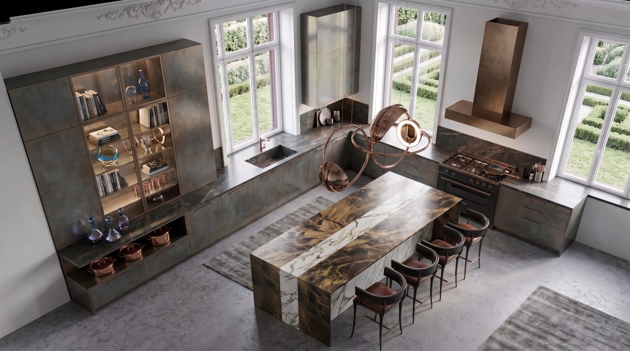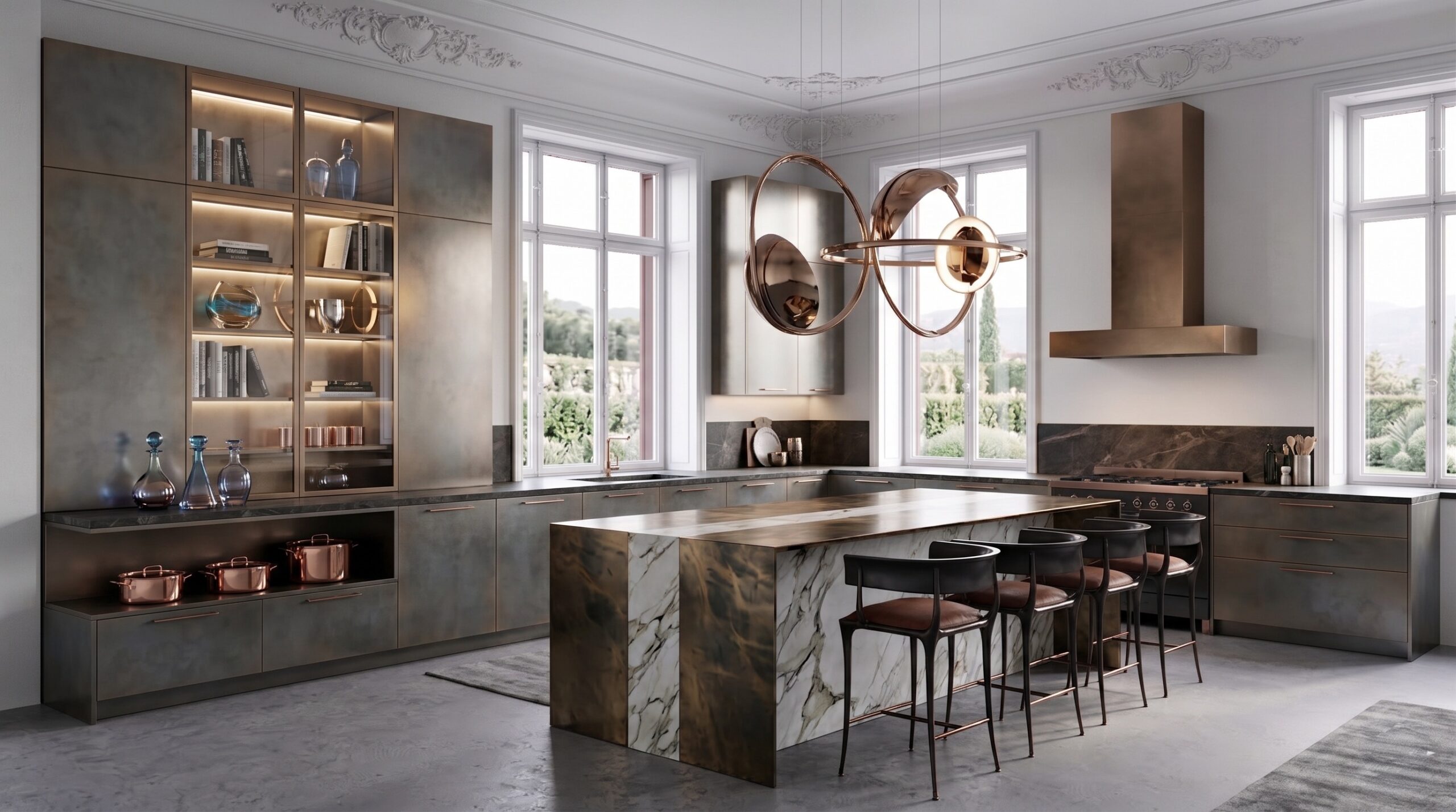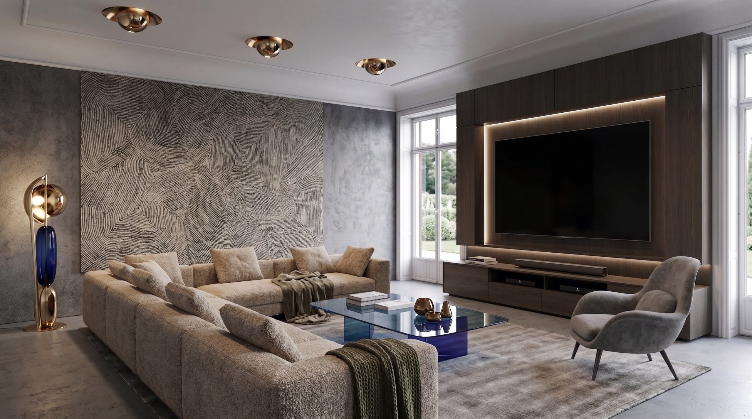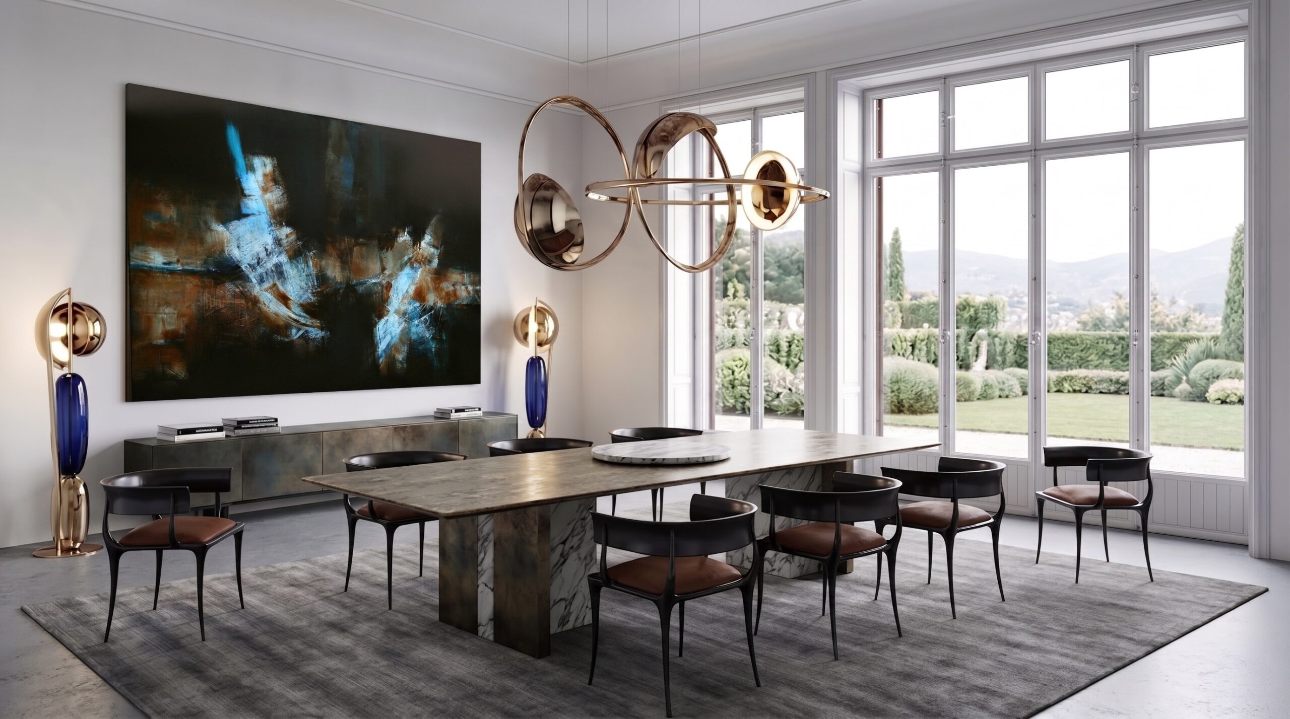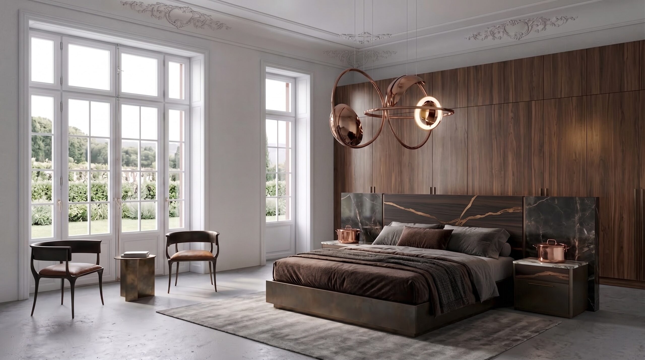 Modüler deri oturma grupları, masif yemek masası, sade yatak üniteleri ve lineer mutfak kurgusu mekânın ana karakterini belirler. Büyük ölçekli sanat eserleri, metal detaylı aydınlatmalar ve doğal taş yüzeyler, mekânda güçlü bir odak ve dengeli bir malzeme kompozisyonu oluşturur.
