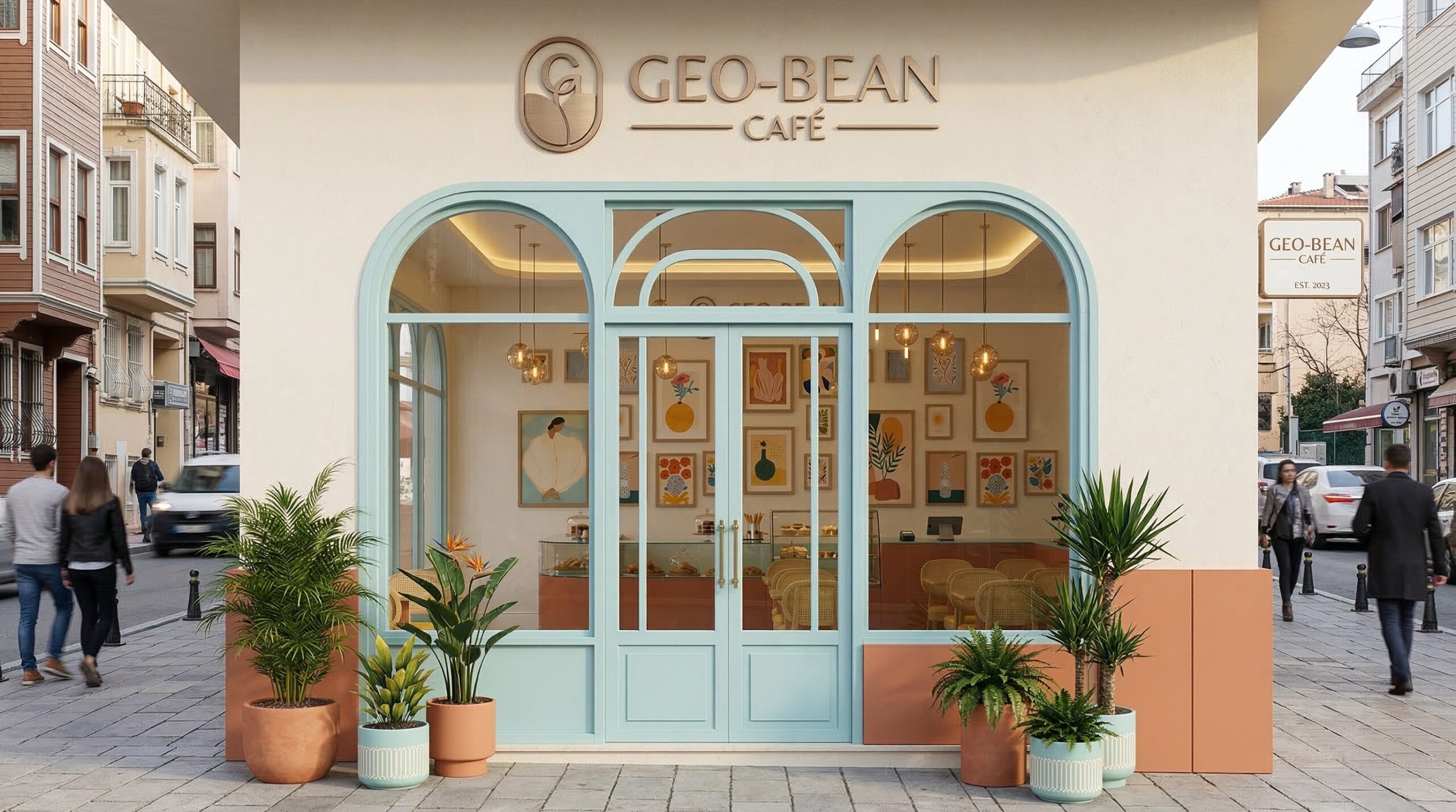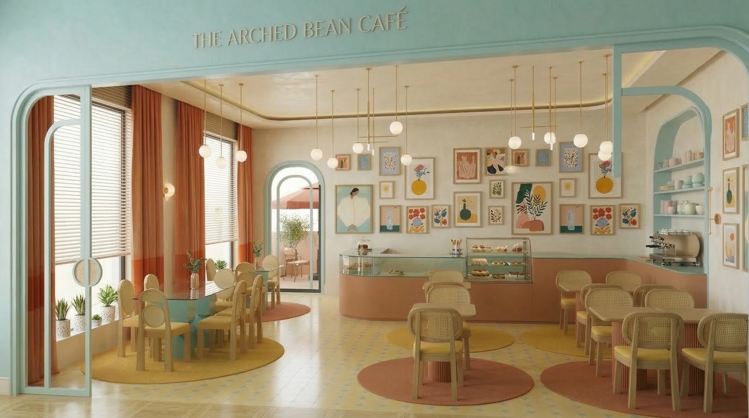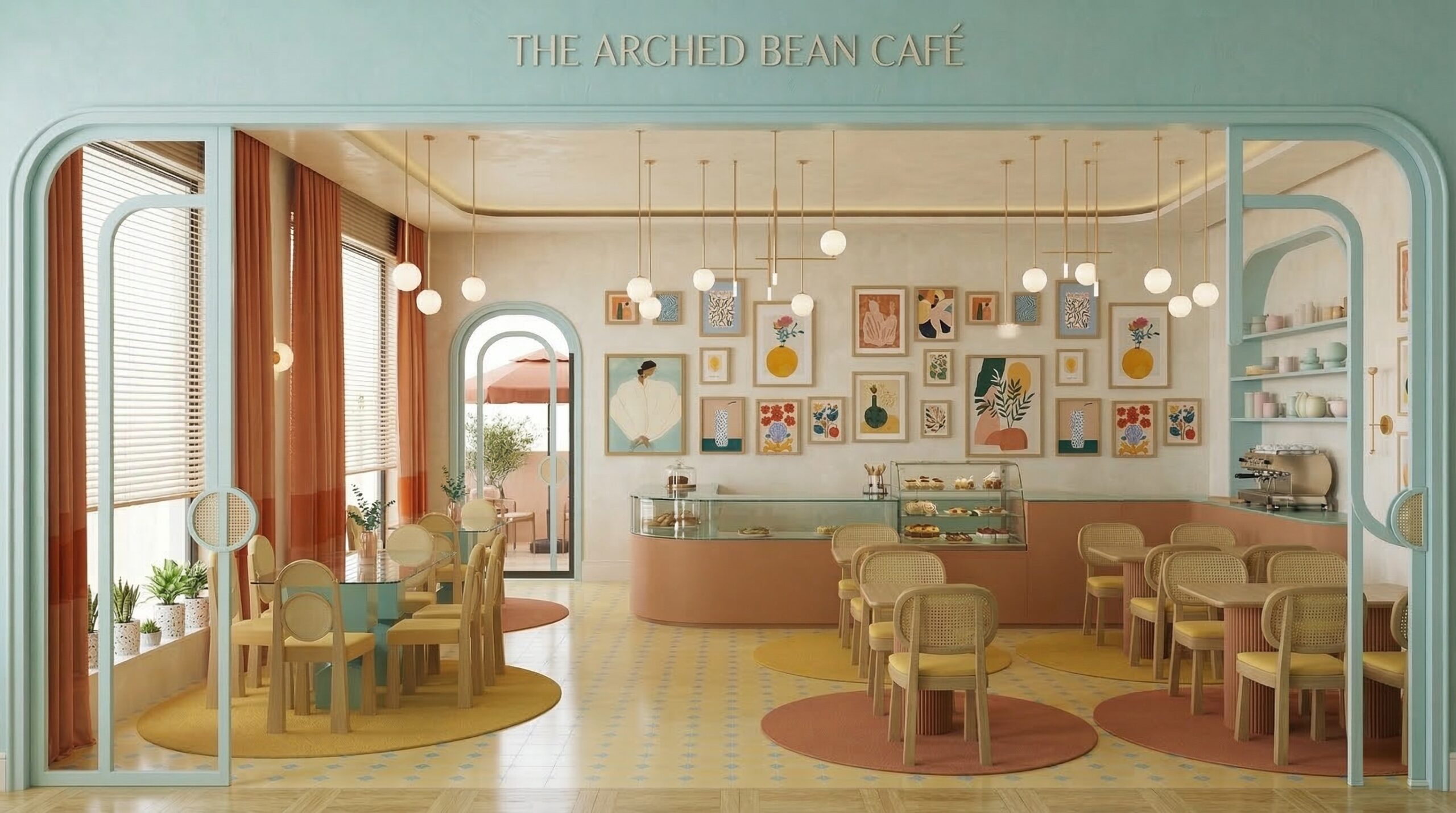 Pastel tonların (açık mint, şeftali ve krem) yumuşak geçişlerle kullanıldığı, kemerli açıklıklar ve yuvarlatılmış köşelerle tanımlanan çağdaş bir kafe tasarımı. Mekânda grafik sanat panoları ve minimal dekoratif objeler duvarları bir sergi yüzeyine dönüştürürken; açık renk ahşap mobilyalar ve sıcak aydınlatma elemanları samimi ve davetkâr bir atmosfer oluşturur. Cephede kullanılan kemerli vitrin ve iç mekânla kurulan görsel süreklilik, kullanıcıyı dışarıdan içeriye çeken güçlü bir mekânsal kurgu sağlar.
