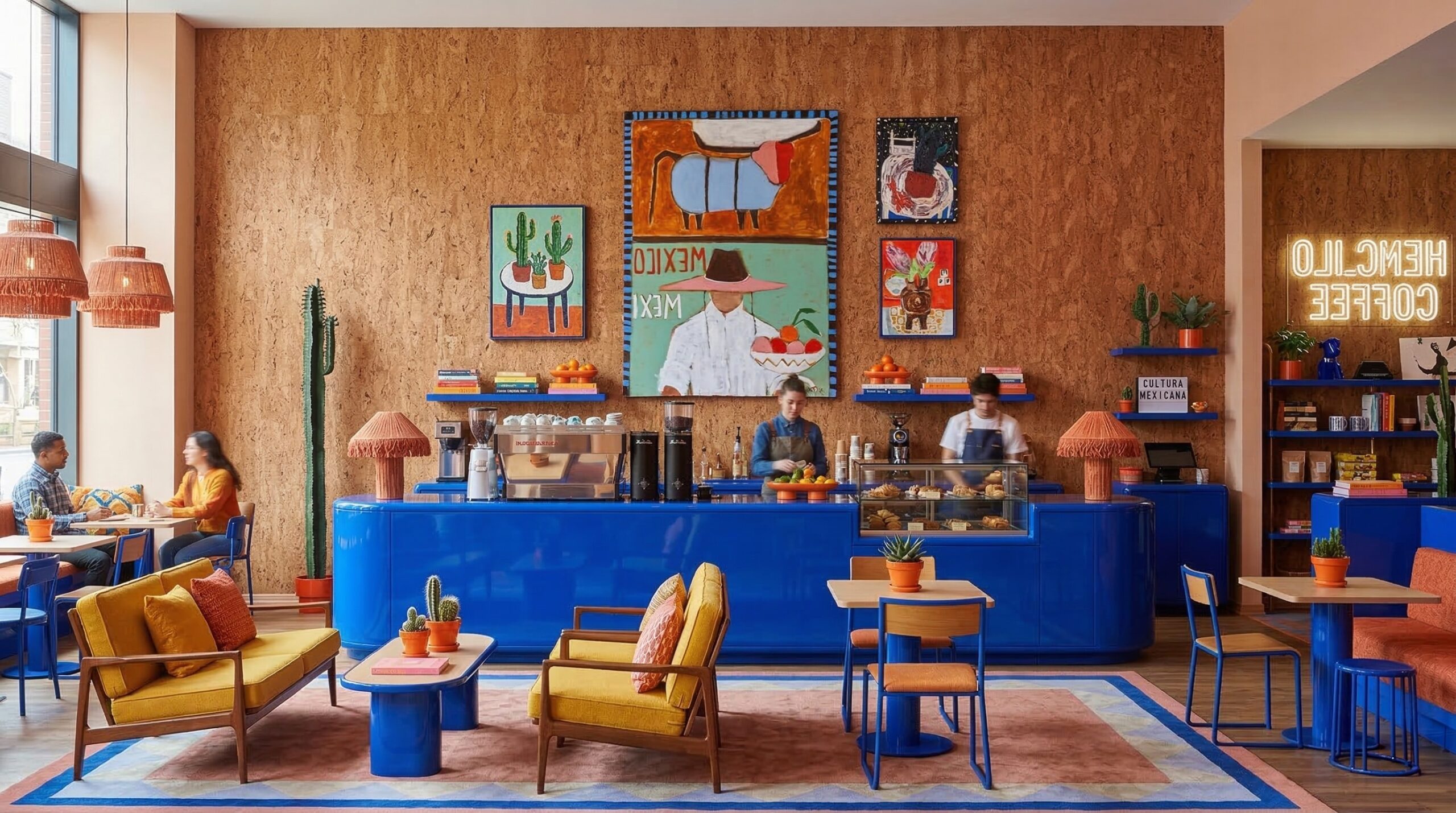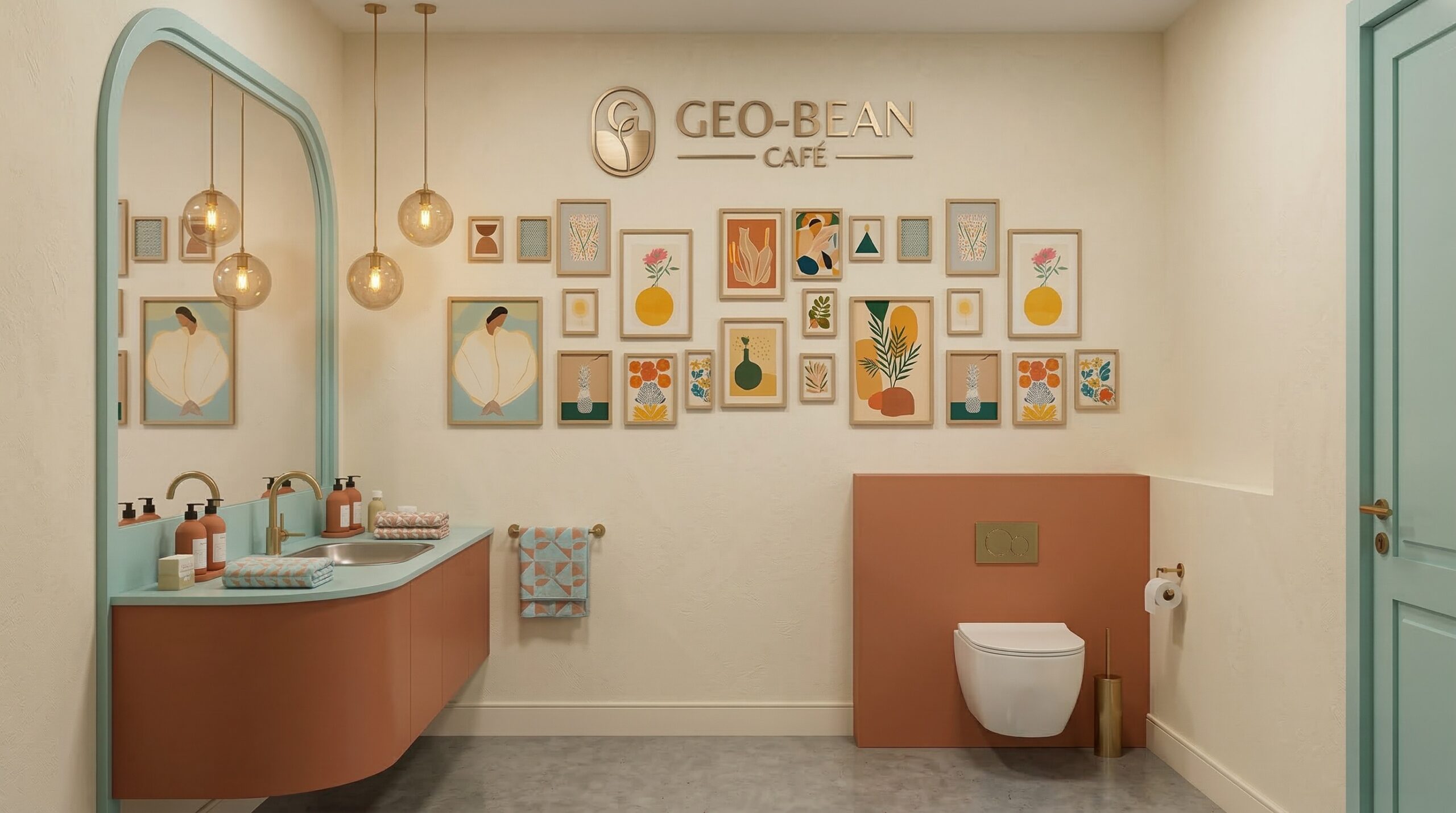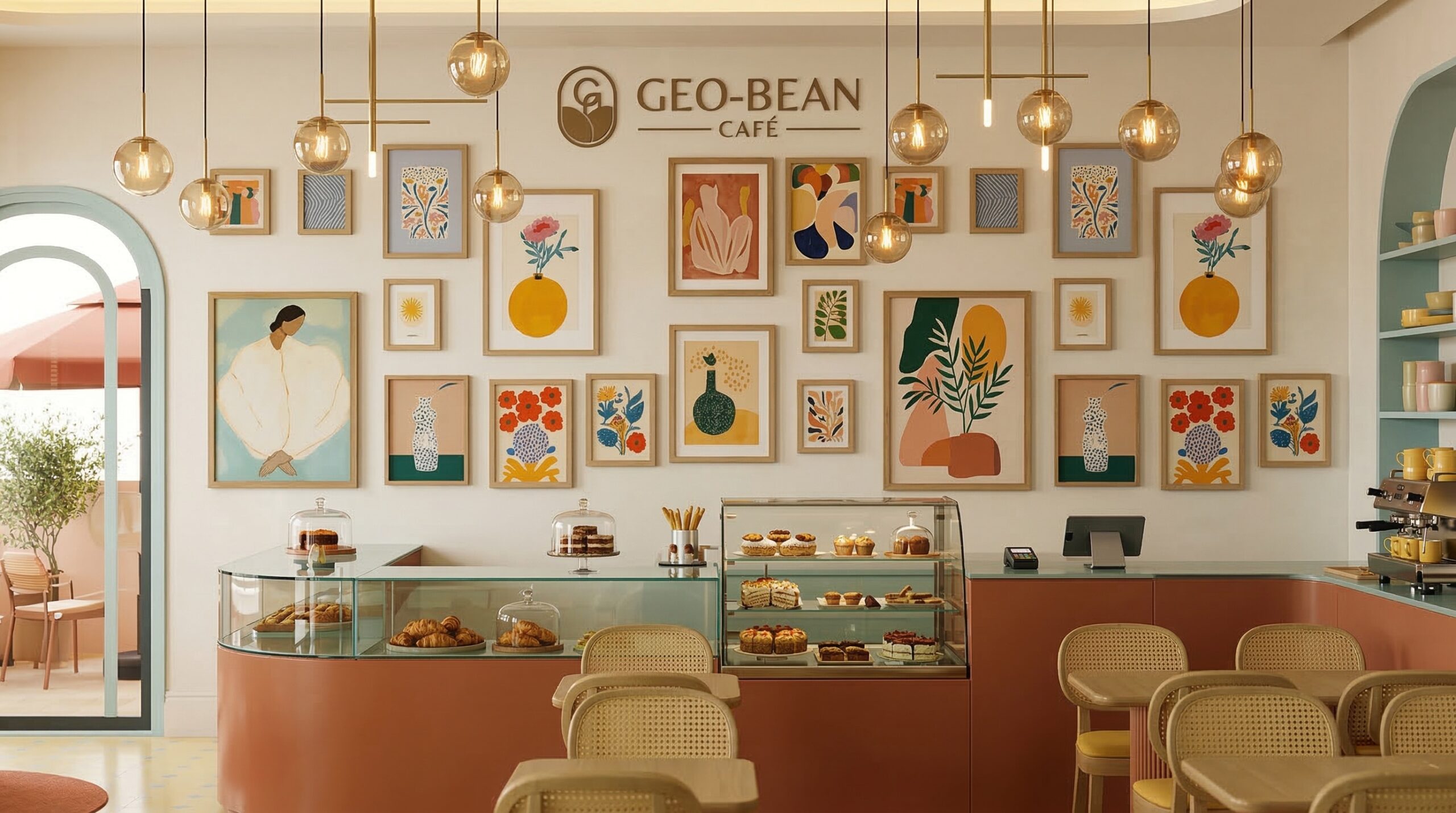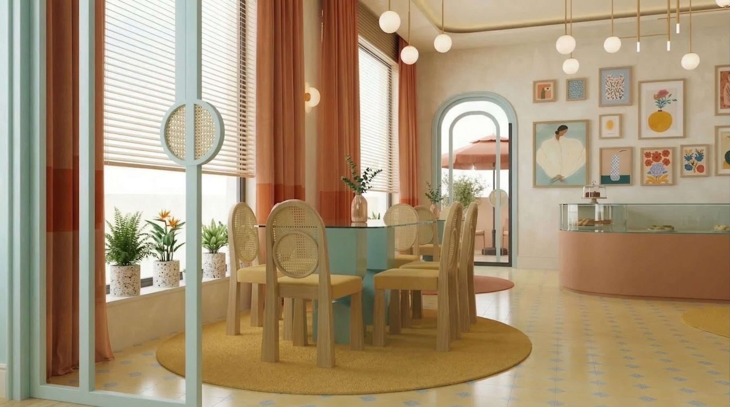 Pastel tonların (açık mint, şeftali ve krem) yumuşak geçişlerle kullanıldığı, kemerli açıklıklar ve yuvarlatılmış köşelerle tanımlanan çağdaş bir kafe tasarımı. Mekânda grafik sanat panoları ve minimal dekoratif objeler duvarları bir sergi yüzeyine dönüştürürken; açık renk ahşap mobilyalar ve sıcak aydınlatma elemanları samimi ve davetkâr bir atmosfer oluşturur. Cephede kullanılan kemerli vitrin ve iç mekânla kurulan görsel süreklilik, kullanıcıyı dışarıdan içeriye çeken güçlü bir mekânsal kurgu sağlar.