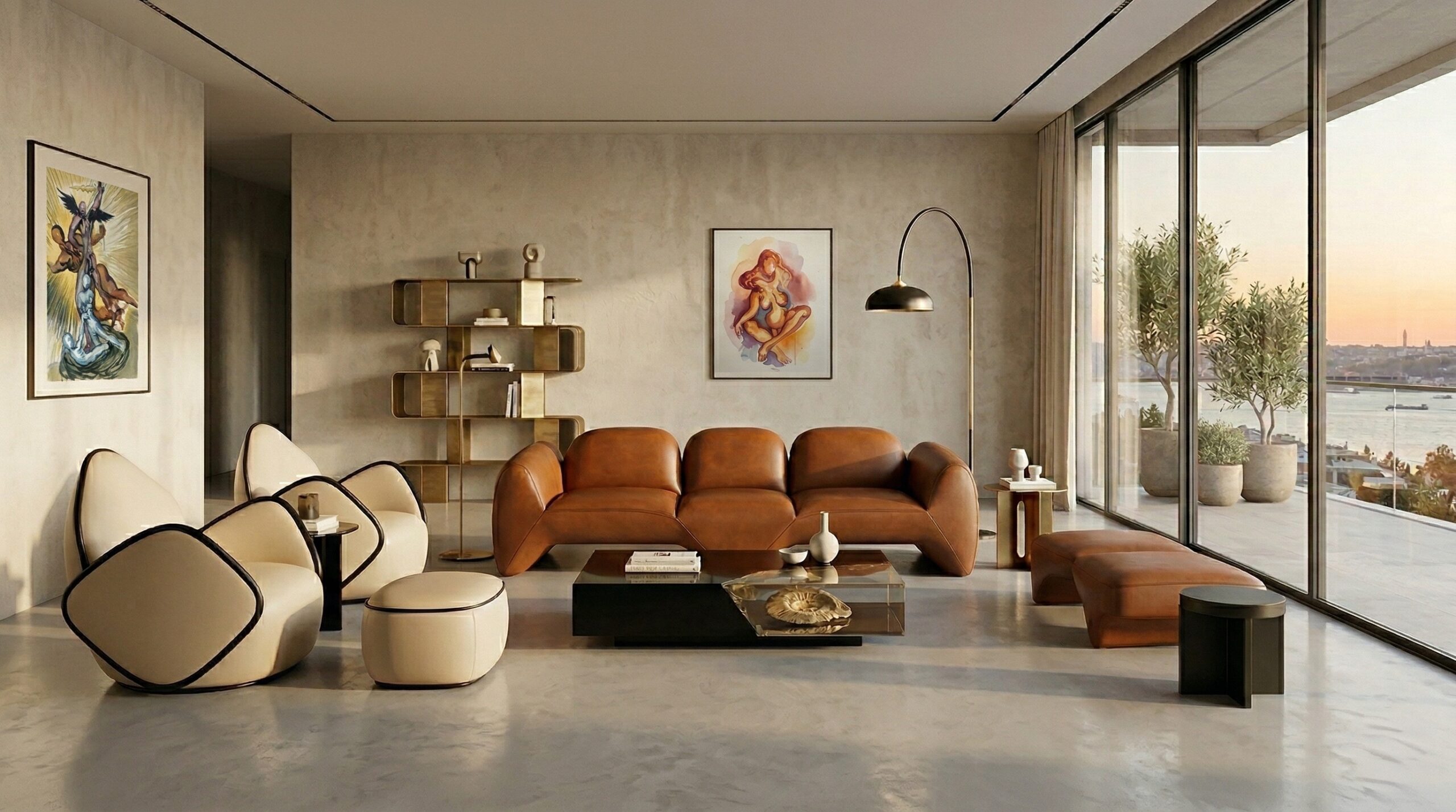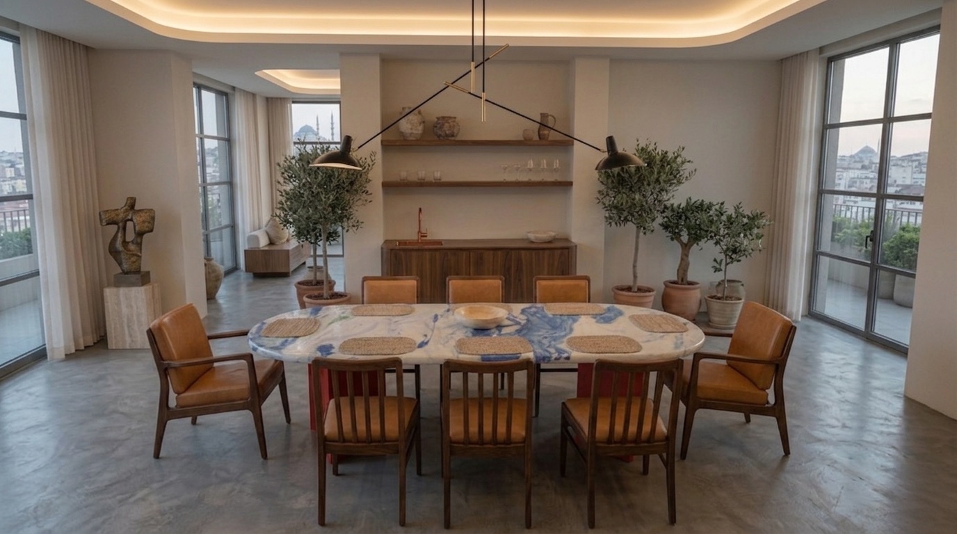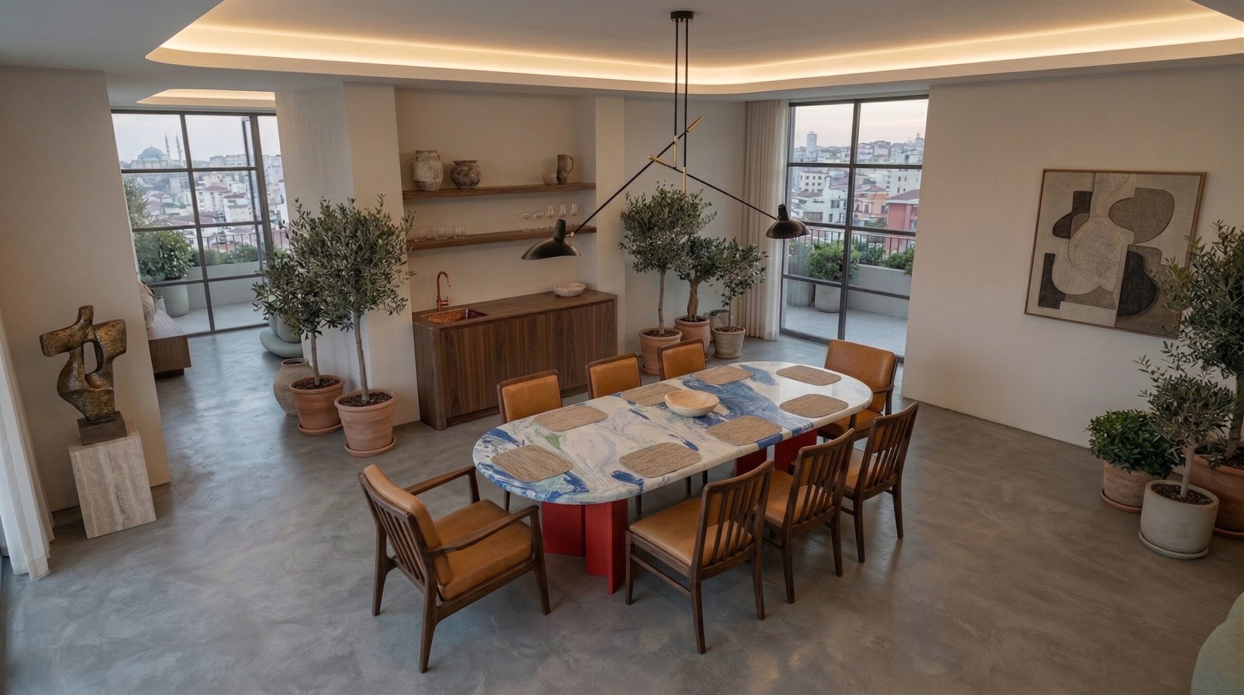 Doğal taş zeminler, açık tonlu duvar yüzeyleri ve ahşap kaplamalar sıcak bir zemin oluştururken; kavisli ve modüler koltuklar, düşük oturumlu lounge elemanları ve özel tasarım yemek masası mekânda heykelsi bir yerleşim dili kurar. Mutfak adası ve bütünleşik depolama çözümleri işlevselliği artırırken, seçili sanat objeleri ve raf sistemleri mekânın karakterini güçlendirir.