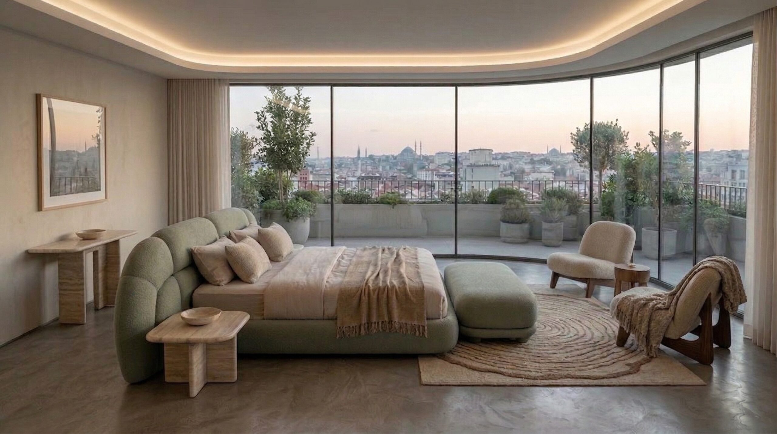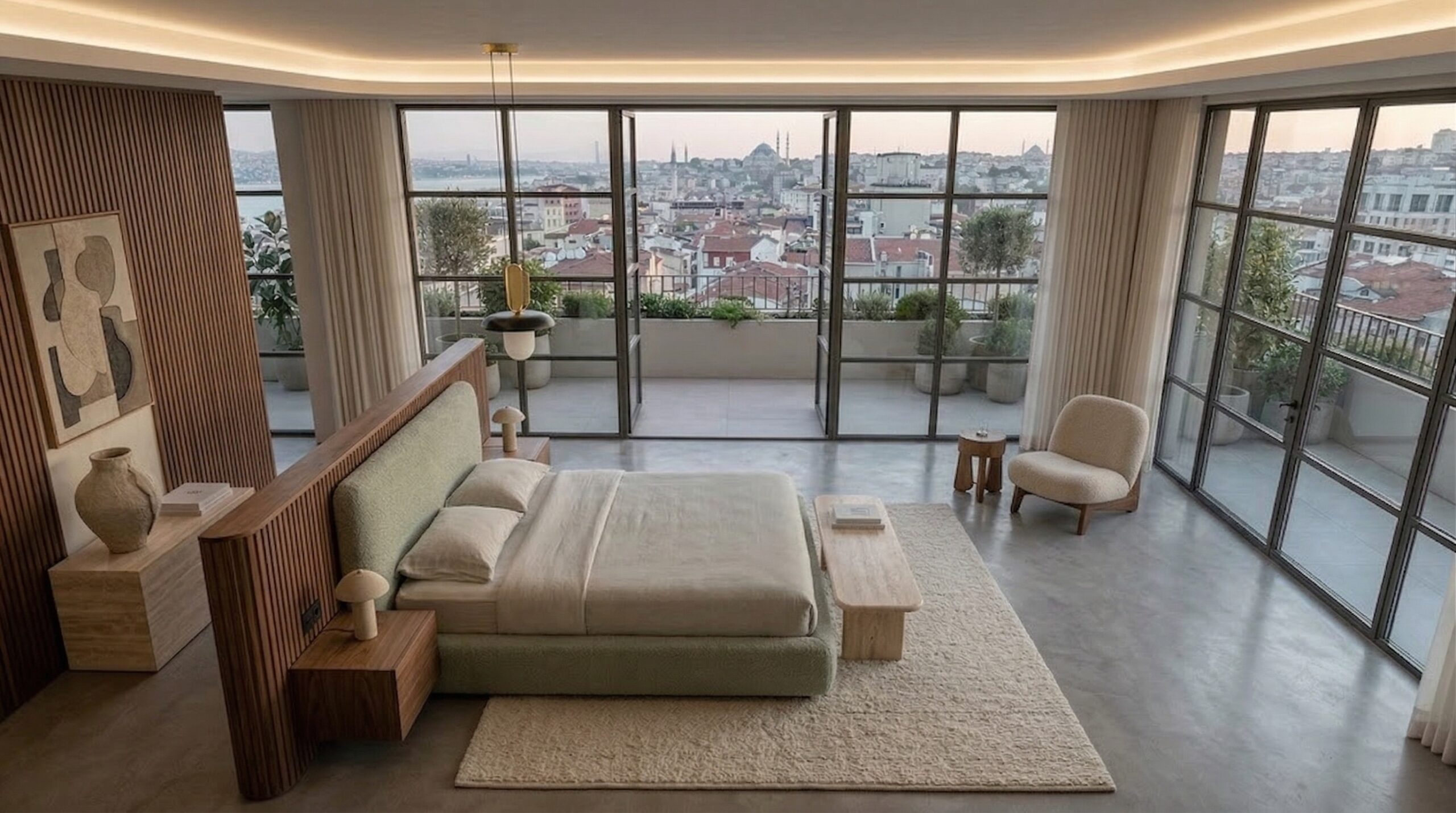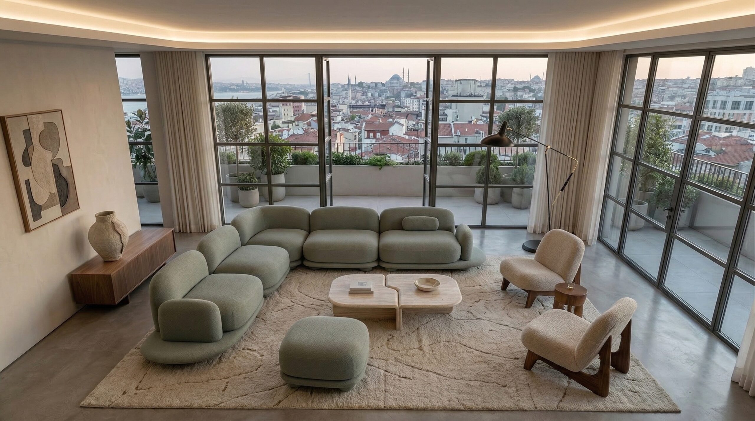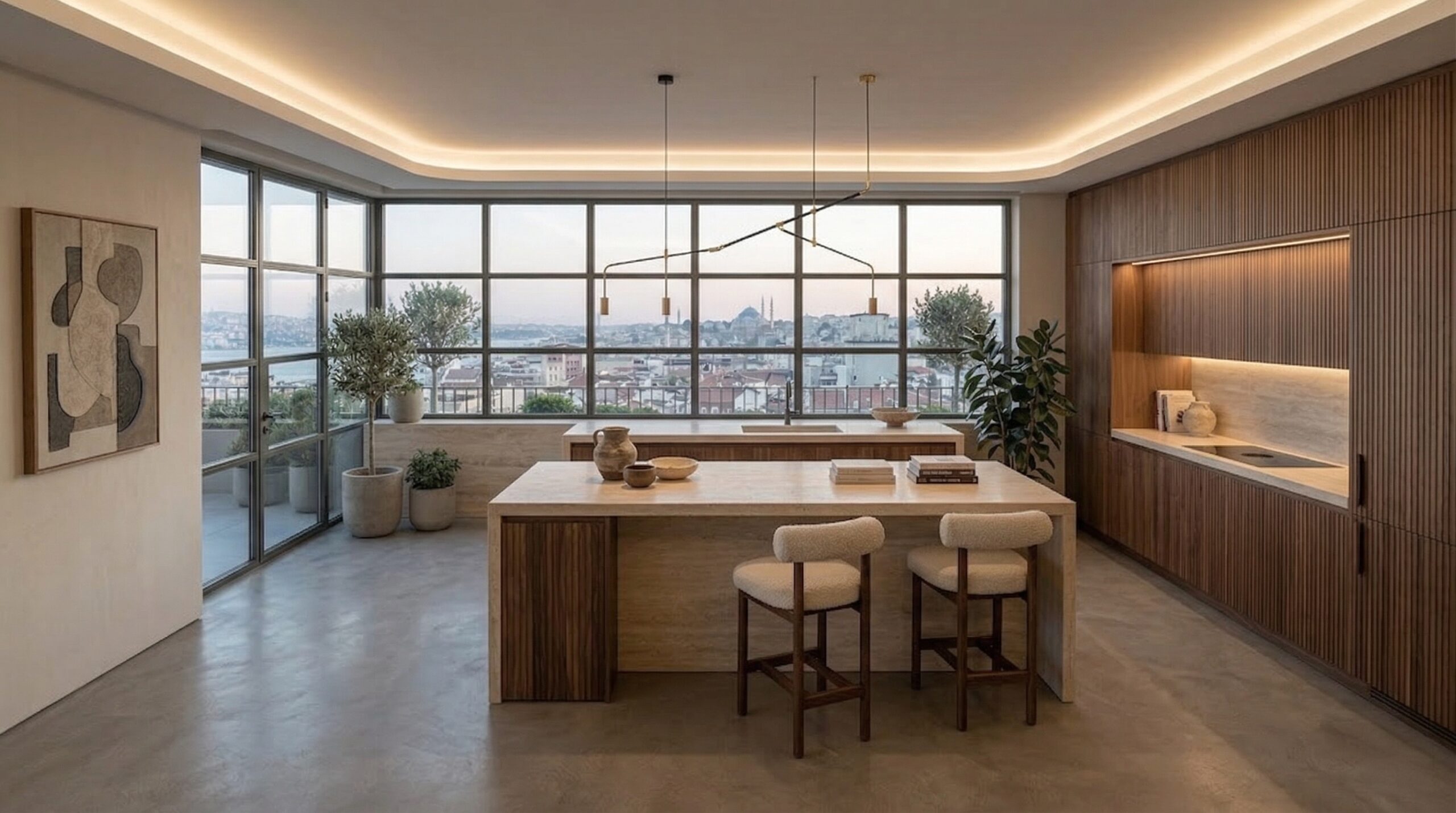 Haliç ve Tarihi Yarımada silüetini geniş cam yüzeyler aracılığıyla iç mekâna dahil eden bu konut tasarımı, gün batımı ışığını mekânın ana atmosfer unsuru haline getirir. Açık plan kurgusu, manzaraya yönlenen süreklilik içinde çözülürken, yumuşak hatlı tavan aydınlatmaları ve sade yüzeyler mekâna akıcı bir modernlik kazandırır.