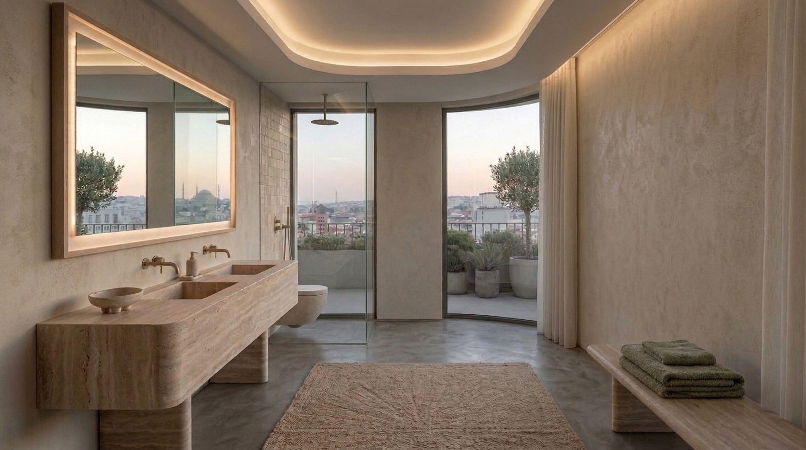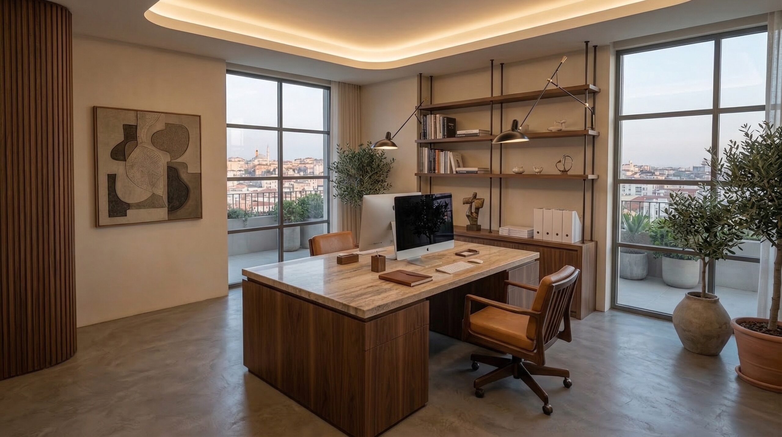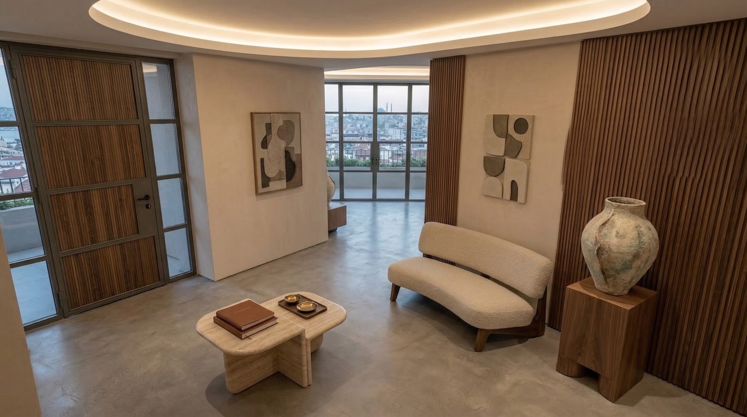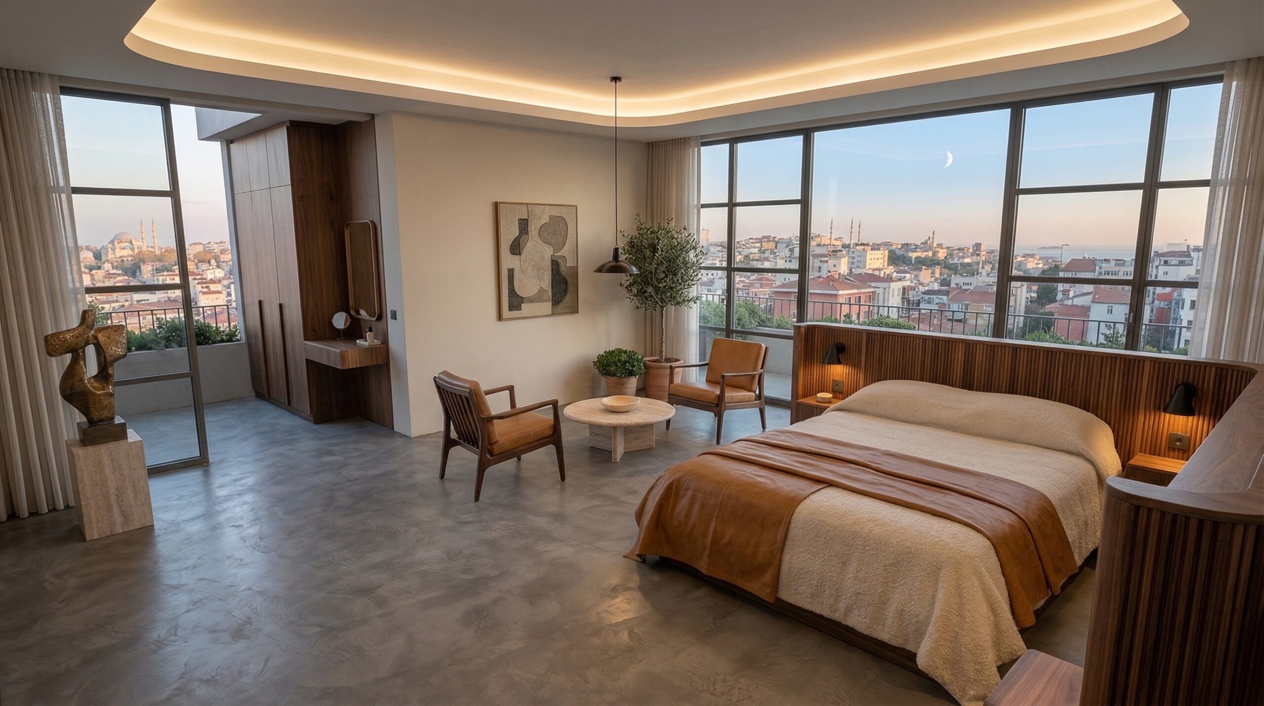 Haliç ve Tarihi Yarımada silüetini geniş cam yüzeyler aracılığıyla iç mekâna dahil eden bu konut tasarımı, gün batımı ışığını mekânın ana atmosfer unsuru haline getirir. Açık plan kurgusu, manzaraya yönlenen süreklilik içinde çözülürken, yumuşak hatlı tavan aydınlatmaları ve sade yüzeyler mekâna akıcı bir modernlik kazandırır.