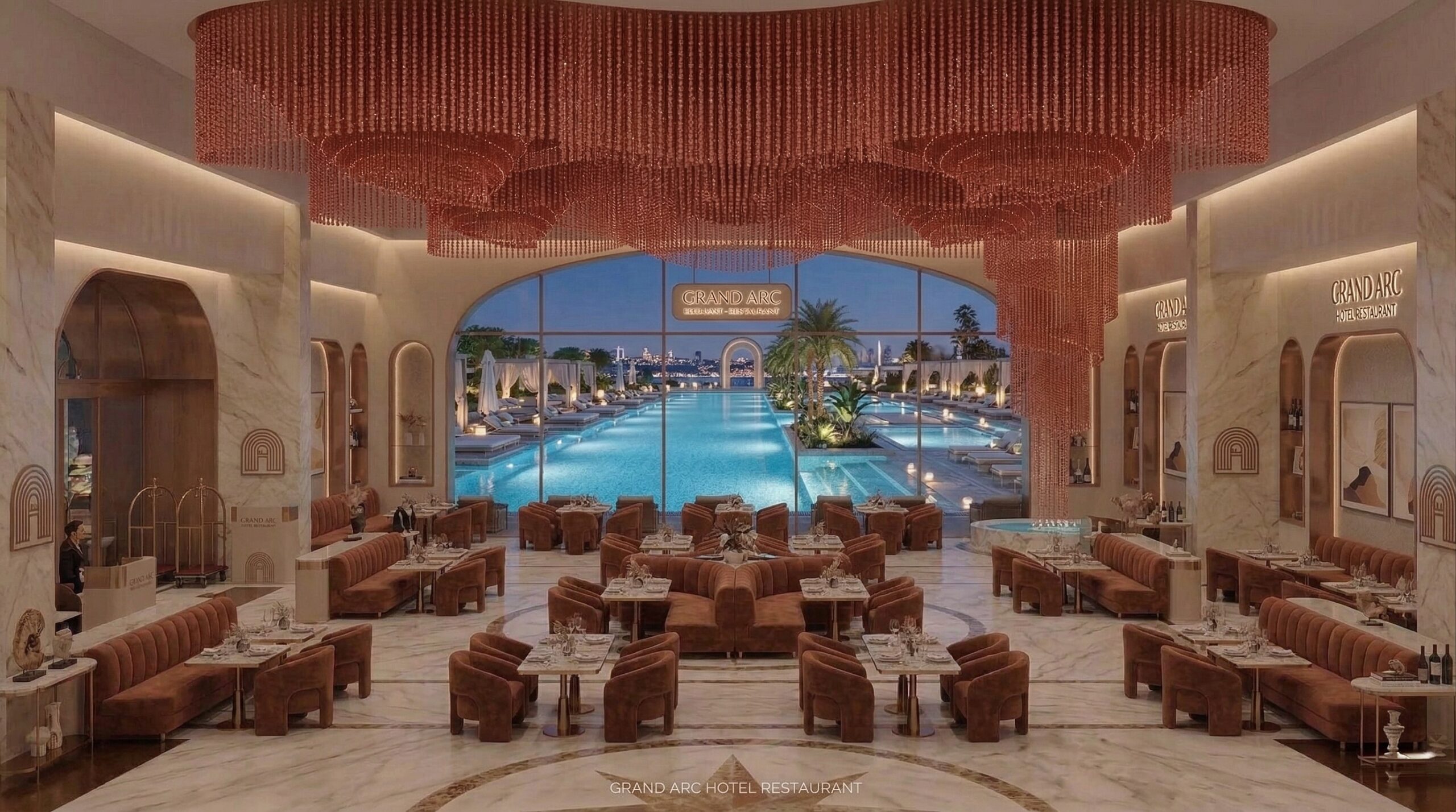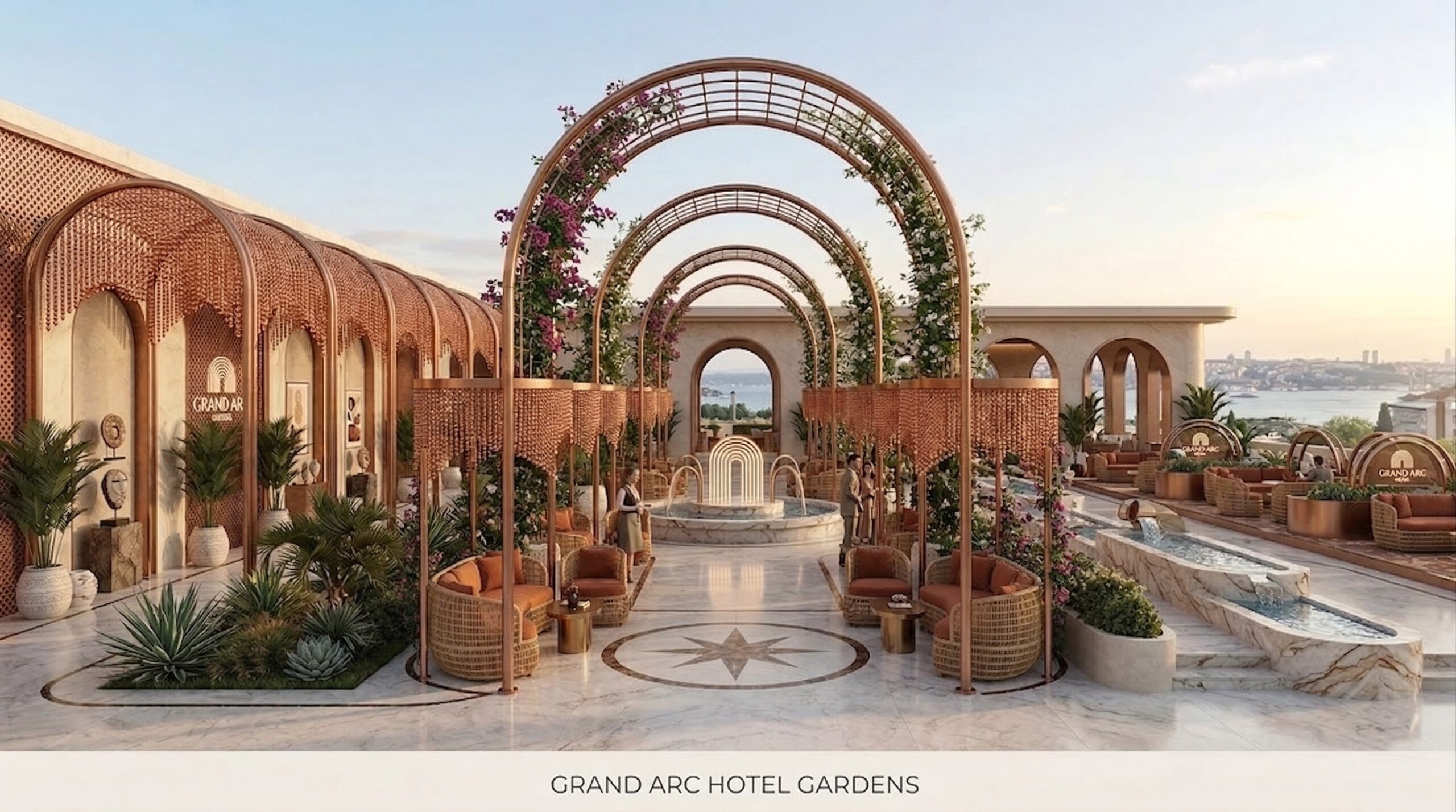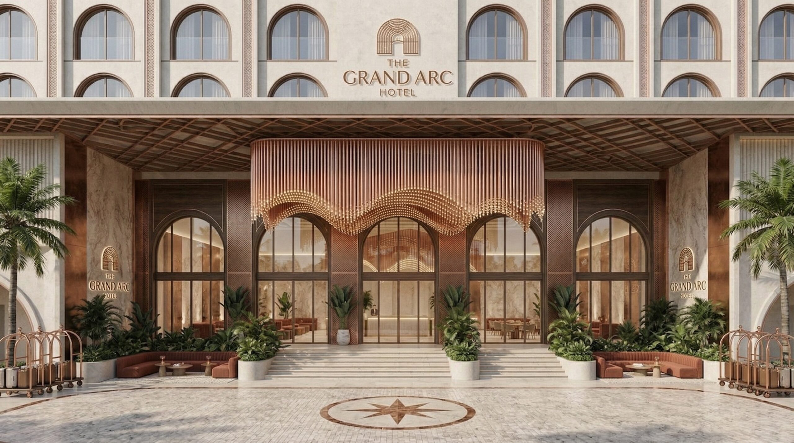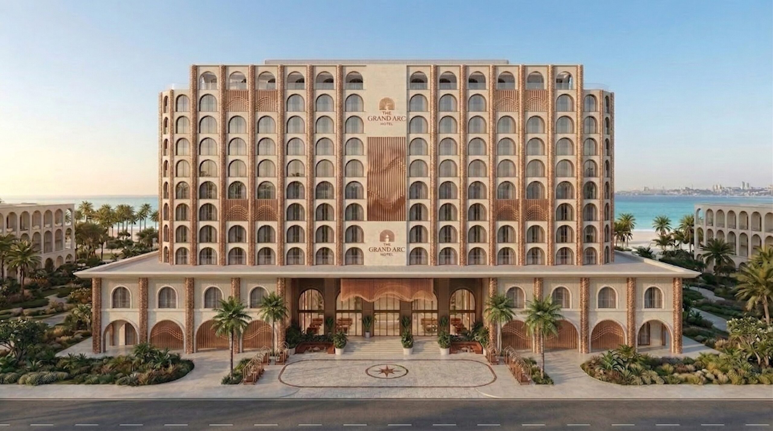 Kemerli açıklıkların ritmik tekrarları ve doğal taş yüzeylerin sıcak tonları üzerinden kurgulanan bu otel tasarımı, klasik Akdeniz mimarisini çağdaş bir lüks anlayışıyla yeniden yorumlar. Simetrik cephe düzeni ve modüler balkon sistemi, yapıya güçlü ve dengeli bir siluet kazandırırken; iç mekânda devam eden kemer dili mekânsal sürekliliği pekiştirir.
