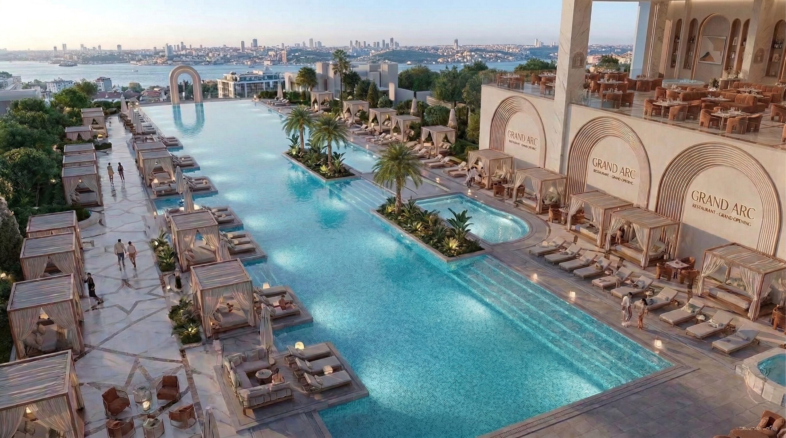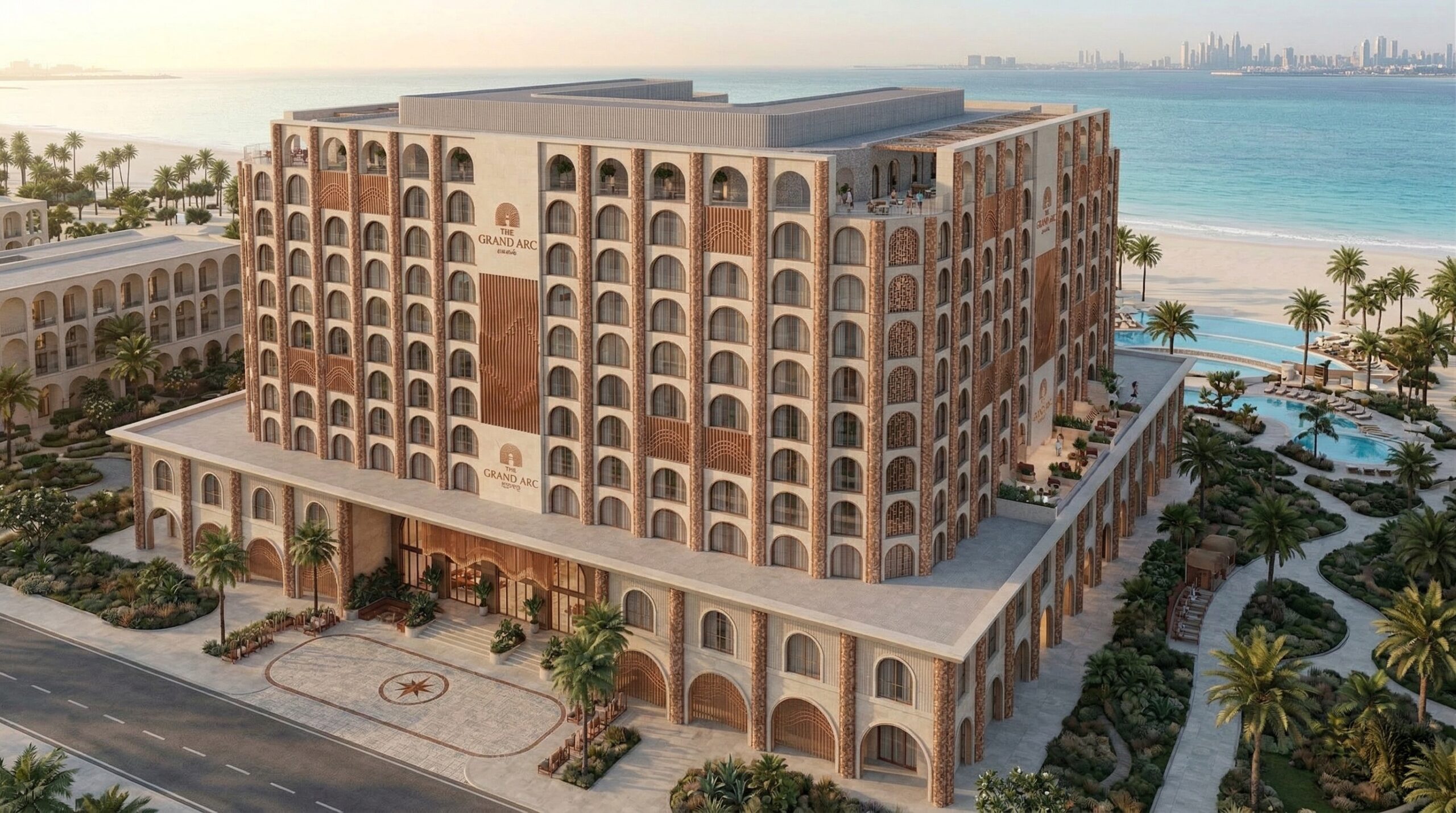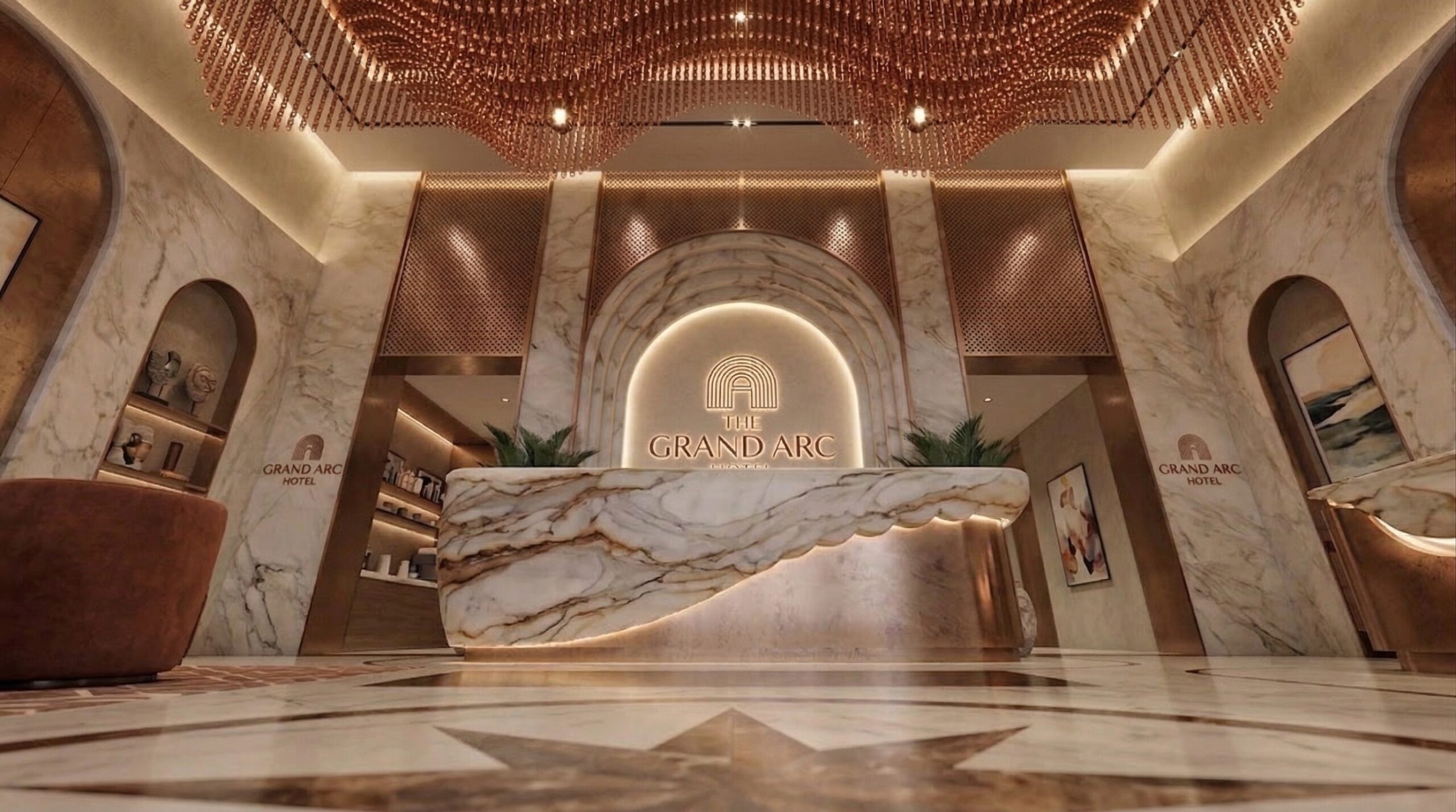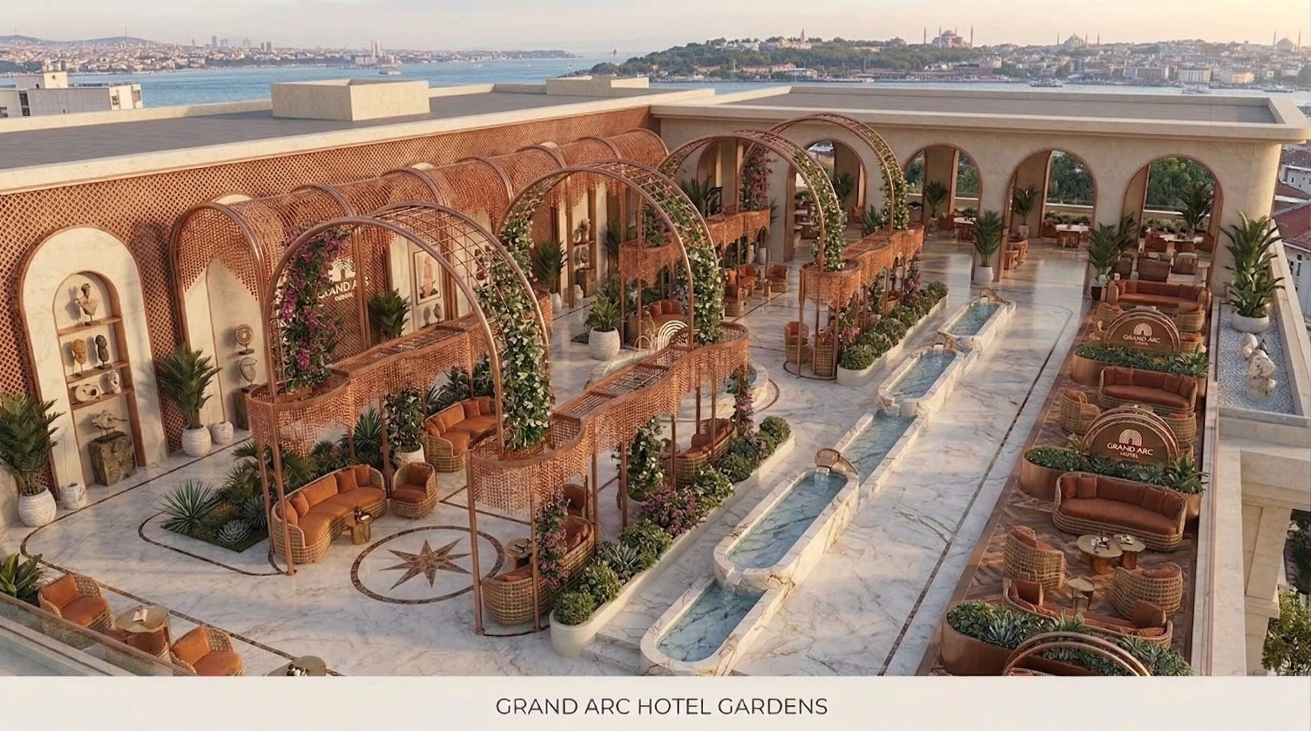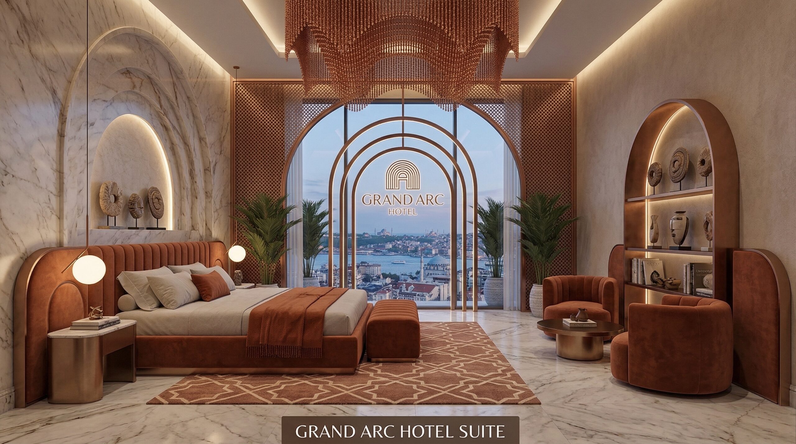Kemerli açıklıkların ritmik tekrarları ve doğal taş yüzeylerin sıcak tonları üzerinden kurgulanan bu otel tasarımı, klasik Akdeniz mimarisini çağdaş bir lüks anlayışıyla yeniden yorumlar. Simetrik cephe düzeni ve modüler balkon sistemi, yapıya güçlü ve dengeli bir siluet kazandırırken; iç mekânda devam eden kemer dili mekânsal sürekliliği pekiştirir.