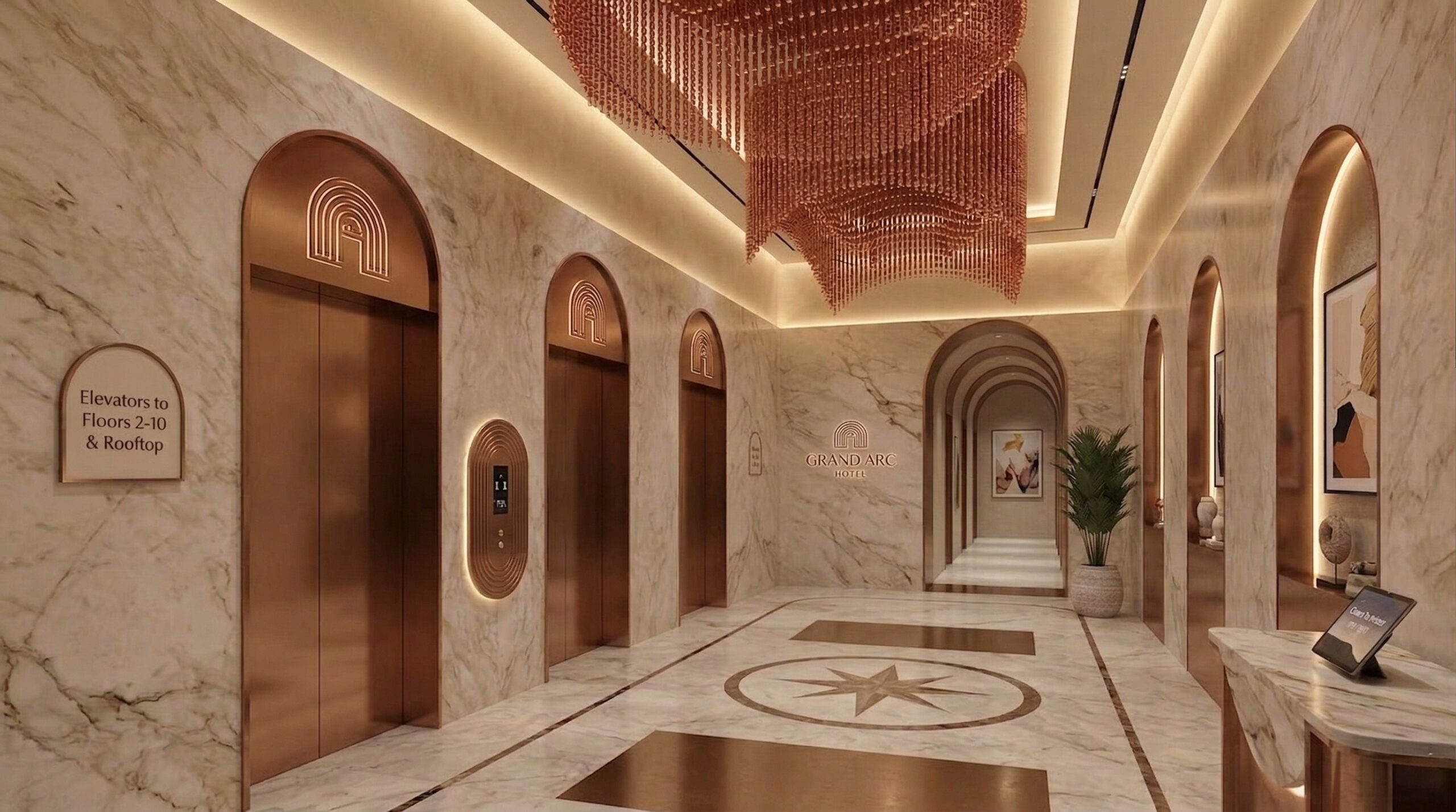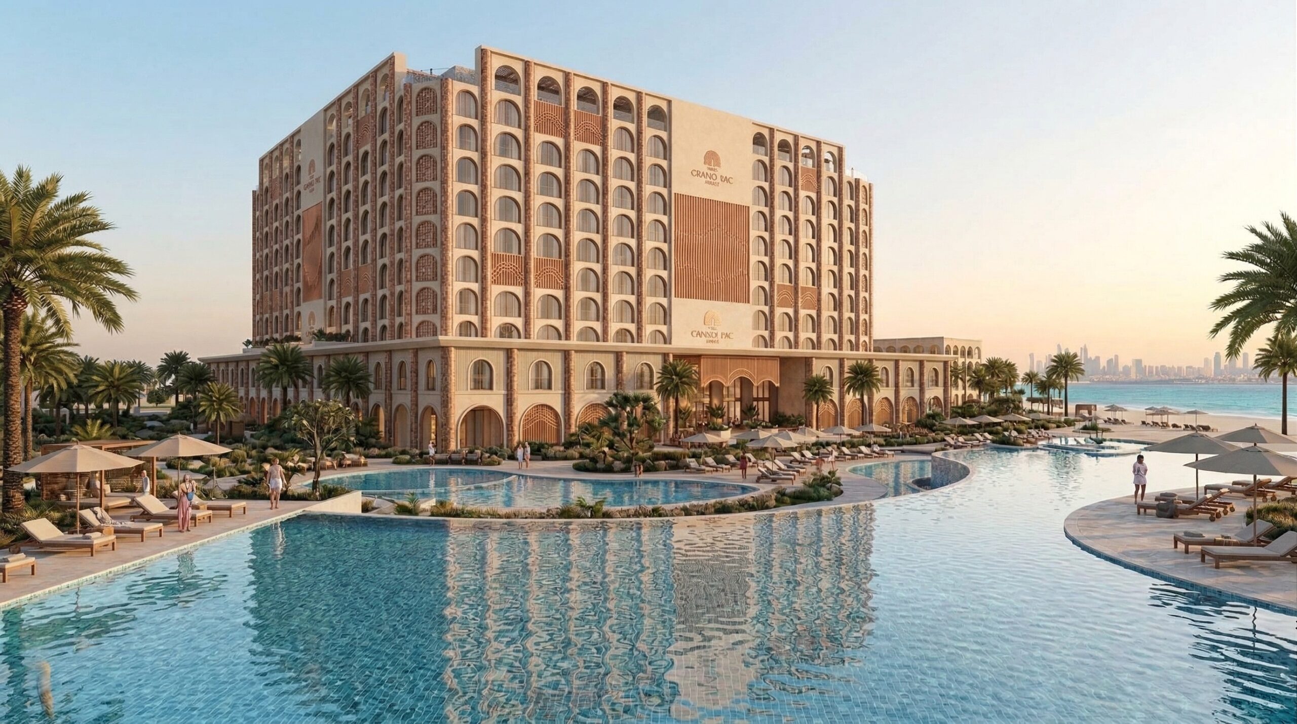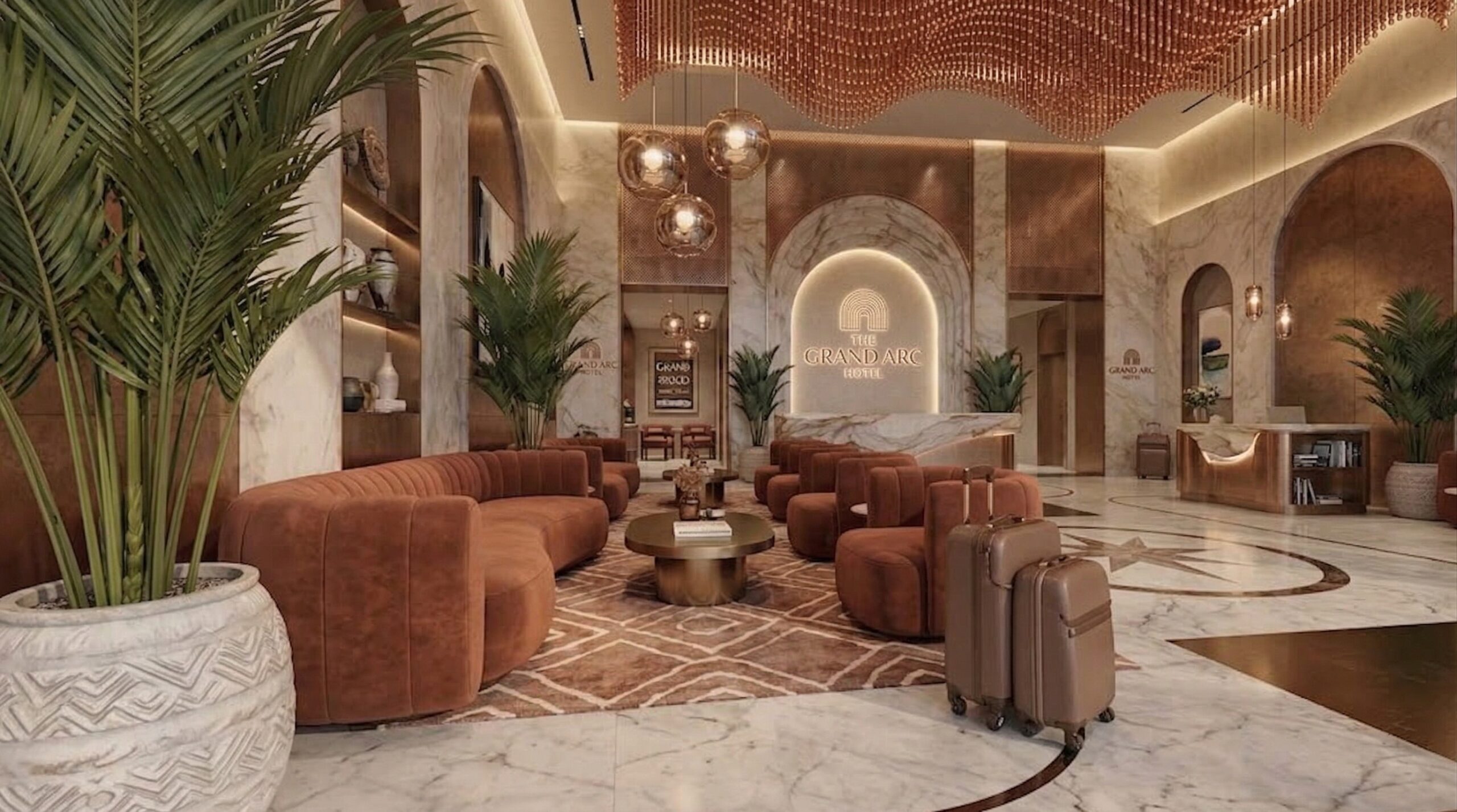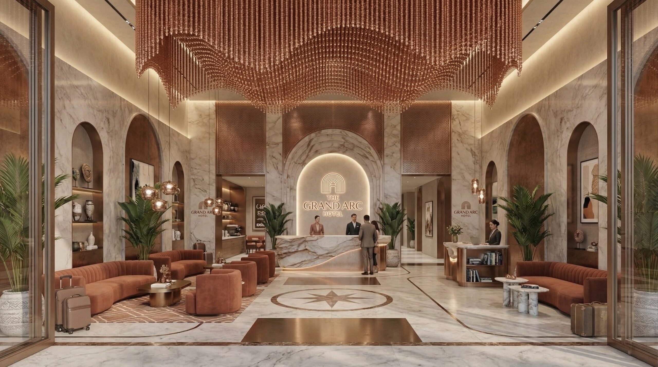 Kemerli açıklıkların ritmik tekrarları ve doğal taş yüzeylerin sıcak tonları üzerinden kurgulanan bu otel tasarımı, klasik Akdeniz mimarisini çağdaş bir lüks anlayışıyla yeniden yorumlar. Simetrik cephe düzeni ve modüler balkon sistemi, yapıya güçlü ve dengeli bir siluet kazandırırken; iç mekânda devam eden kemer dili mekânsal sürekliliği pekiştirir.