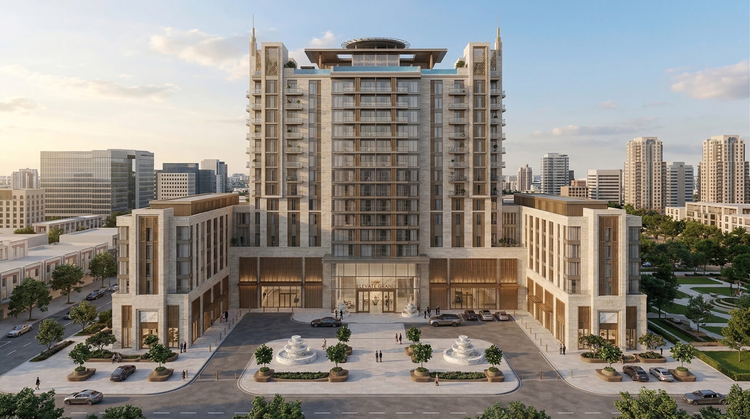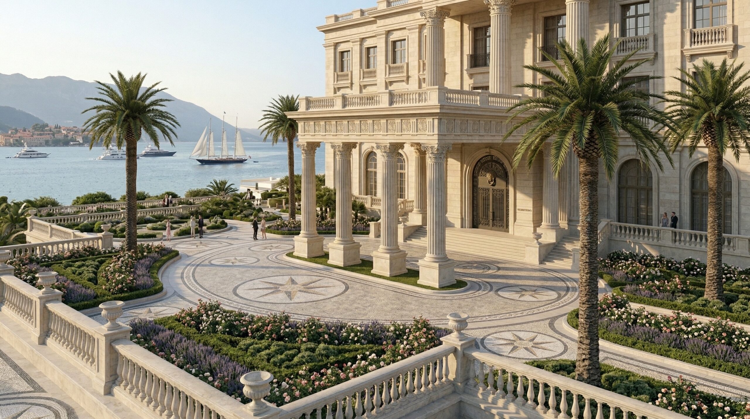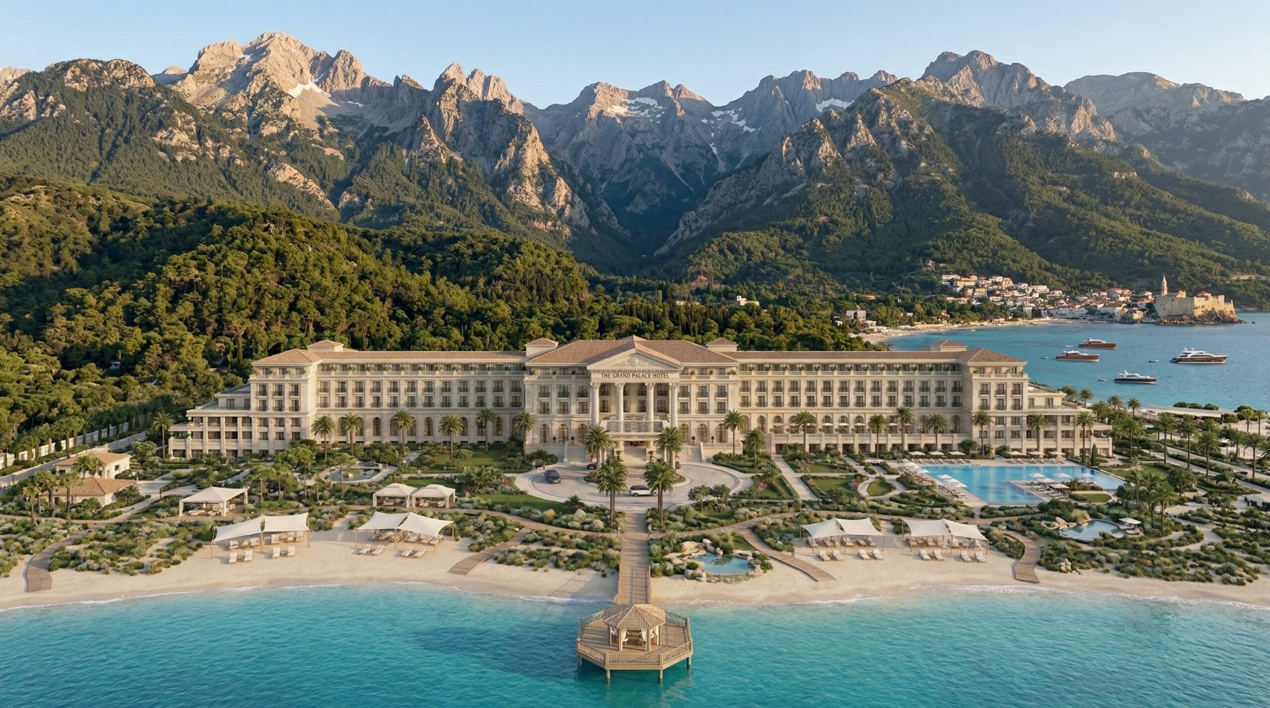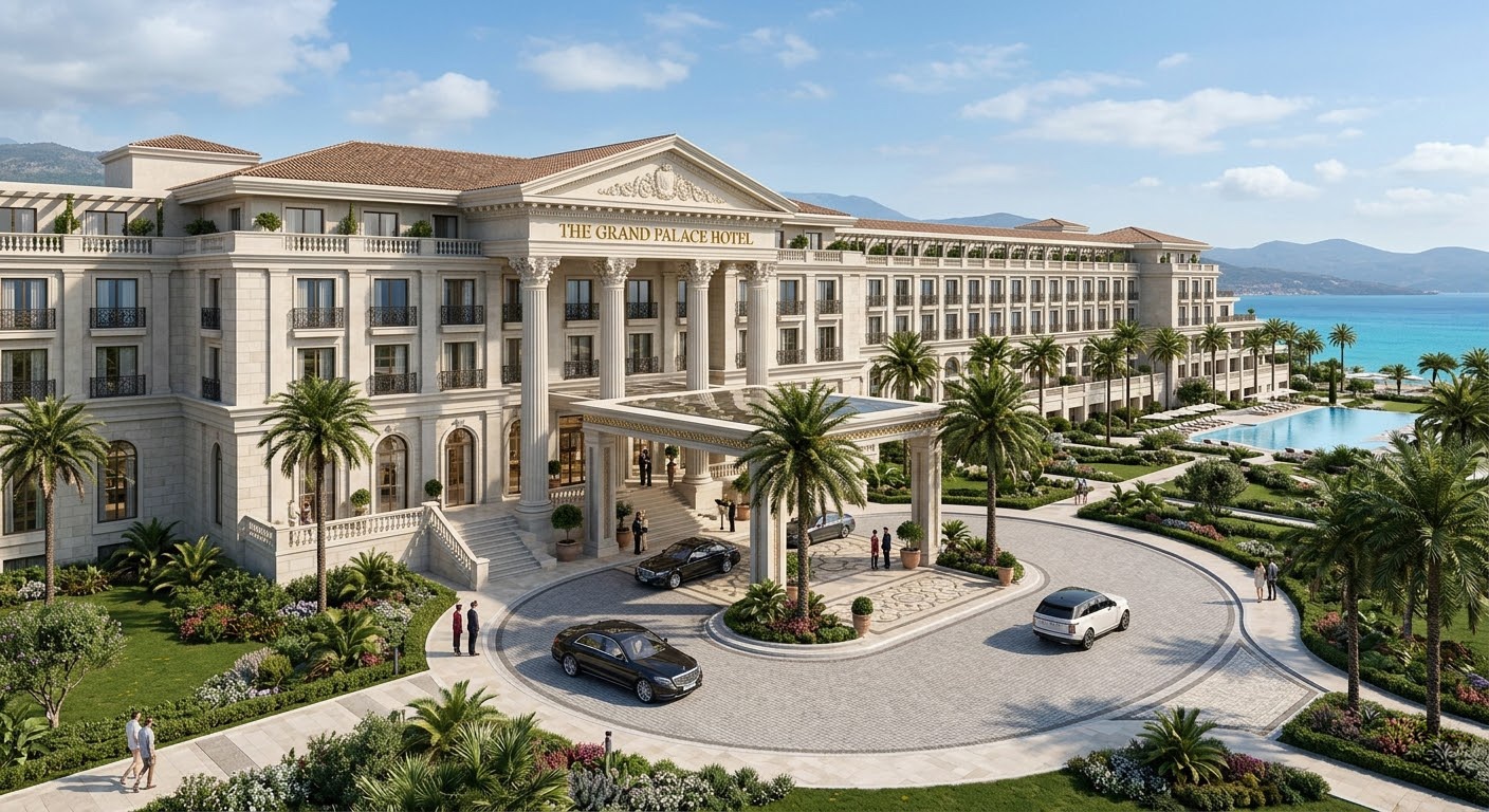 Akdeniz kıyı mimarisini anıtsal saray dili ile yeniden yorumlayan bu resort otel tasarımı, simetrik plan kurgusu ve güçlü aksiyel organizasyonu ile öne çıkar. Geniş avlular, kemerli geçişler ve sütunlu galeriler, mekânlar arası süreklilik sağlayarak klasik mimariyi çağdaş konfor ile buluşturur.