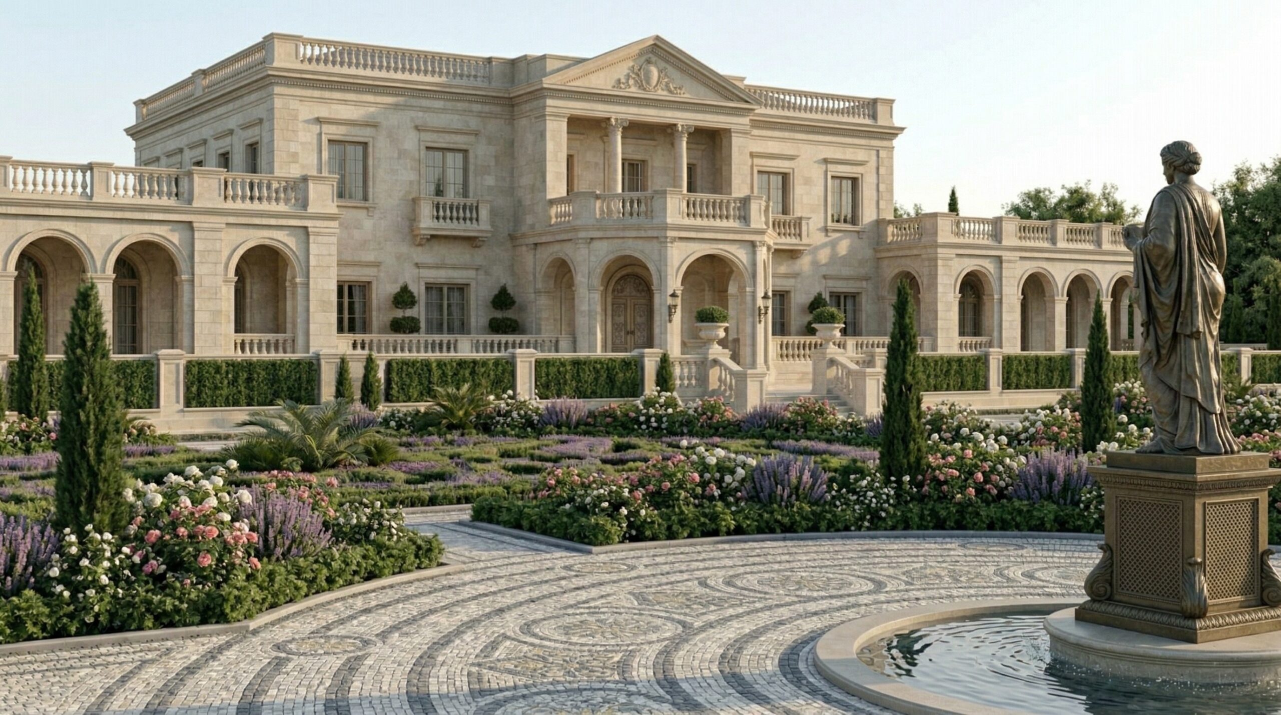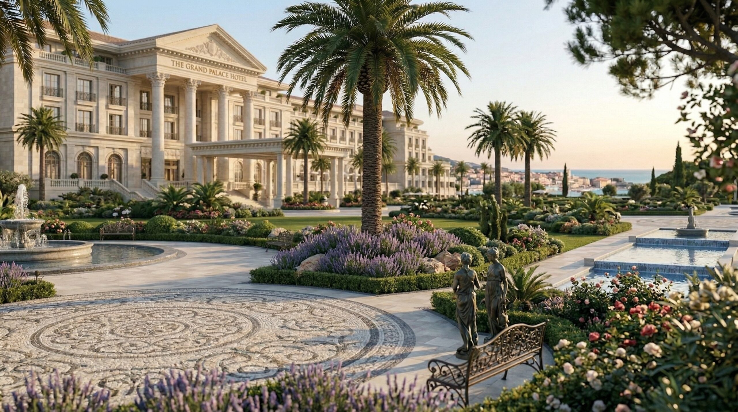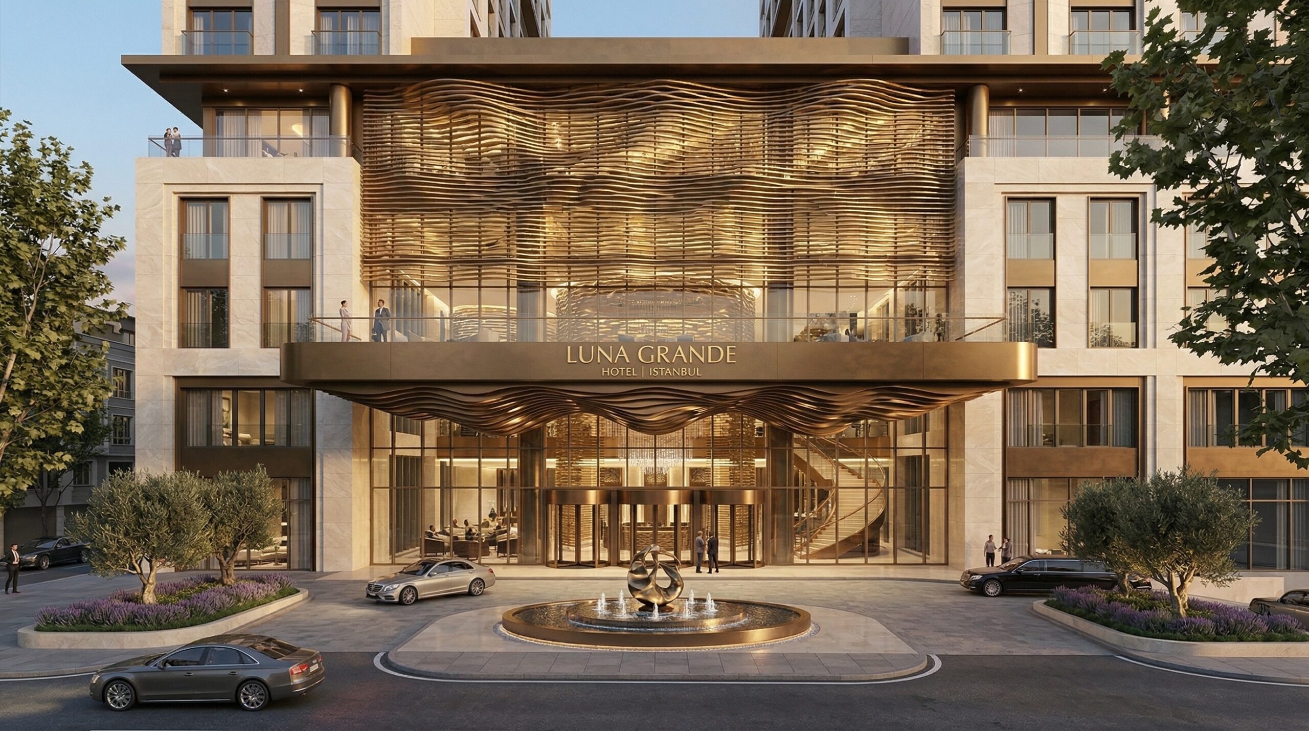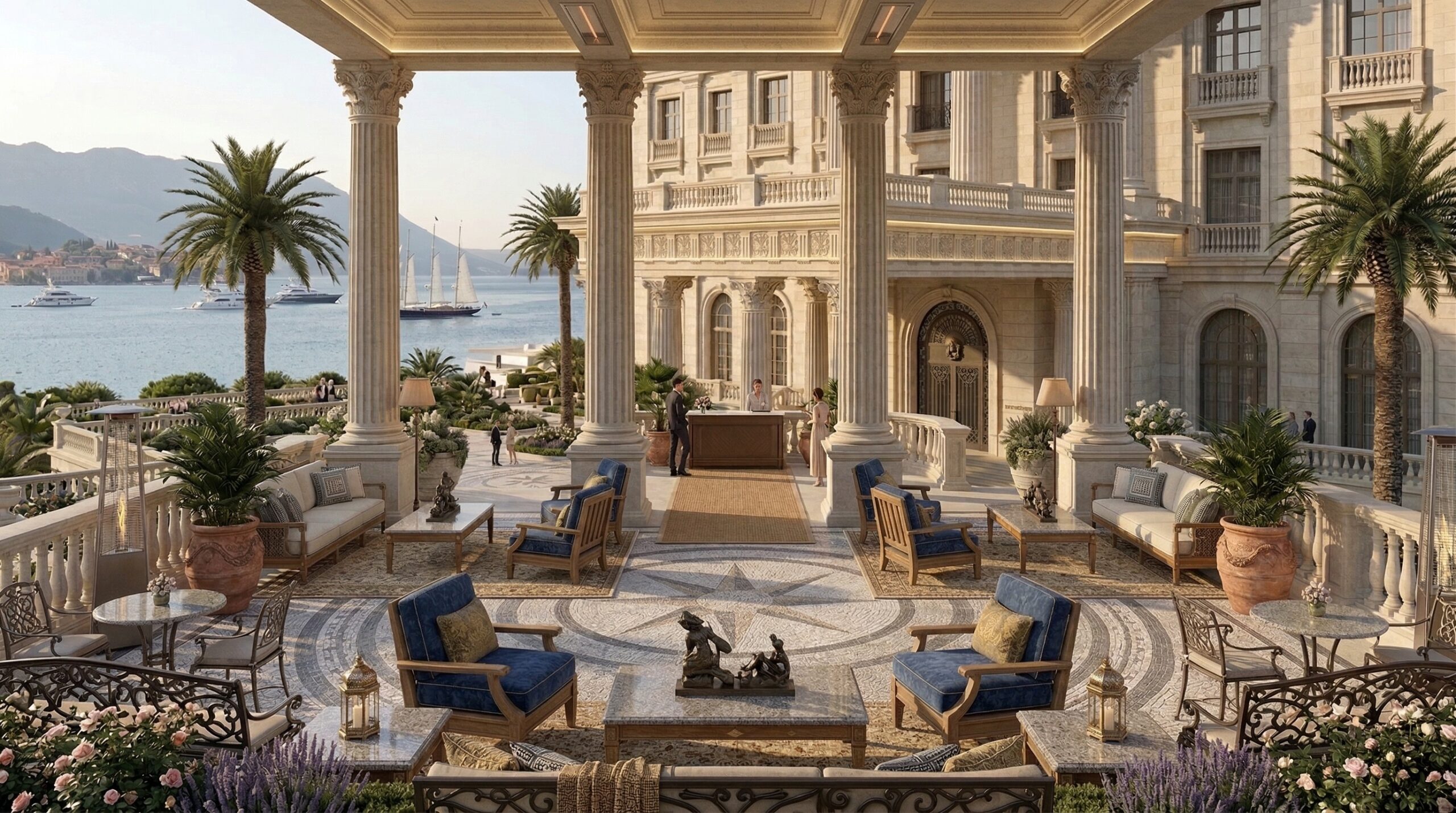 Akdeniz kıyı mimarisini anıtsal saray dili ile yeniden yorumlayan bu resort otel tasarımı, simetrik plan kurgusu ve güçlü aksiyel organizasyonu ile öne çıkar. Geniş avlular, kemerli geçişler ve sütunlu galeriler, mekânlar arası süreklilik sağlayarak klasik mimariyi çağdaş konfor ile buluşturur.