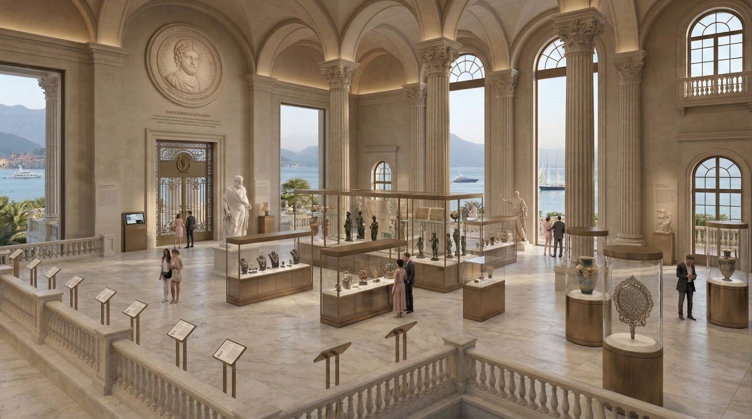İç mekânlarda mermer zeminler, yüksek tavanlı hacimler ve detaylı tavan işlemeleri, mekâna görkemli bir atmosfer kazandırırken; doğal ışığın kontrollü kullanımı ile dengeli ve ferah bir iç ortam oluşturulur. Lobi, galeri boşlukları ve sergi alanları, kullanıcıyı yönlendiren akslar etrafında kurgulanmıştır.