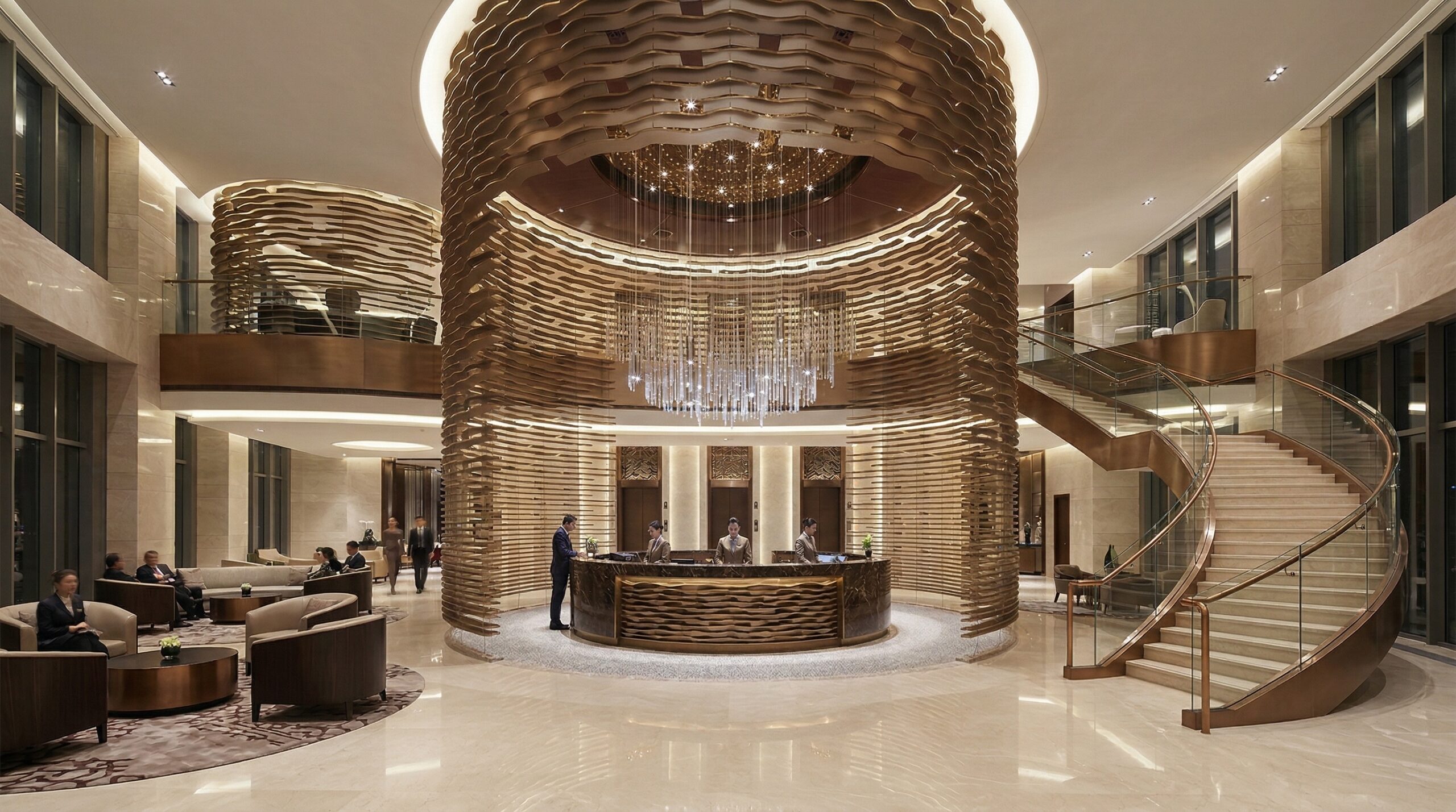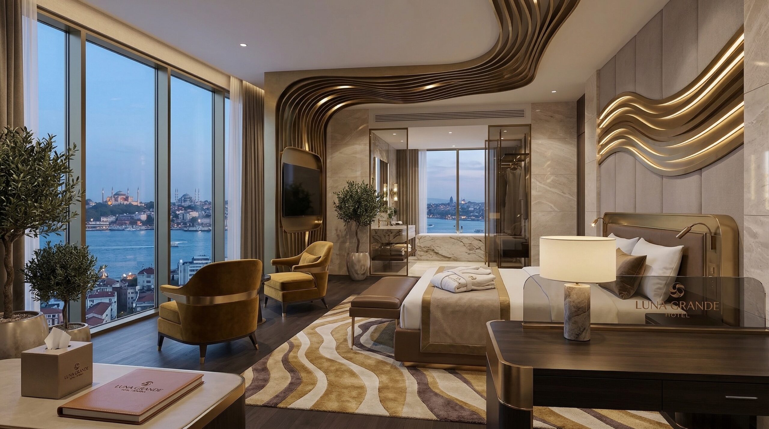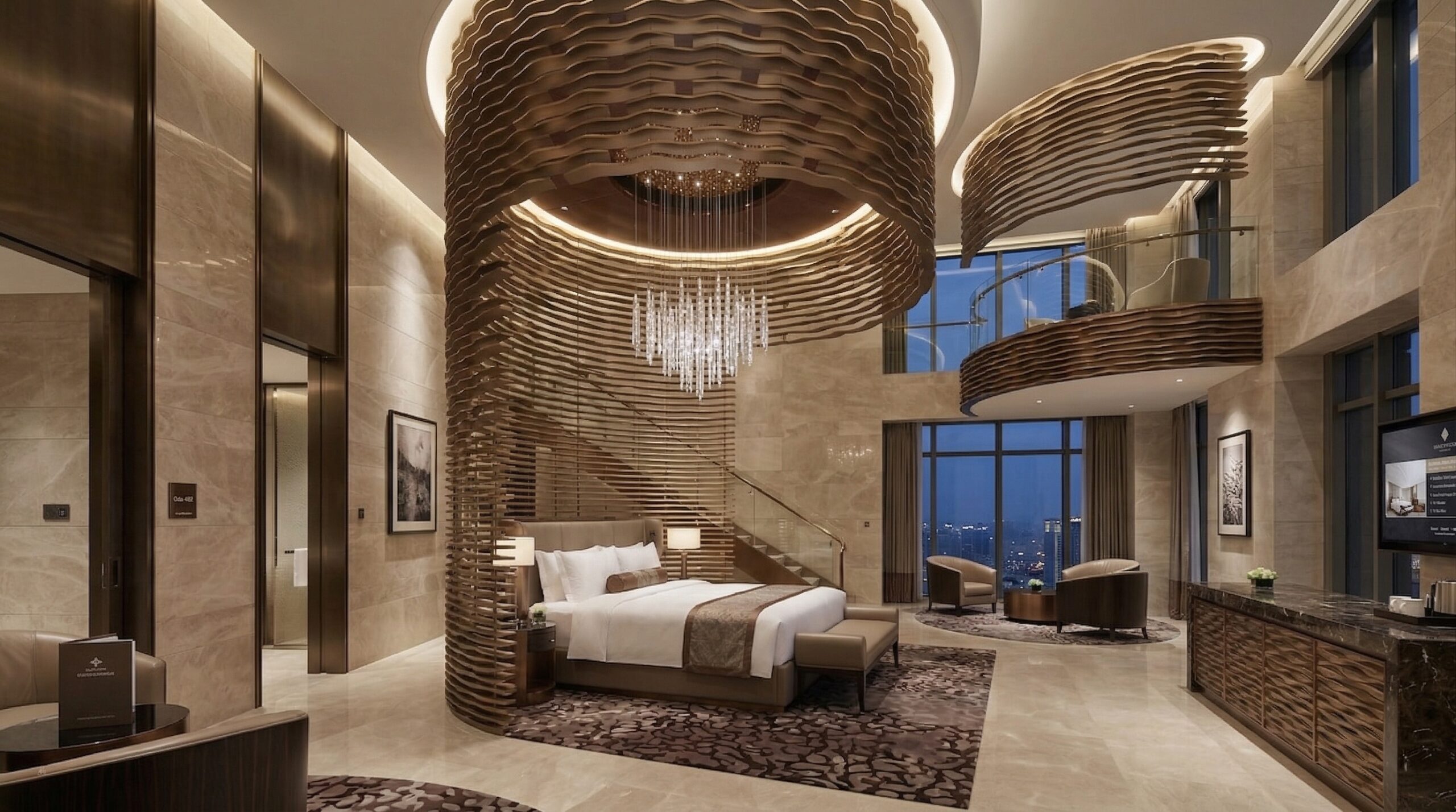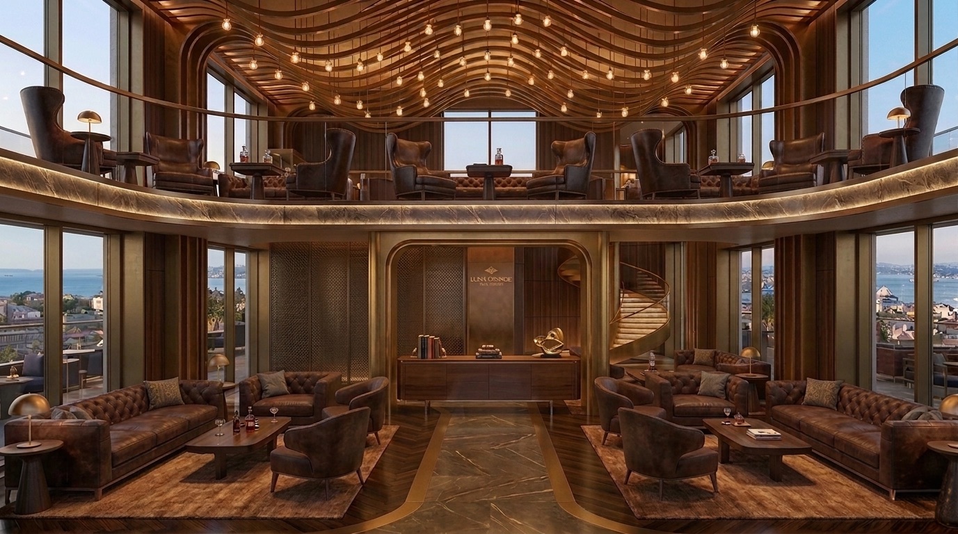 İç mekânlarda akışkan formlar, dalgalı yüzeyler ve sıcak tonlu malzemeler öne çıkar. Çift yükseklikli lobi, spiral merdiven ve büyük ölçekli aydınlatma elemanları ile güçlü bir mekânsal odak yaratılır. Organik çizgilerle şekillenen tavan ve duvar yüzeyleri, kullanıcı hareketini yönlendiren süreklilik hissi oluşturur.