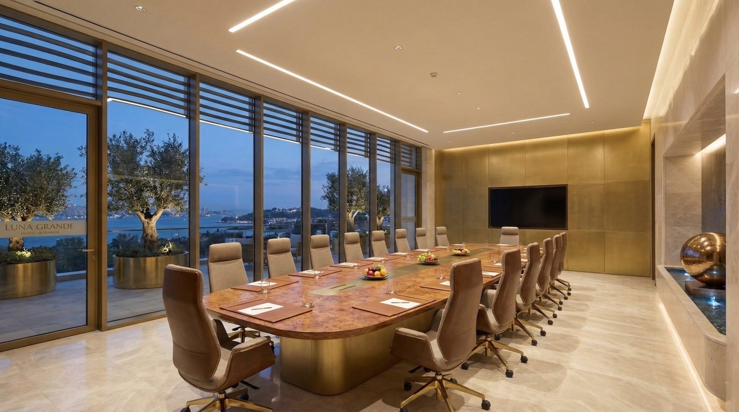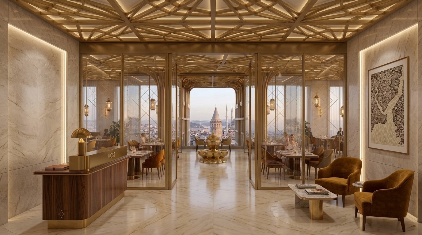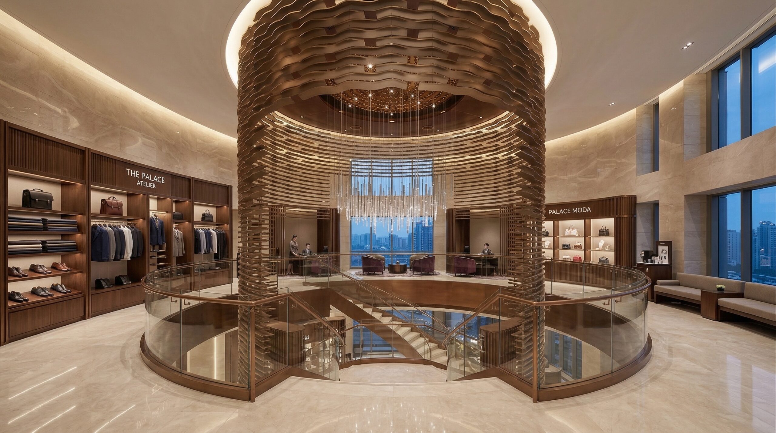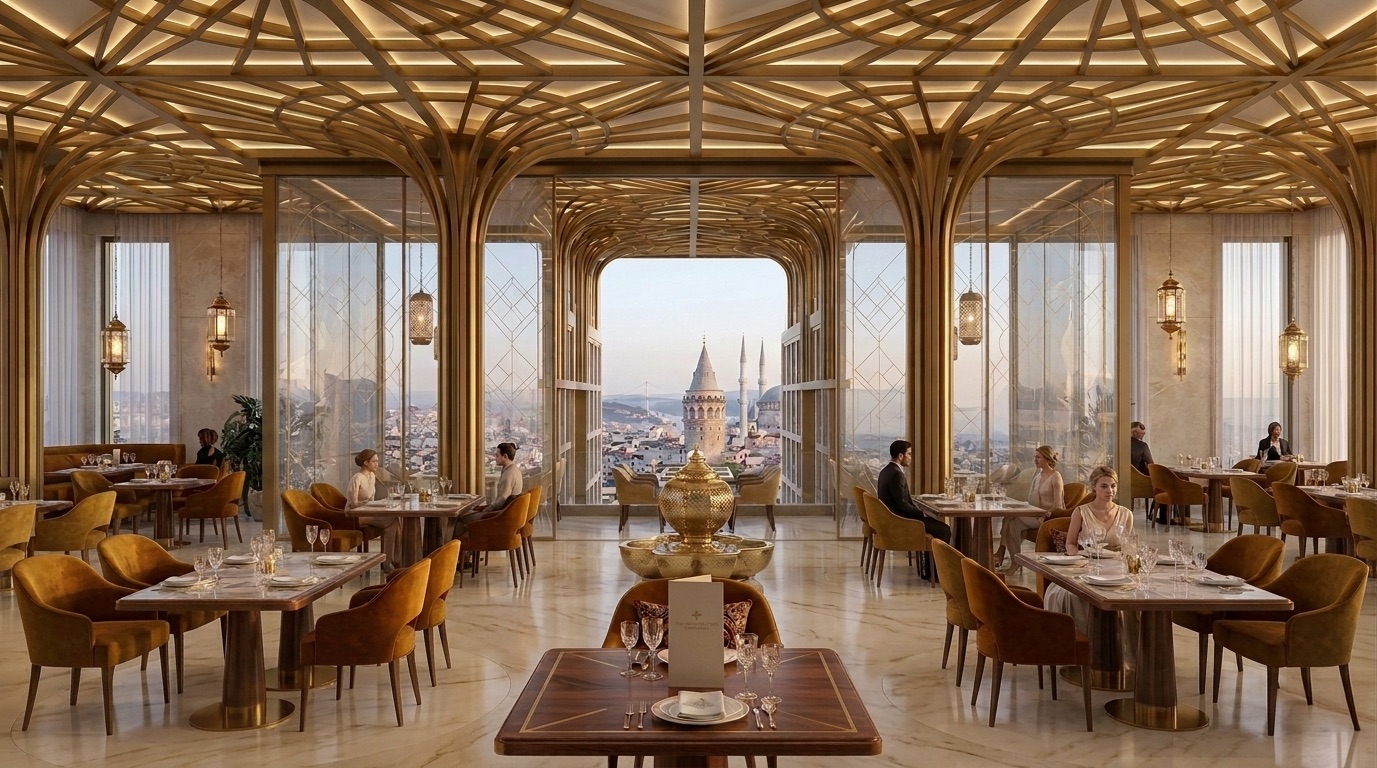 İç mekânlarda akışkan formlar, dalgalı yüzeyler ve sıcak tonlu malzemeler öne çıkar. Çift yükseklikli lobi, spiral merdiven ve büyük ölçekli aydınlatma elemanları ile güçlü bir mekânsal odak yaratılır. Organik çizgilerle şekillenen tavan ve duvar yüzeyleri, kullanıcı hareketini yönlendiren süreklilik hissi oluşturur.