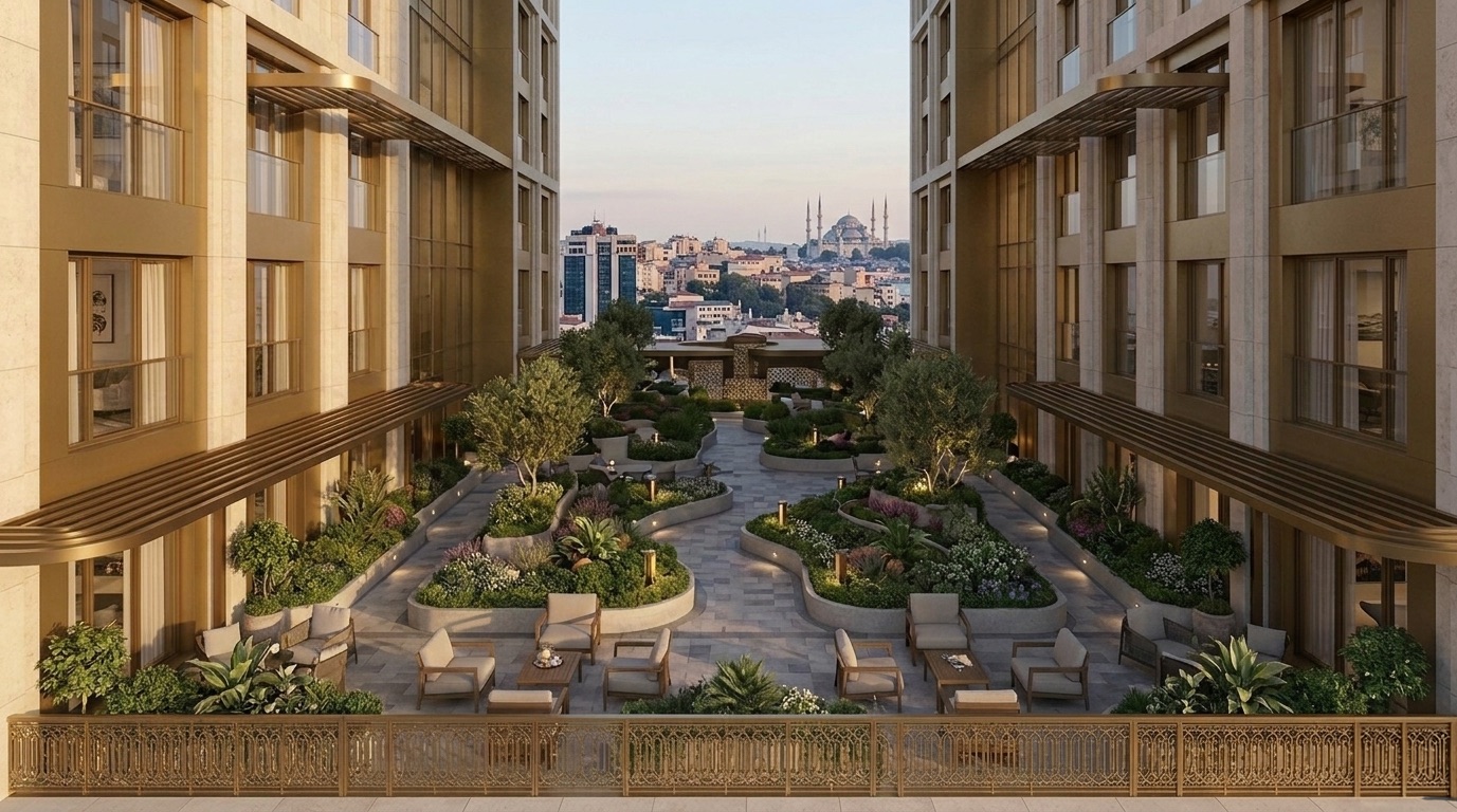 İki kuleli kütle organizasyonu ve aralarında tanımlanan yarı kamusal avlu ile kurgulanan bu otel tasarımı, kentsel yoğunluk içinde nefes alan bir iç mekânsal boşluk oluşturur. Simetrik yerleşim, giriş aksını vurgularken; zemin kotta şeffaf ve davetkâr bir kamusal ilişki kurar.