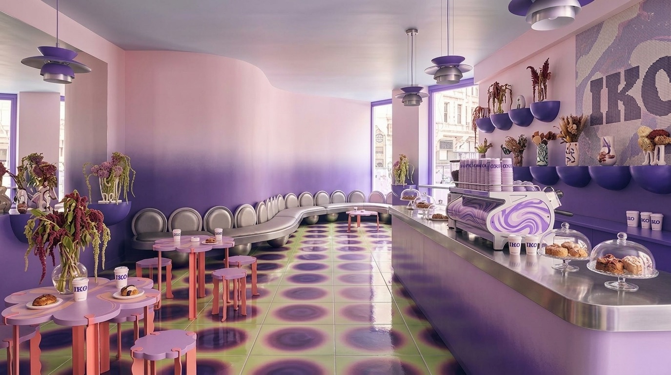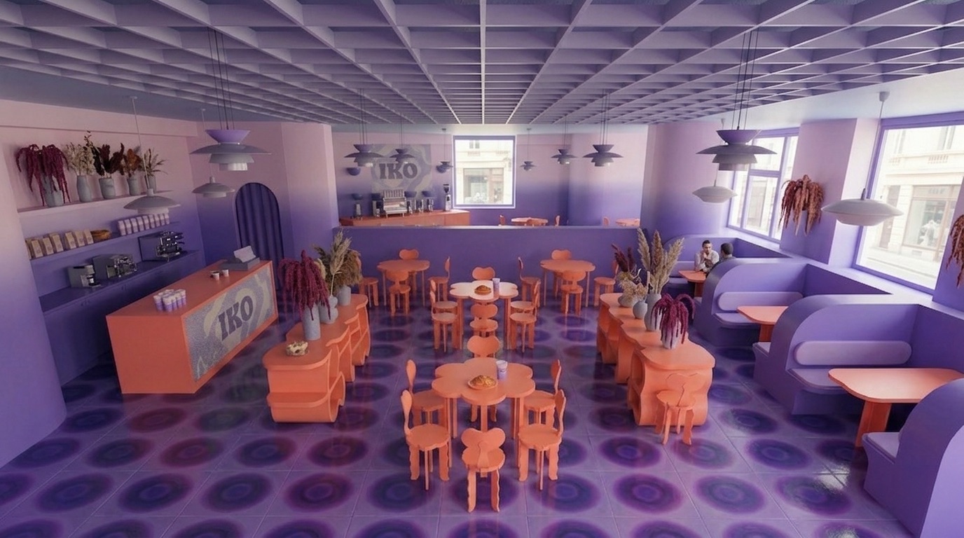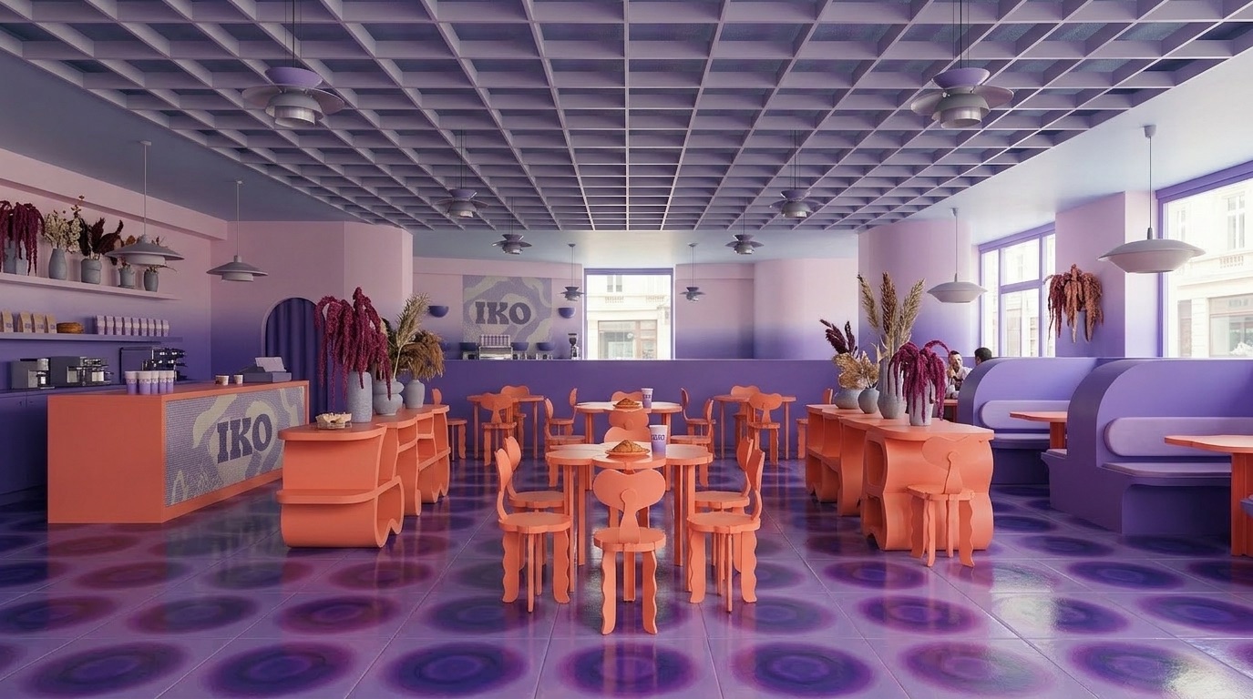 Pastel mor tonların baskın olduğu bu kafe, retro-fütüristik bir atmosfer ile çağdaş tasarımı bir araya getirir. Organik formlu mobilyalar, akışkan yüzeyler ve grafik zemin desenleri mekâna dinamik bir kimlik kazandırırken; turuncu vurgular kontrast yaratarak enerjiyi yükseltir. Tavan grid sistemi ve yumuşak geçişli renk paleti, mekânın bütünsel algısını güçlendirir. Hem sosyal etkileşime hem de deneyim odaklı kullanıma açık bir iç mekân kurgusu sunar.