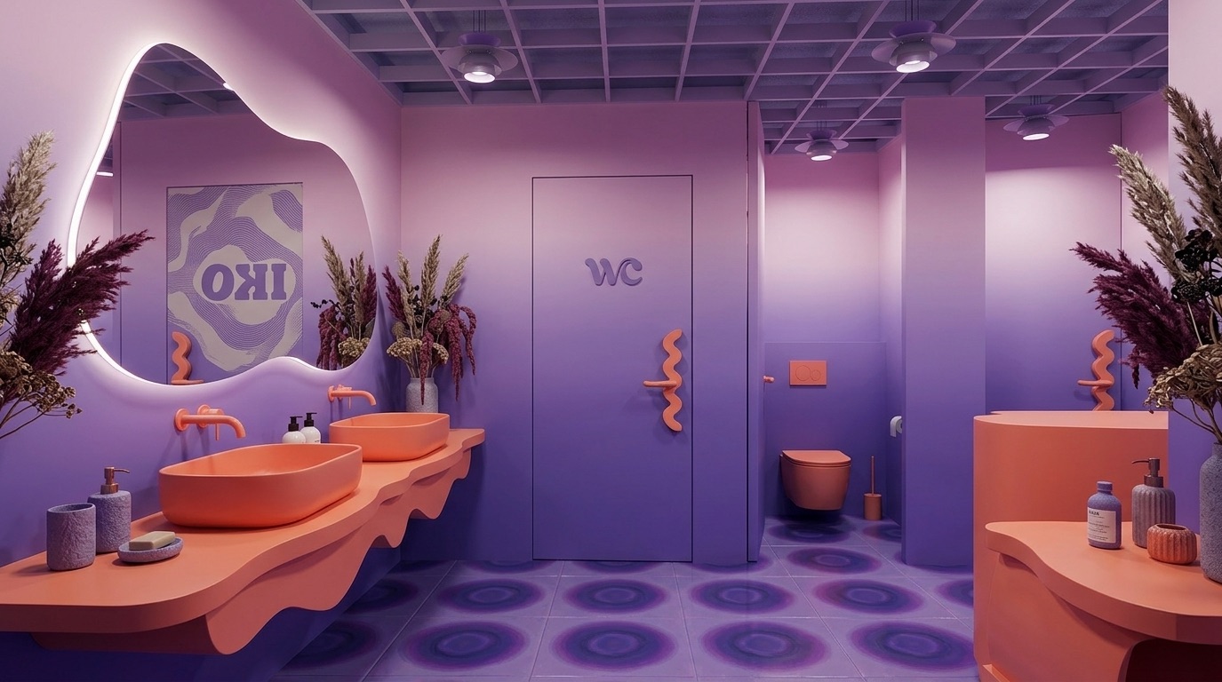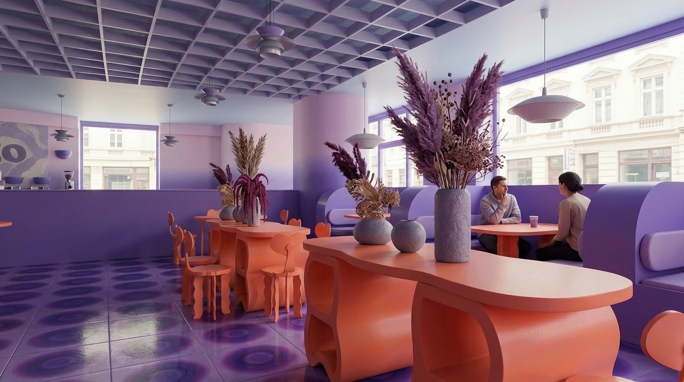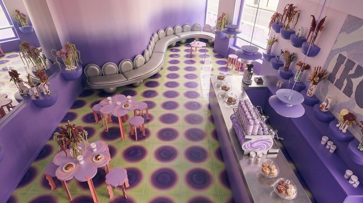 Pastel mor tonların baskın olduğu bu kafe, retro-fütüristik bir atmosfer ile çağdaş tasarımı bir araya getirir. Organik formlu mobilyalar, akışkan yüzeyler ve grafik zemin desenleri mekâna dinamik bir kimlik kazandırırken; turuncu vurgular kontrast yaratarak enerjiyi yükseltir. Tavan grid sistemi ve yumuşak geçişli renk paleti, mekânın bütünsel algısını güçlendirir. Hem sosyal etkileşime hem de deneyim odaklı kullanıma açık bir iç mekân kurgusu sunar.