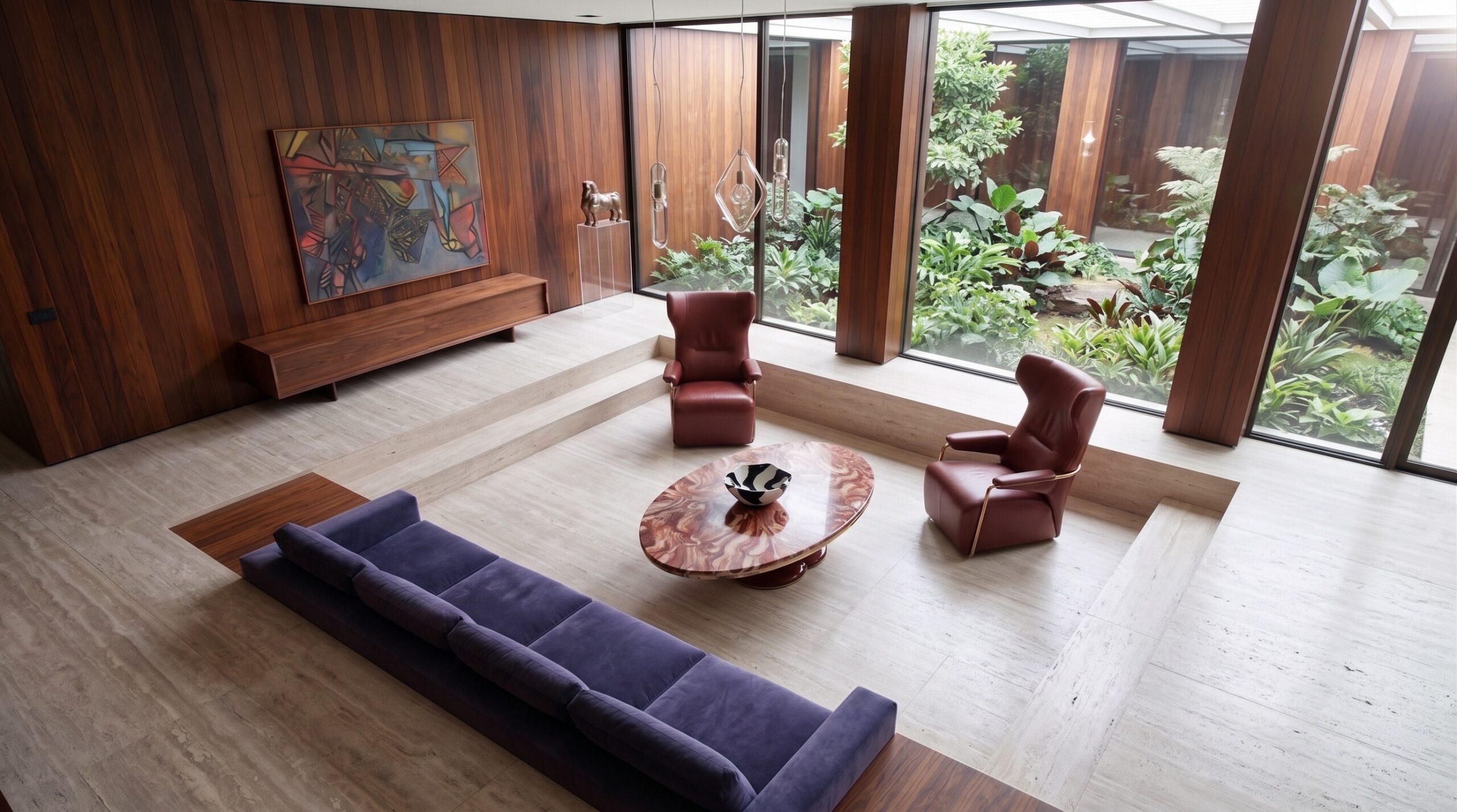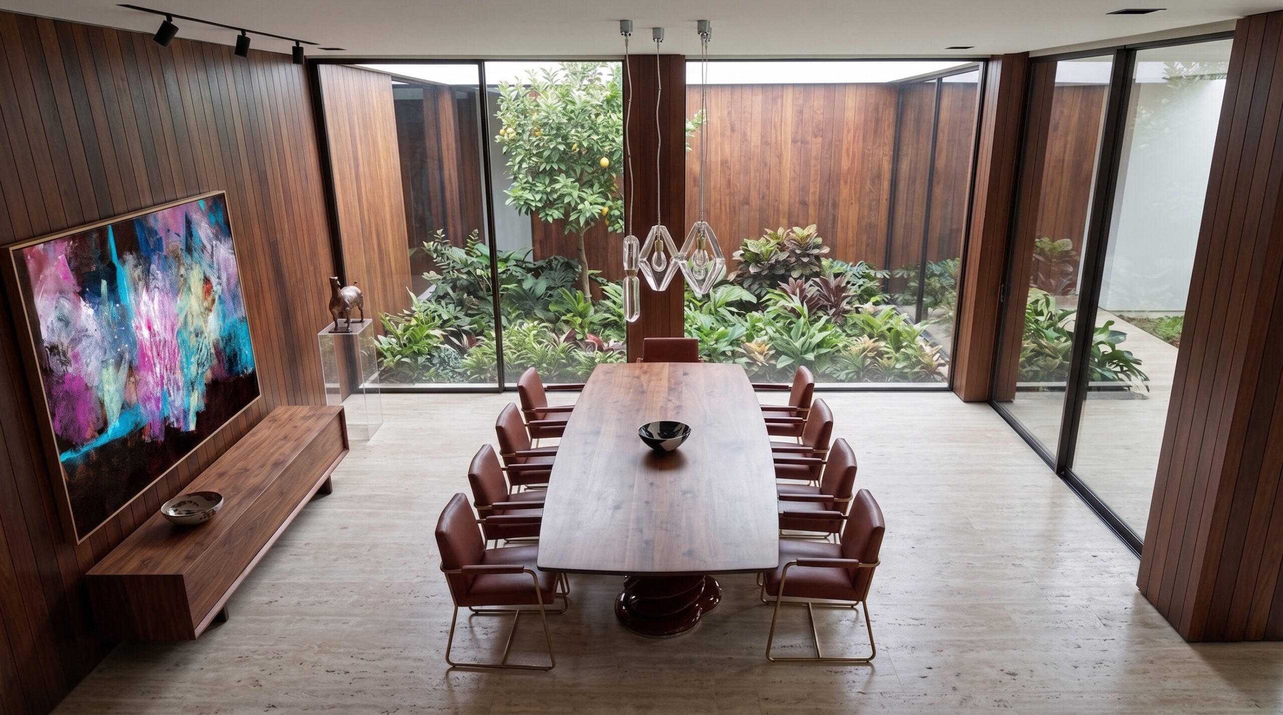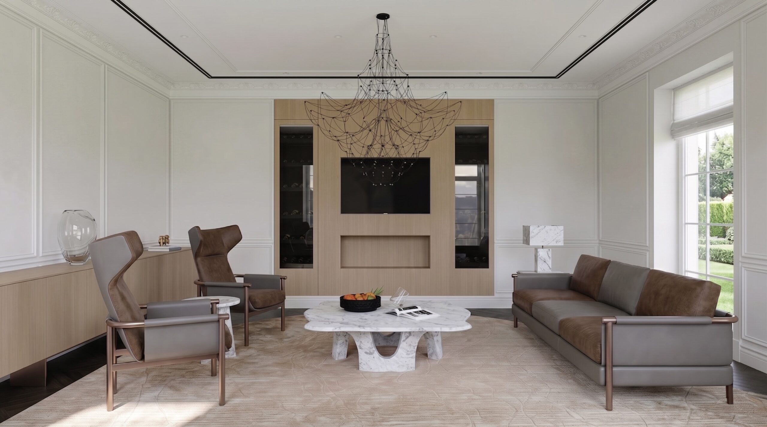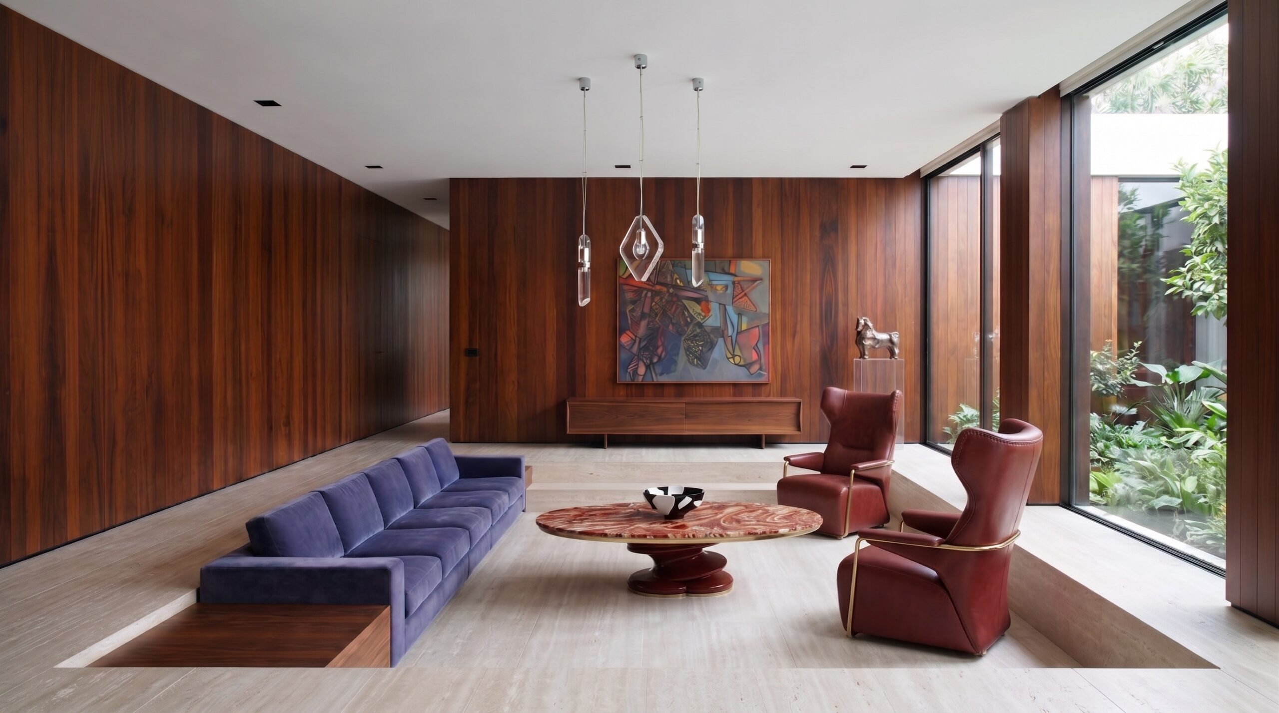 Ahşap panel duvarlar, açık tonlu zemin kaplamaları ve doğal dokular, mekânda sıcak ve yalın bir zemin oluşturur. Düşük profilli modüler koltuklar, deri ve kumaş karışımı oturma elemanları, masif ahşap yemek masası ve heykelsi orta sehpalar mekânın karakterini tanımlar.