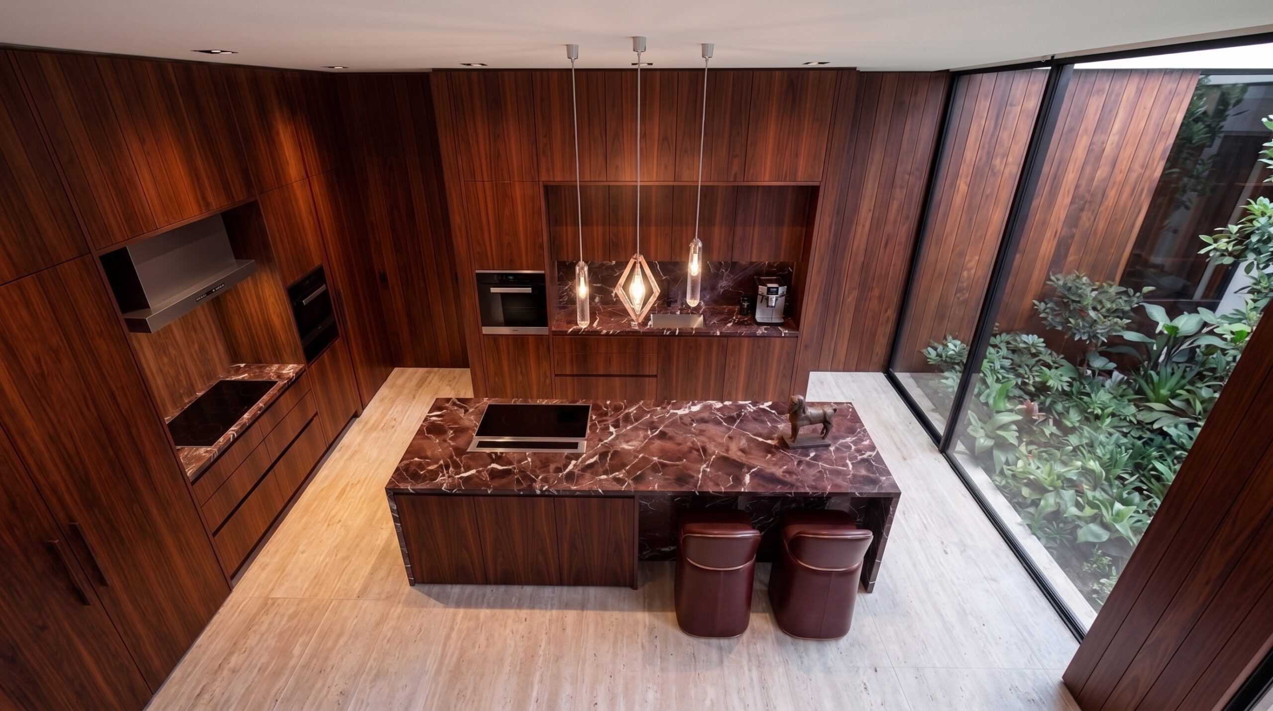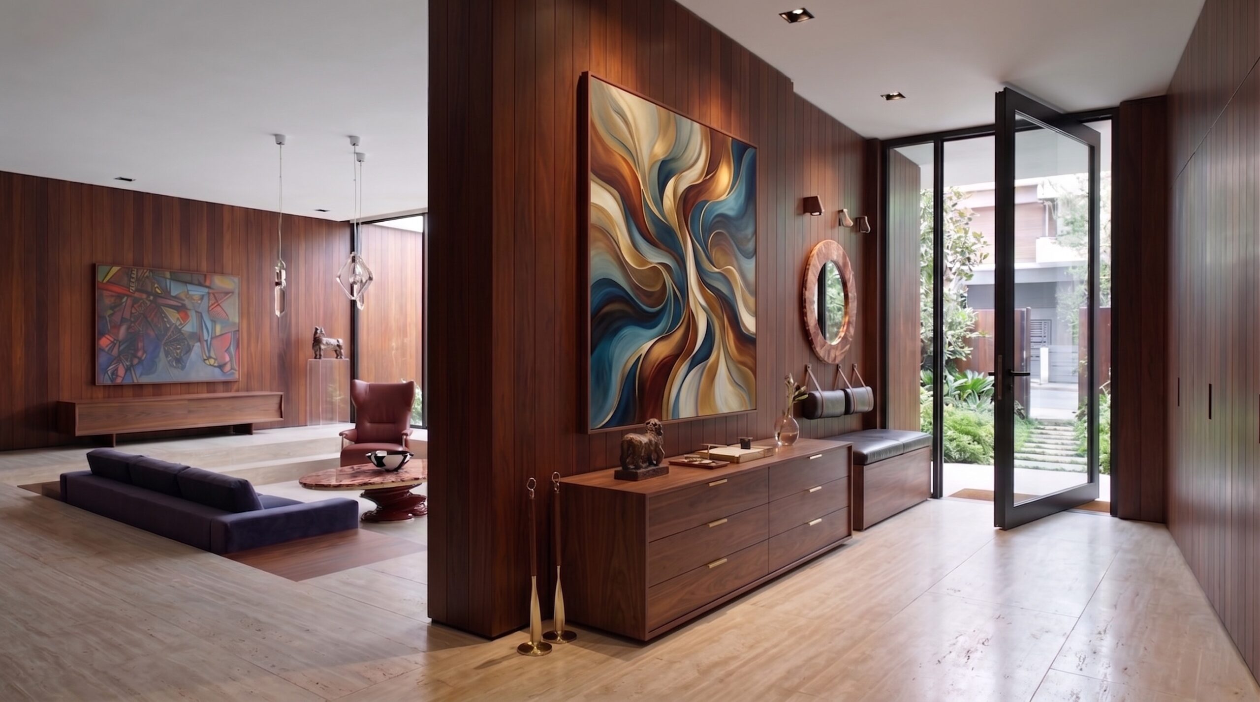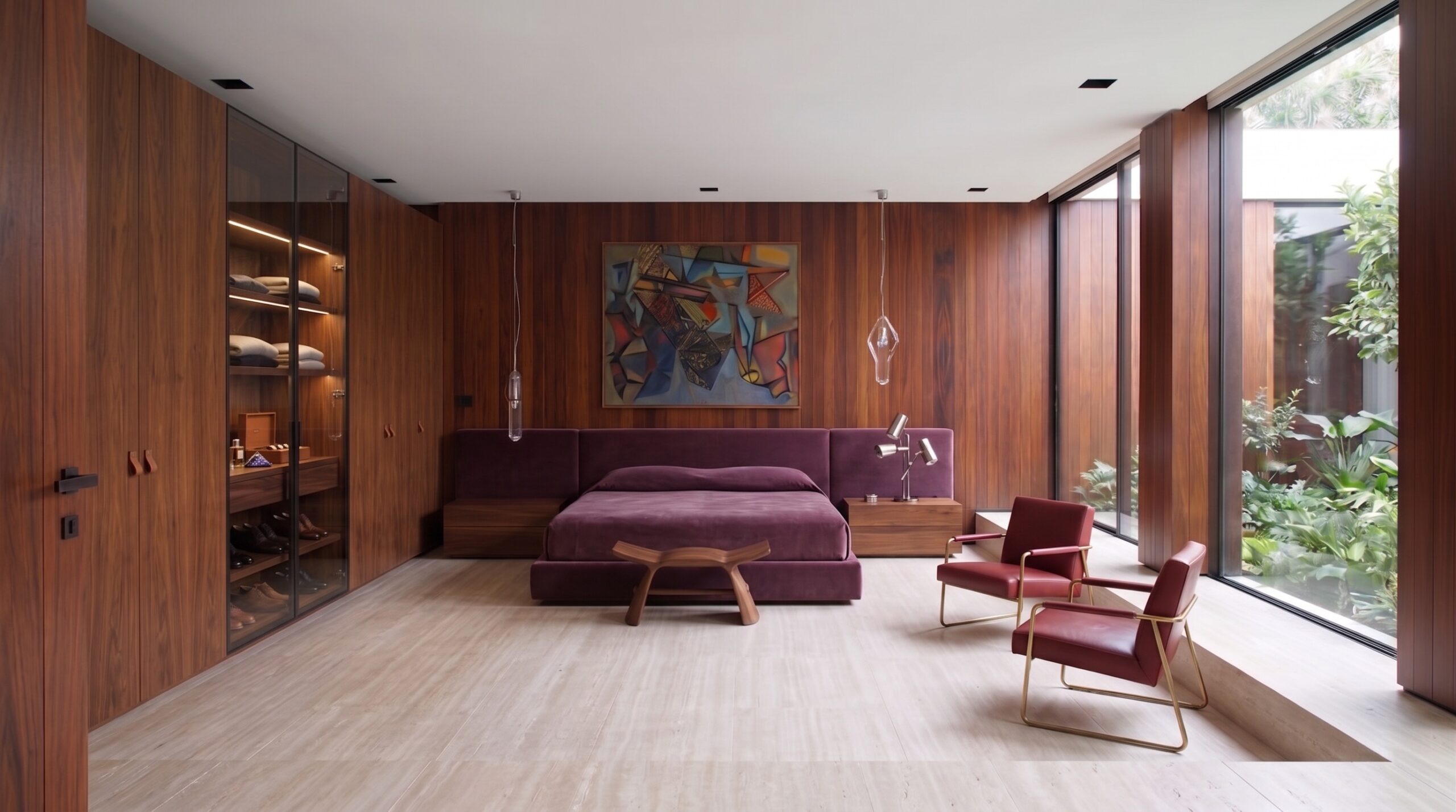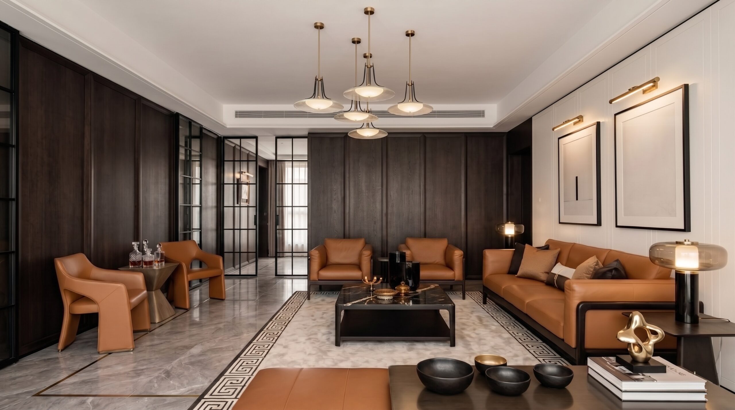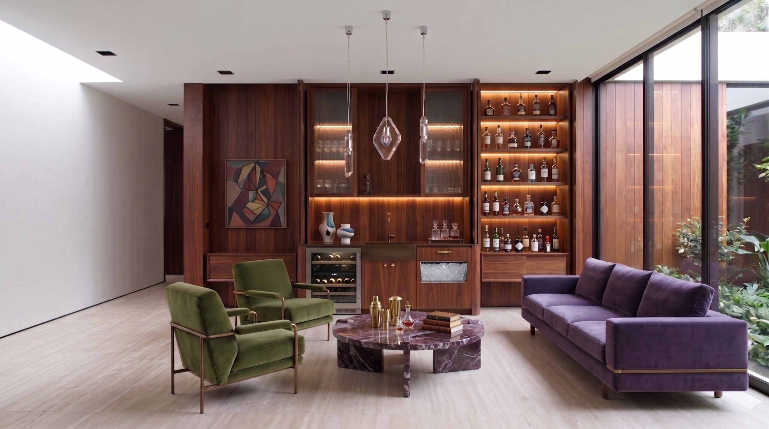 Ahşap panel duvarlar, açık tonlu zemin kaplamaları ve doğal dokular, mekânda sıcak ve yalın bir zemin oluşturur. Düşük profilli modüler koltuklar, deri ve kumaş karışımı oturma elemanları, masif ahşap yemek masası ve heykelsi orta sehpalar mekânın karakterini tanımlar.