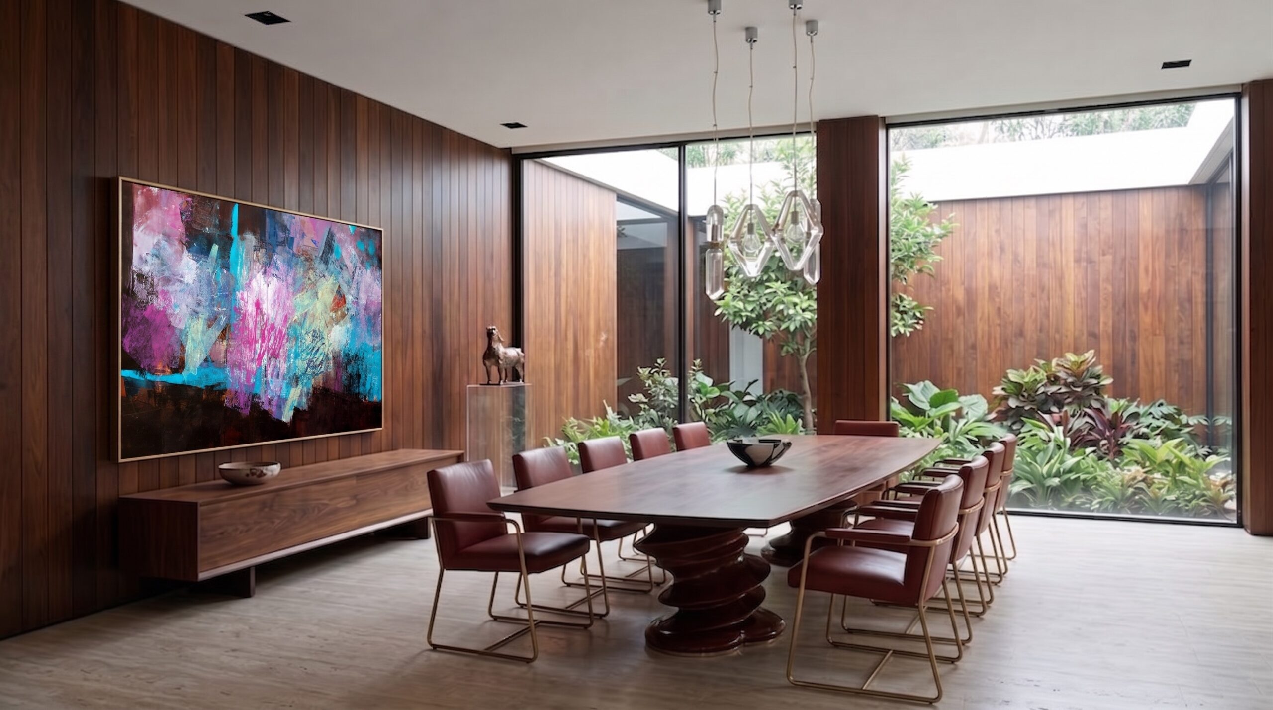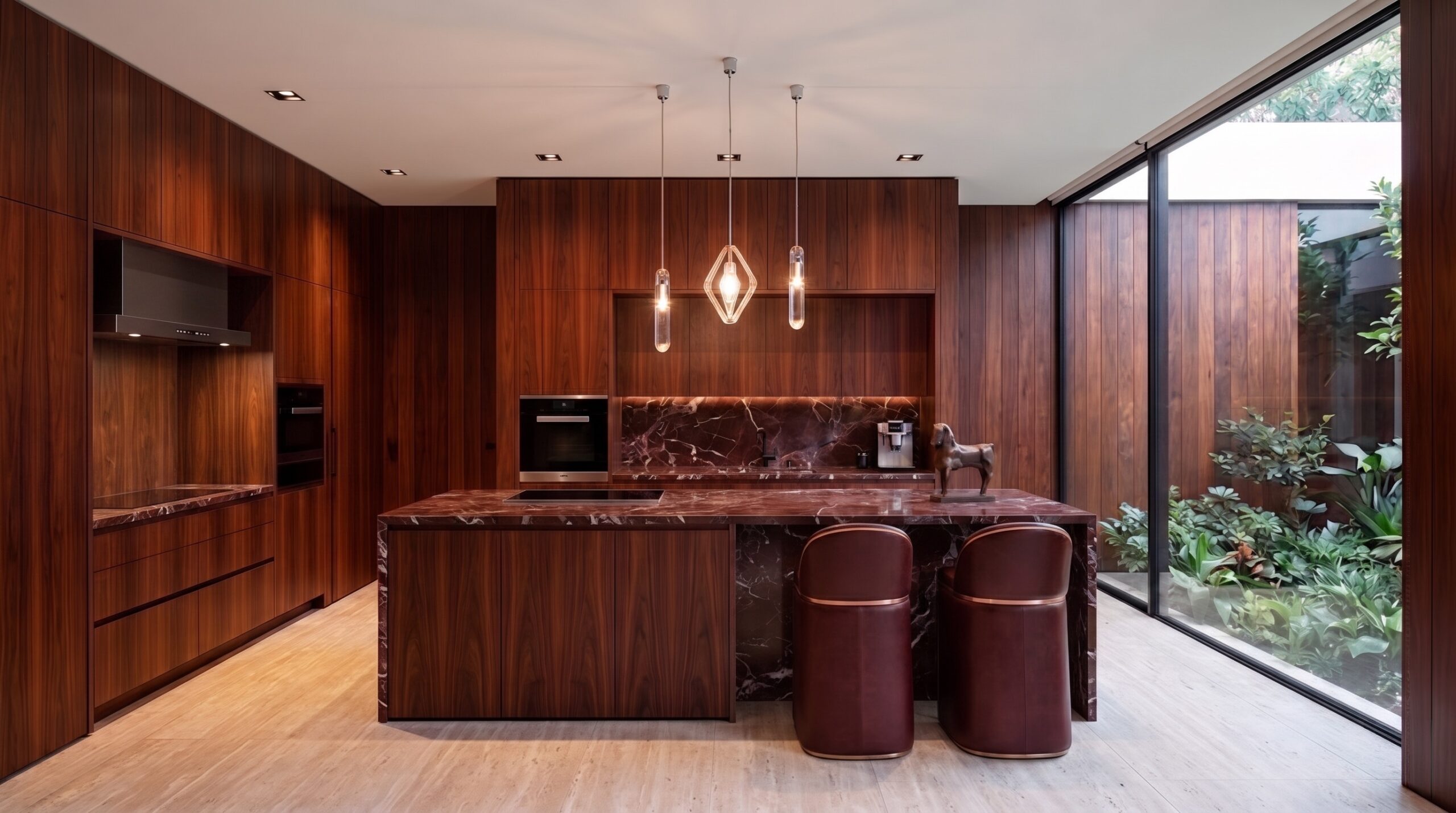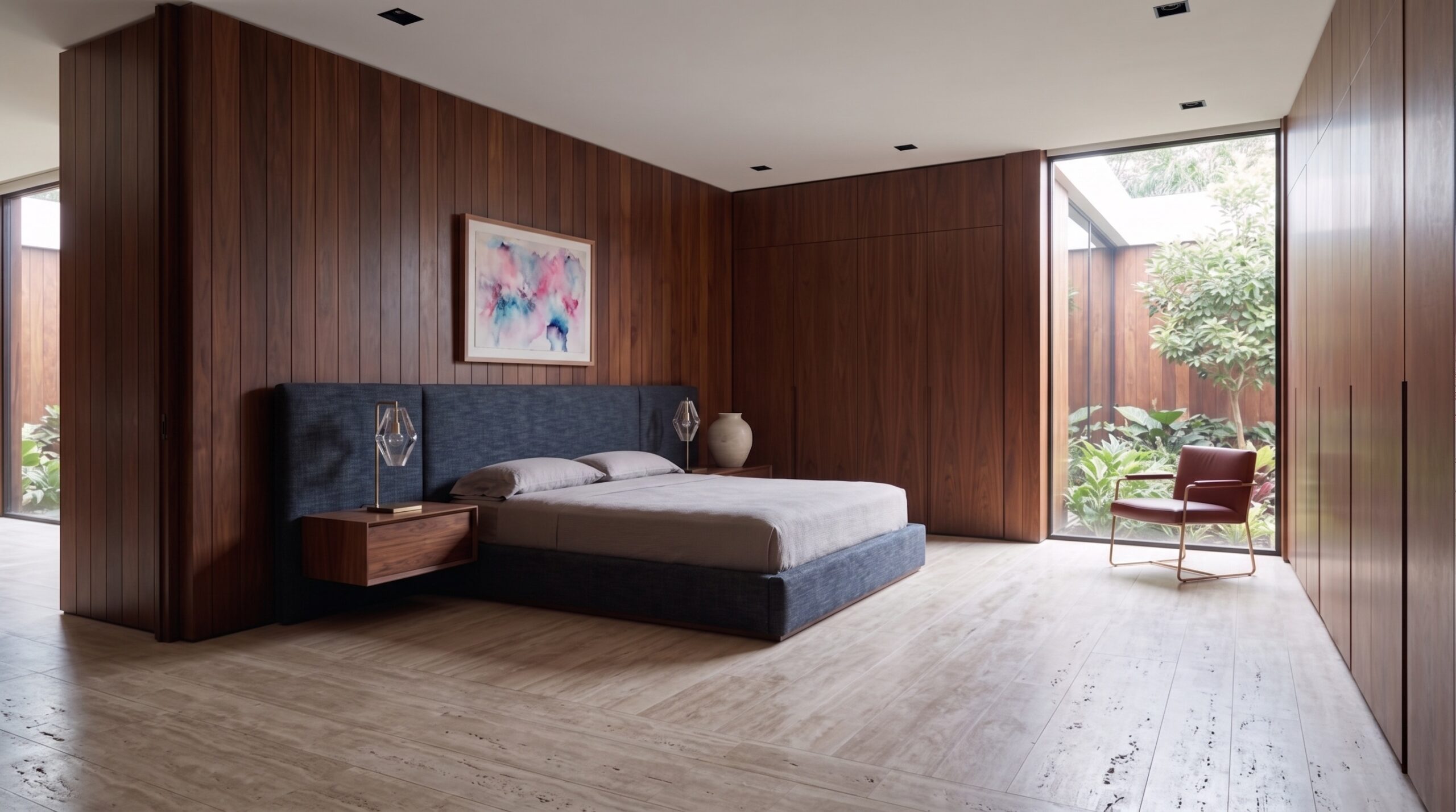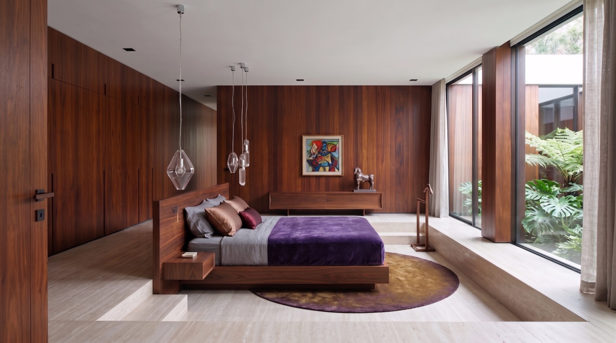 Ahşap panel duvarlar, açık tonlu zemin kaplamaları ve doğal dokular, mekânda sıcak ve yalın bir zemin oluşturur. Düşük profilli modüler koltuklar, deri ve kumaş karışımı oturma elemanları, masif ahşap yemek masası ve heykelsi orta sehpalar mekânın karakterini tanımlar.