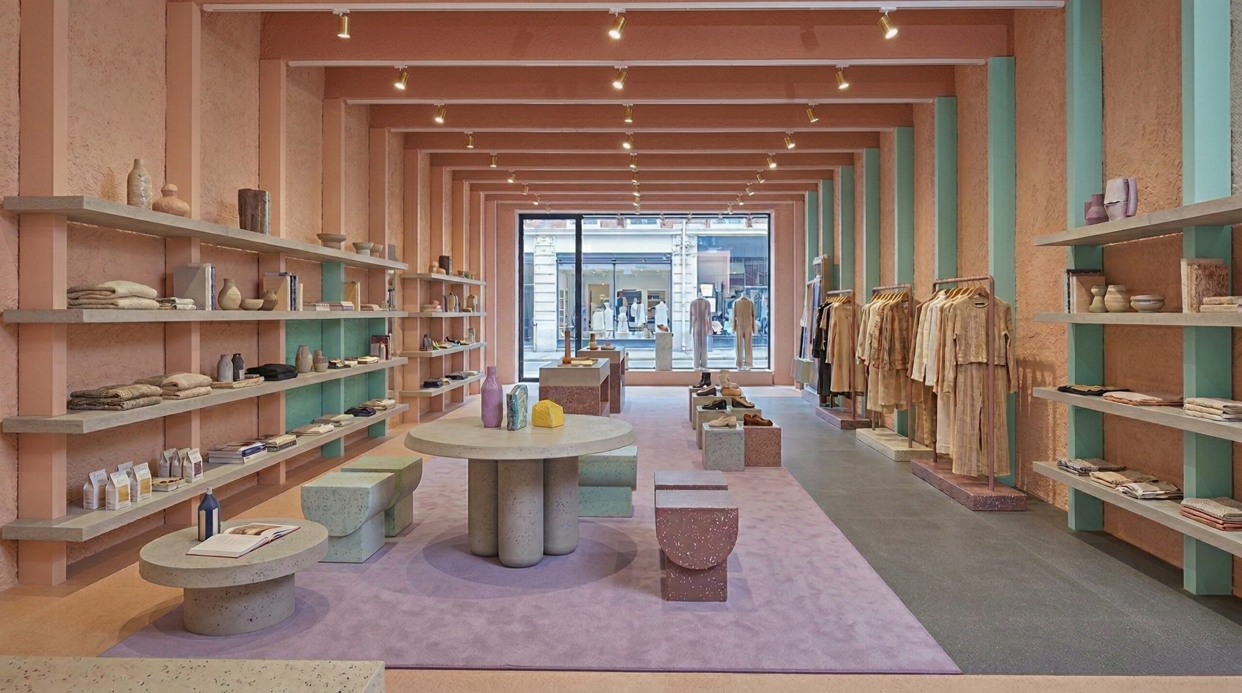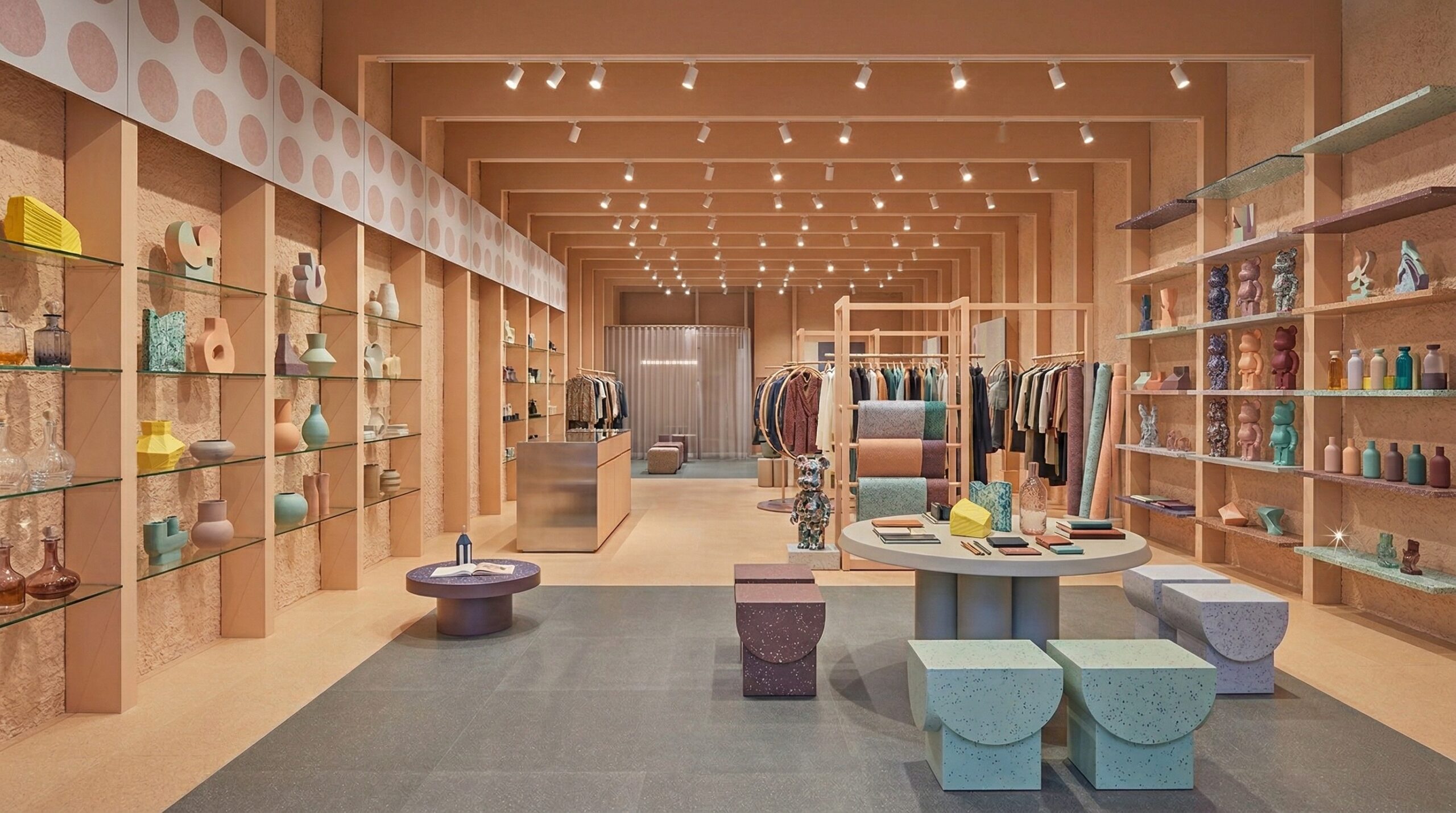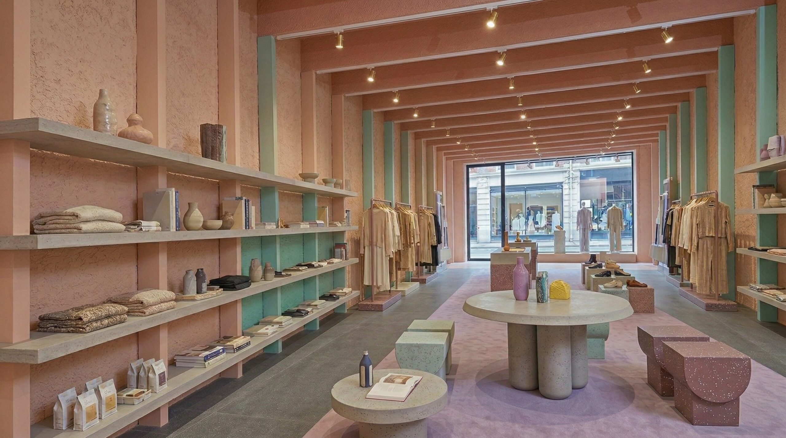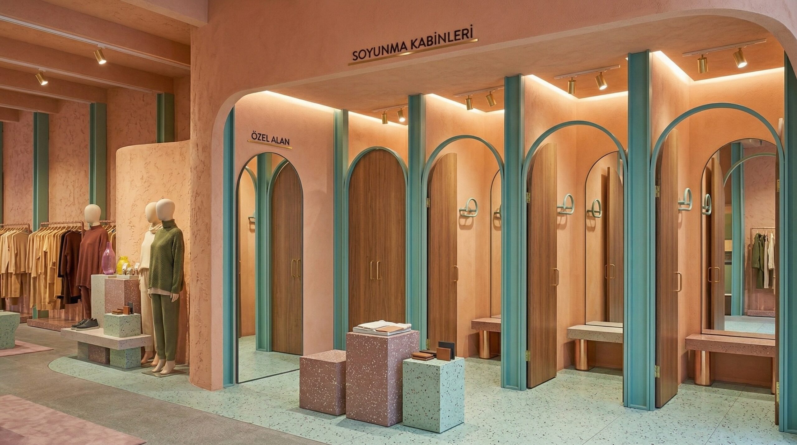 Pastel tonların (şeftali, açık yeşil ve nötr bej) dengeli kullanımı, mekâna yumuşak ve davetkâr bir atmosfer kazandırırken; ürün sergileme alanları bu sakin zemin üzerinde ön plana çıkar. Merkezi ada ve uzun sergileme masaları, ürünle doğrudan temas kurulan odak noktaları oluşturur.