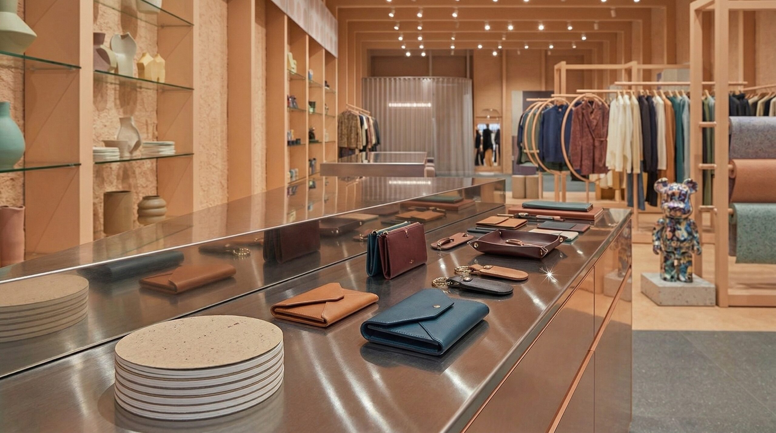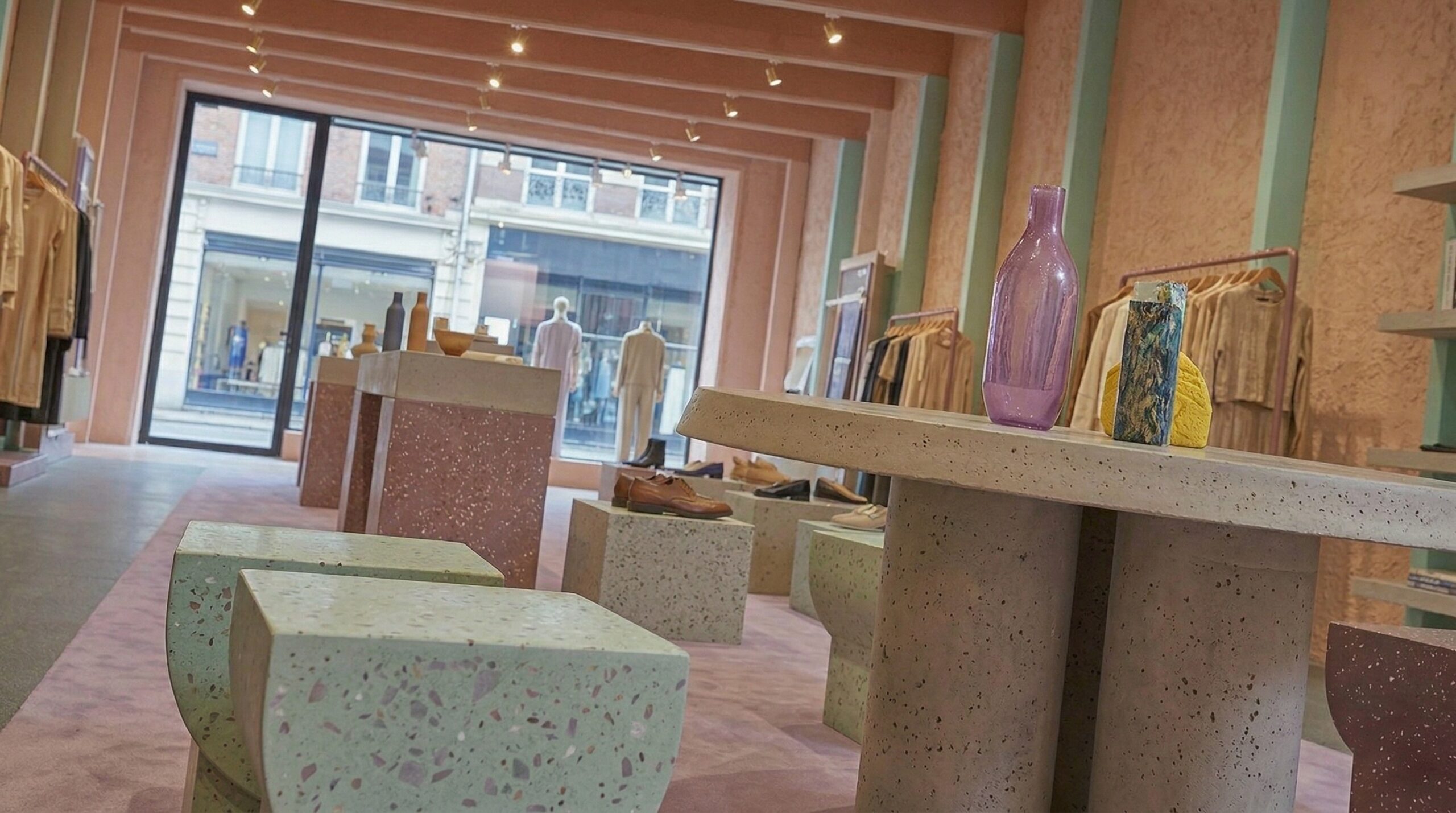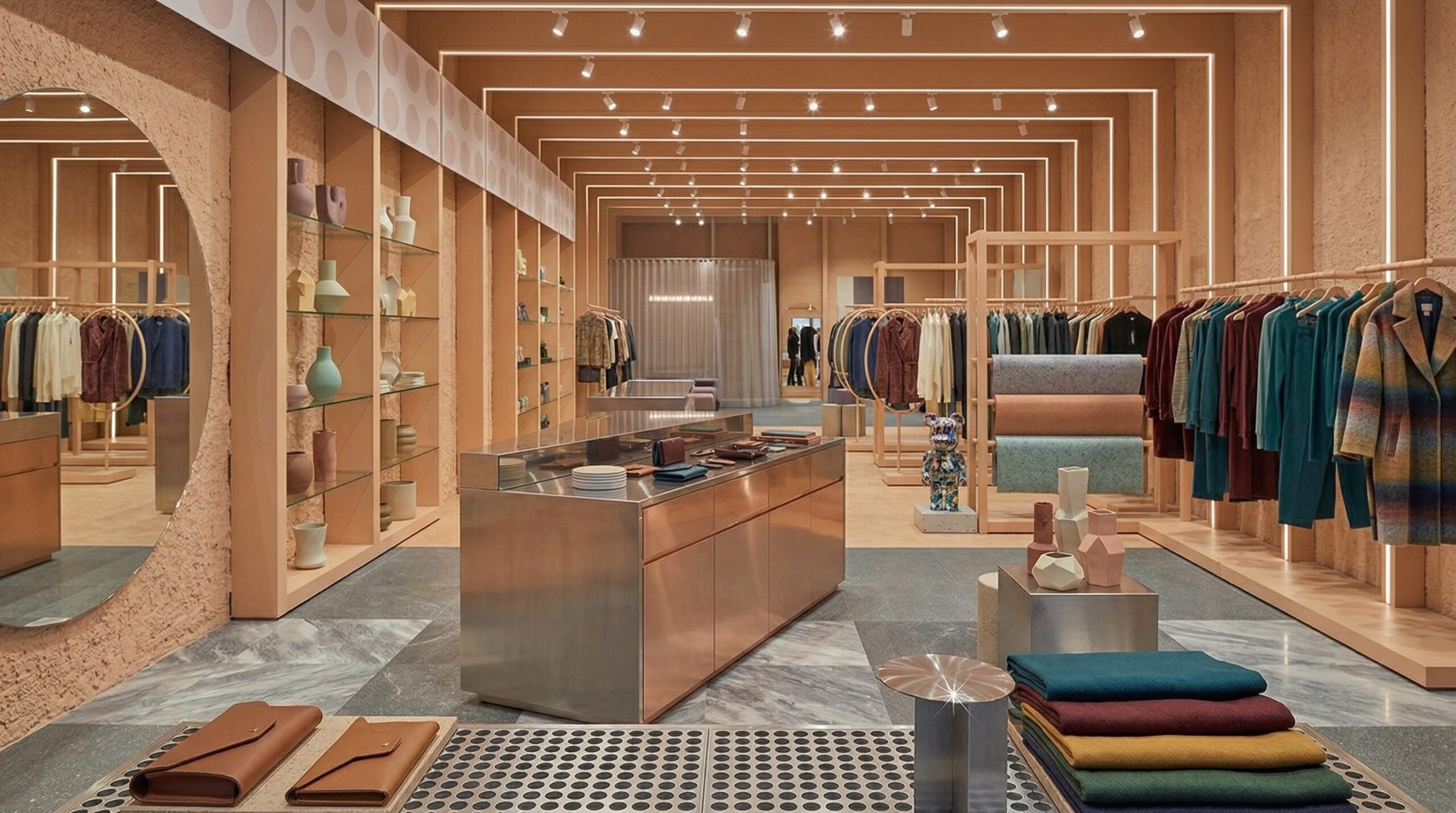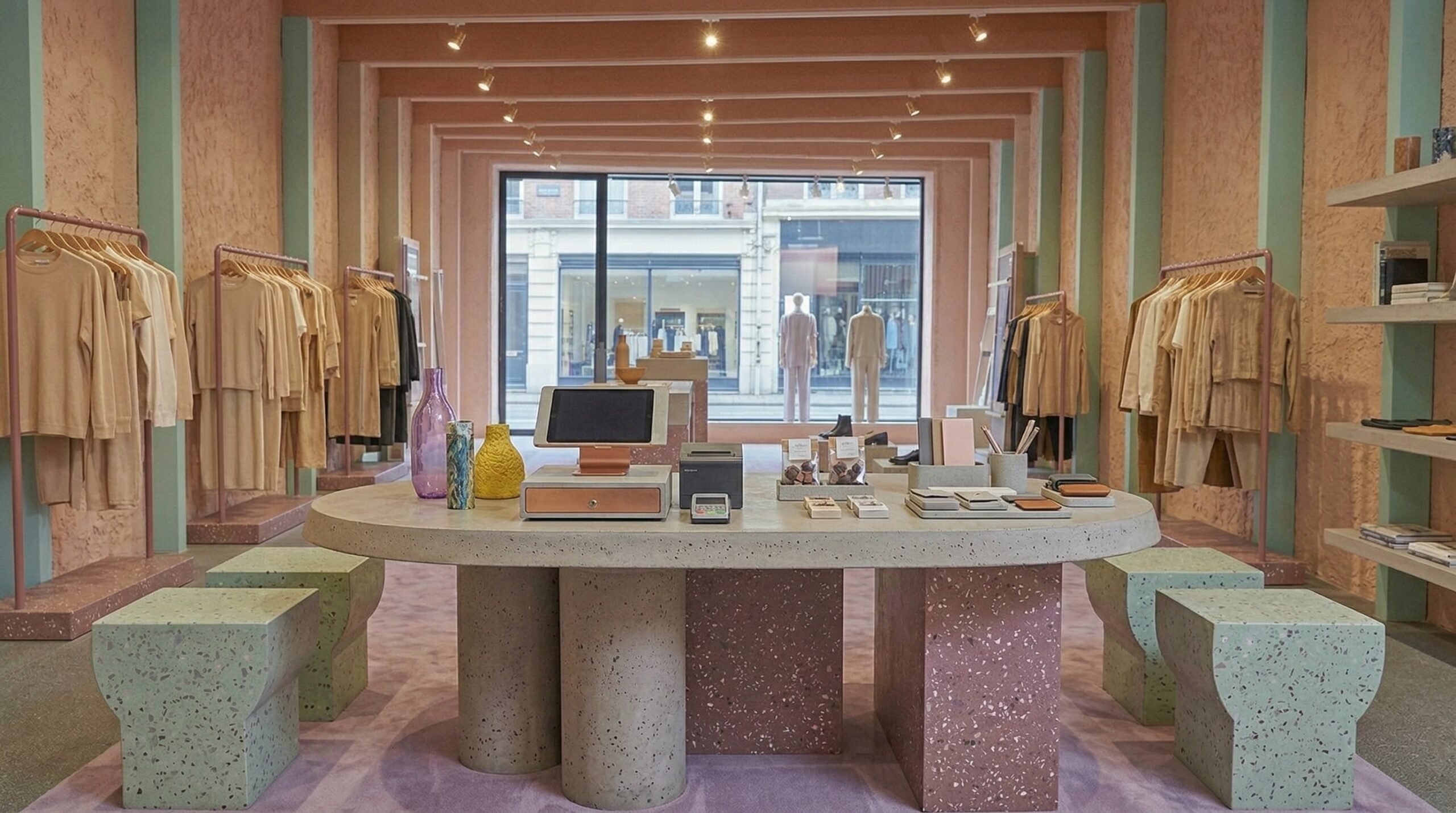 Pastel tonların (şeftali, açık yeşil ve nötr bej) dengeli kullanımı, mekâna yumuşak ve davetkâr bir atmosfer kazandırırken; ürün sergileme alanları bu sakin zemin üzerinde ön plana çıkar. Merkezi ada ve uzun sergileme masaları, ürünle doğrudan temas kurulan odak noktaları oluşturur.