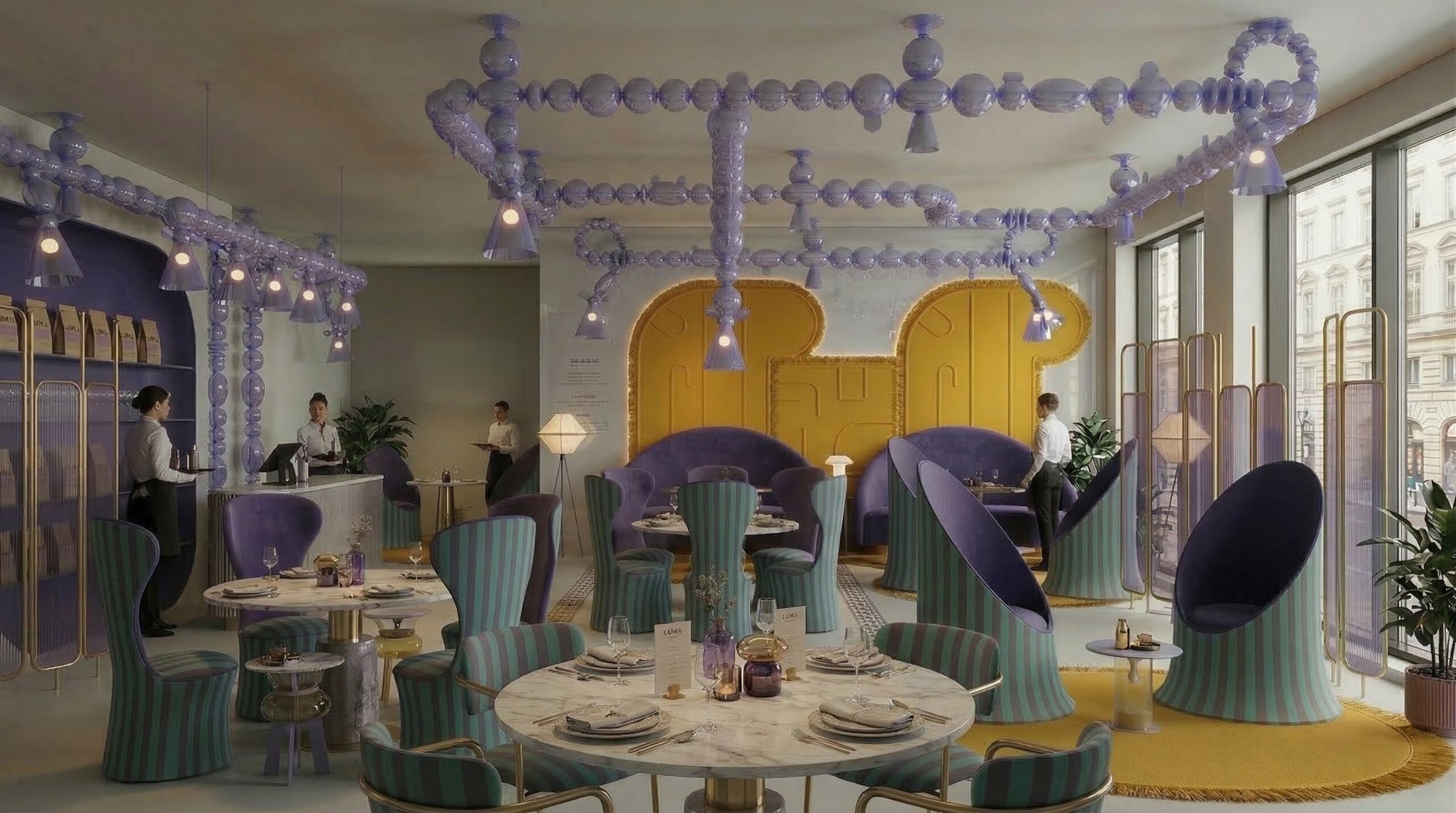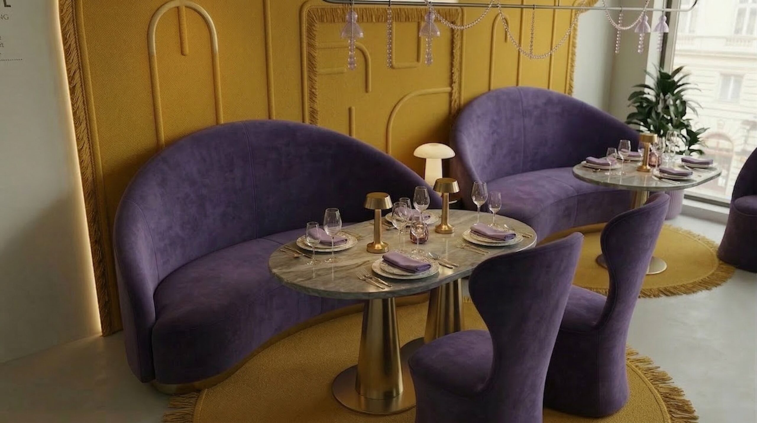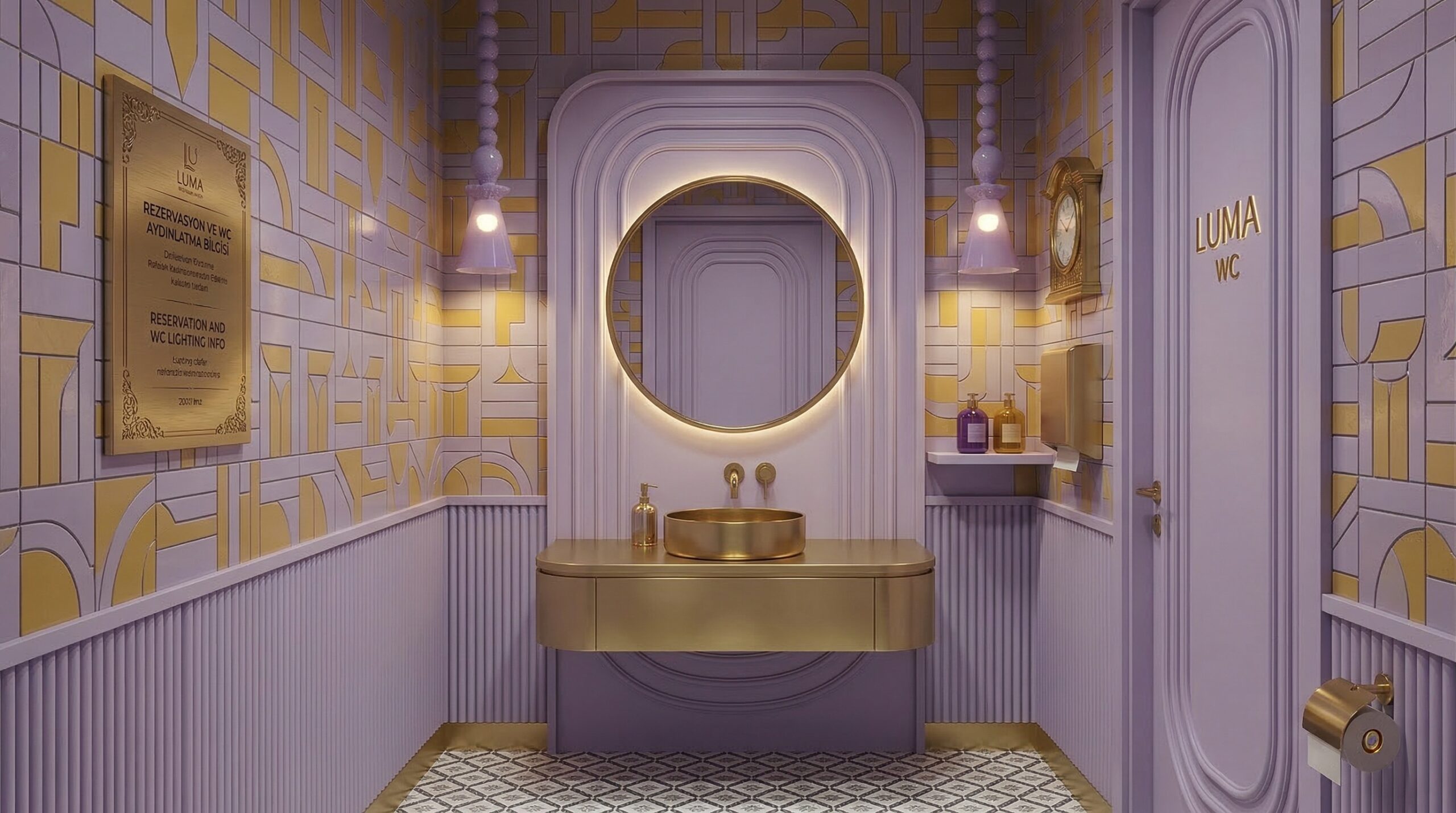 Pastel tonların cesur kontrastlarla birleştiği bu mekân, mor ve sarı renk paletinin güçlü etkisiyle karakteristik ve deneyim odaklı bir atmosfer sunar. Kavisli formlar, nişli yüzeyler ve geometrik duvar desenleri, mekâna hem Art Deco referanslı hem de çağdaş bir kimlik kazandırır.