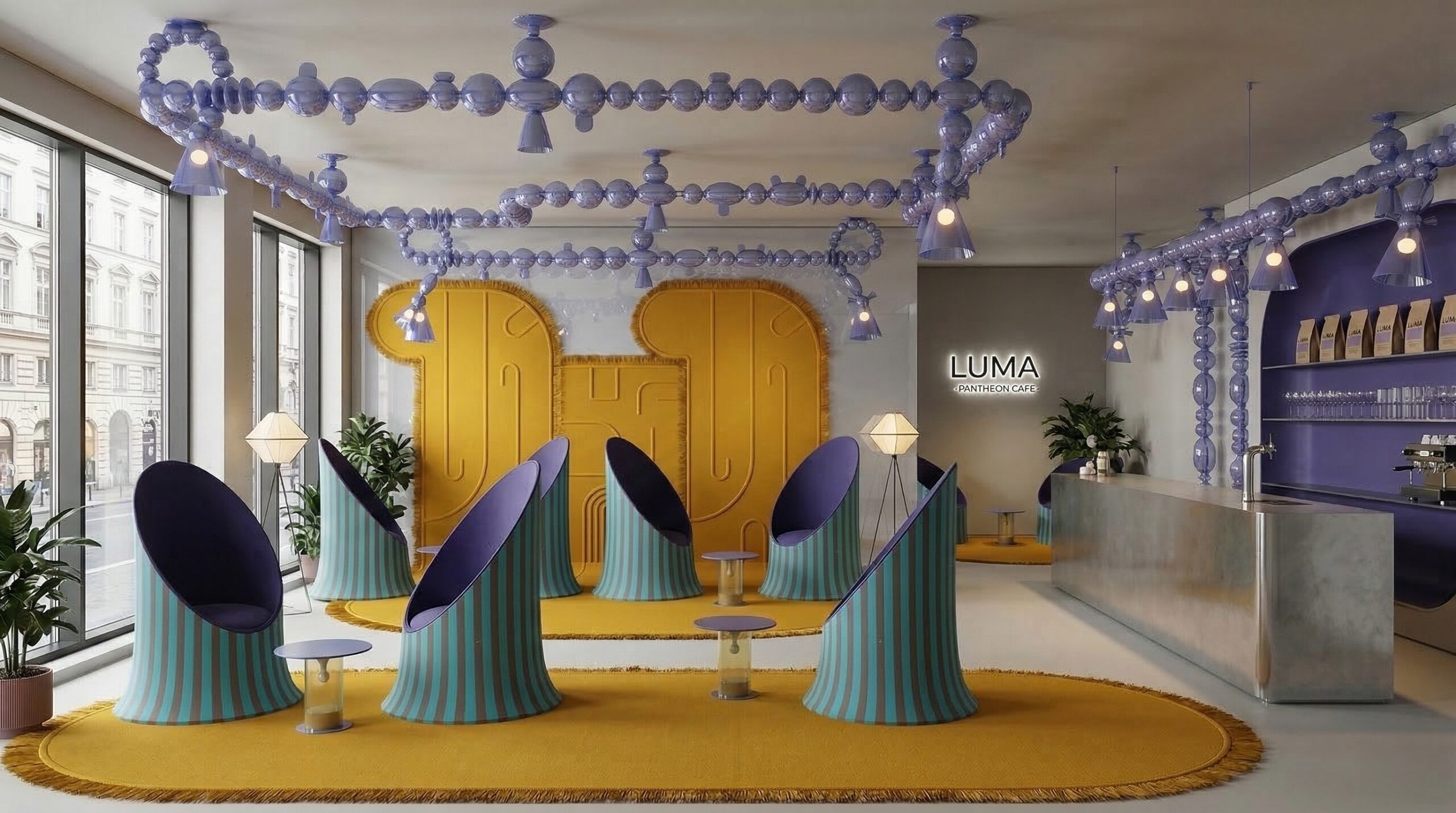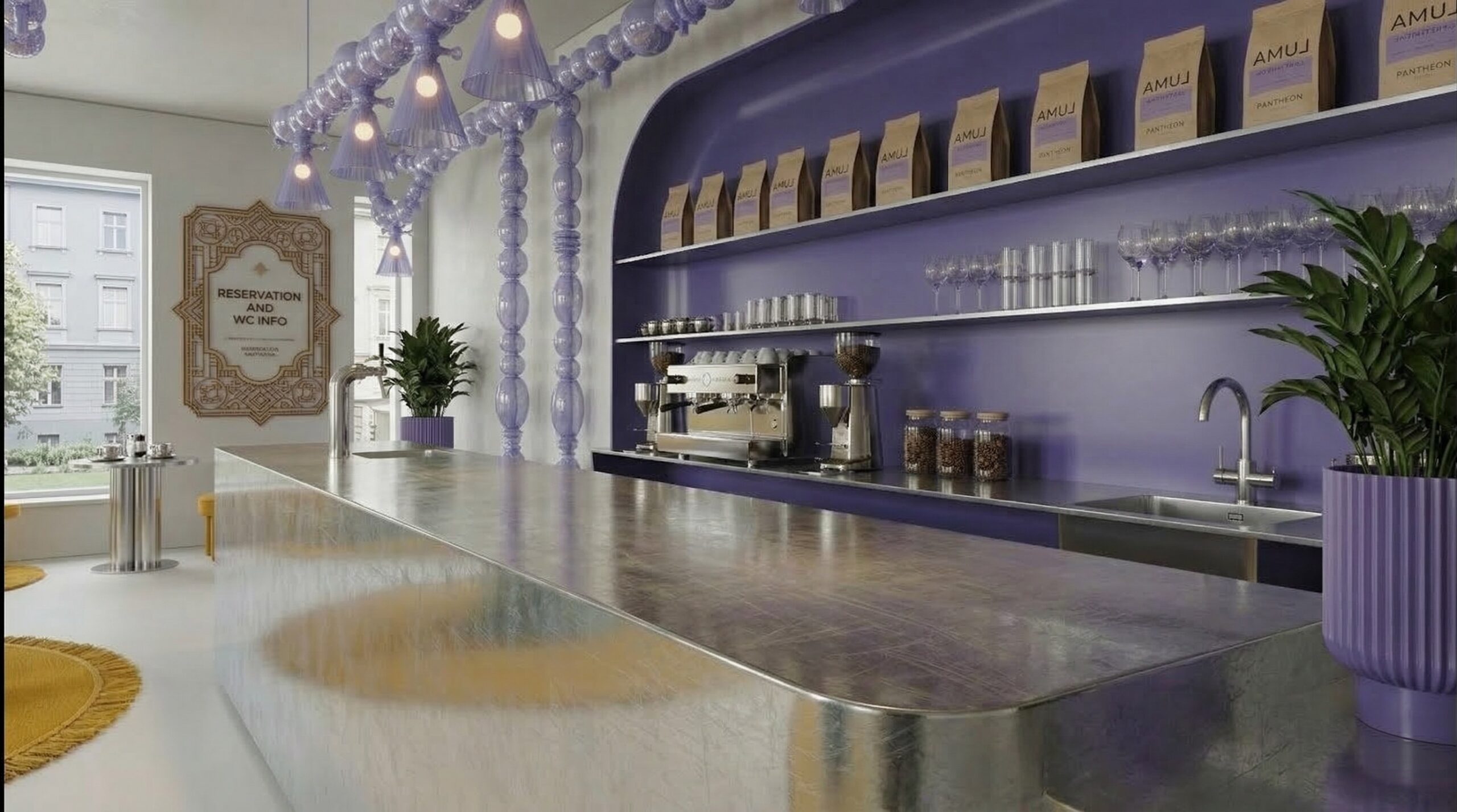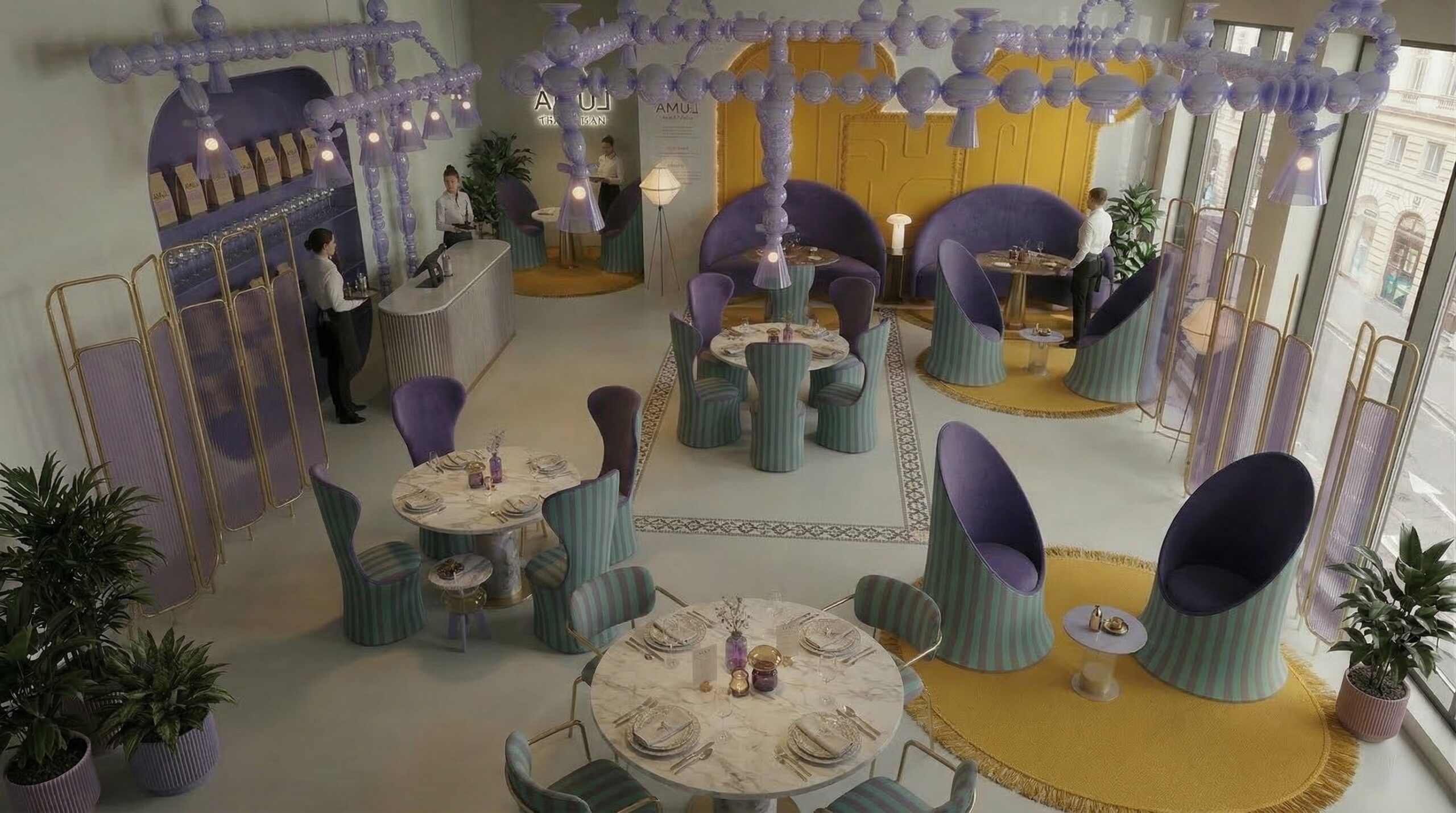 Pastel tonların cesur kontrastlarla birleştiği bu mekân, mor ve sarı renk paletinin güçlü etkisiyle karakteristik ve deneyim odaklı bir atmosfer sunar. Kavisli formlar, nişli yüzeyler ve geometrik duvar desenleri, mekâna hem Art Deco referanslı hem de çağdaş bir kimlik kazandırır.