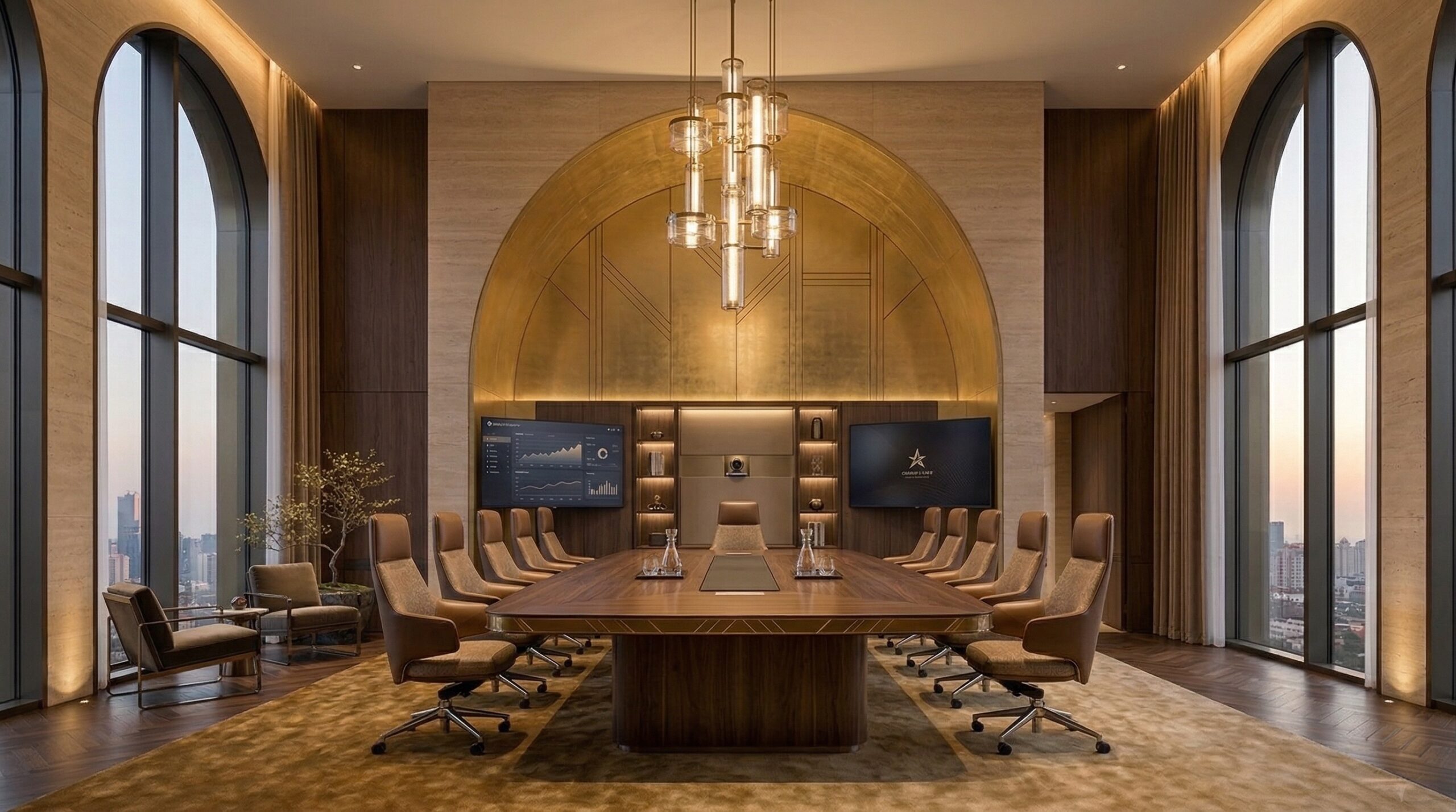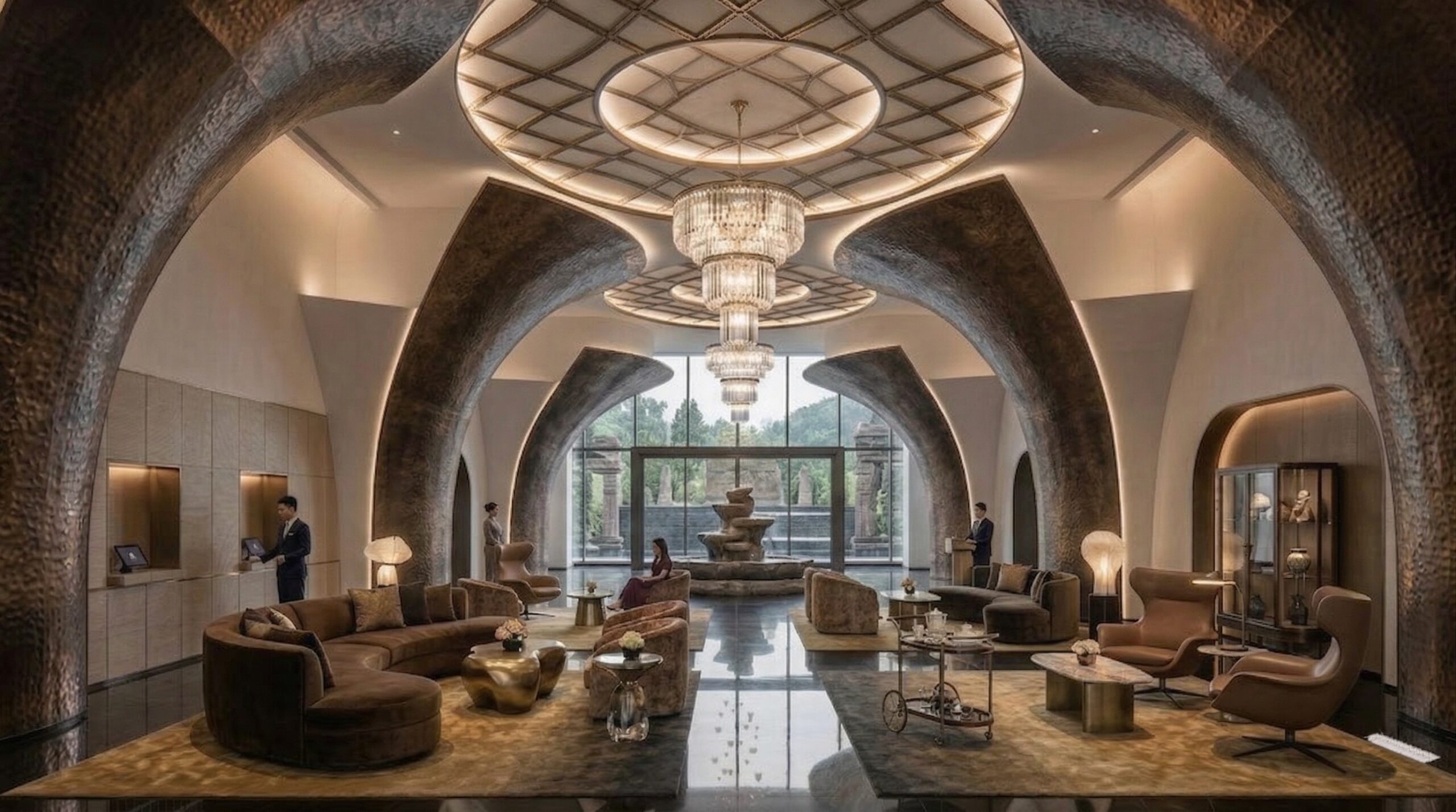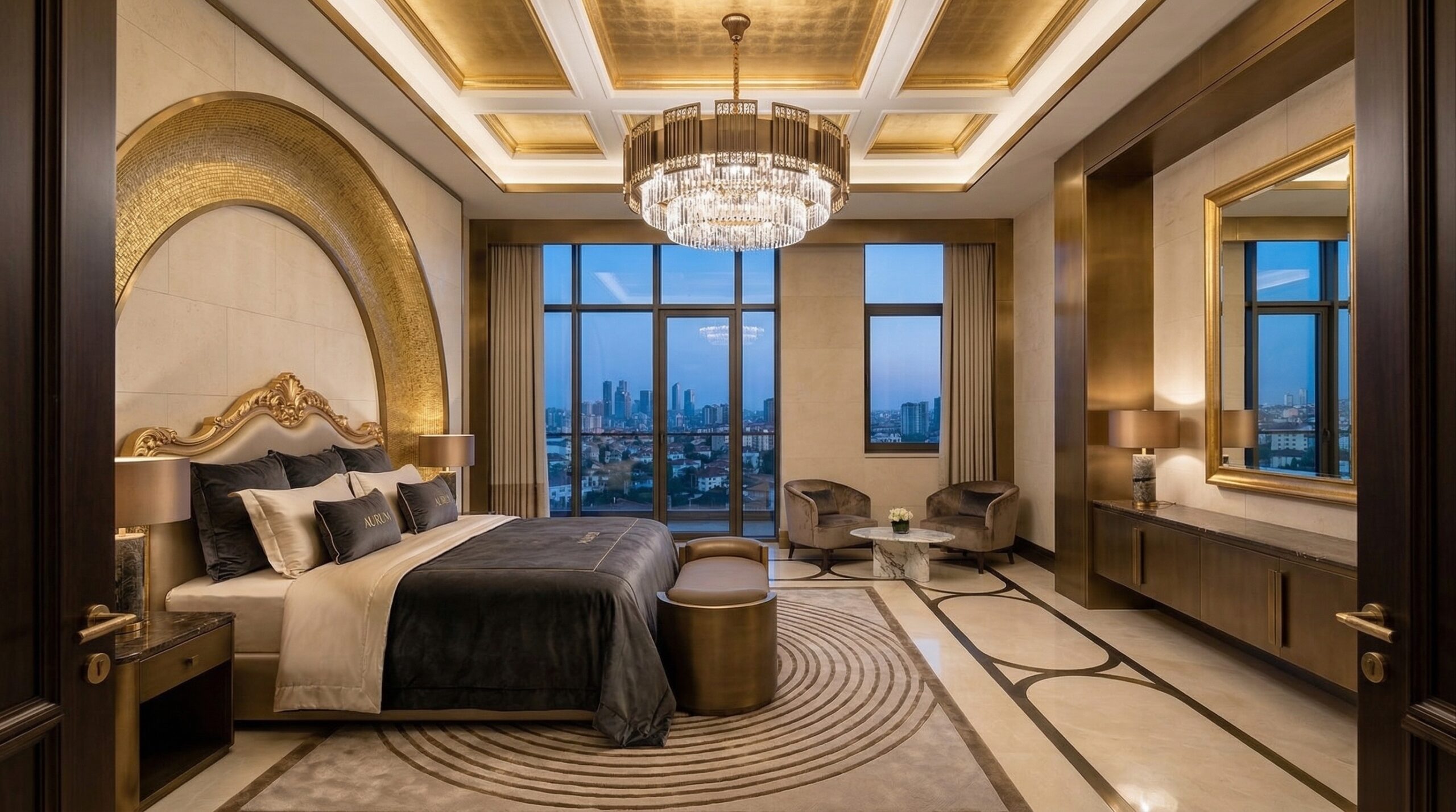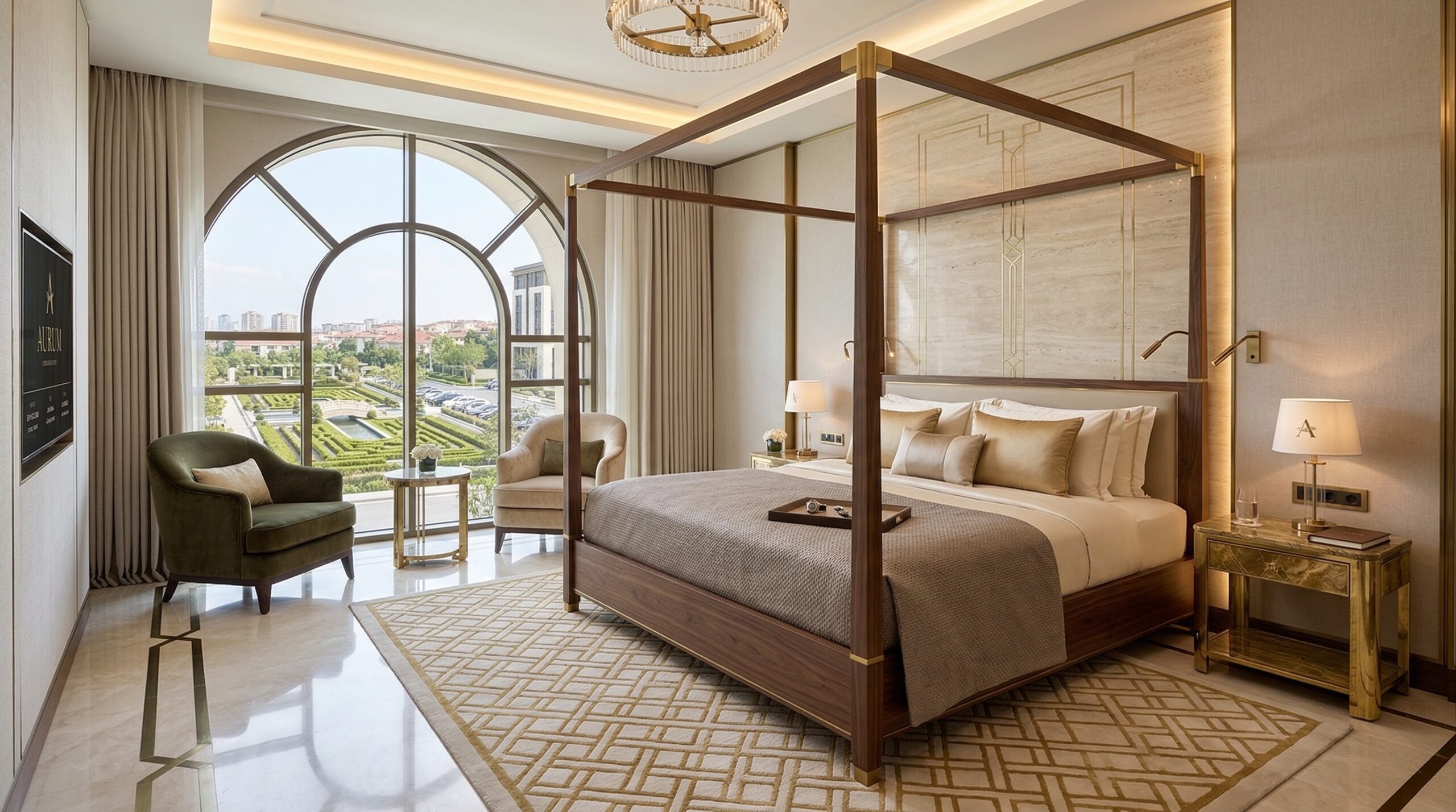 İç mekânda kullanılan doğal taş, altın tonlu detaylar ve yumuşak aydınlatmalar, mekâna rafine bir sıcaklık kazandırırken; kemerli geçişler ve yüksek hacimler mekânsal sürekliliği destekler. Odalarda geniş açıklıklar ve şehir manzarası ön plana çıkarılarak konfor ve görsel deneyim birlikte ele alınır.