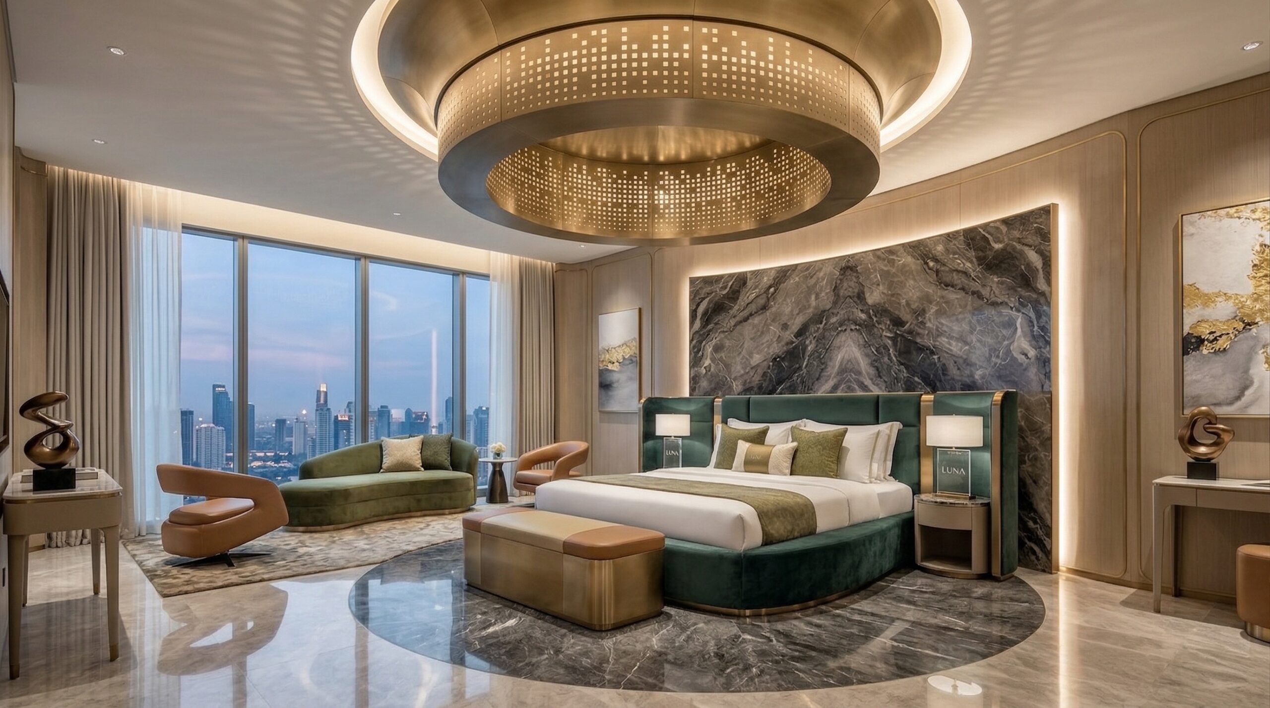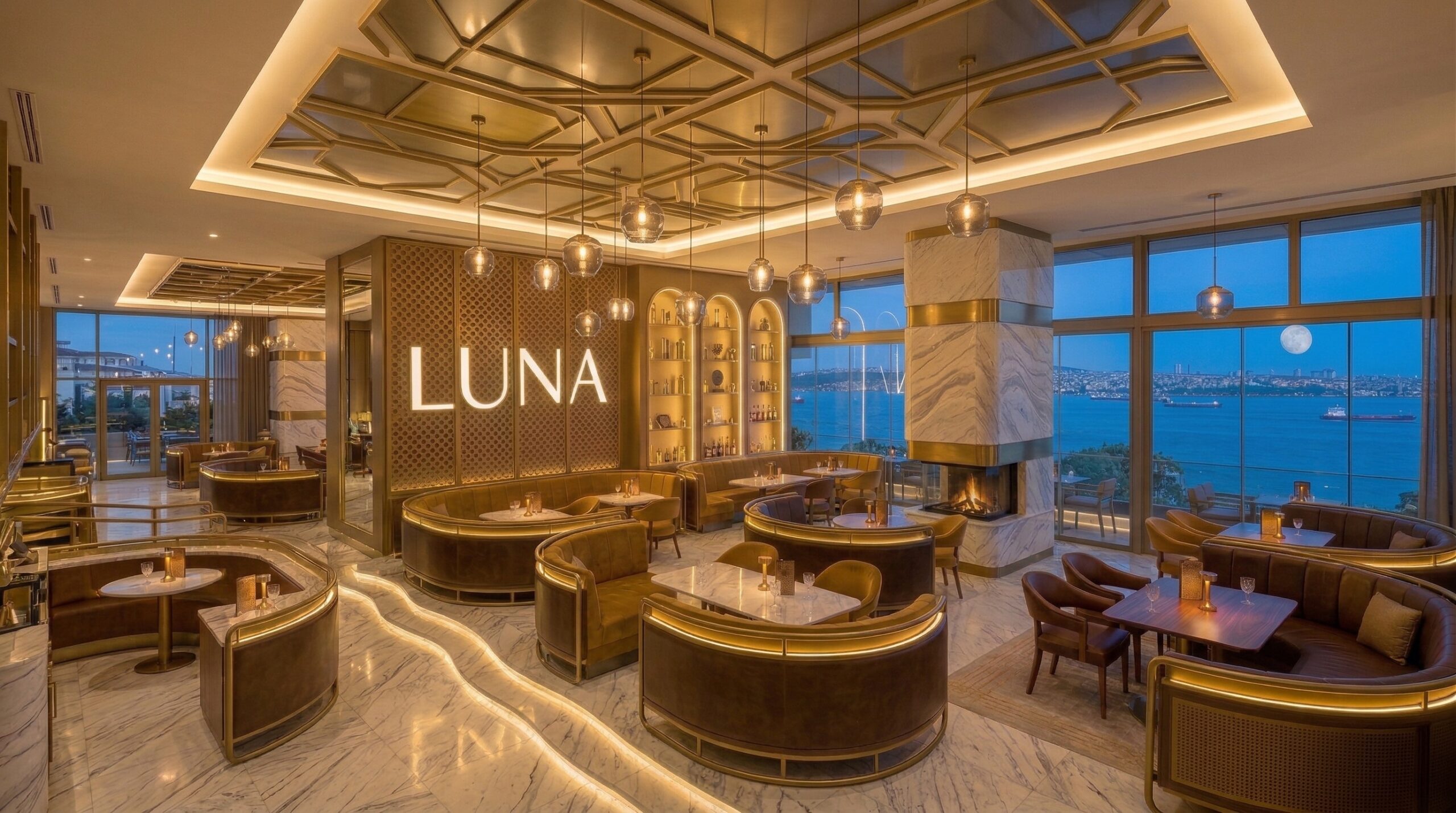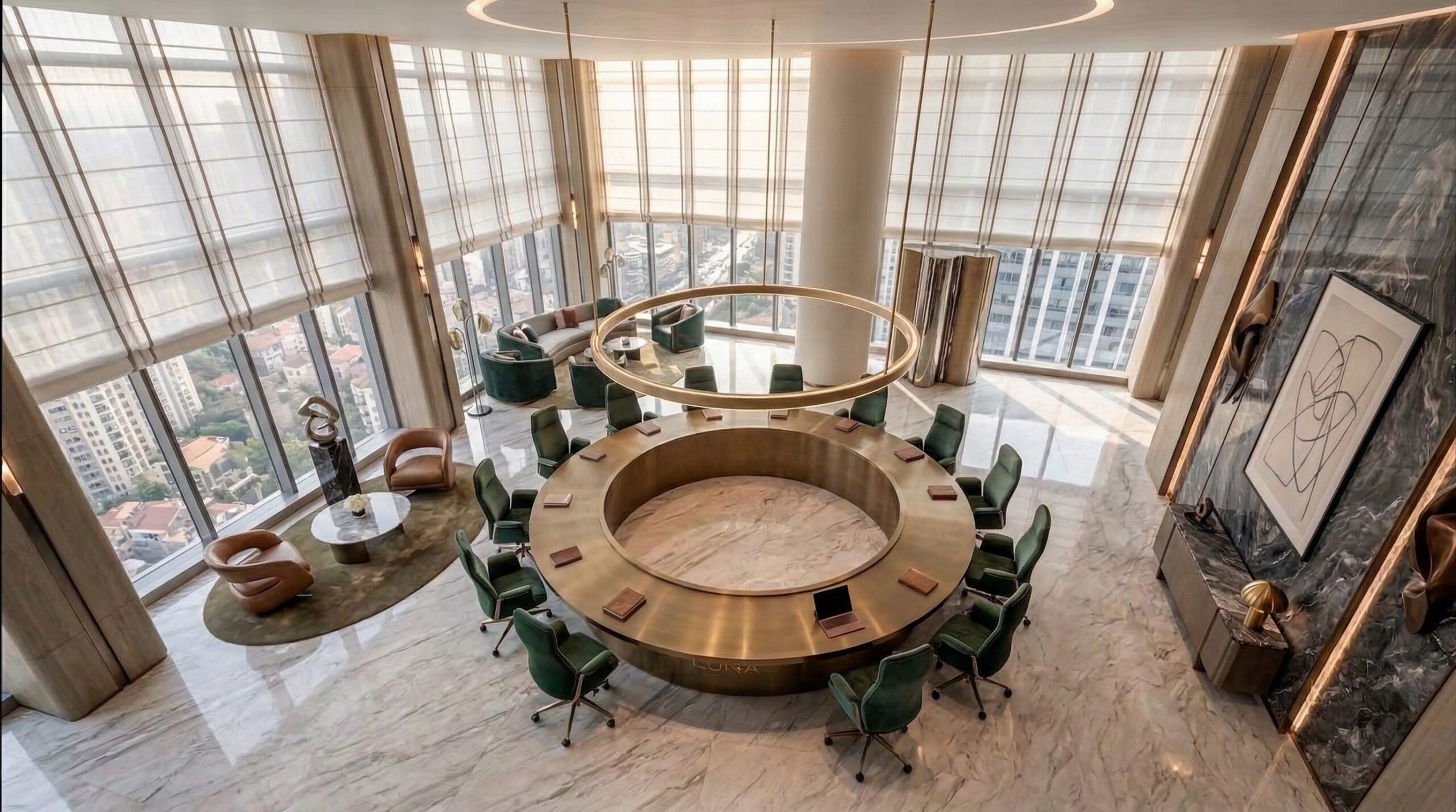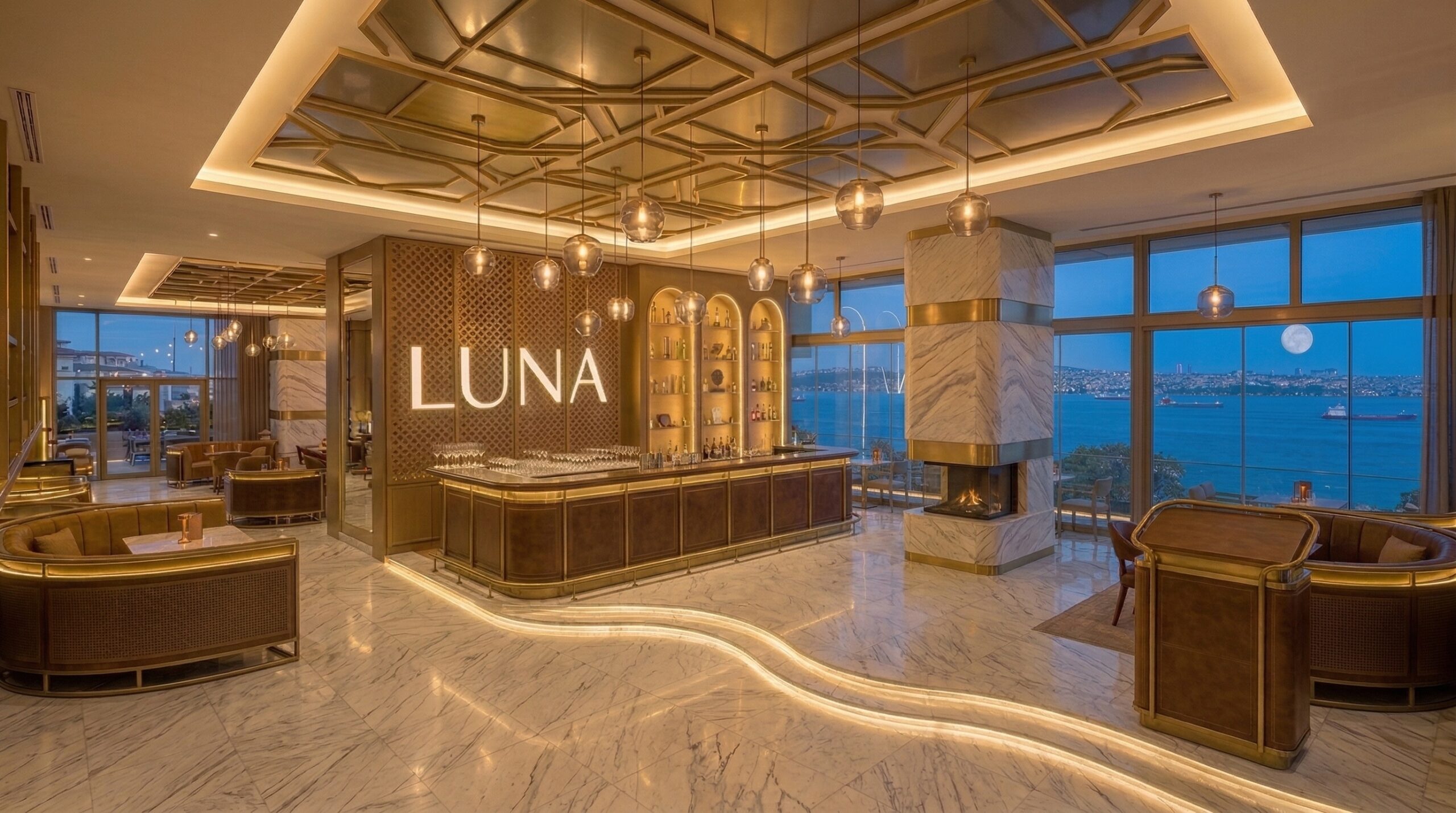 İç mekânda mermer, metal ve sıcak tonlu yüzeylerin dengeli kullanımı; geniş açıklıklar ve doğal ışık ile birleşerek ferah ve prestijli bir atmosfer yaratır. Dairesel aydınlatma elemanları ve akışkan mekânsal organizasyon, kullanıcı deneyimini yönlendirir.