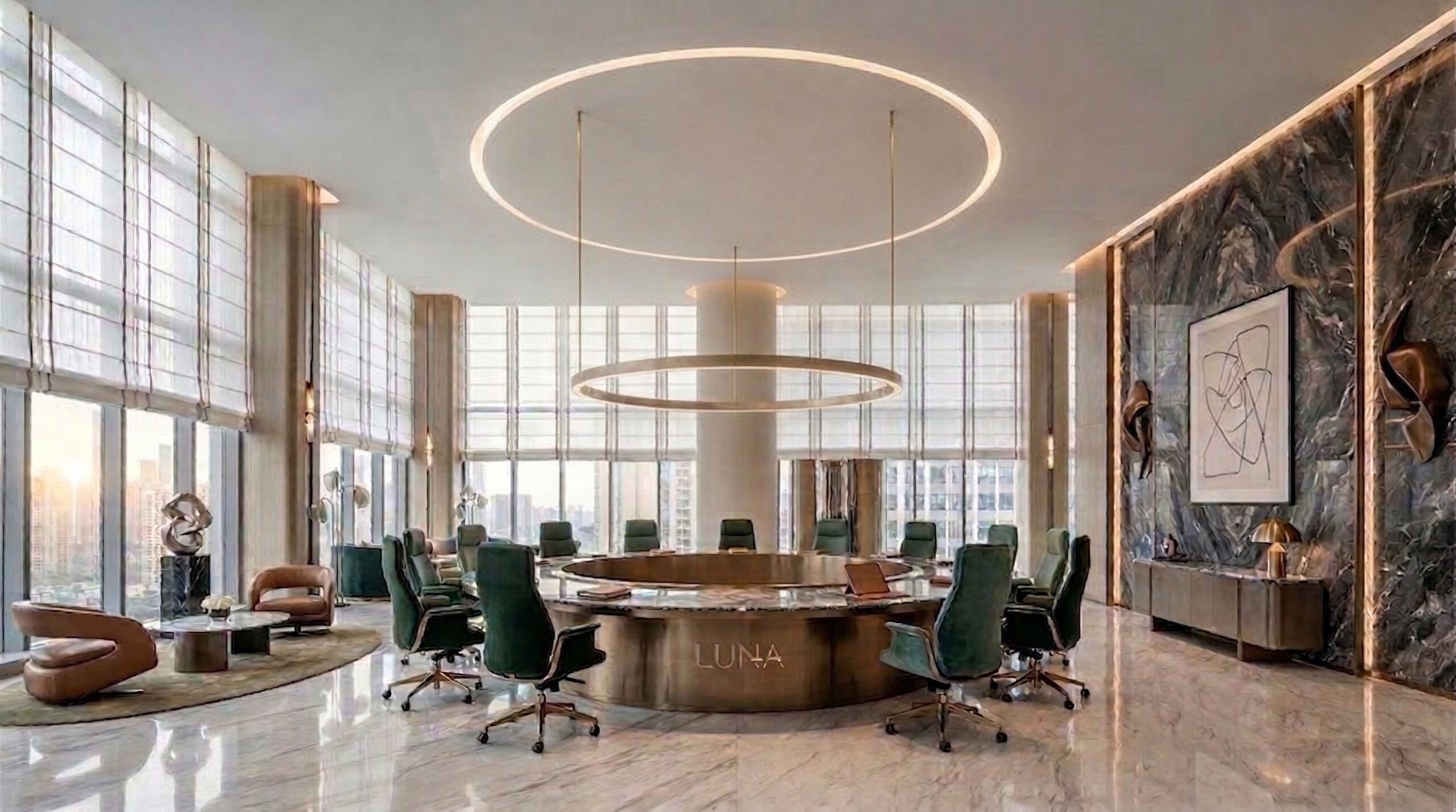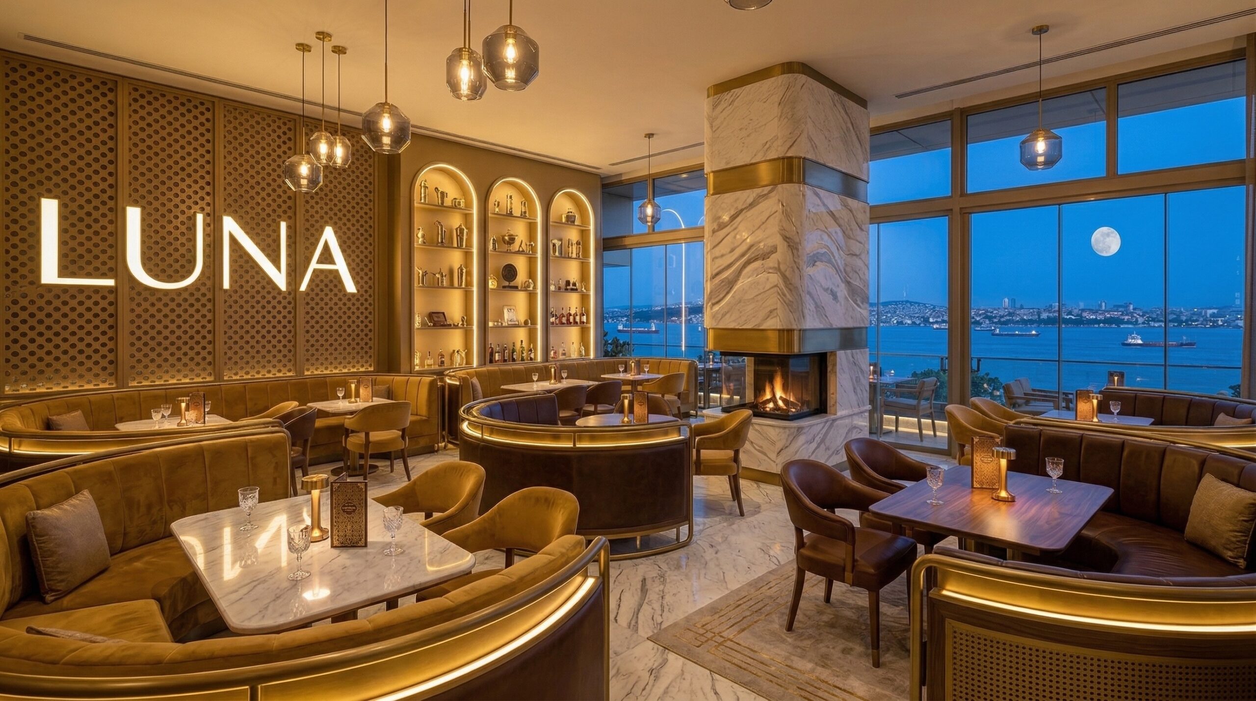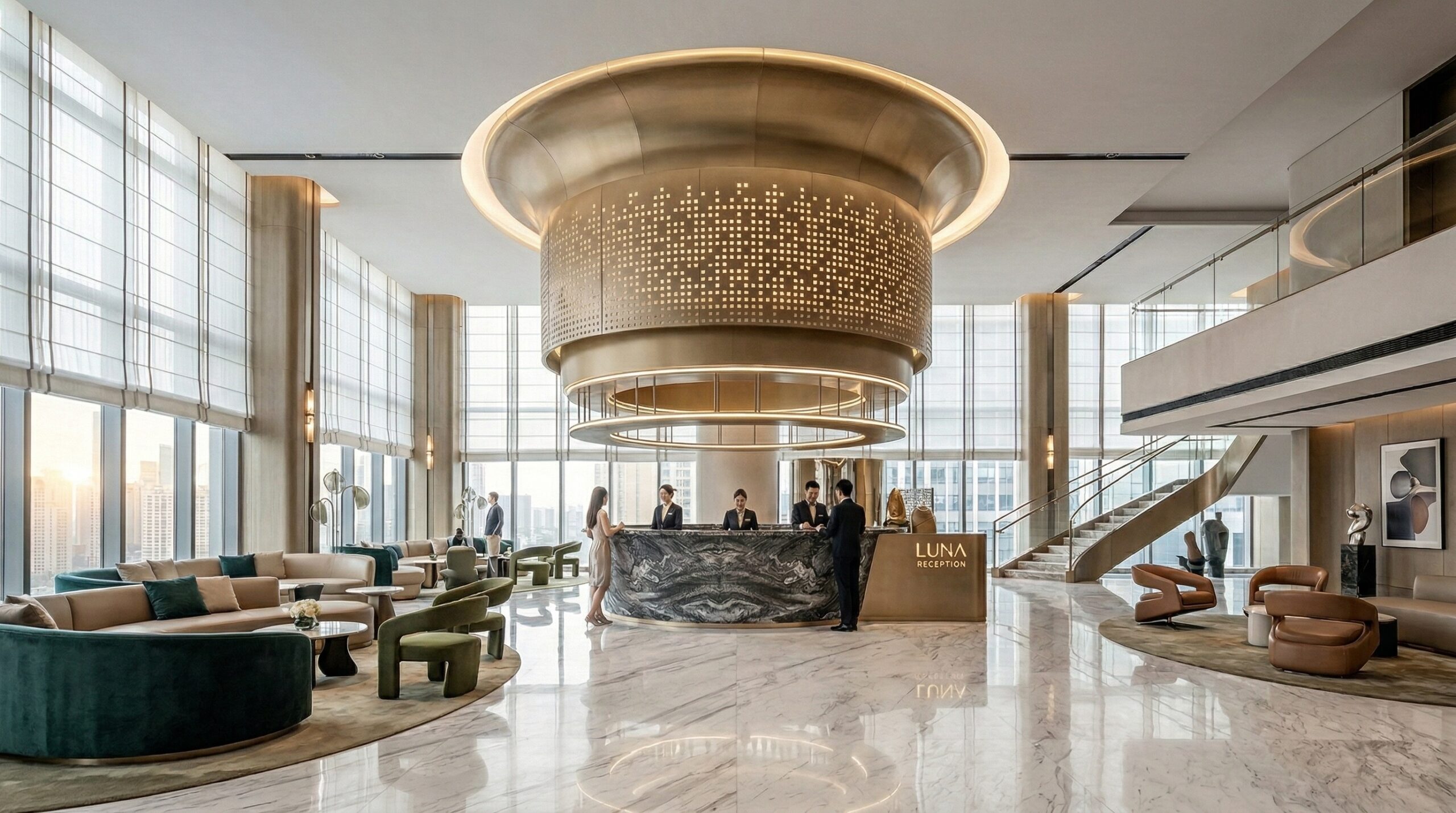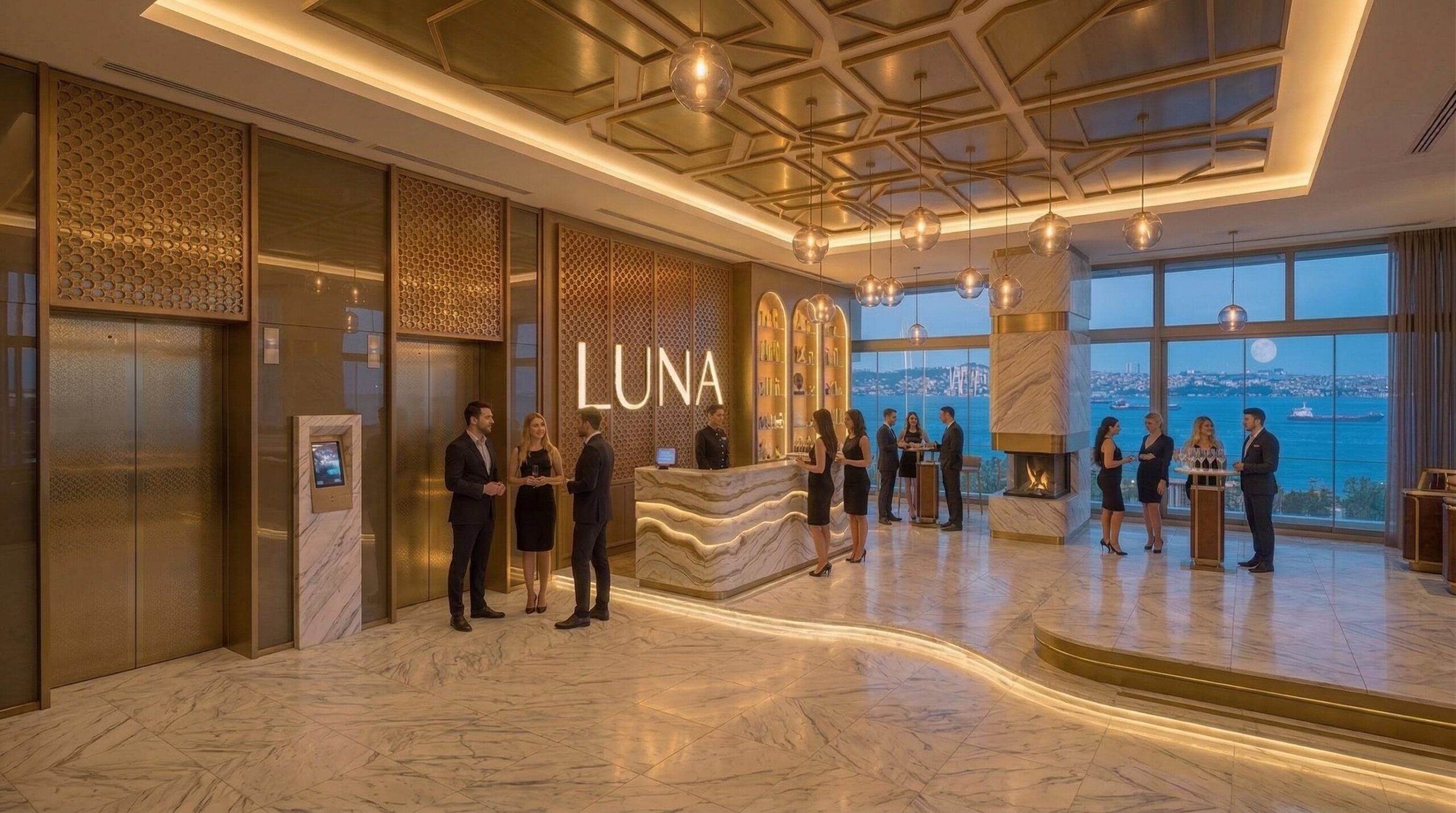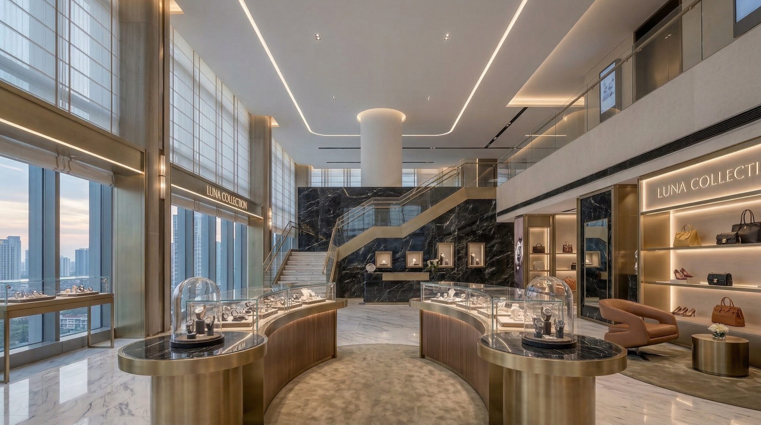 İç mekânda mermer, metal ve sıcak tonlu yüzeylerin dengeli kullanımı; geniş açıklıklar ve doğal ışık ile birleşerek ferah ve prestijli bir atmosfer yaratır. Dairesel aydınlatma elemanları ve akışkan mekânsal organizasyon, kullanıcı deneyimini yönlendirir.