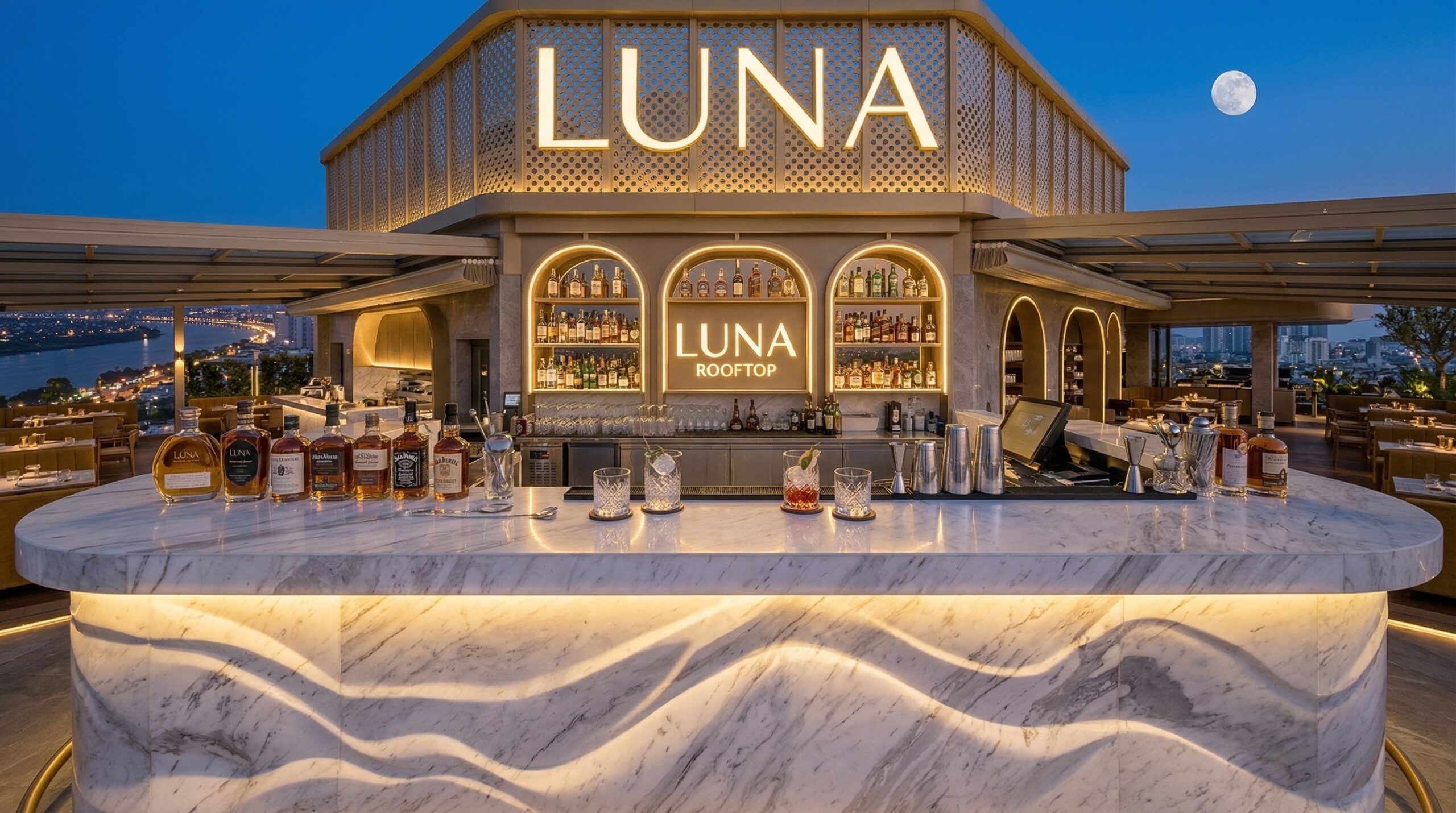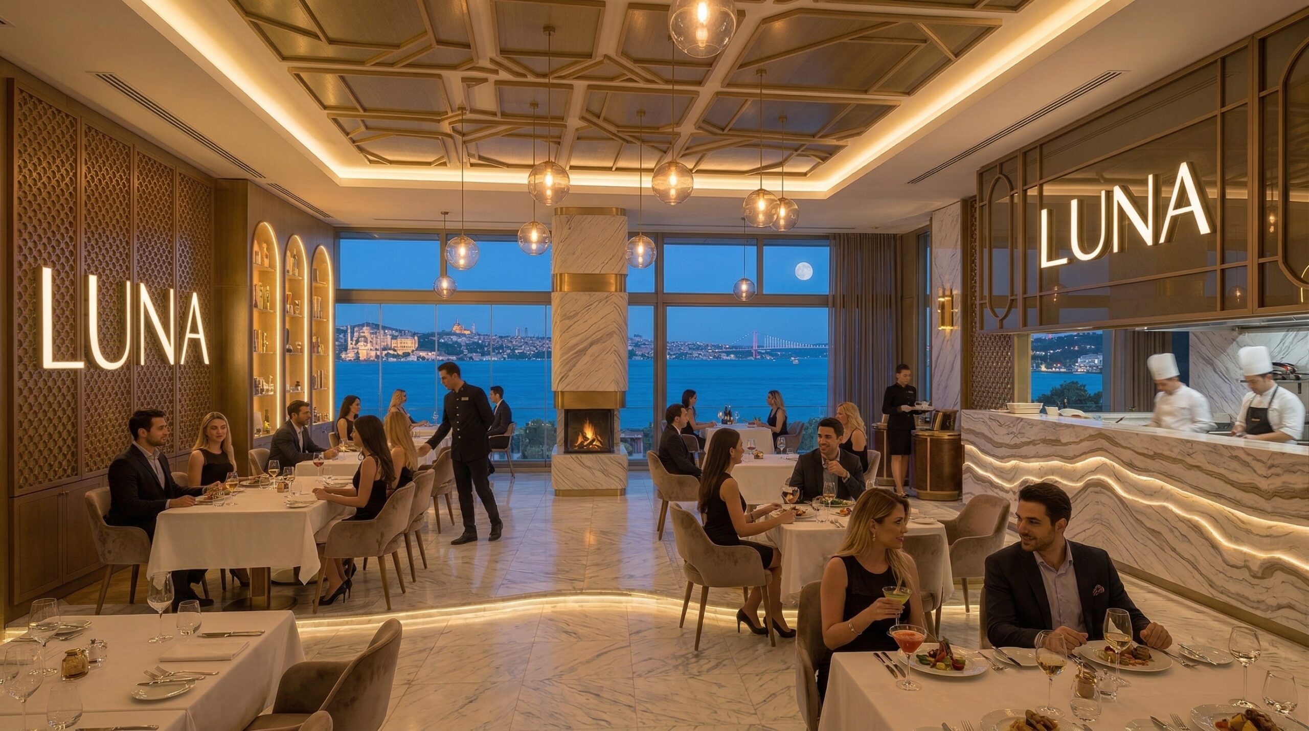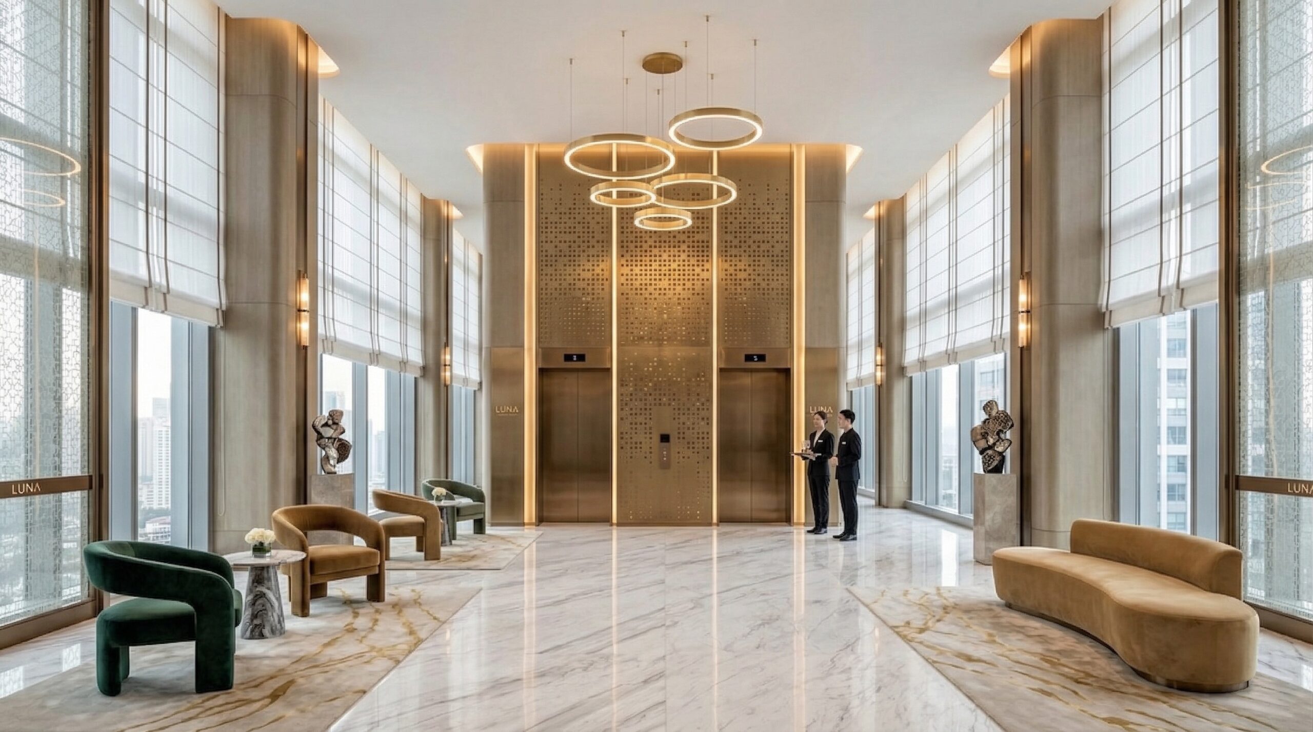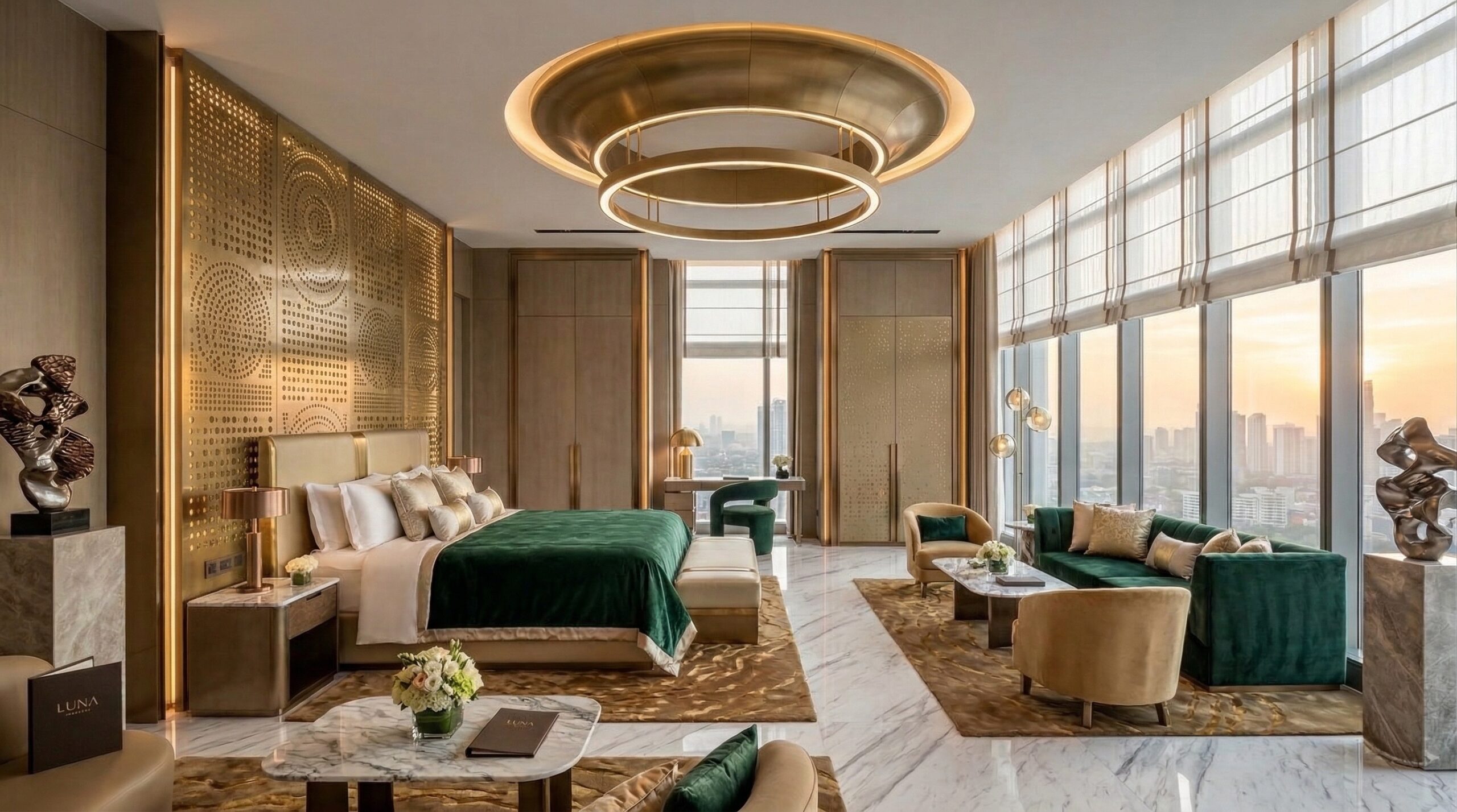 İç mekânda mermer, metal ve sıcak tonlu yüzeylerin dengeli kullanımı; geniş açıklıklar ve doğal ışık ile birleşerek ferah ve prestijli bir atmosfer yaratır. Dairesel aydınlatma elemanları ve akışkan mekânsal organizasyon, kullanıcı deneyimini yönlendirir.