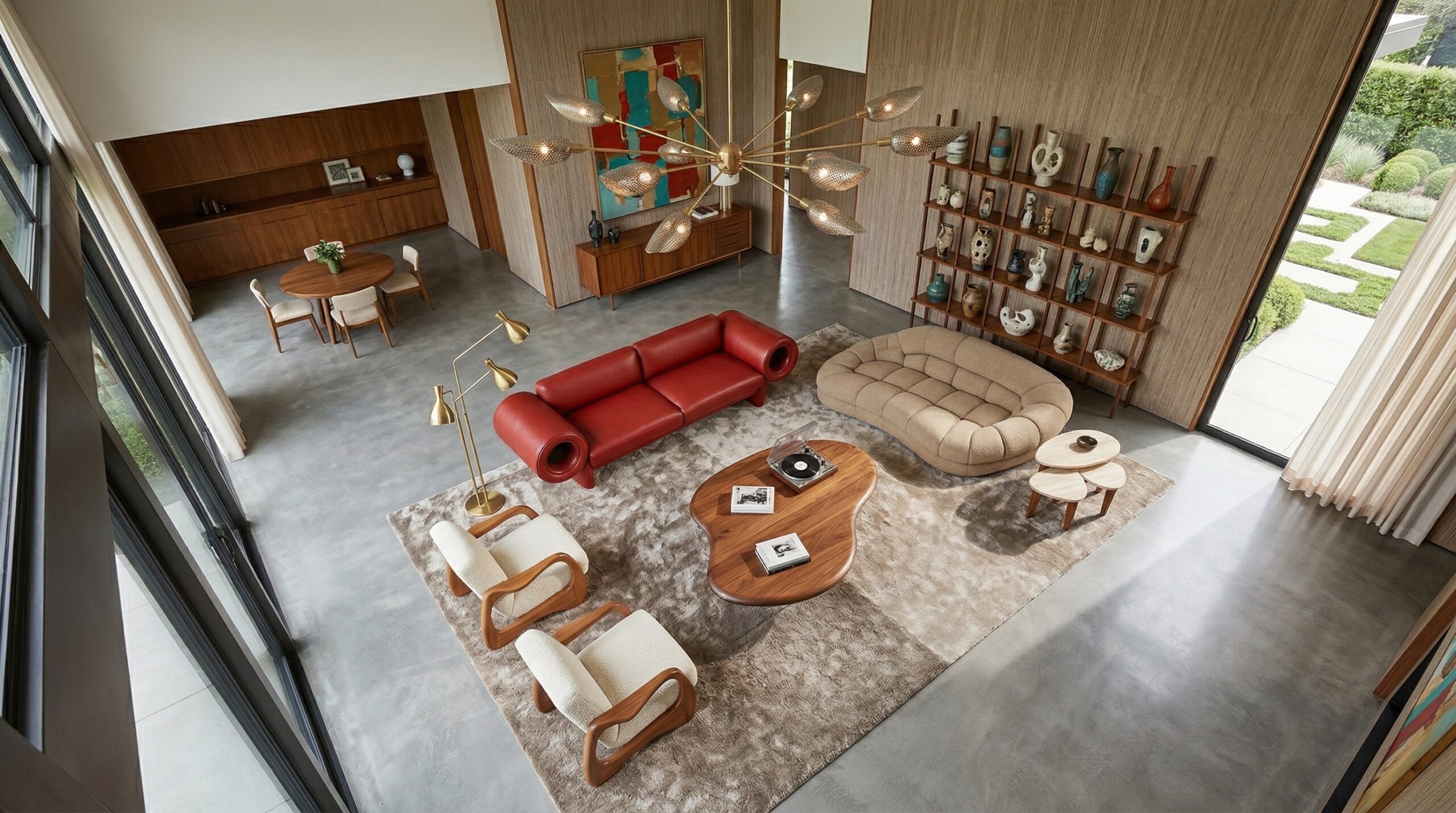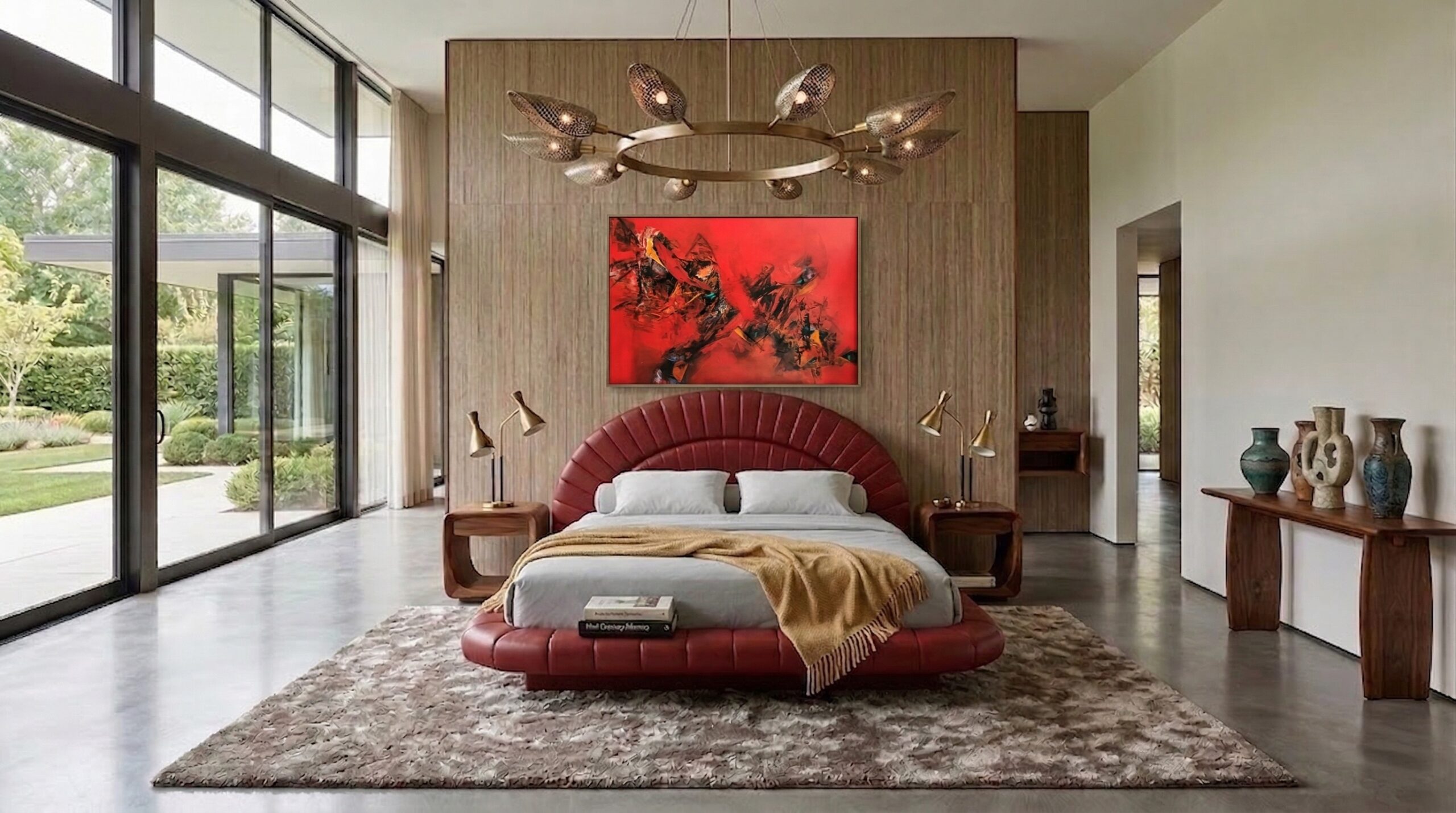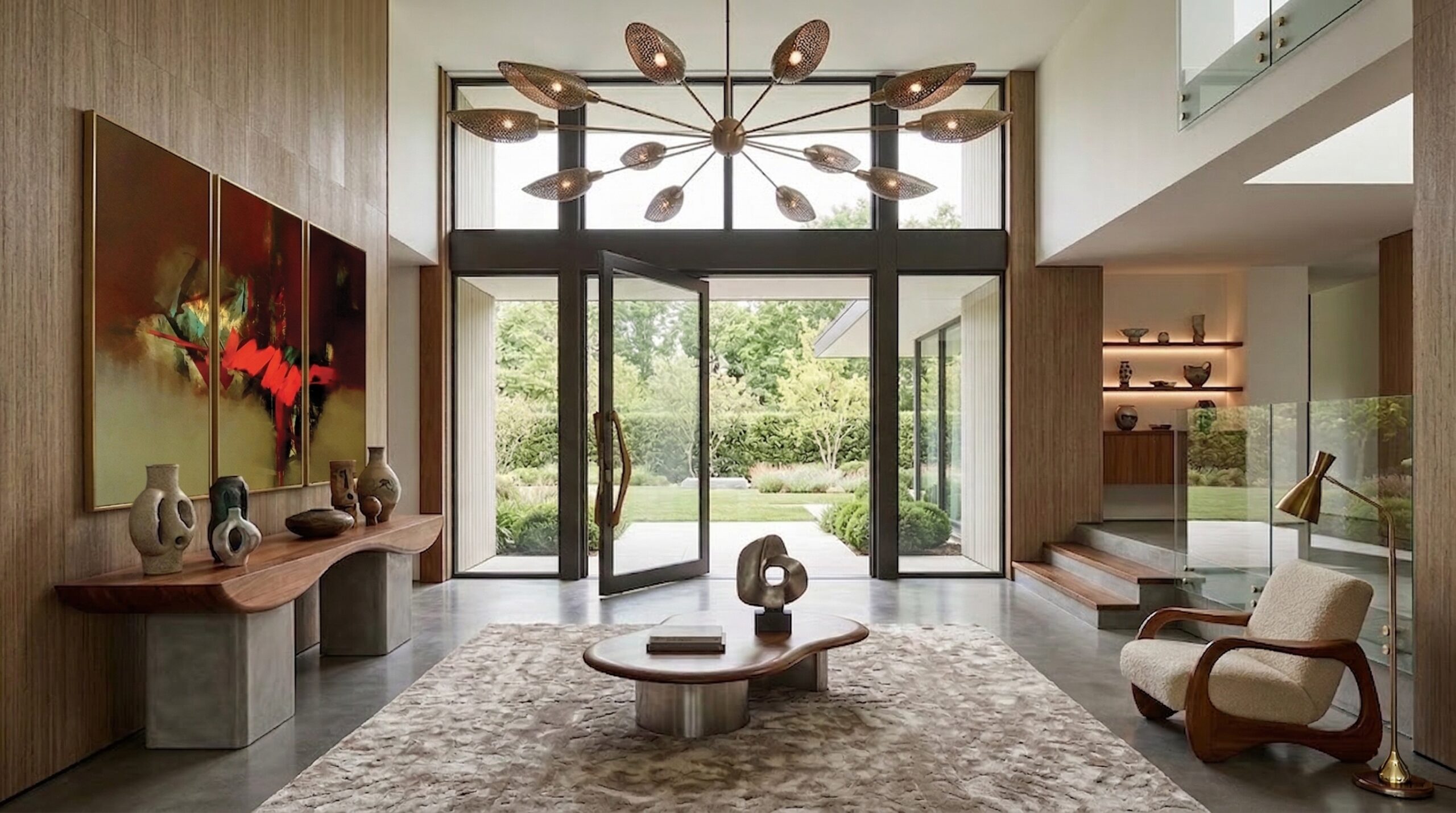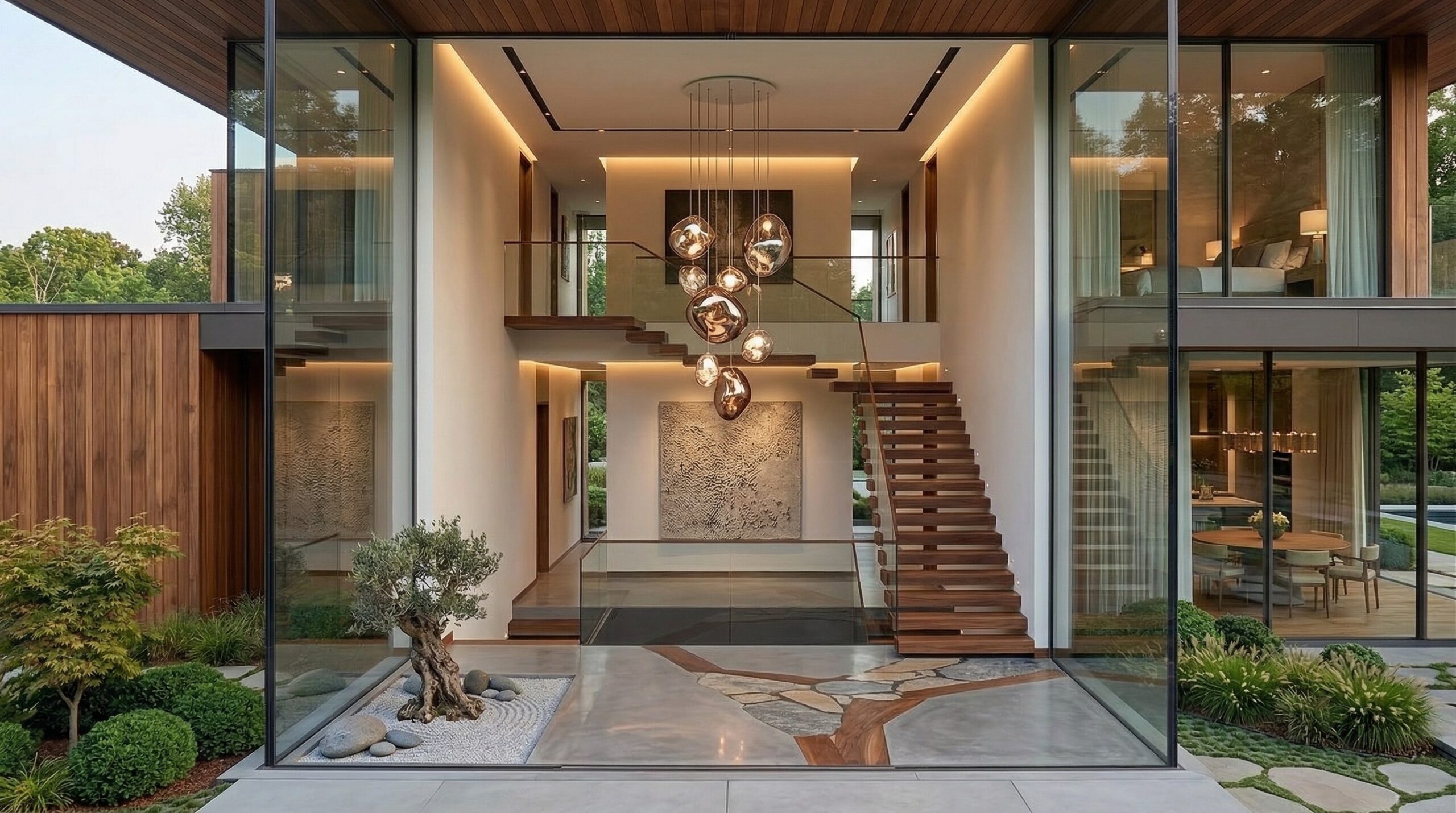 İç mekânda ahşap yüzeyler, doğal taş dokular ve sıcak renk paleti dengeli bir atmosfer oluştururken; kırmızı ve toprak tonlarındaki mobilyalar mekâna karakter kazandırır. Çift hacimli salon ve yüksek tavanlı alanlar, ferah ve davetkâr bir mekânsal deneyim sunar.