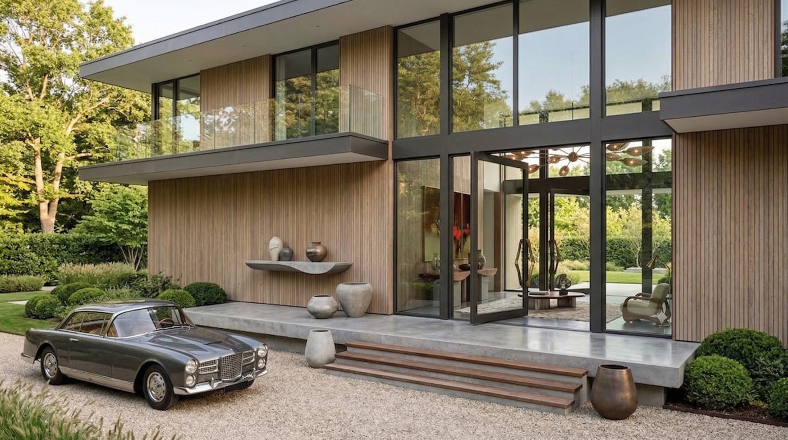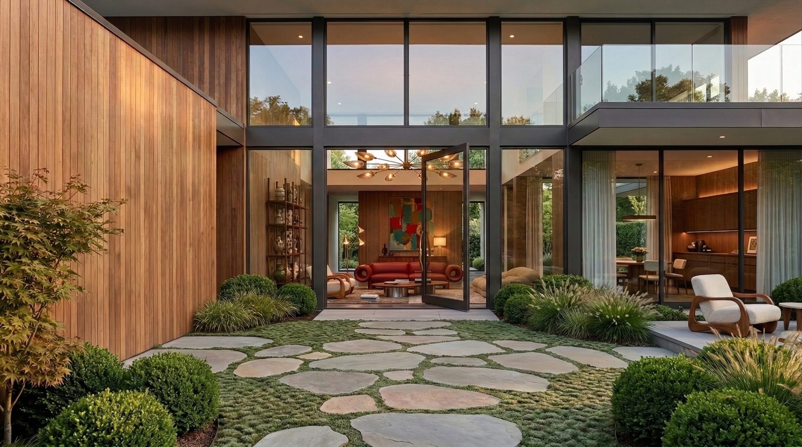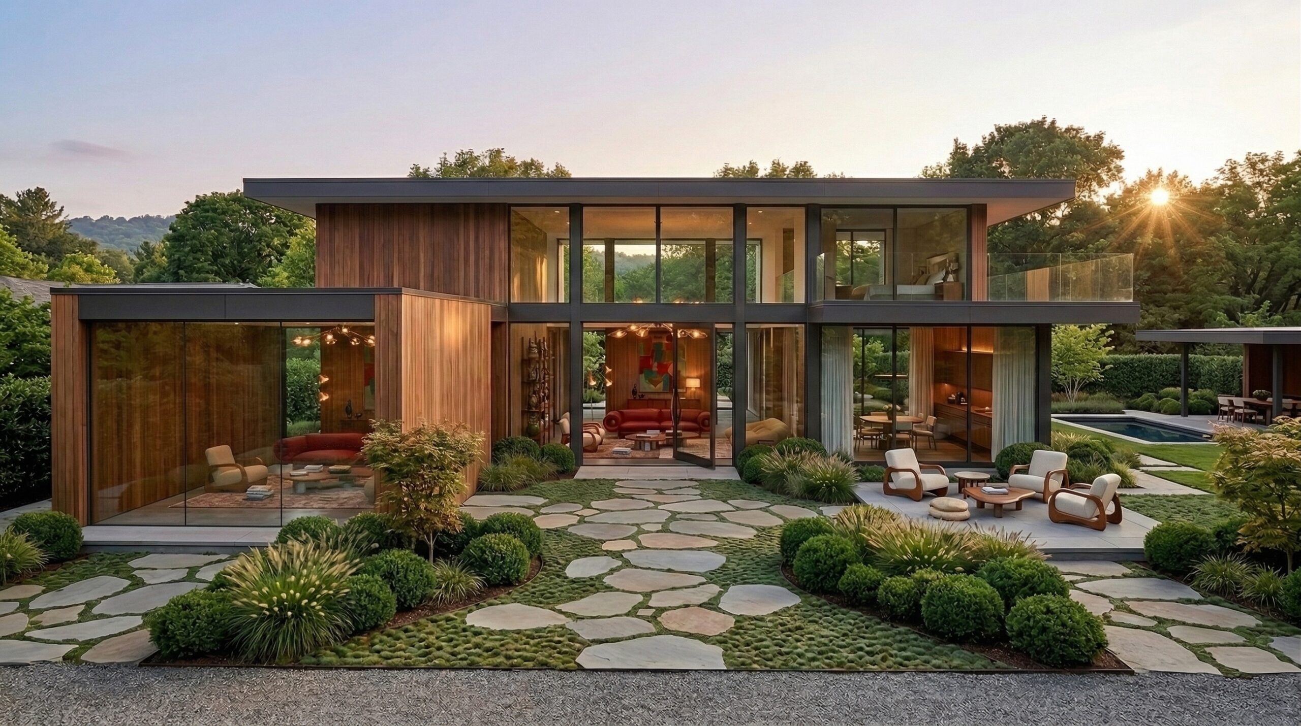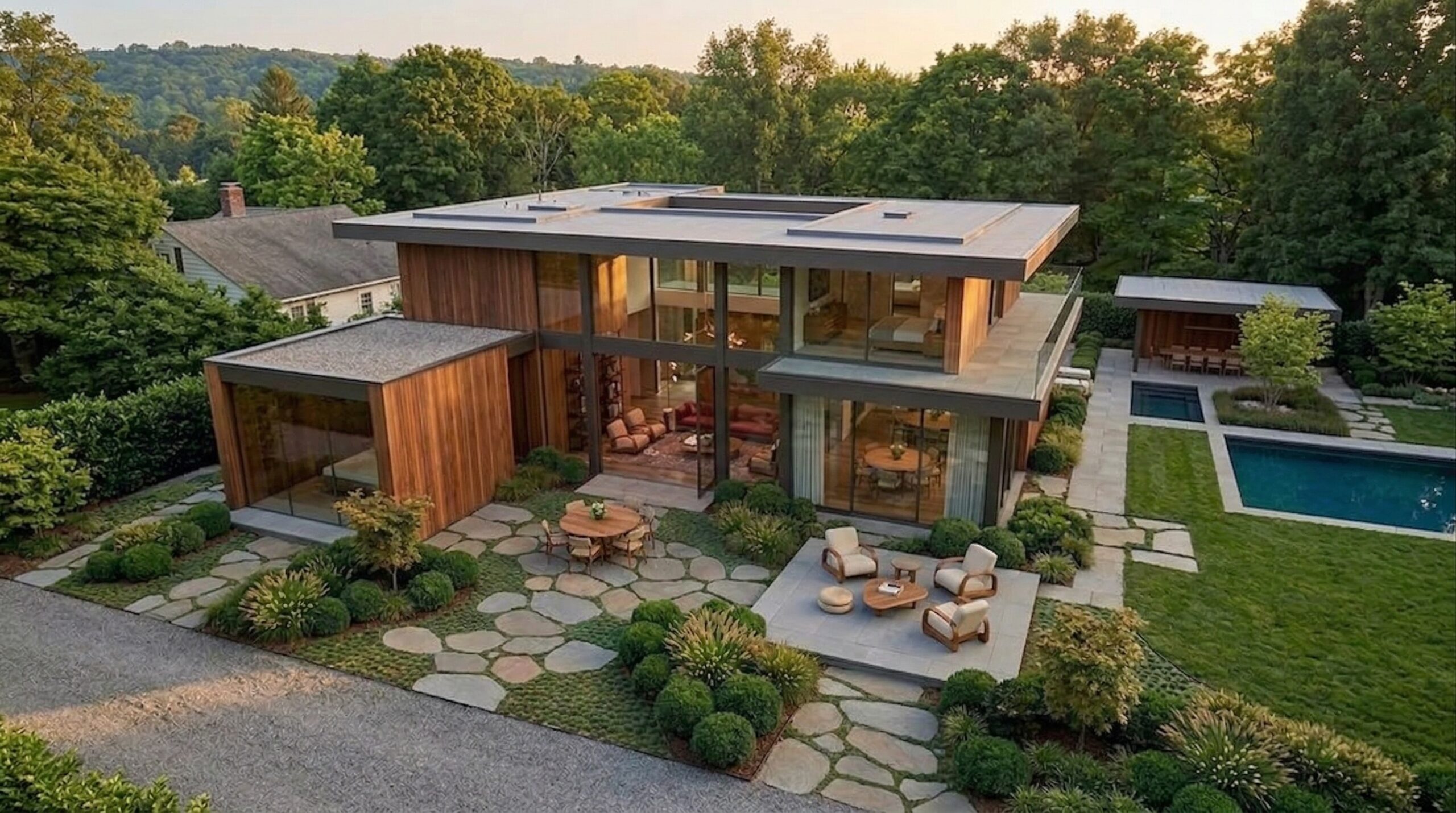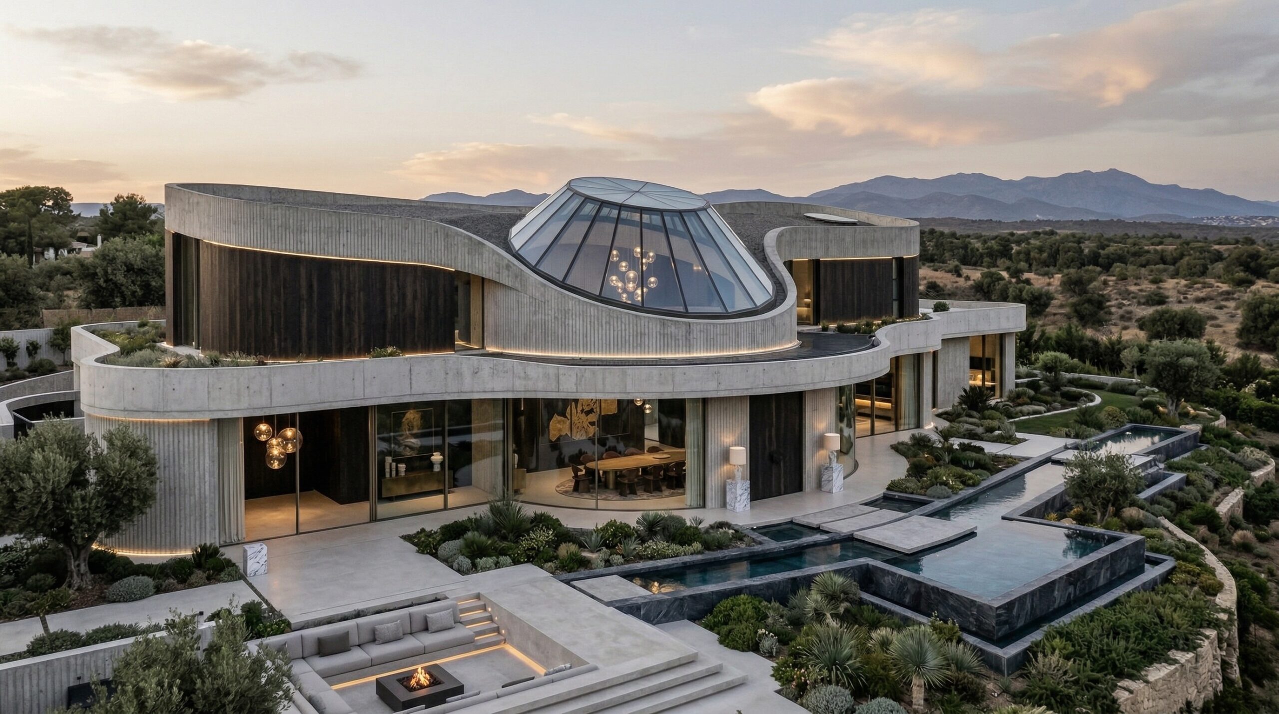 Doğa ile güçlü bir ilişki kuran bu konut tasarımı, yatayda gelişen kütle yapısı ve şeffaf cephe organizasyonu ile iç ve dış mekân arasındaki sınırları ortadan kaldırır. Geniş cam yüzeyler ve sürgülü açıklıklar sayesinde yaşam alanları bahçe ve havuz ile bütünleşir.
