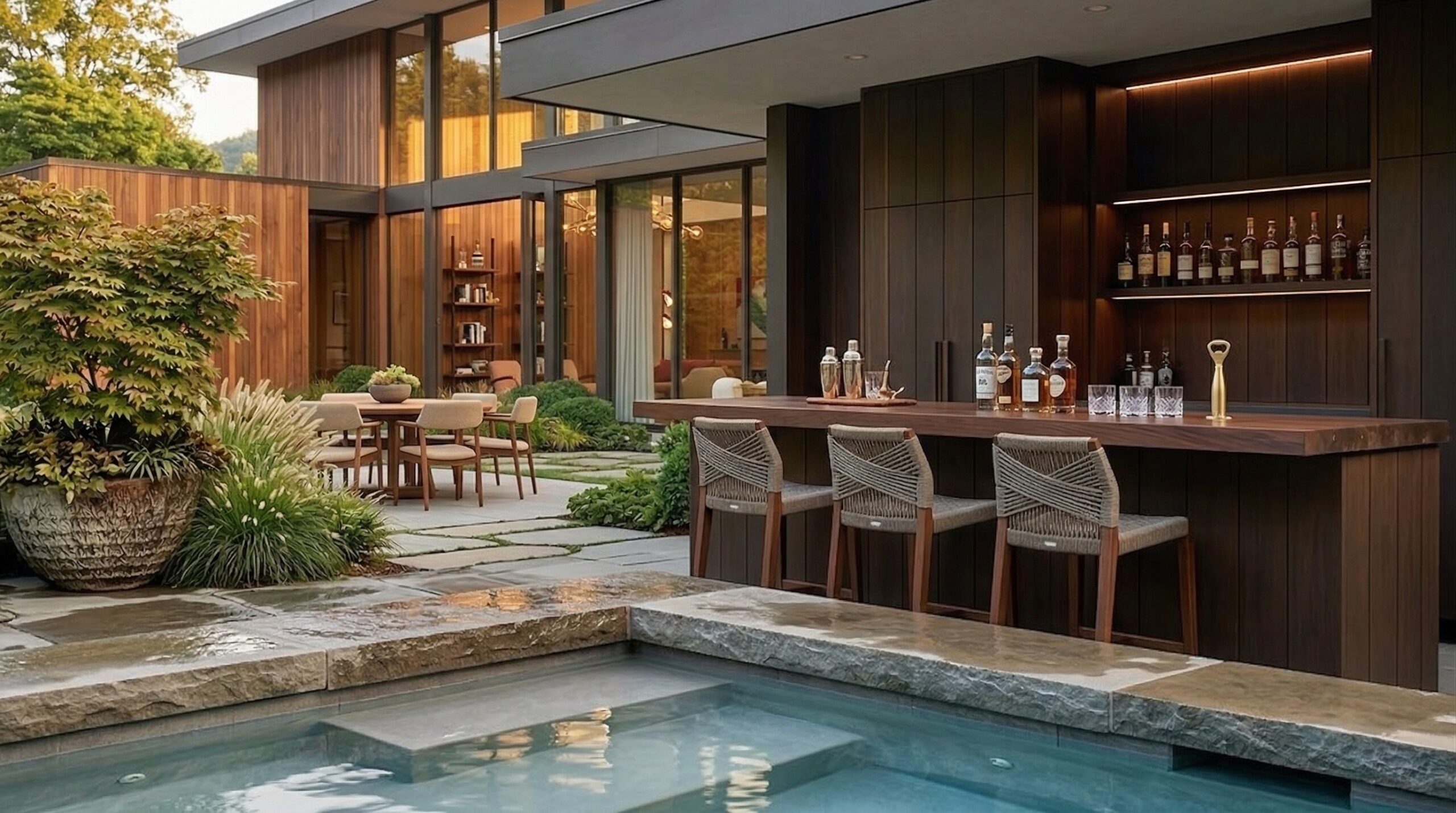 Açık plan kurgusu ile oturma, yemek ve mutfak alanları birbirine akışkan biçimde bağlanırken; dış mekânda konumlanan bar ve oturma alanları sosyal yaşamı destekleyen önemli bir odak oluşturur. Tasarım, çağdaş yaşam alışkanlıklarını doğa ile bütünleştiren sıcak ve zamansız bir konut anlayışı sunar.