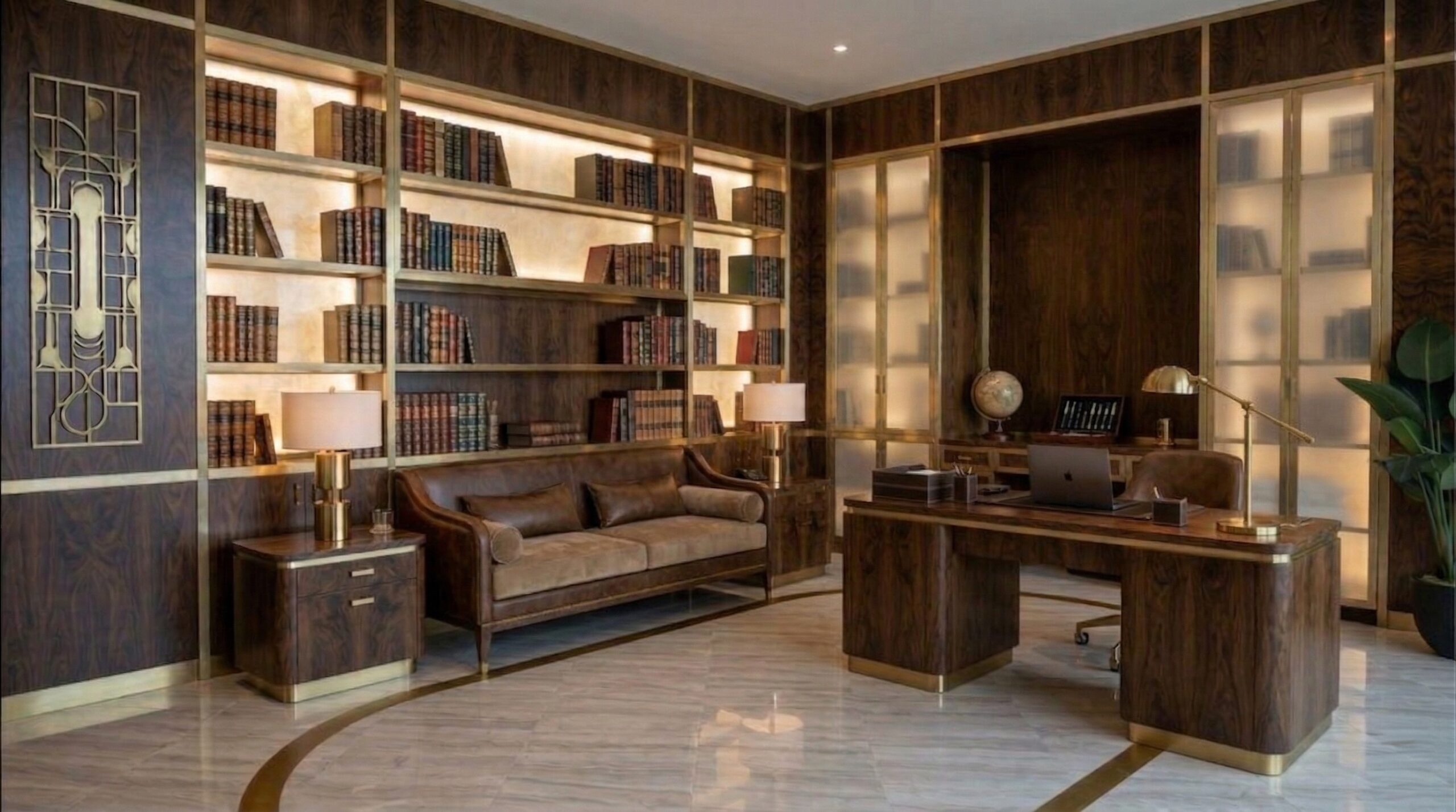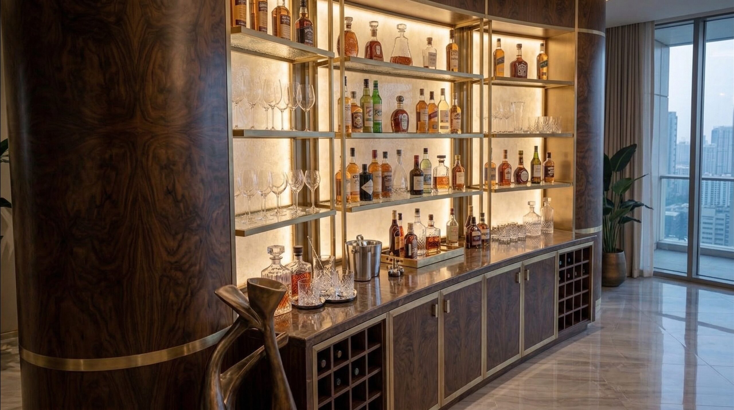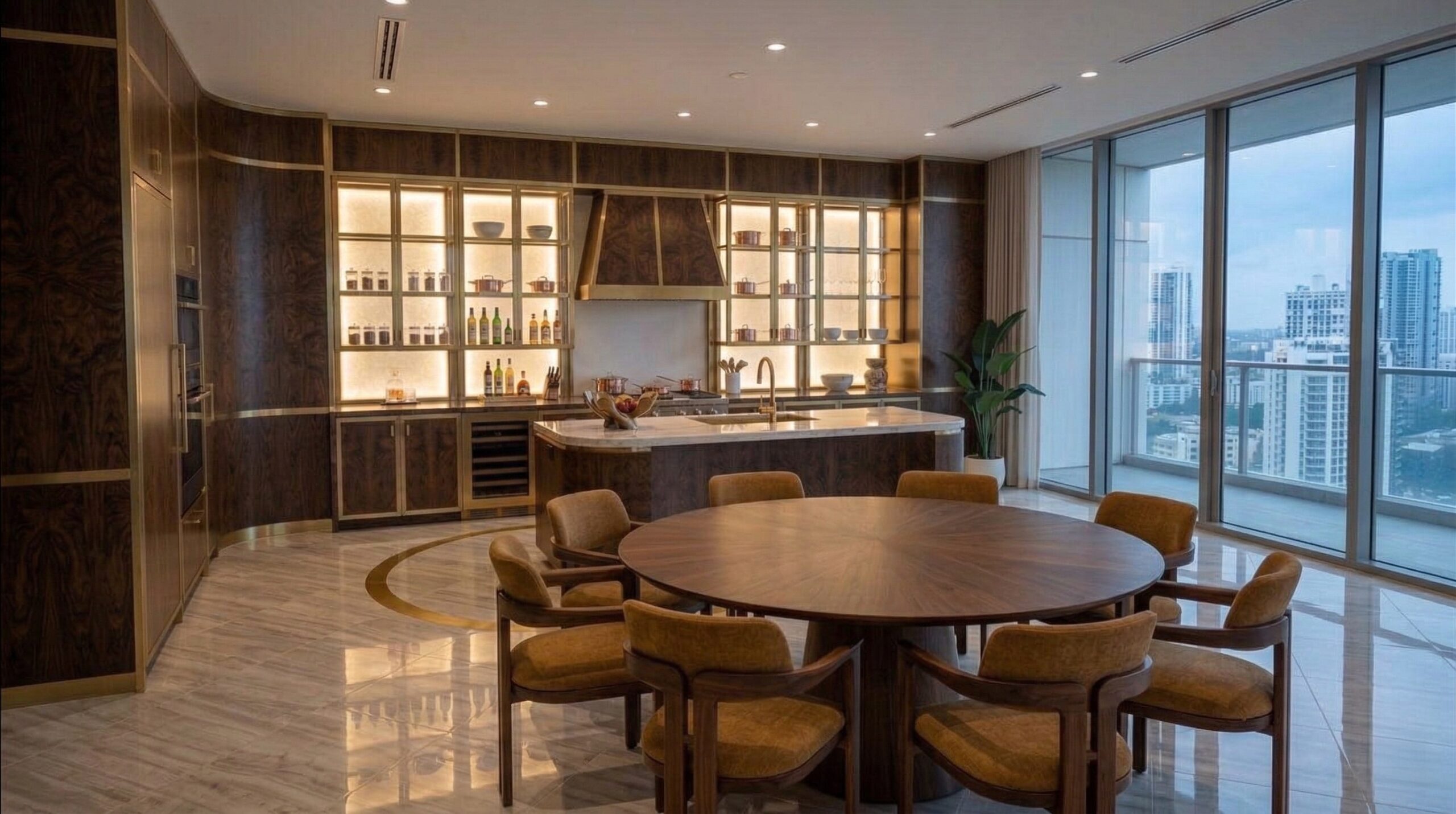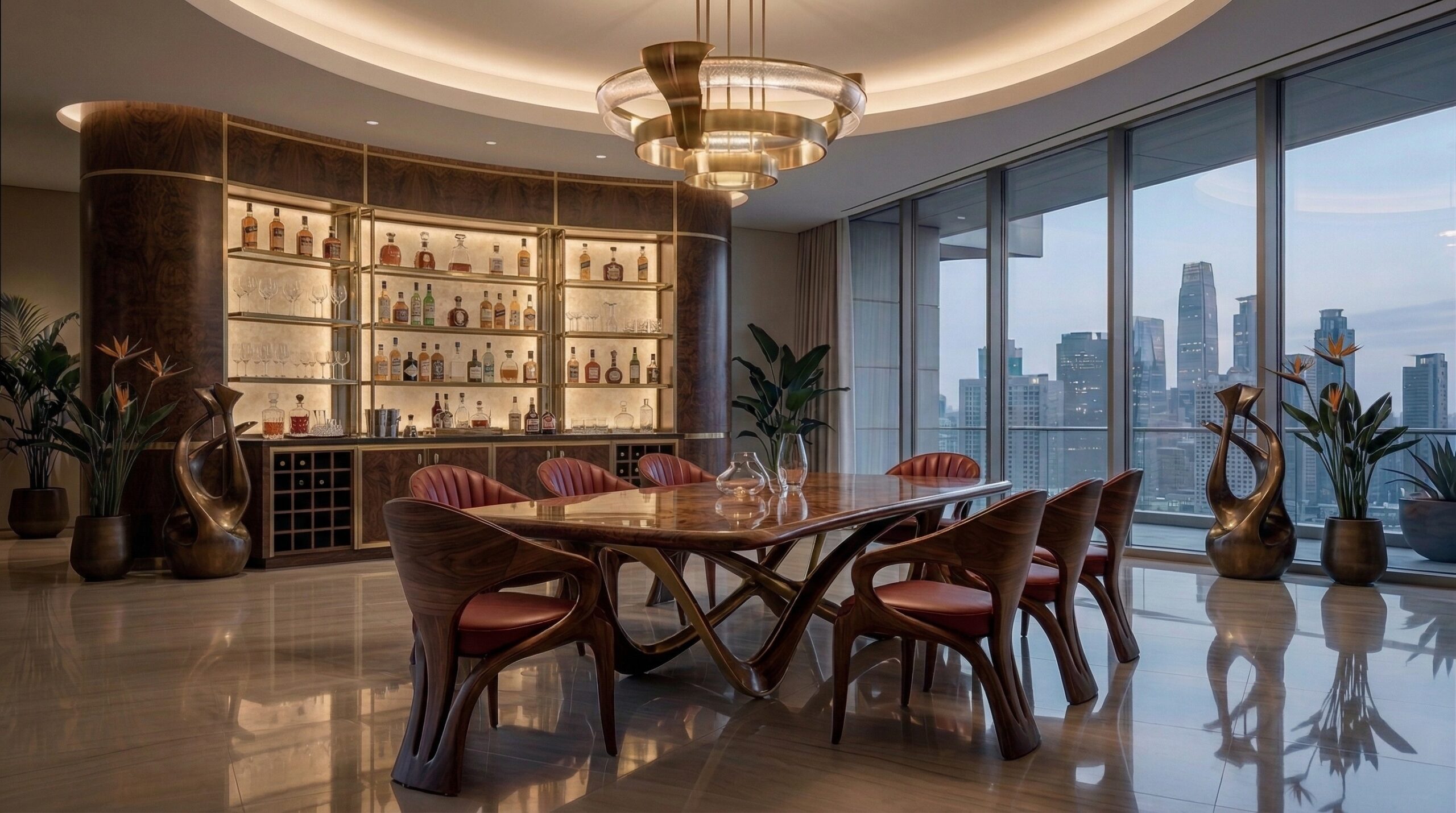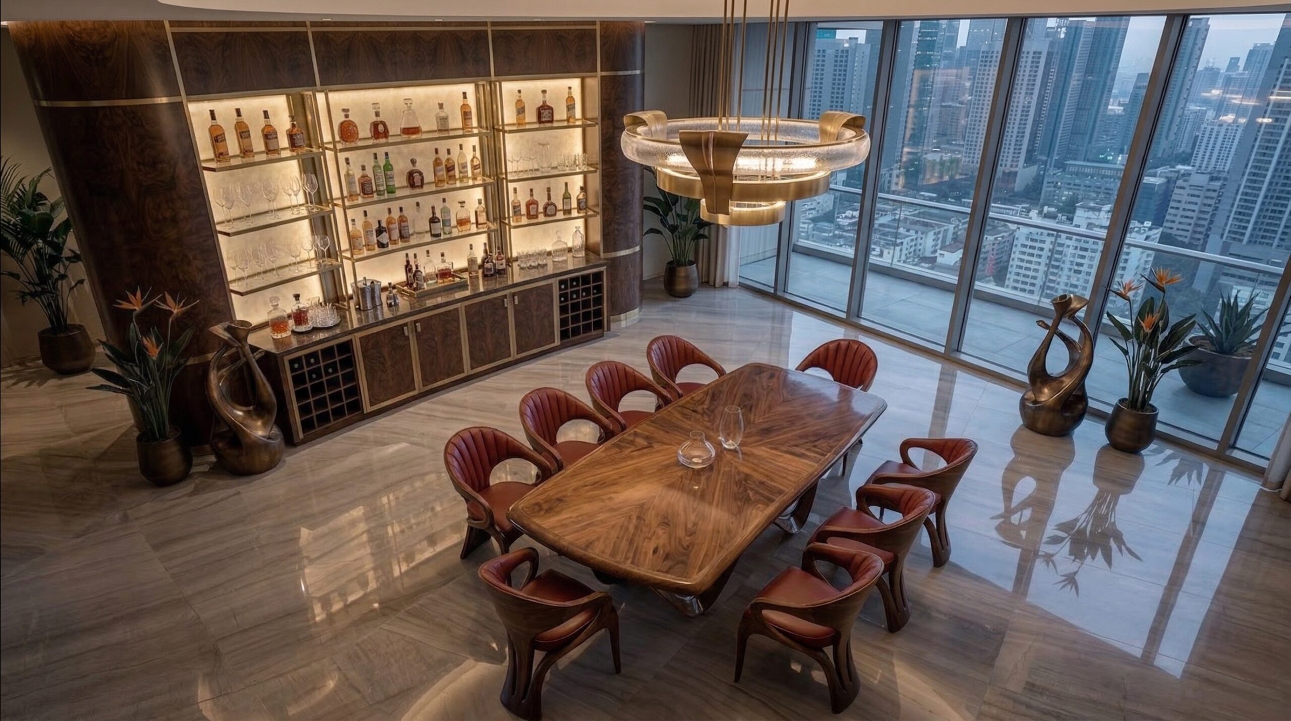 Mermer zeminler, koyu ahşap kaplamalar ve altın tonlu detaylar lüks hissini pekiştirirken; kıvrımlı deri koltuklar, özel tasarım yemek masası ve bütünleşik bar ünitesi mekânda güçlü bir karakter oluşturur. Aydınlatma elemanları ve vitrin sistemleri, mekânın prestijli atmosferini destekleyen önemli tasarım bileşenleri olarak öne çıkar.