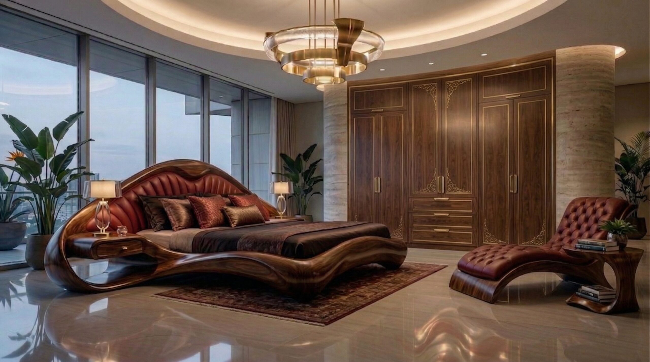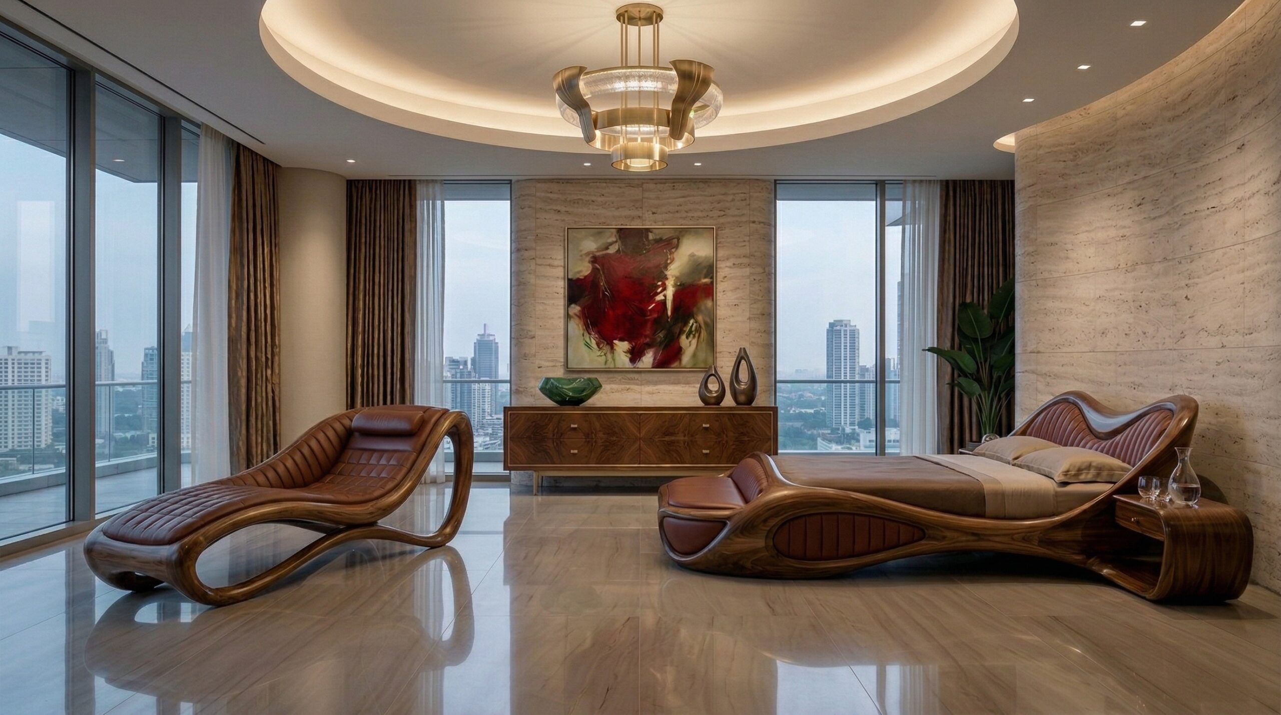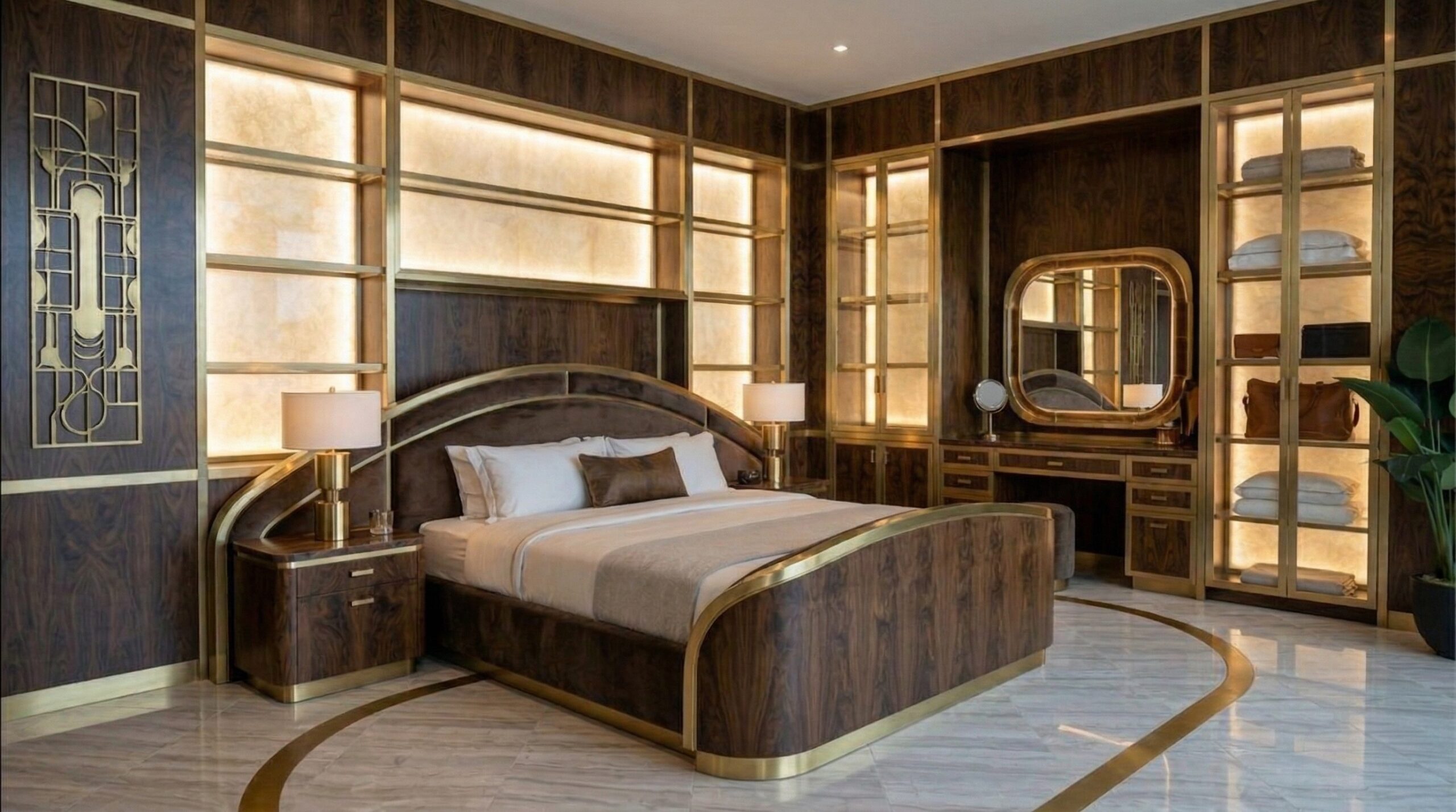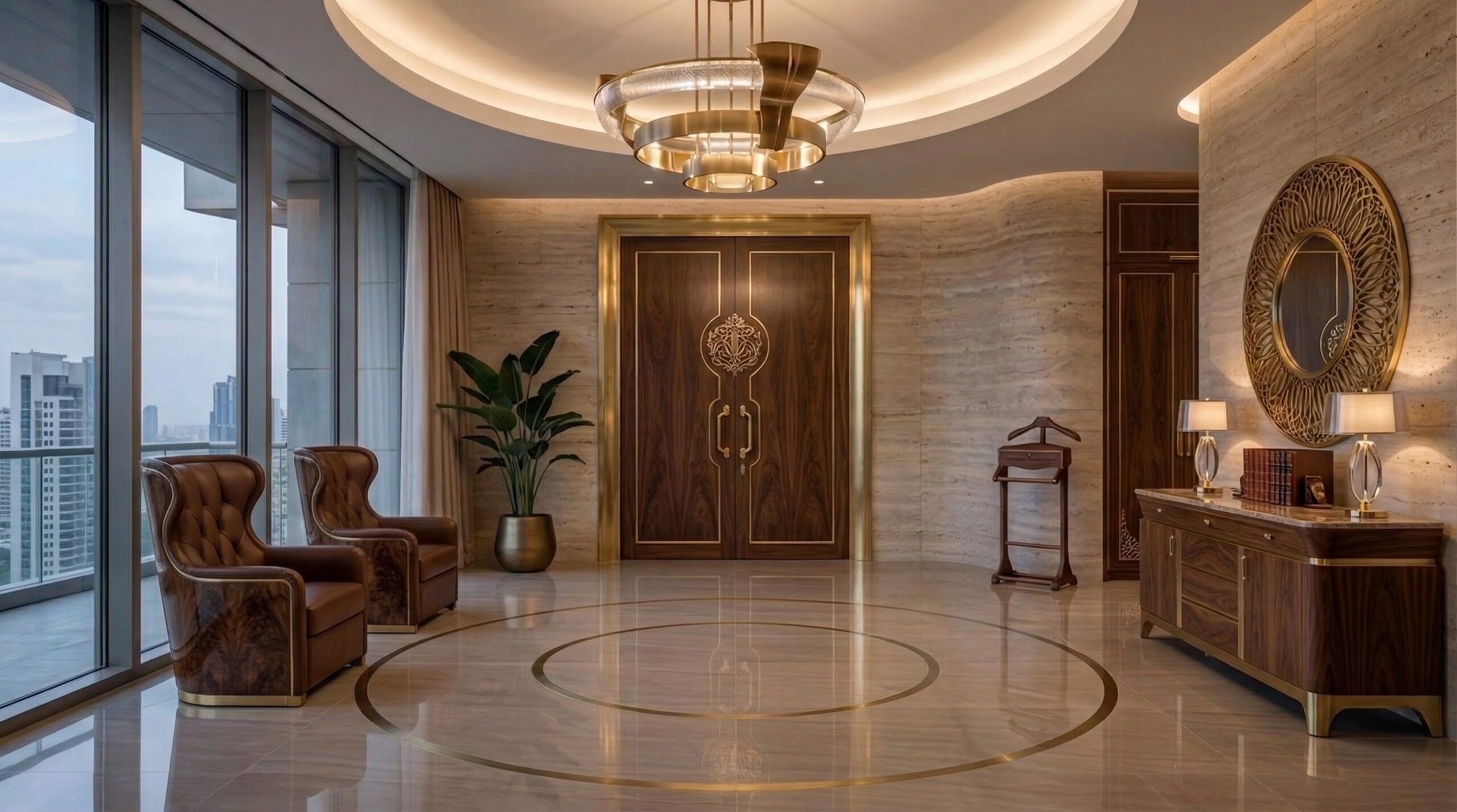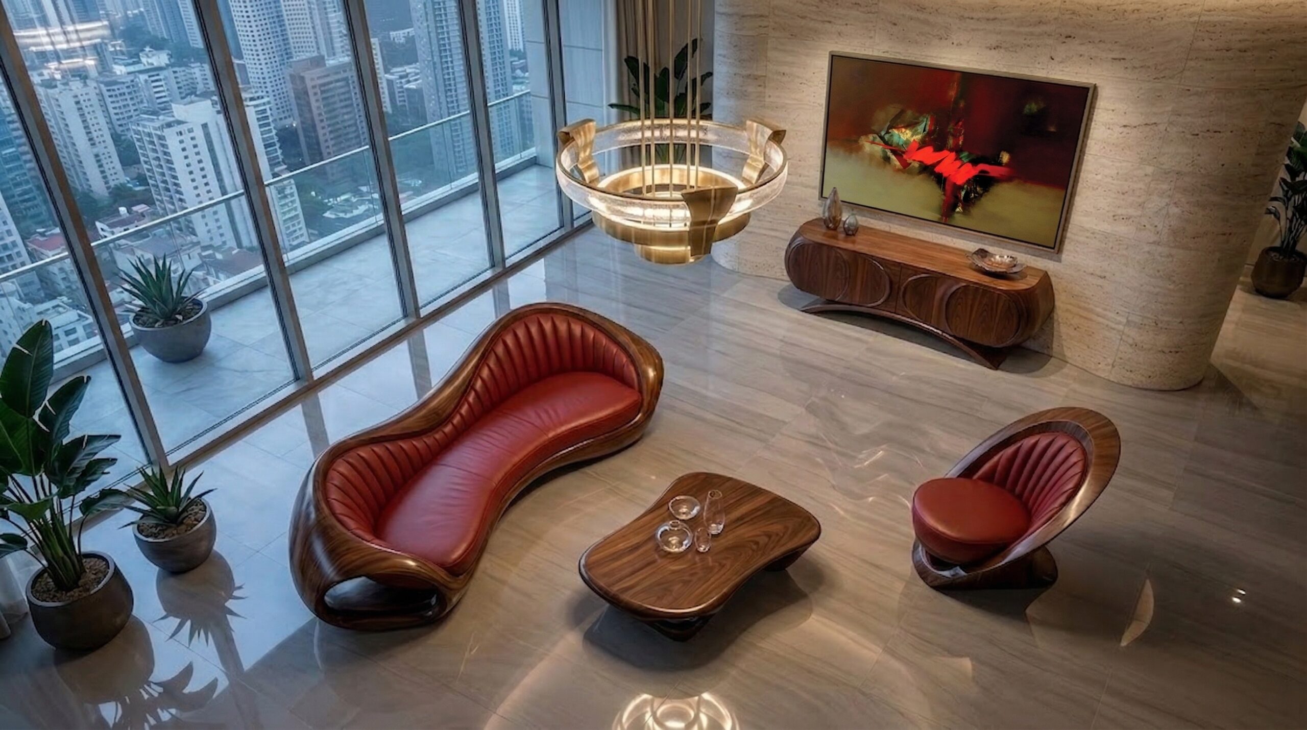 Mermer zeminler, koyu ahşap kaplamalar ve altın tonlu detaylar lüks hissini pekiştirirken; kıvrımlı deri koltuklar, özel tasarım yemek masası ve bütünleşik bar ünitesi mekânda güçlü bir karakter oluşturur. Aydınlatma elemanları ve vitrin sistemleri, mekânın prestijli atmosferini destekleyen önemli tasarım bileşenleri olarak öne çıkar.