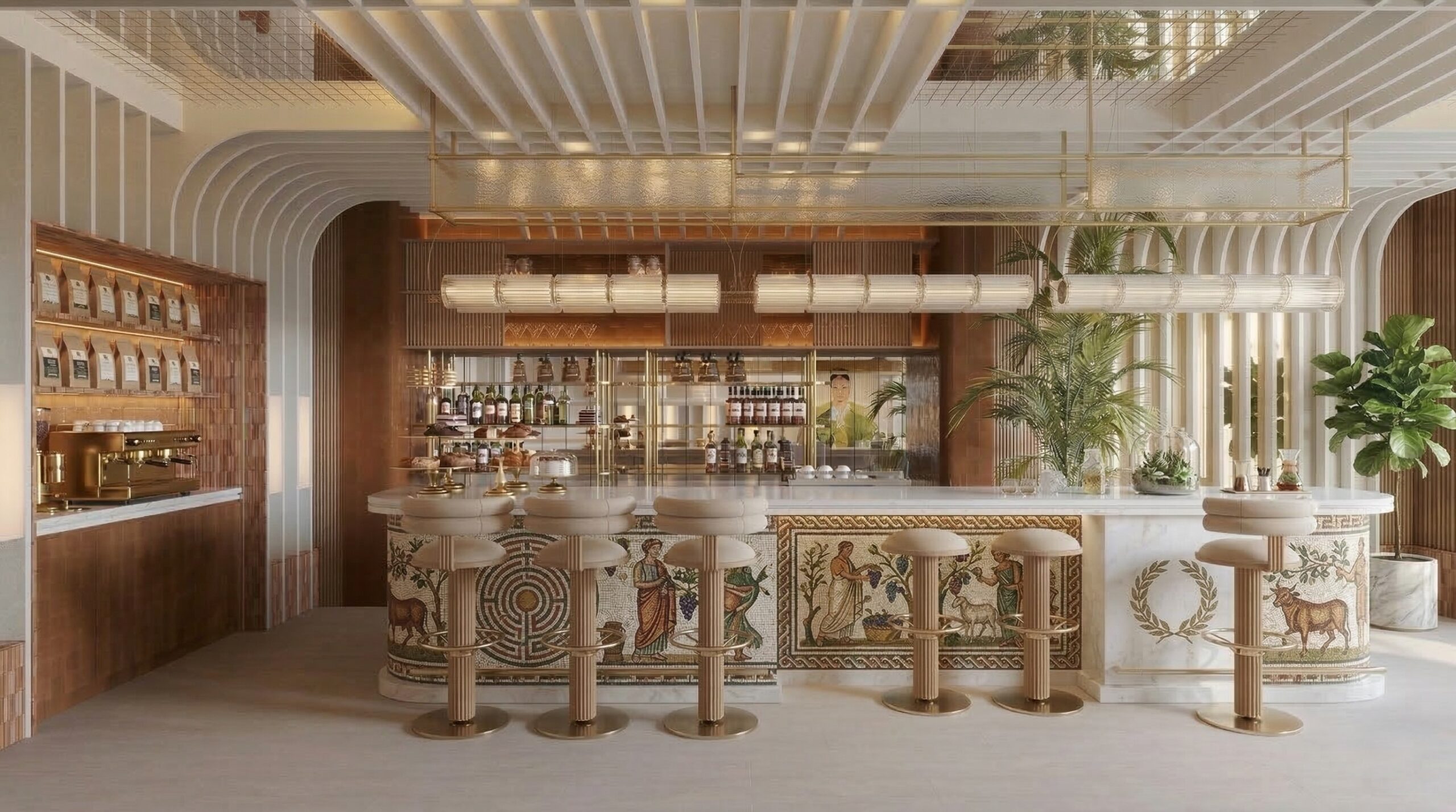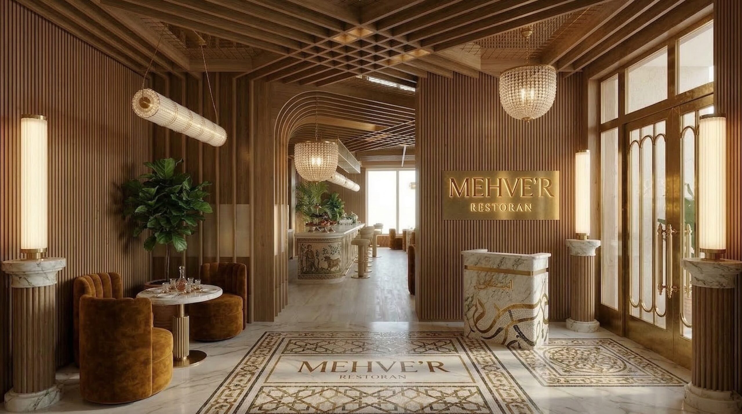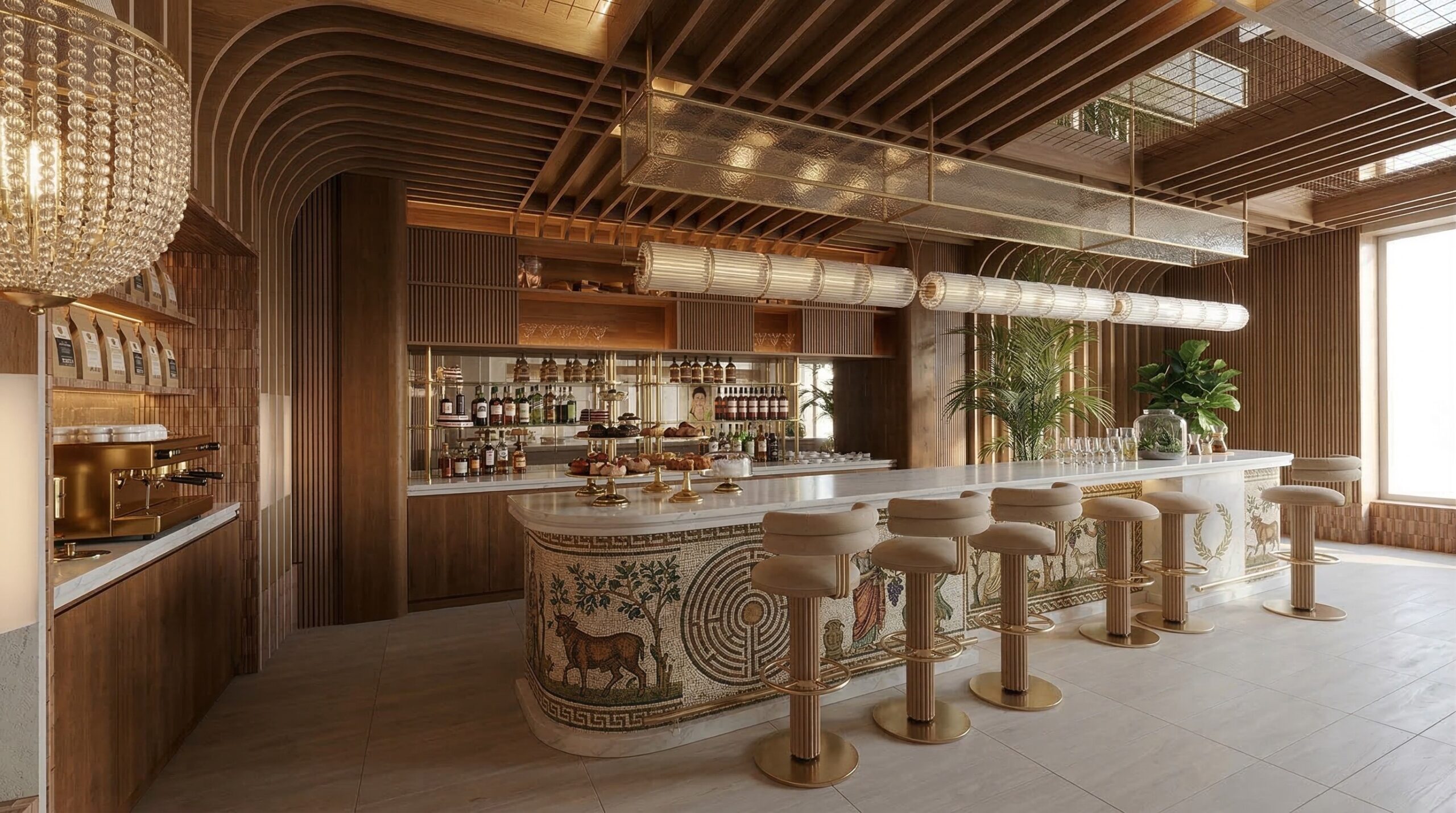 Ahşap yoğunluğu ve sıcak tonların hakim olduğu, Art Deco referanslı çağdaş bir kafe/bar iç mekânı. Mekân; kavisli ahşap tavan panelleri, özel desenli mermer bar ve pirinç detaylarla zenginleşirken, kadife dokulu oturum elemanlarıyla konforlu bir atmosfer sunar. Lineer aydınlatmalar ve büyük açıklıklar sayesinde gün ışığı ile yapay ışık dengeli bir şekilde kurgulanmış, girişten bar alanına kadar akıcı ve davetkâr bir mekânsal deneyim oluşturulmuştur.