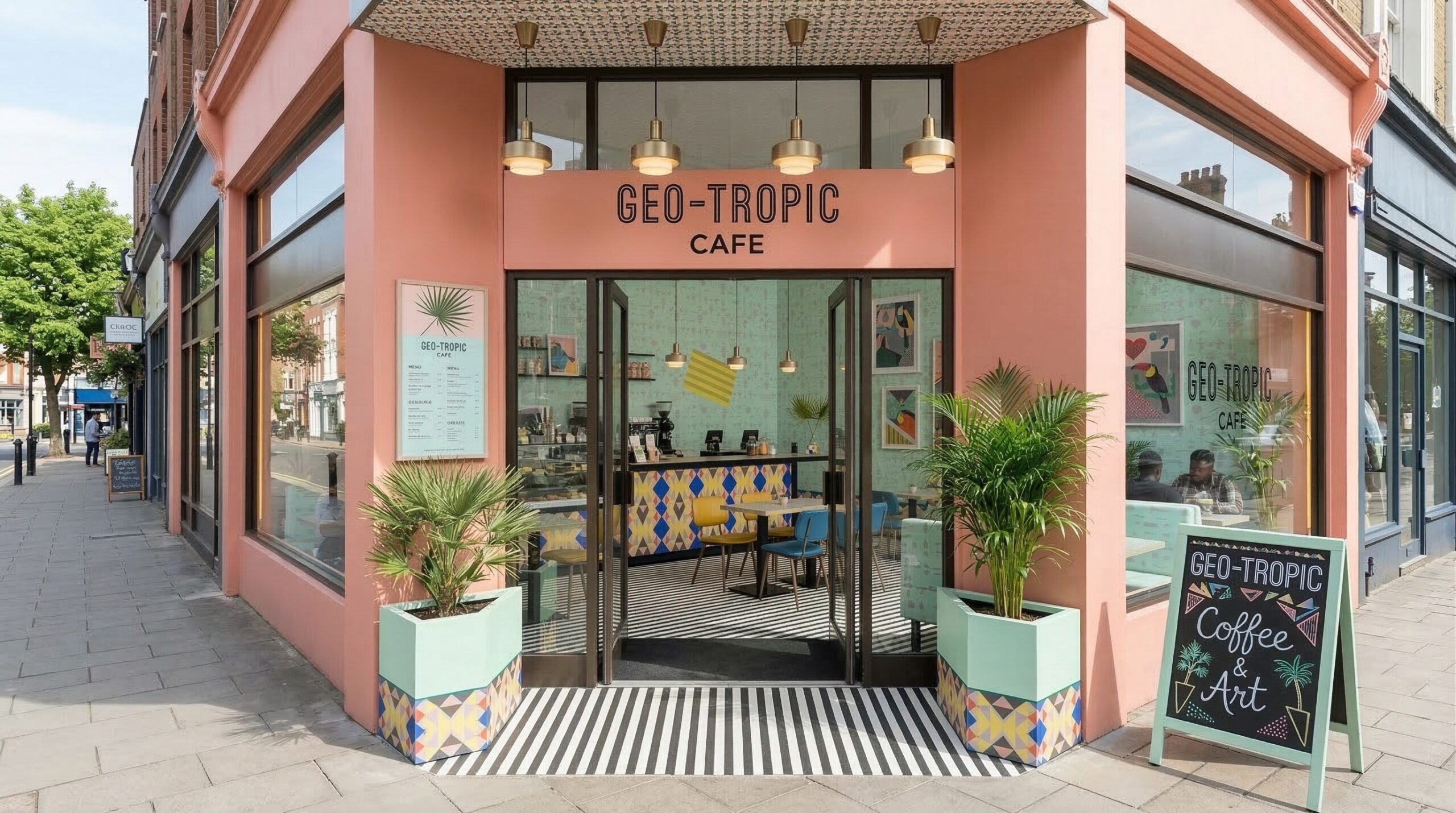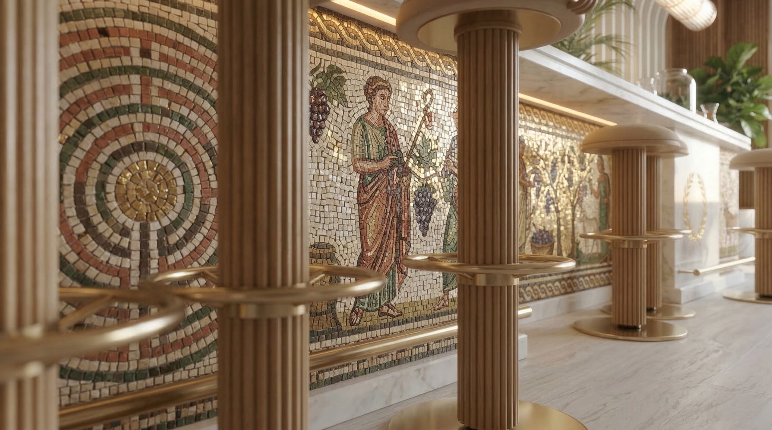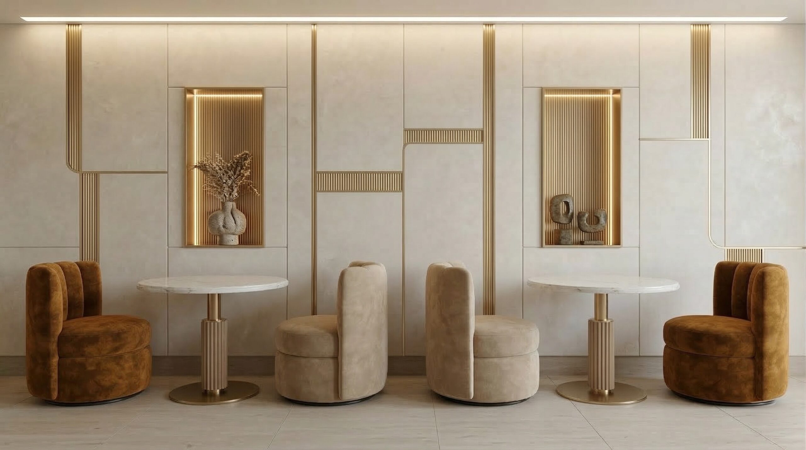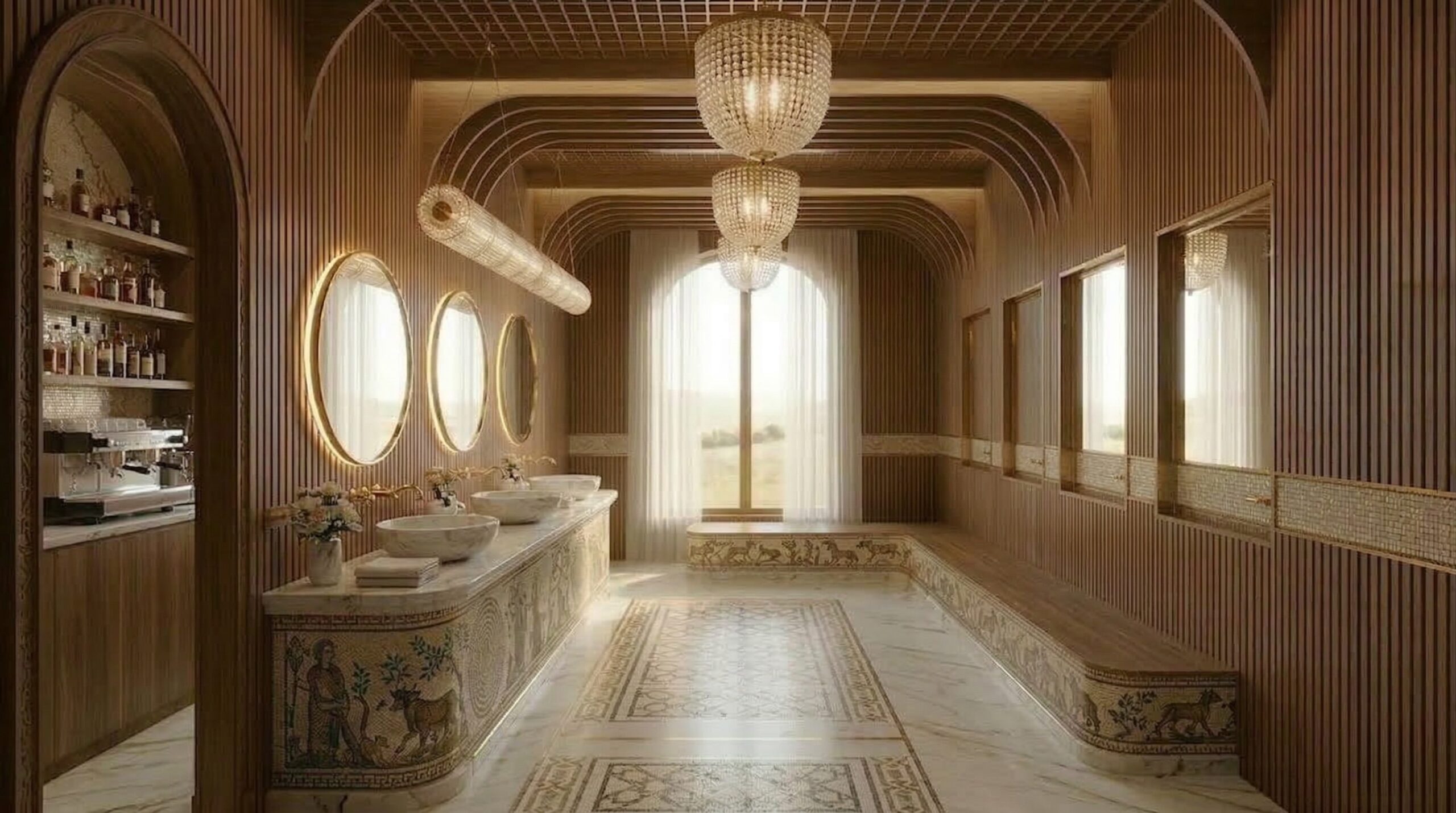 Ahşap yoğunluğu ve sıcak tonların hakim olduğu, Art Deco referanslı çağdaş bir kafe/bar iç mekânı. Mekân; kavisli ahşap tavan panelleri, özel desenli mermer bar ve pirinç detaylarla zenginleşirken, kadife dokulu oturum elemanlarıyla konforlu bir atmosfer sunar. Lineer aydınlatmalar ve büyük açıklıklar sayesinde gün ışığı ile yapay ışık dengeli bir şekilde kurgulanmış, girişten bar alanına kadar akıcı ve davetkâr bir mekânsal deneyim oluşturulmuştur.