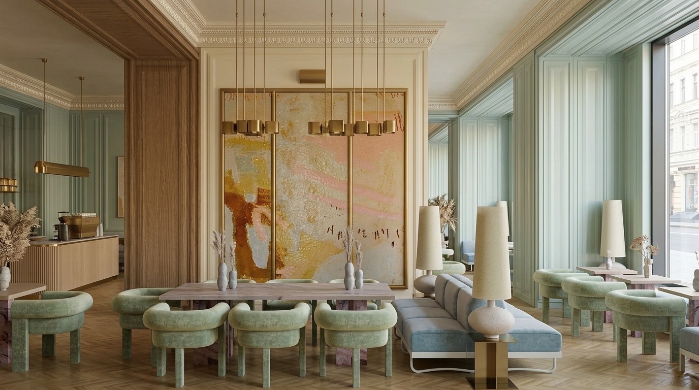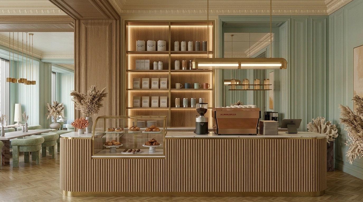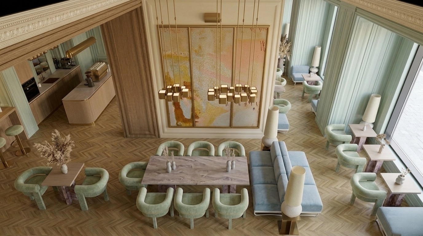 Yumuşak pastel tonlar ve doğal malzemelerin dengeli birlikteliğiyle tasarlanan bu kafe, zarif ve rafine bir atmosfer sunar. Mint yeşili duvar panelleri, açık ahşap yüzeyler ve mermer detaylarla birleşerek mekâna sakin ve sofistike bir kimlik kazandırır. Simetrik yerleşim, lineer oturma düzenleri ve özel tasarım aydınlatmalar mekânsal bütünlüğü güçlendirirken; geniş açıklıklar ve doğal ışık kullanımı ferah bir iç mekân deneyimi oluşturur.