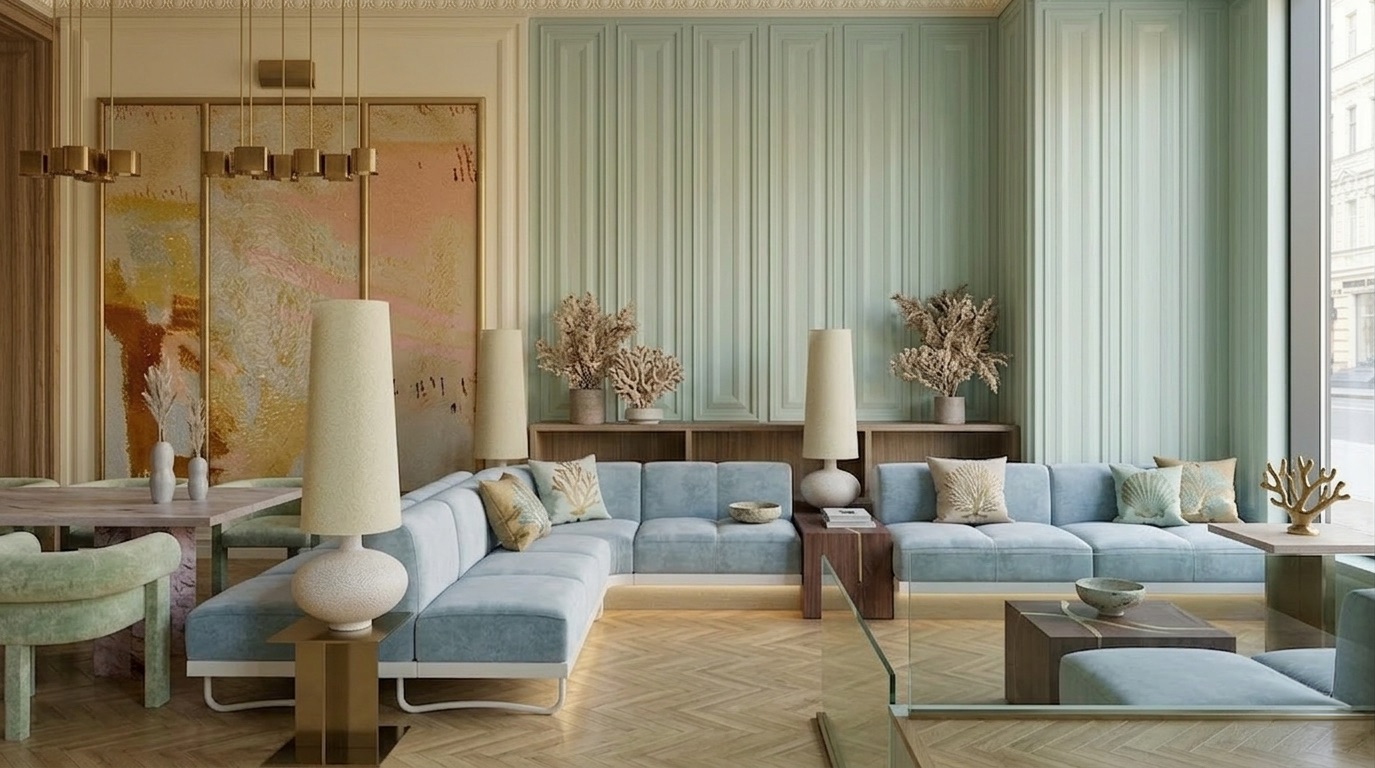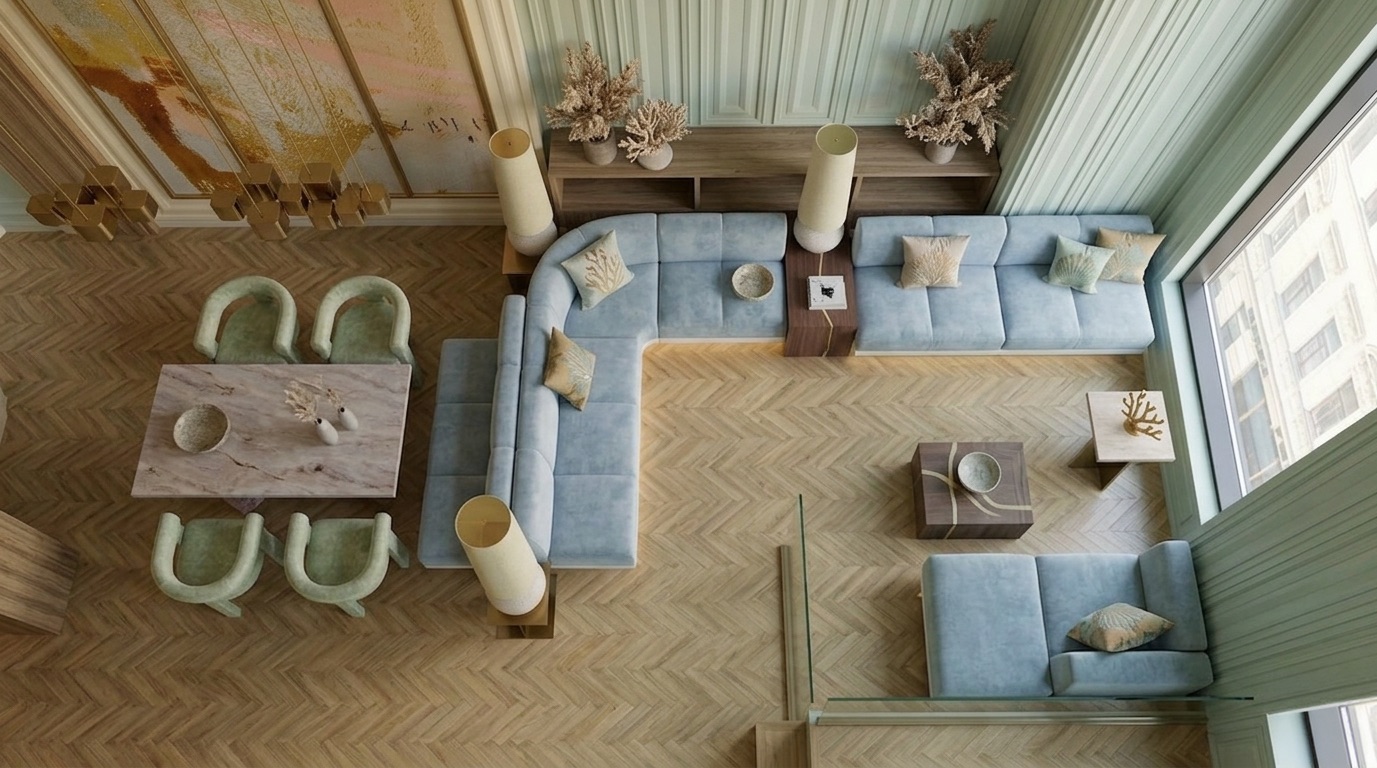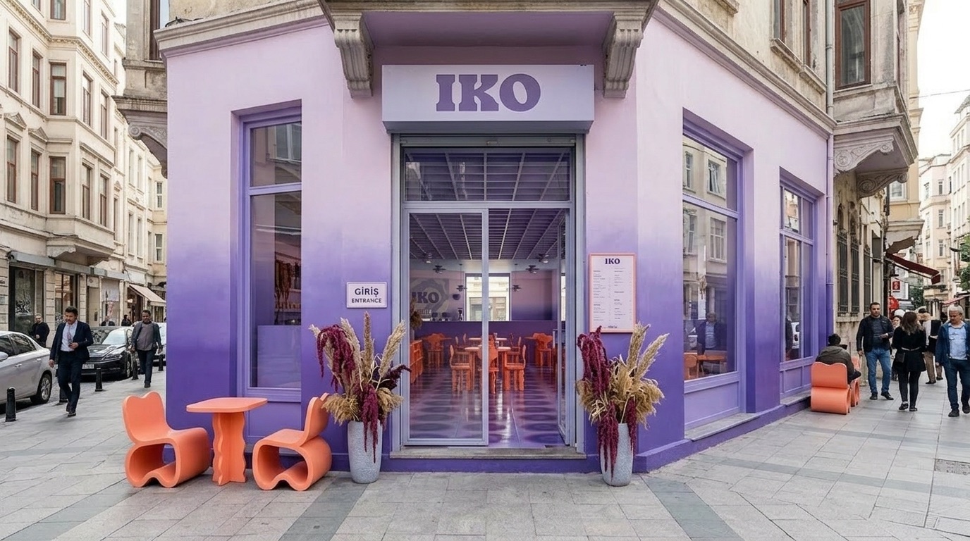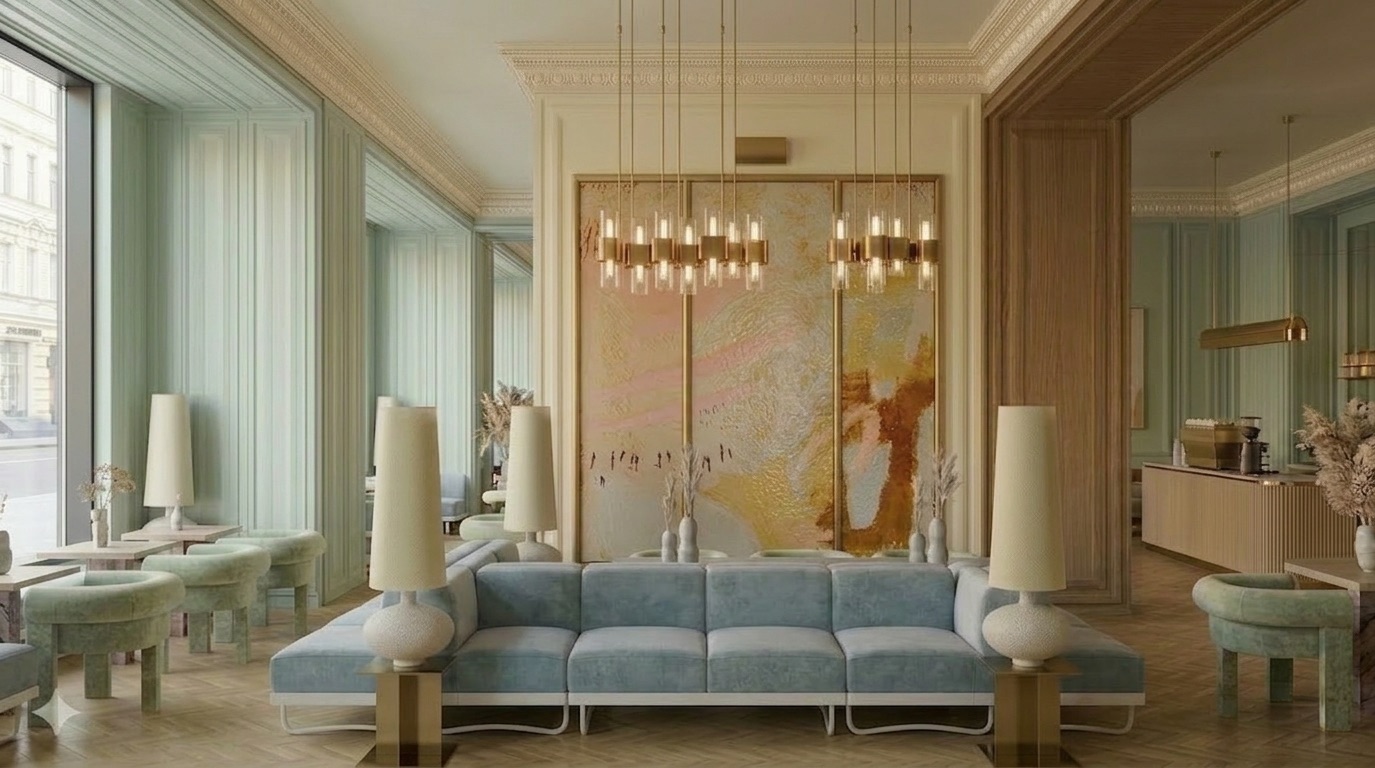 Yumuşak pastel tonlar ve doğal malzemelerin dengeli birlikteliğiyle tasarlanan bu kafe, zarif ve rafine bir atmosfer sunar. Mint yeşili duvar panelleri, açık ahşap yüzeyler ve mermer detaylarla birleşerek mekâna sakin ve sofistike bir kimlik kazandırır. Simetrik yerleşim, lineer oturma düzenleri ve özel tasarım aydınlatmalar mekânsal bütünlüğü güçlendirirken; geniş açıklıklar ve doğal ışık kullanımı ferah bir iç mekân deneyimi oluşturur.