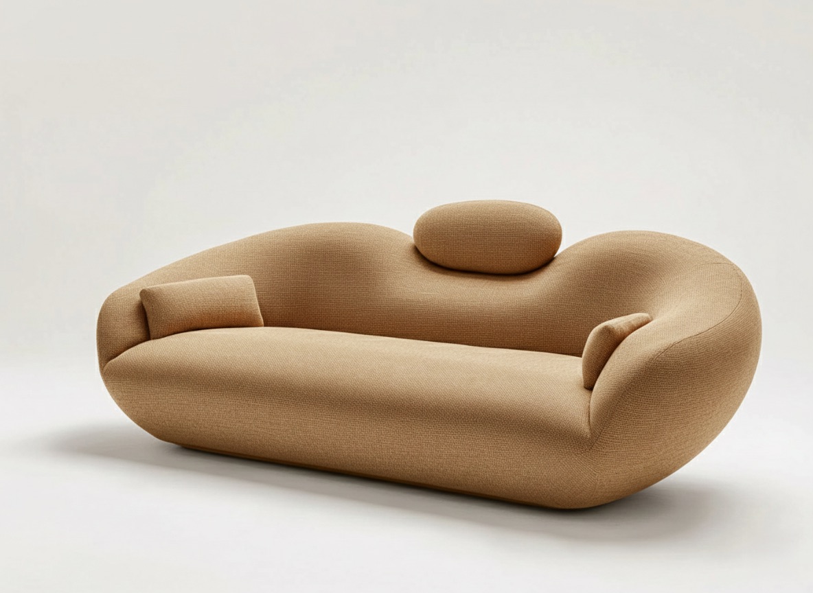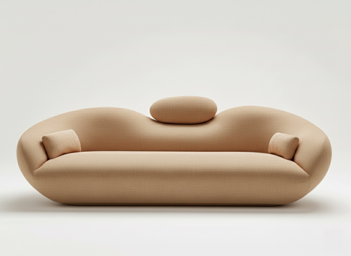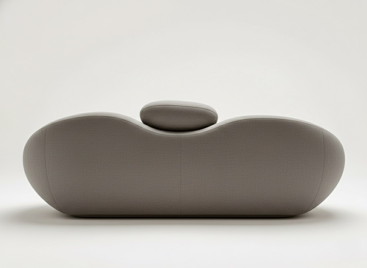 Yuvarlatılmış hatlara sahip bu sofa, içe doğru kıvrılan sırt ve kol yapısıyla kullanıcıyı saran bir oturum sunar. Orta bölümde yer alan destek yastığı, hem ergonomi hem de görsel denge sağlar. Düşük oturum yüksekliği ve geniş yüzeyi sayesinde rahat bir kullanım sunarken, tek parça gibi algılanan form dili mekânda sade bir
